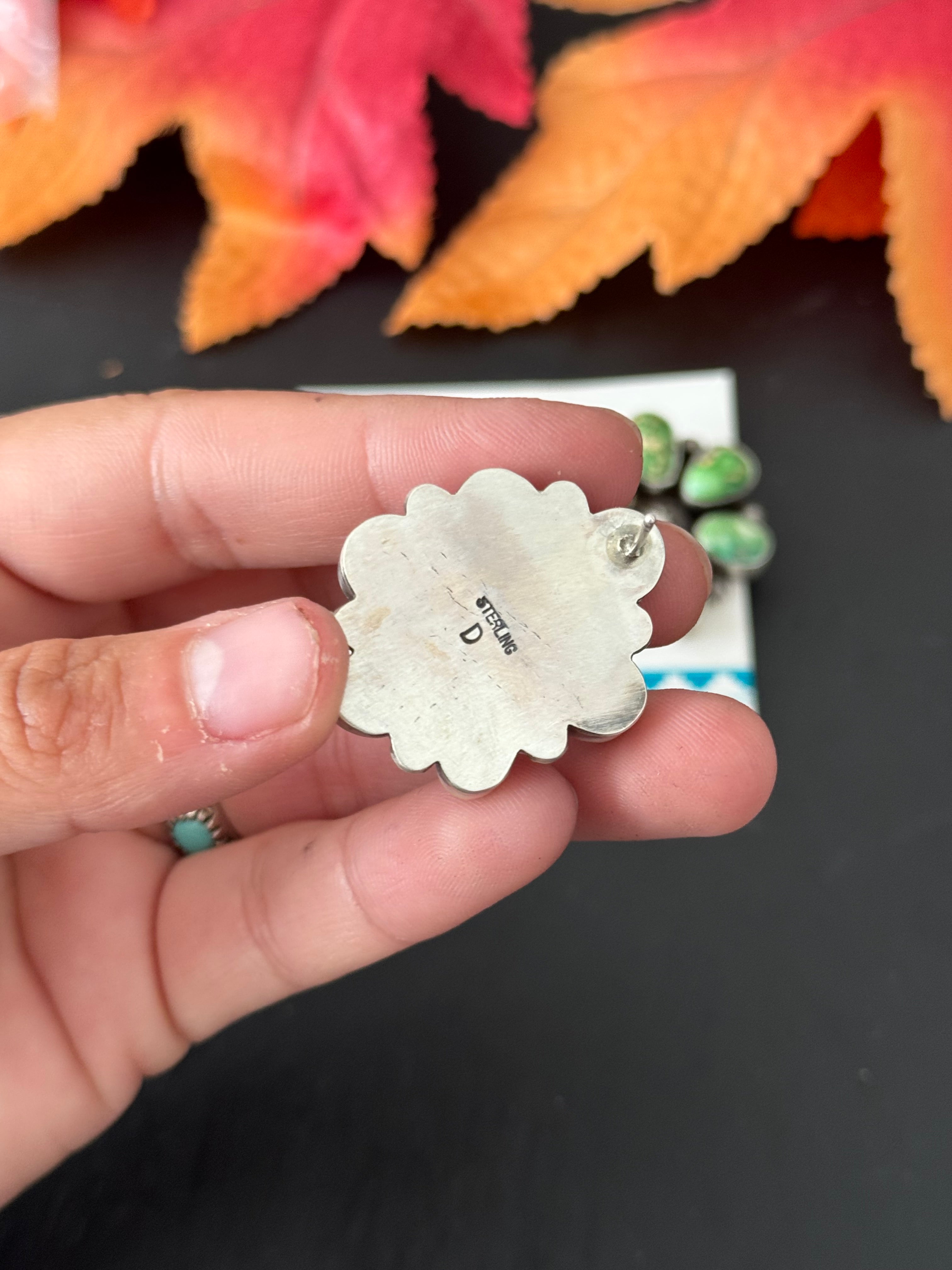 Beautiful lightweight Dangle Earrings. Dave Skeets Sonoran Gold Turquoise & Sterling Silver Post Dangle Earrings. It measures 1 1/4 inches long and 1 inch wide. Stamped sterling silver and signed.