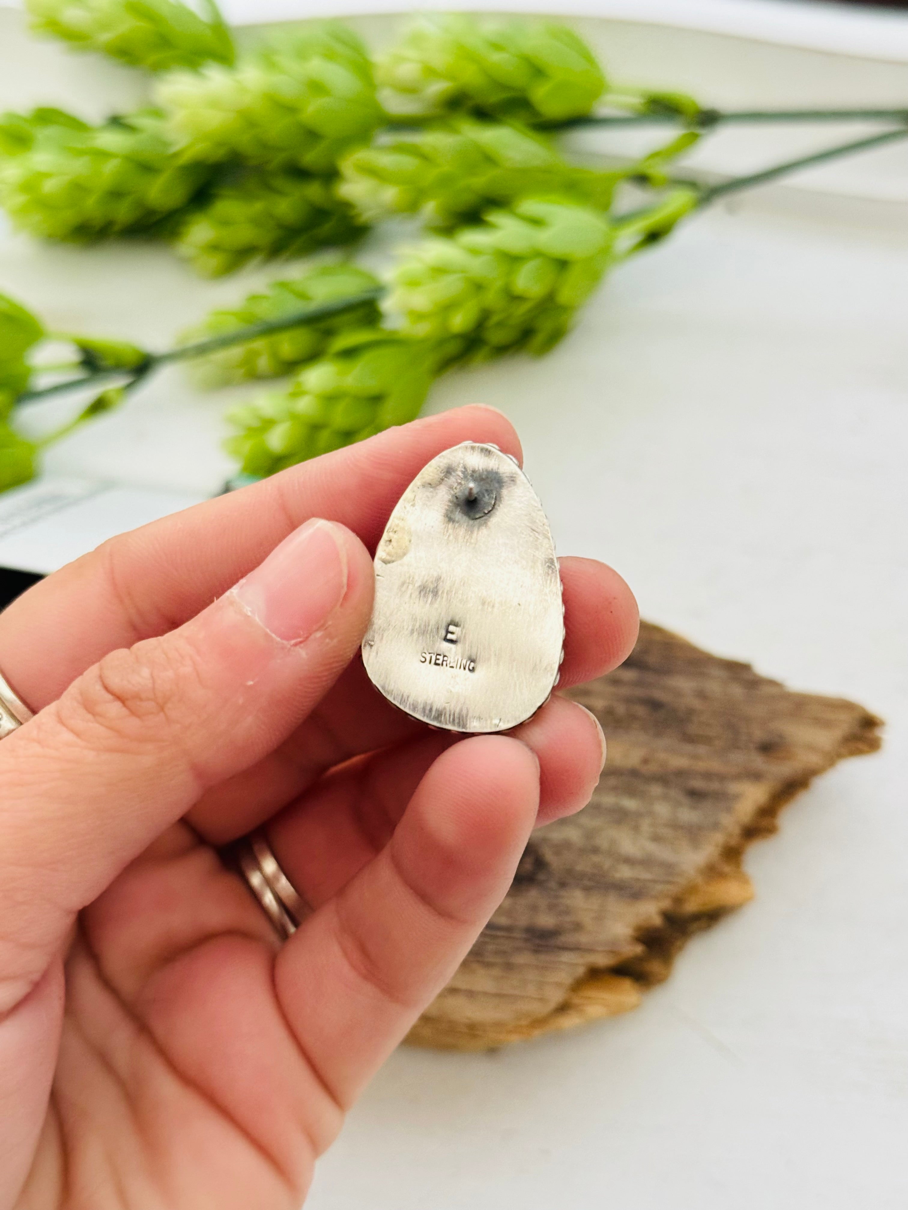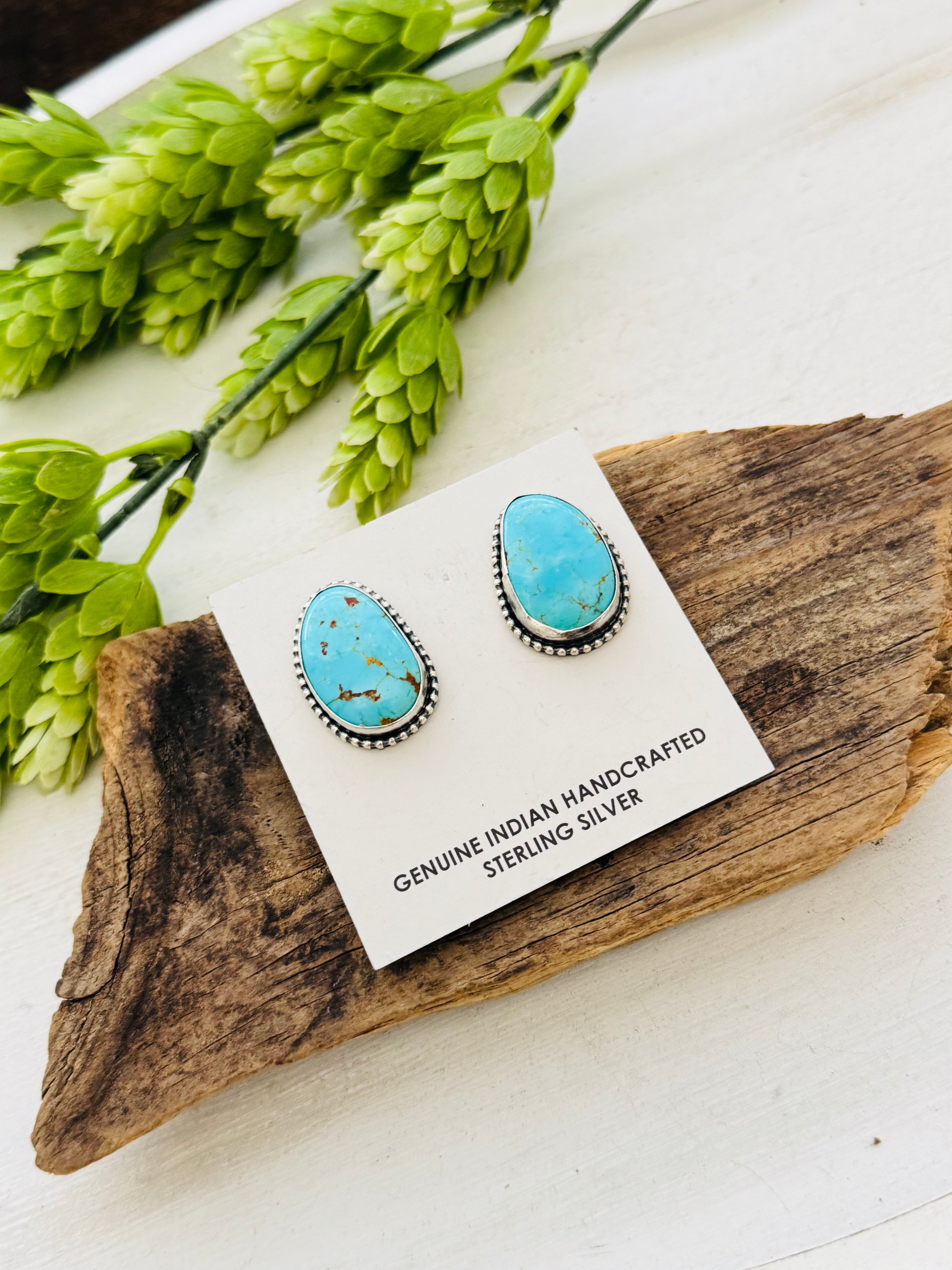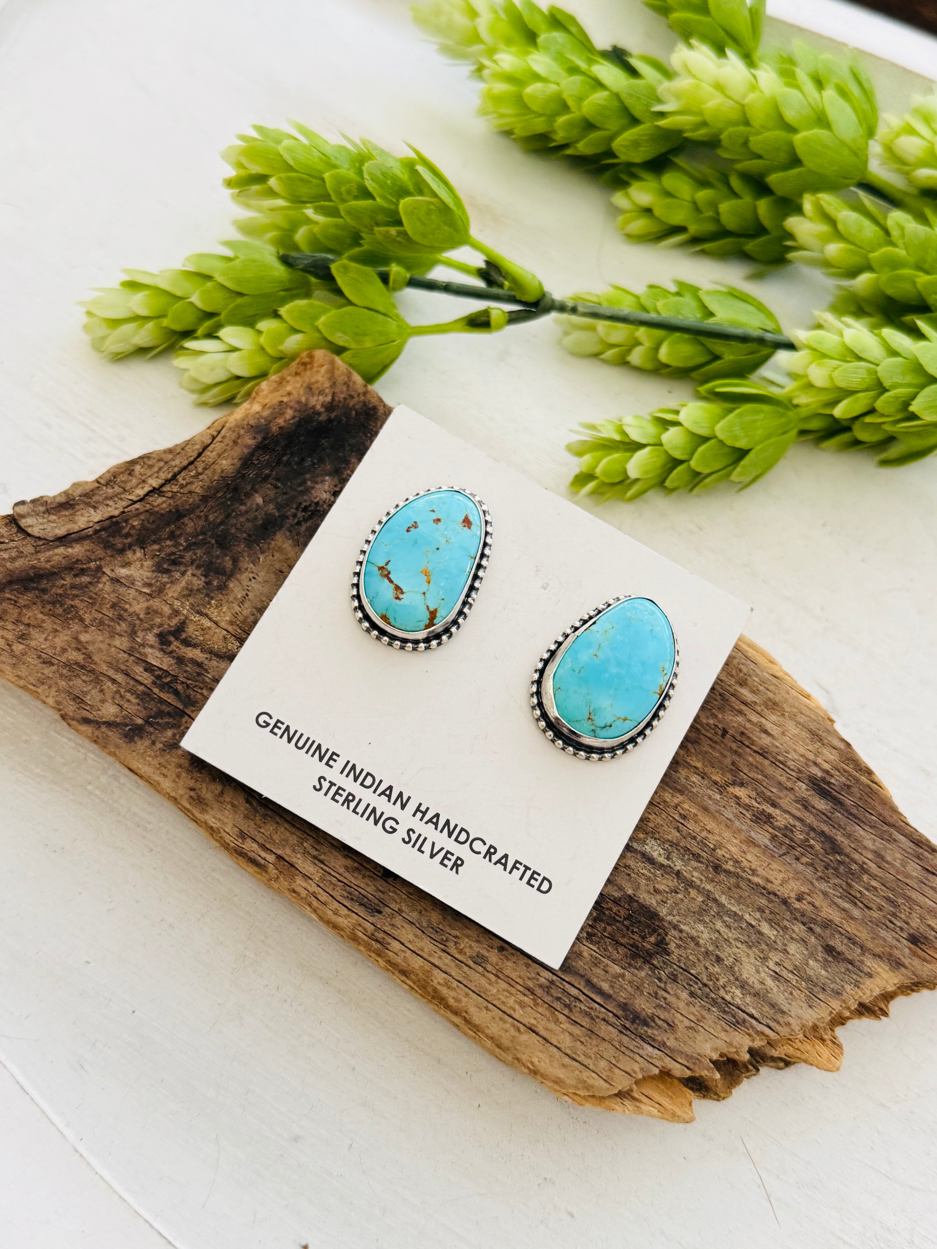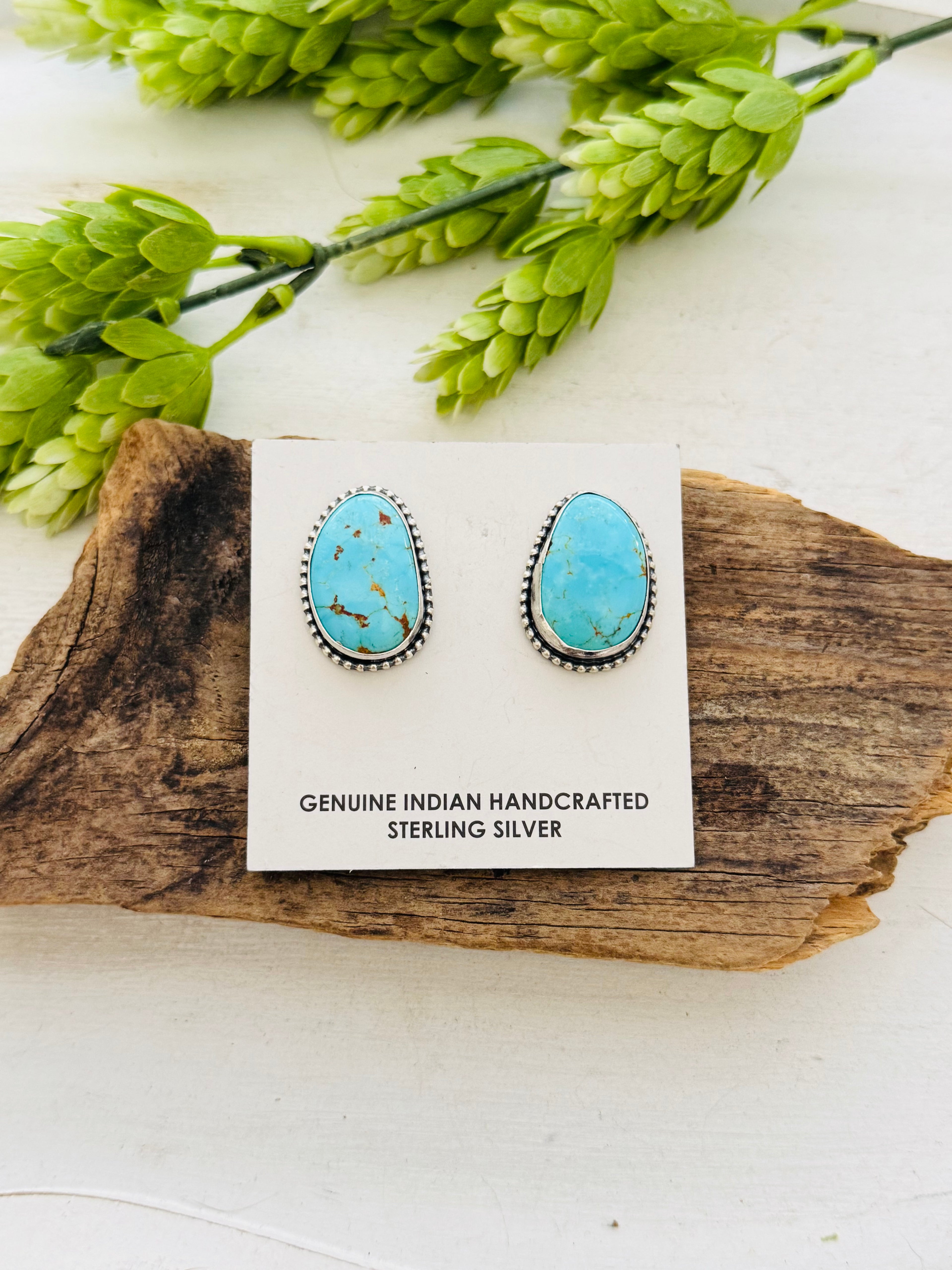 Eli Skeets Kingman Turquoise & Sterling Silver Post Earrings. It measures 1 inch long and 3/4 of an inch wide. Stamped sterling silver and signed.