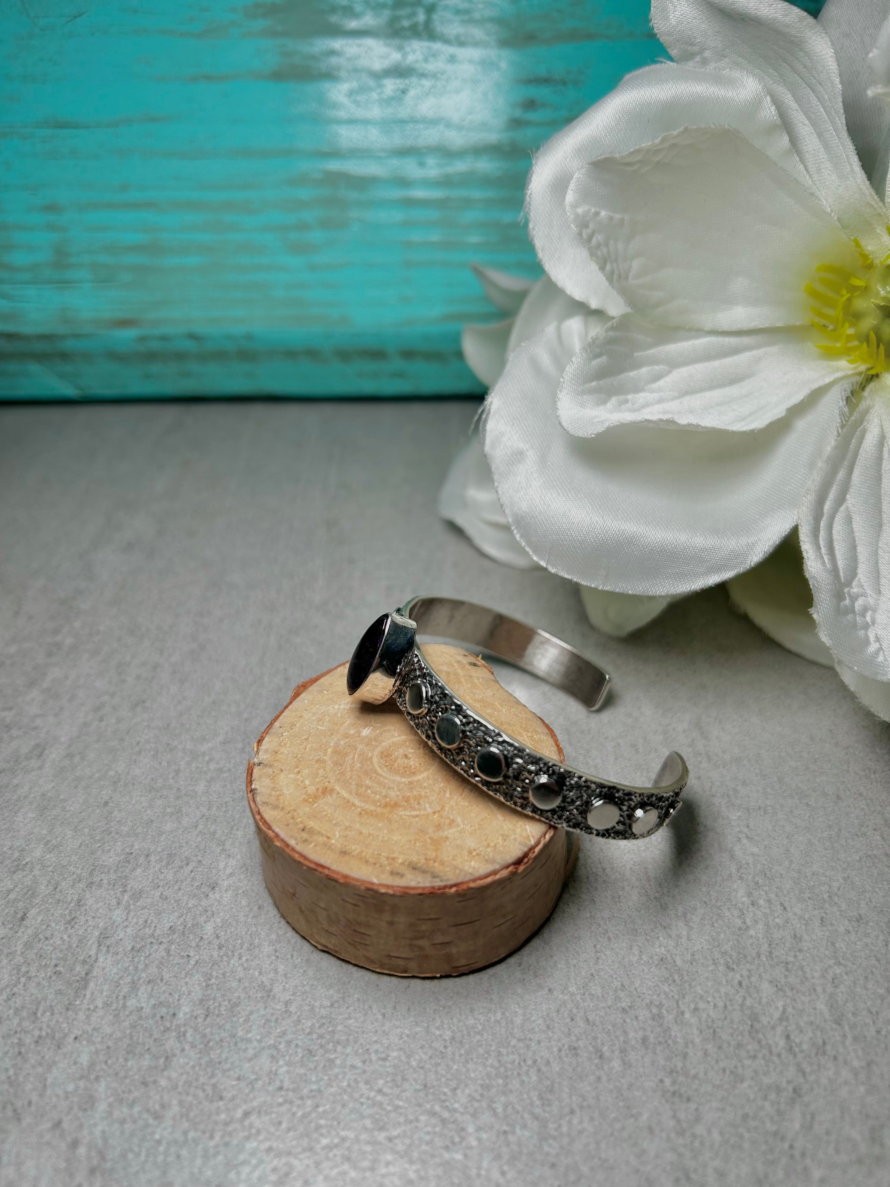 David Benally Sugilile &Sterling Silver Cuff Bracelet. It measures 5/8 of an inch wide with an inside circumference of 5 1/2 inches and a gap of 1 inch. Signed by the artist and stamped sterling silver.