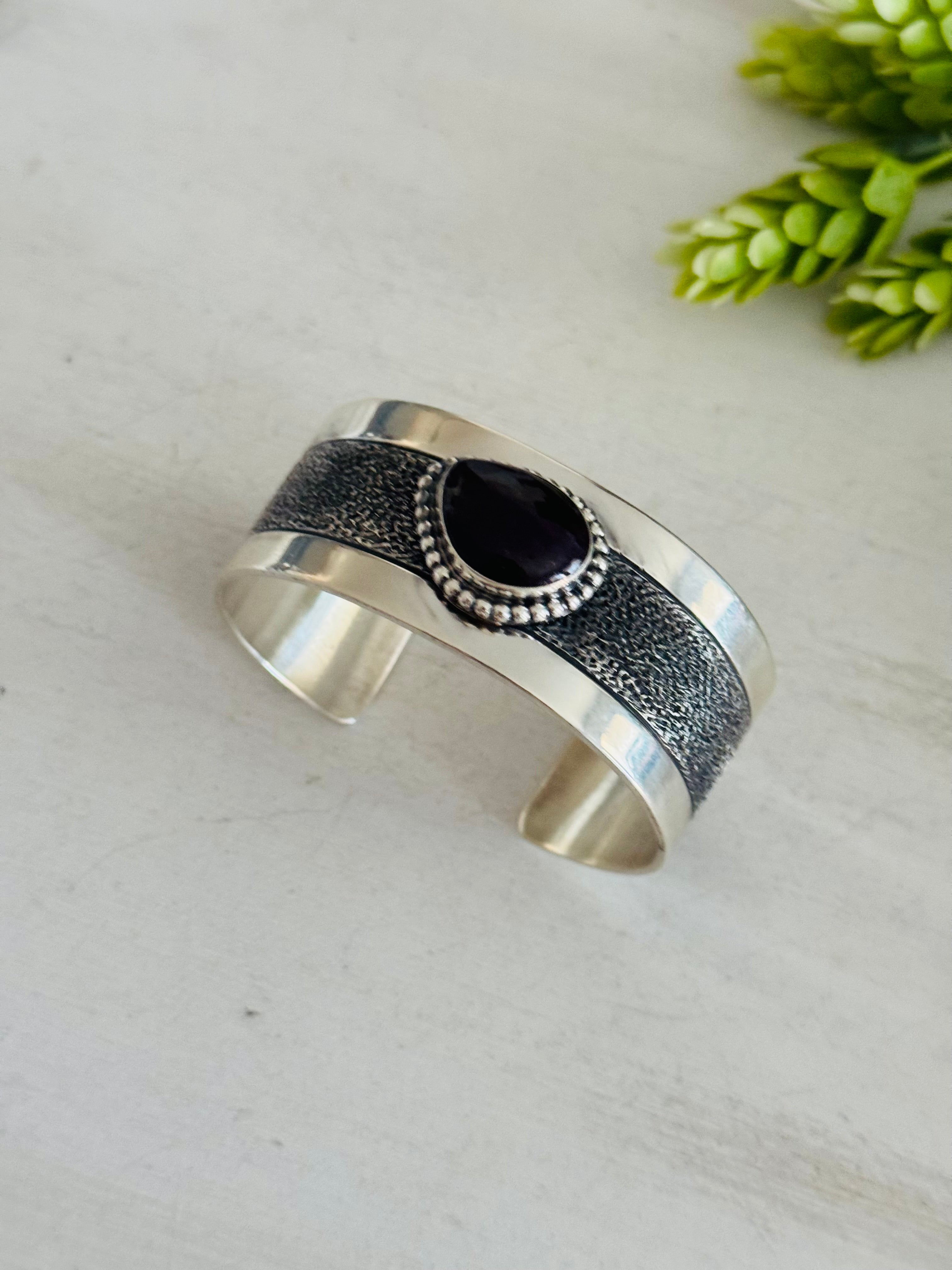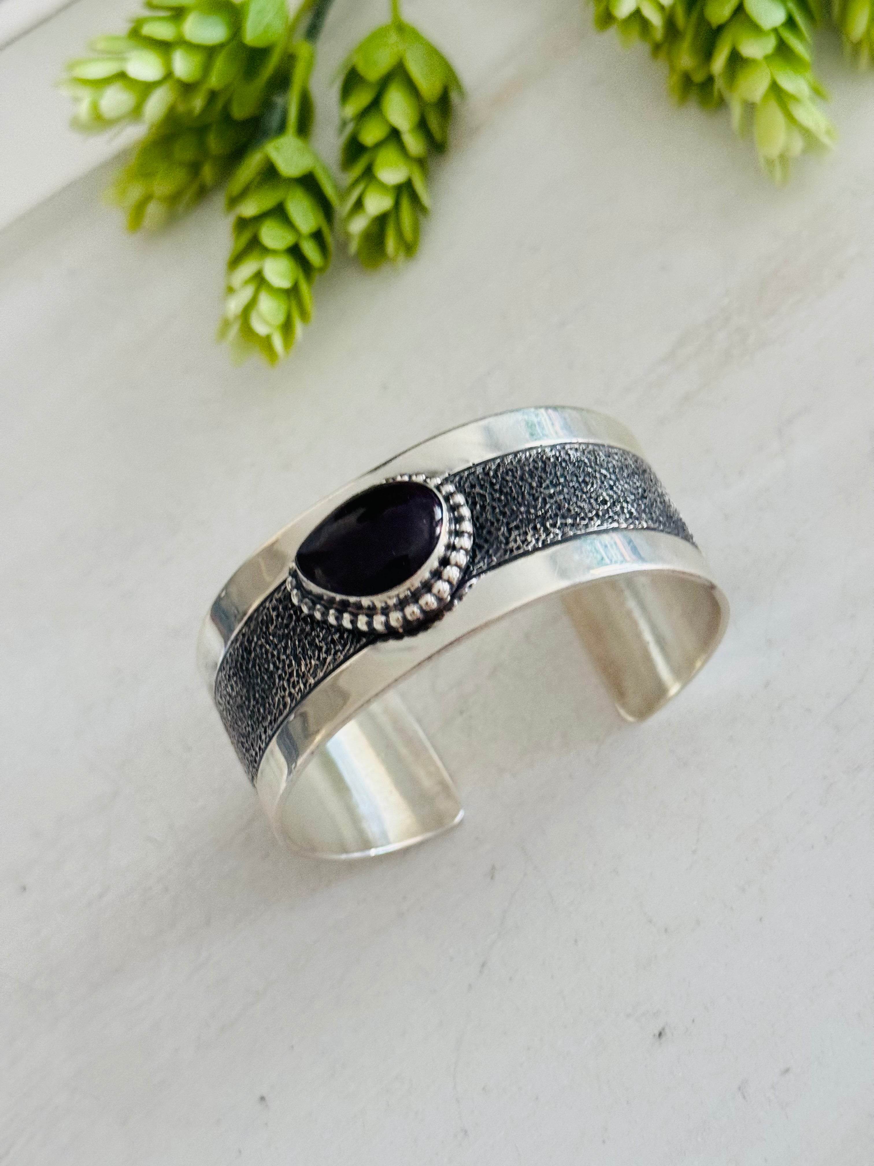 David Benally Sugilile &Sterling Silver Cuff Bracelet. It measures 1 inch wide with an inside circumference of 5 3/4 inches and a gap of 1 inch. Signed by the artist and stamped sterling silver.