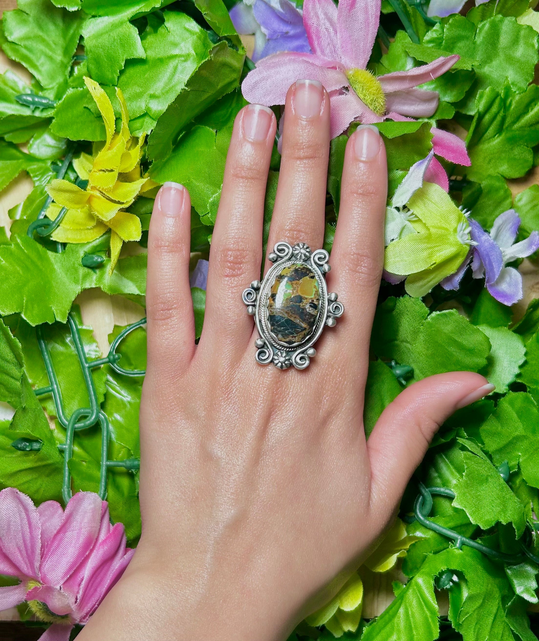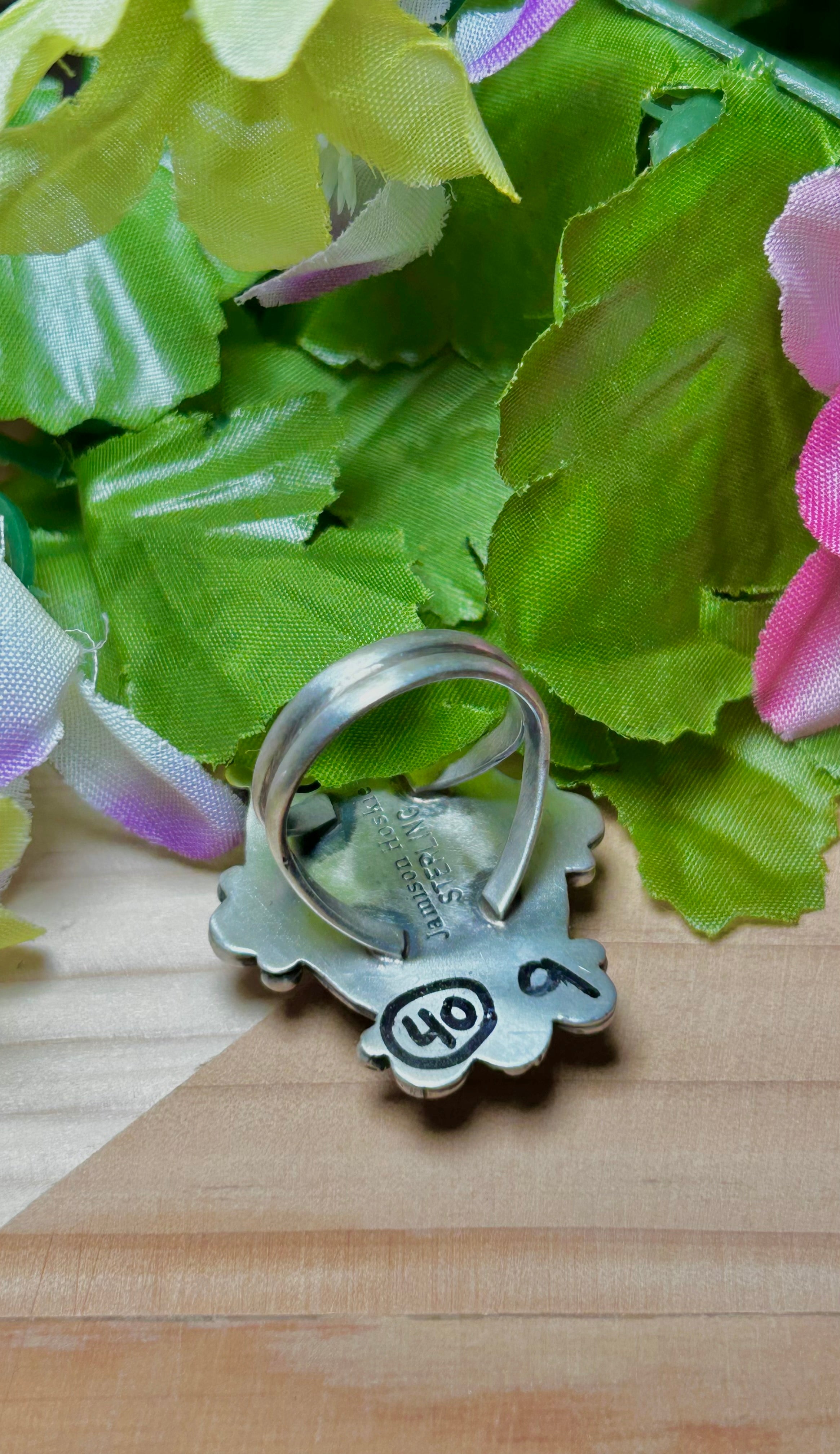 Jamison Hoskie Black Jack Turquoise & Sterling Silver Ring Size 9.25. It measures 1 1/2 inches long and 1 1/4 inches wide. Stamped sterling silver.