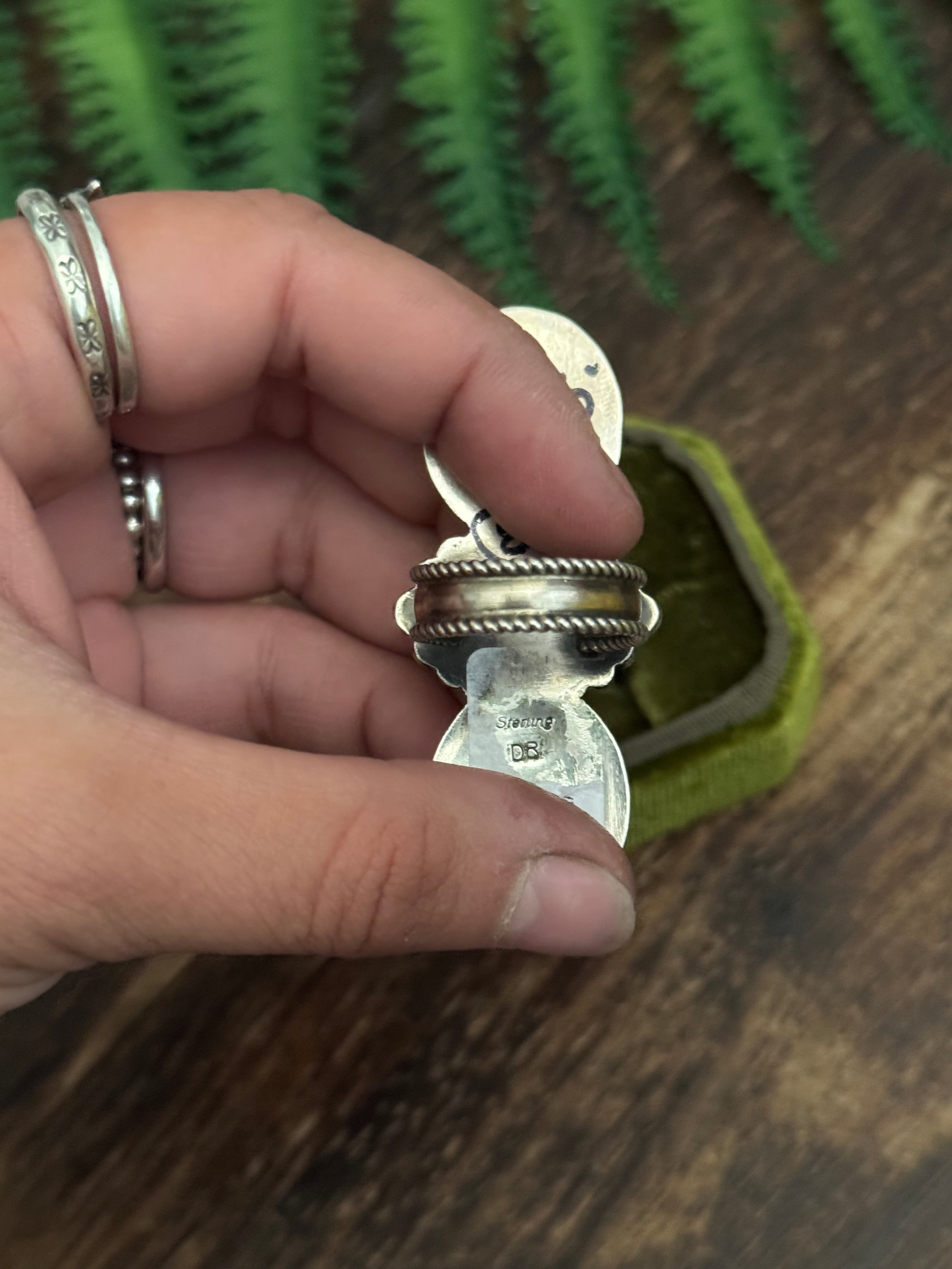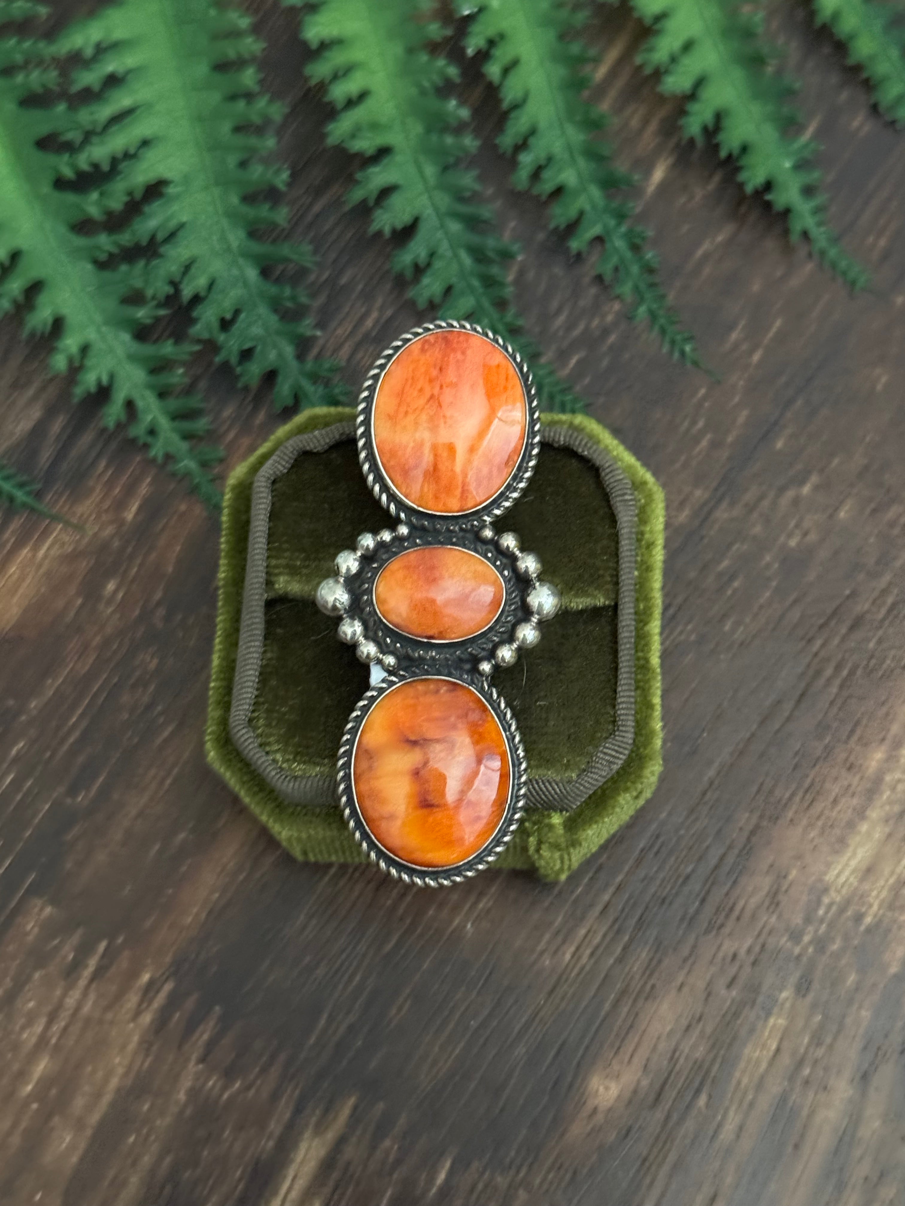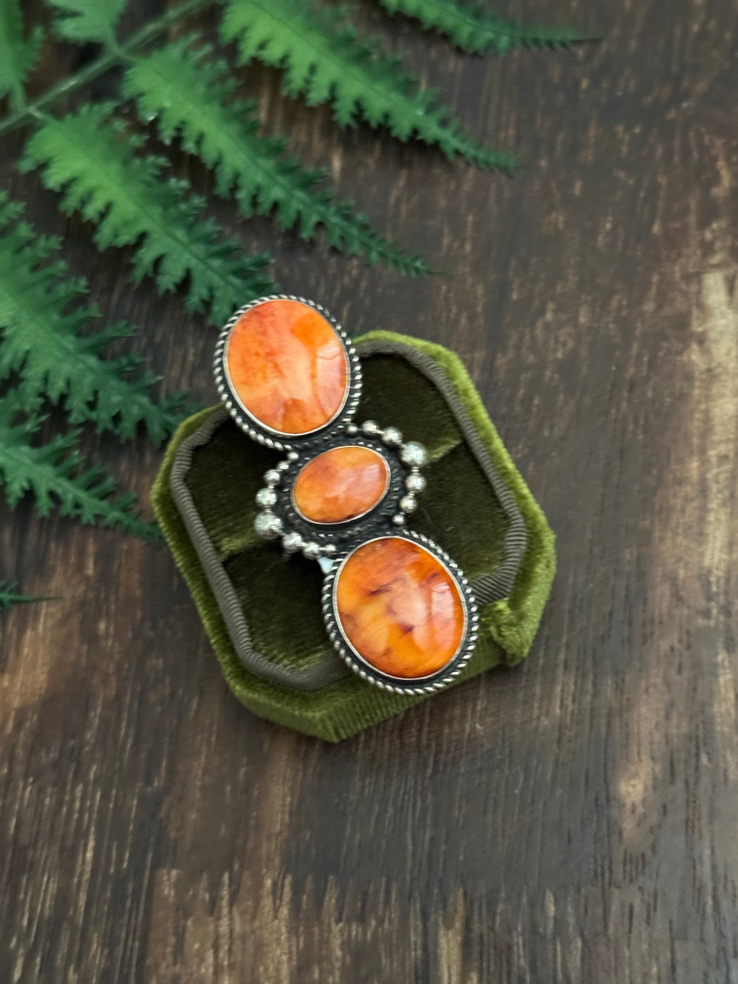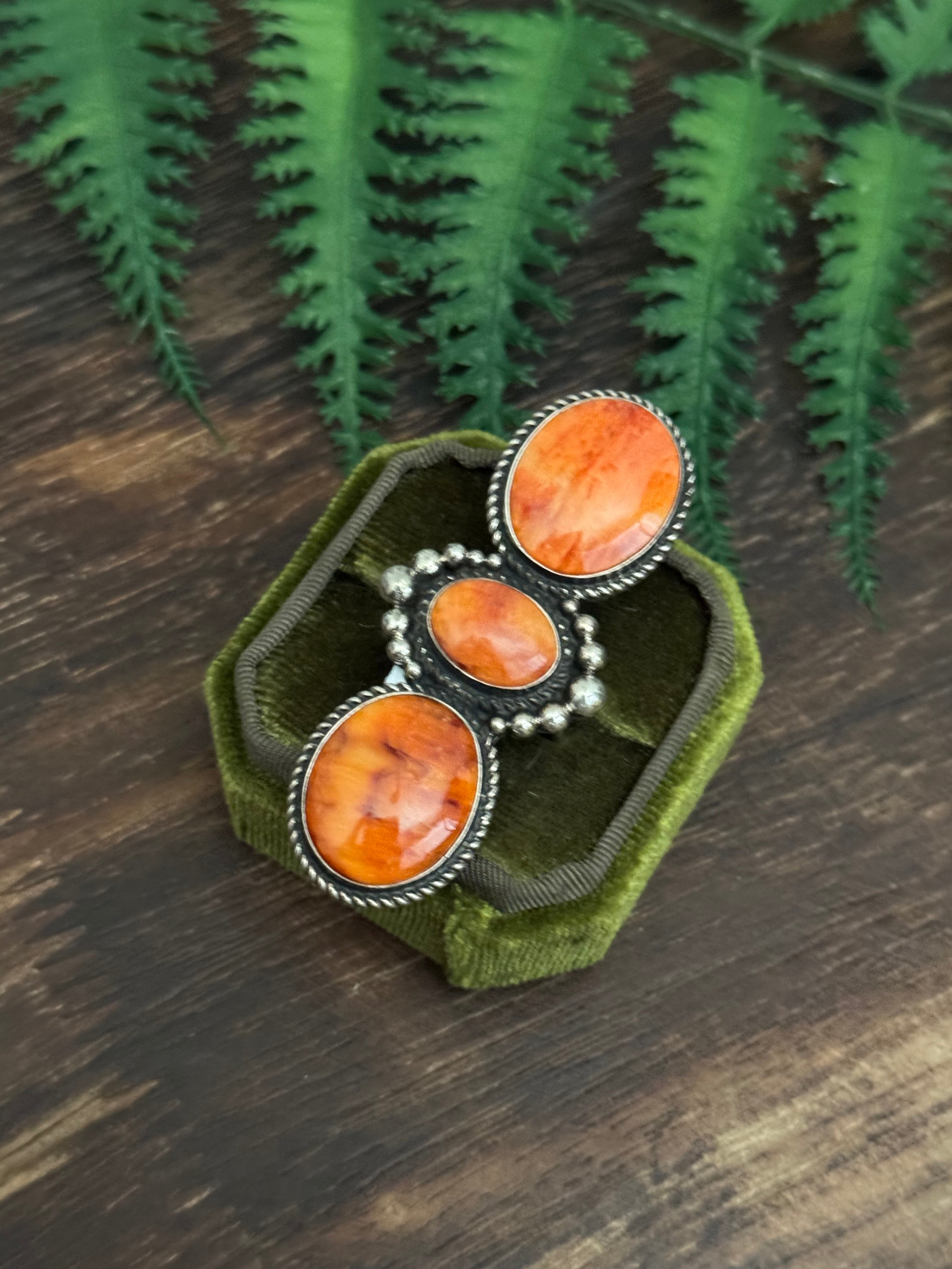 Dean Brown Spiny Oyster & Sterling Silver Adjustable Ring. It measures 2 3/8 inches long and just over 3/4 of an inch wide. Signed by the artist and stamped sterling silver.