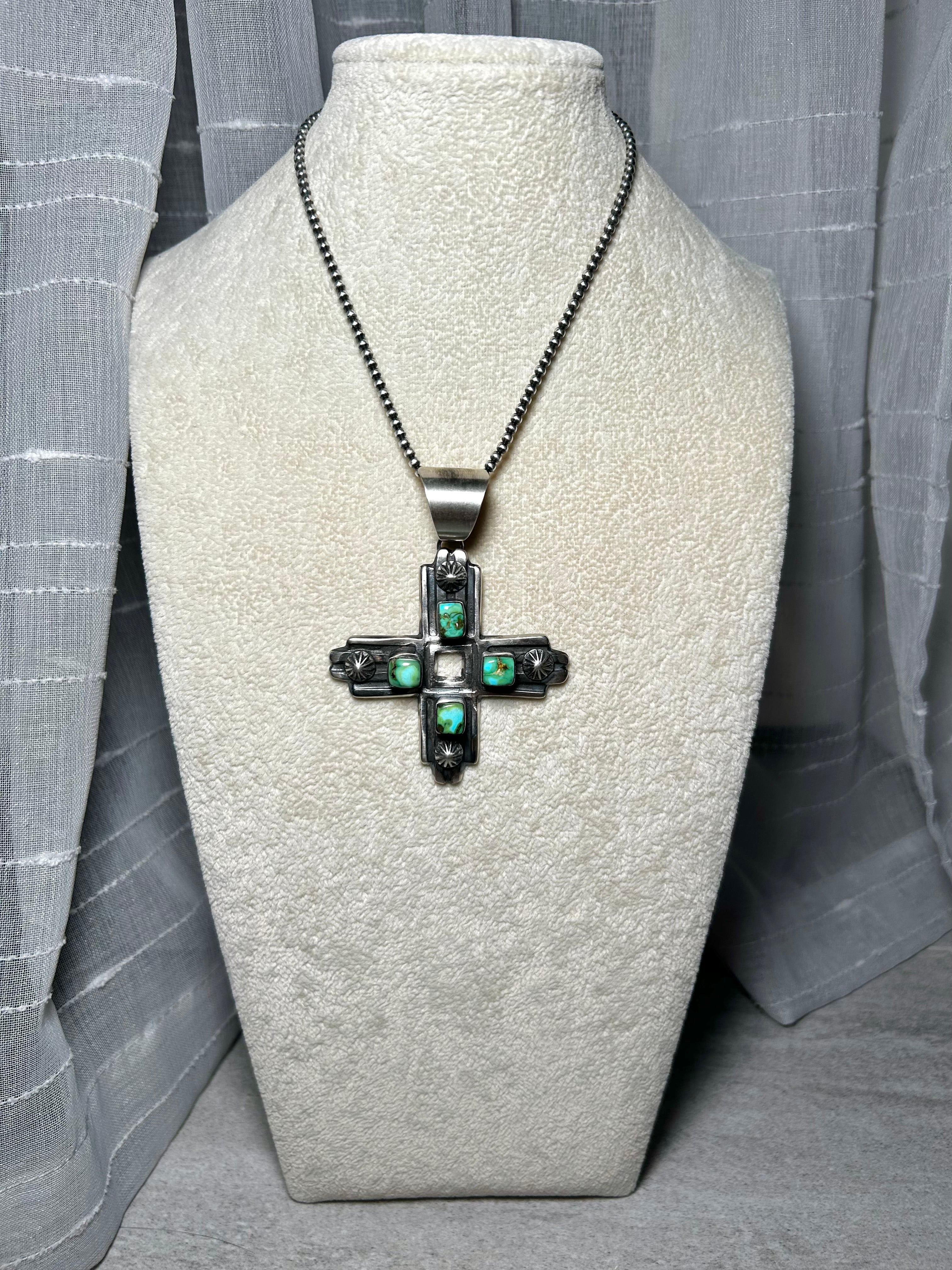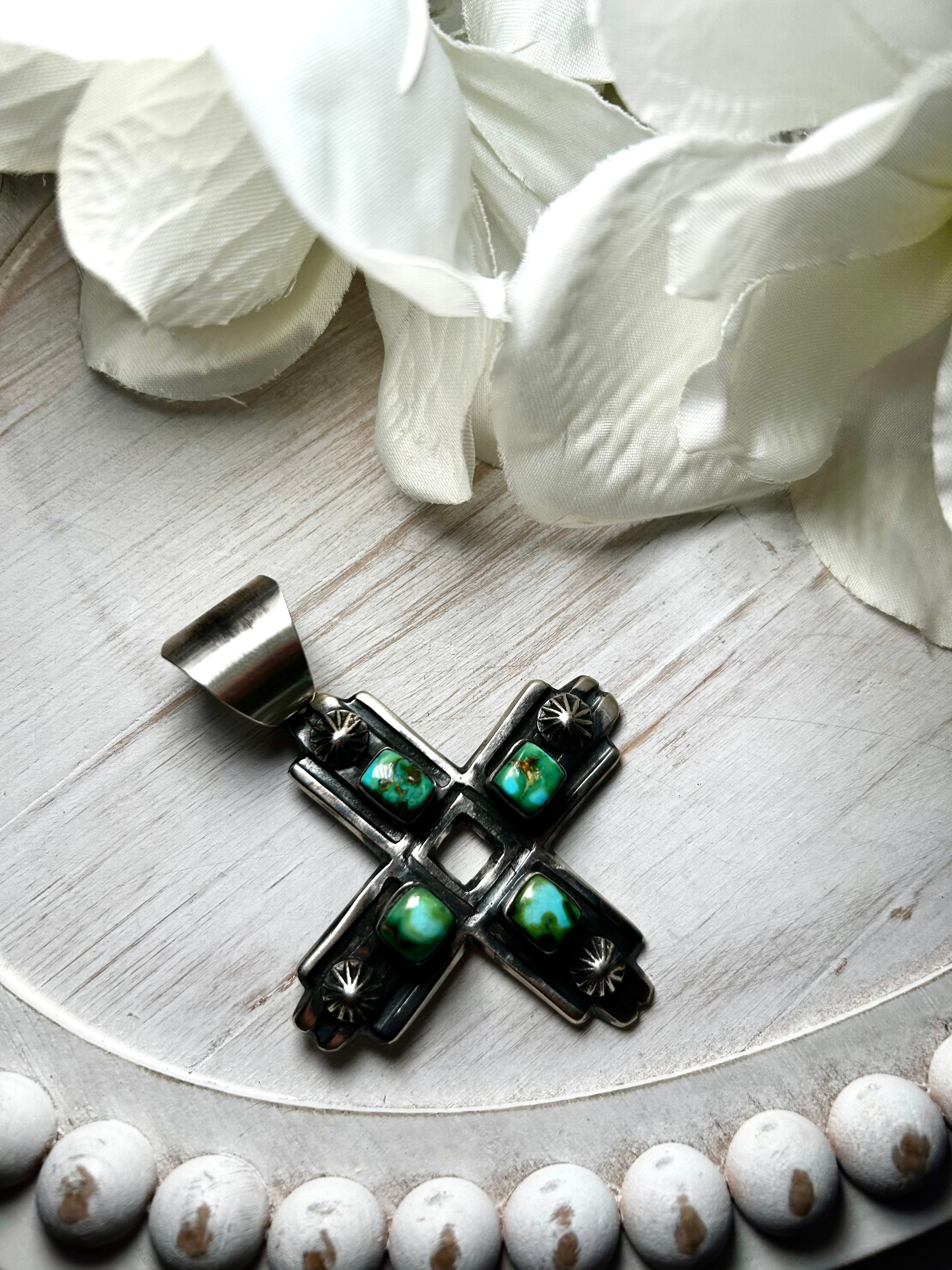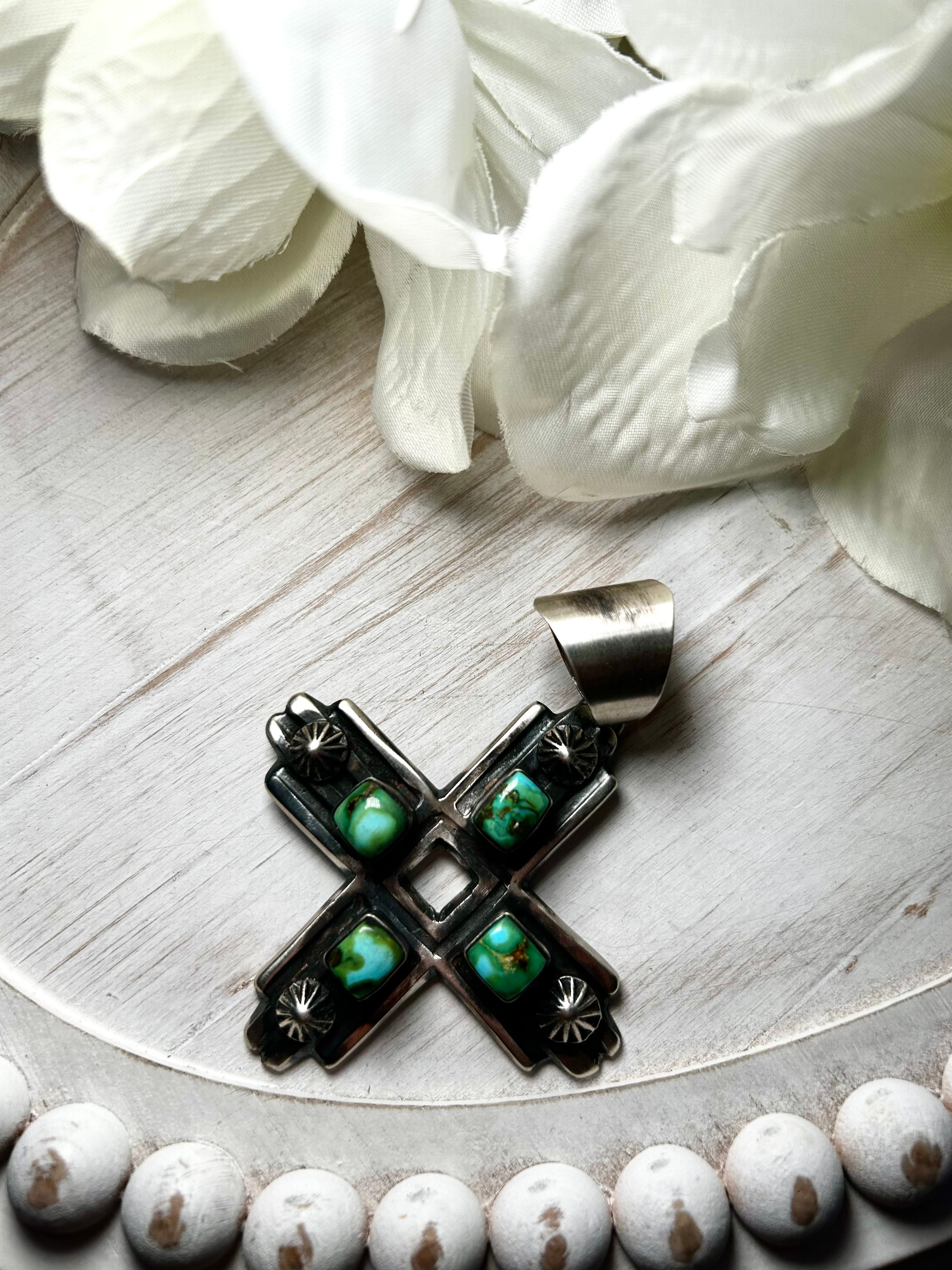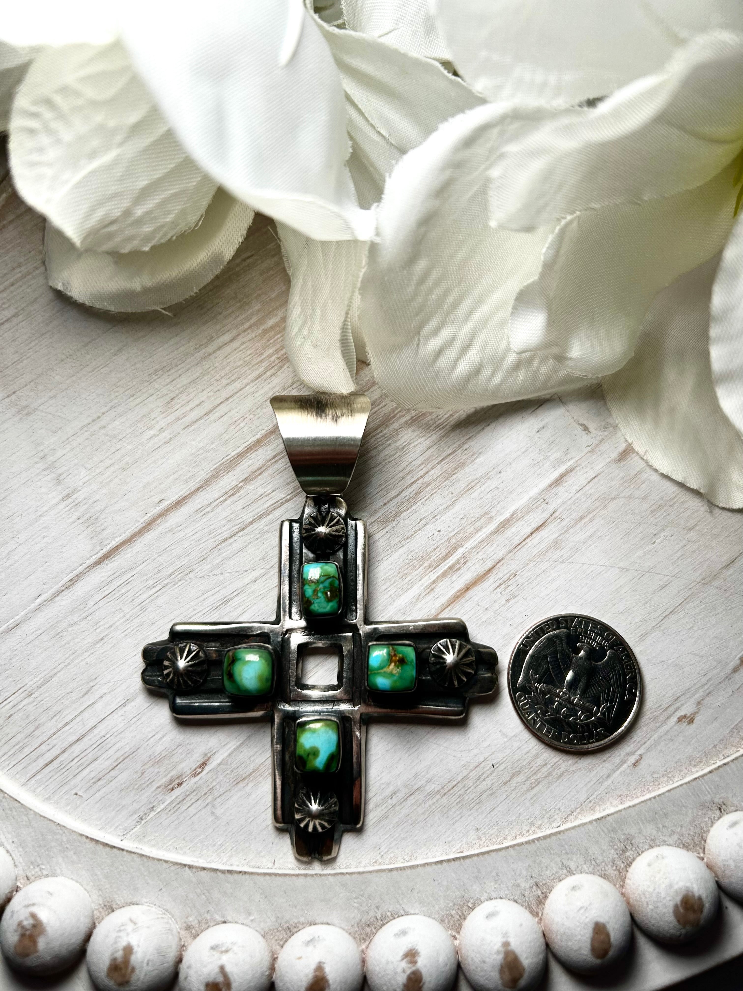 Chimney Butte Sonoran MountainTurquoise & Sterling Silver Pendant. It measures 3 1/2 inches long and 2 1/2 inches wide. Signed by the artist and stamped sterling silver. Pendant only!