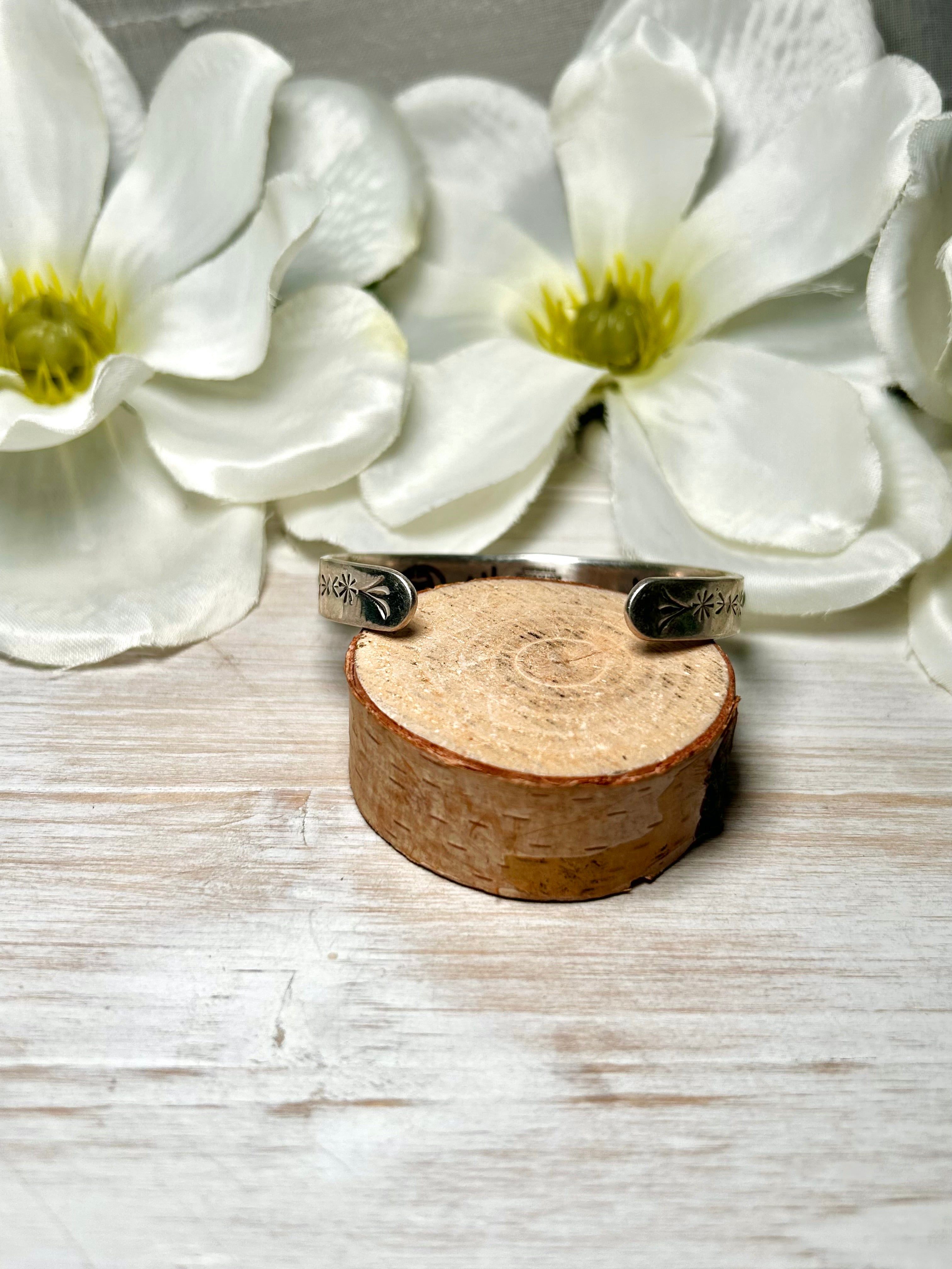 Don Dodson Non-Native Kingman Turquoise & Sterling Silver Cuff Bracelet. It measures 1/4 of an inch wide with an inside circumference of 5 1/2 inches and a gap of 1 1/8 inches. Signed by the artist and stamped sterling silver.