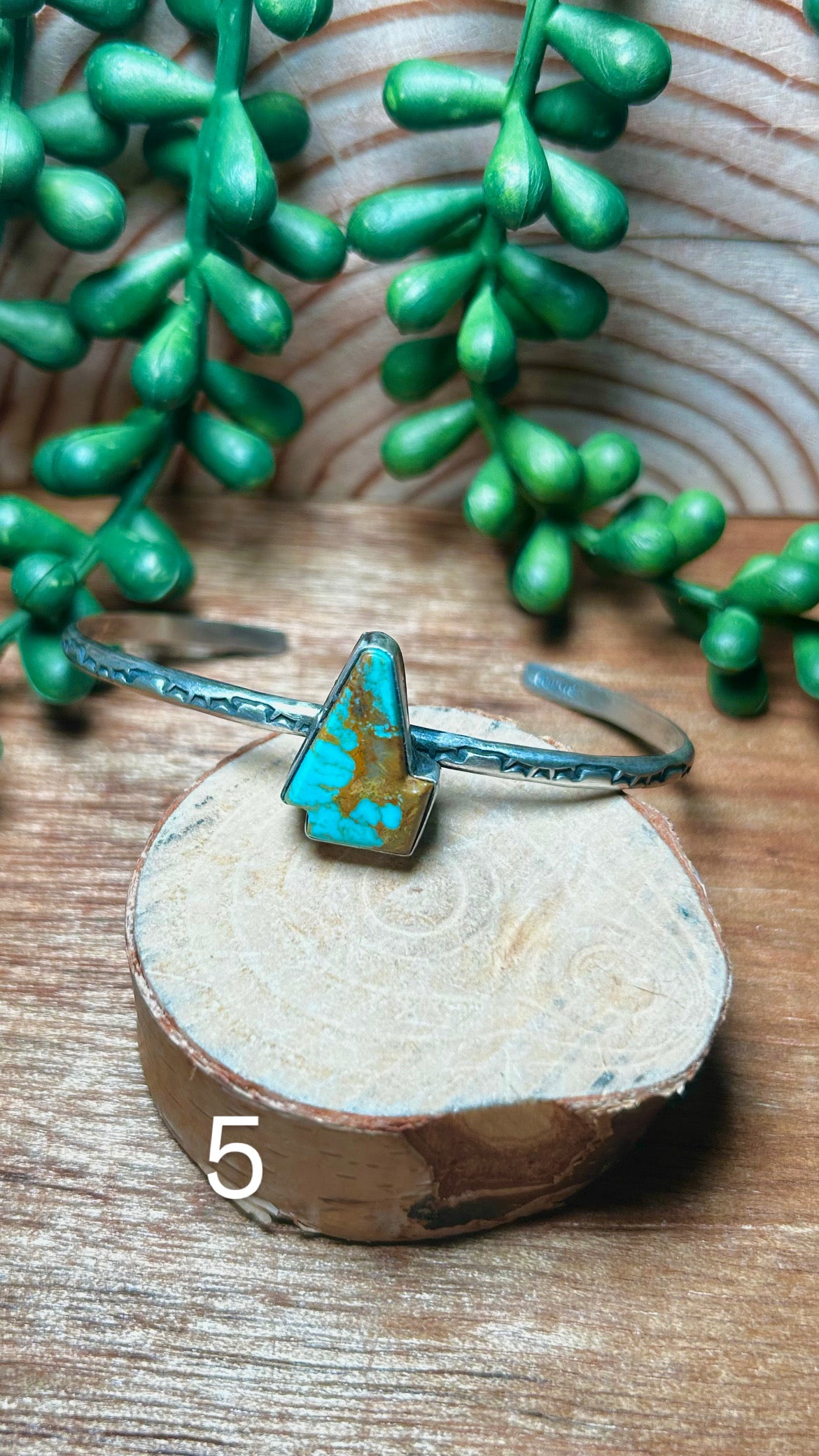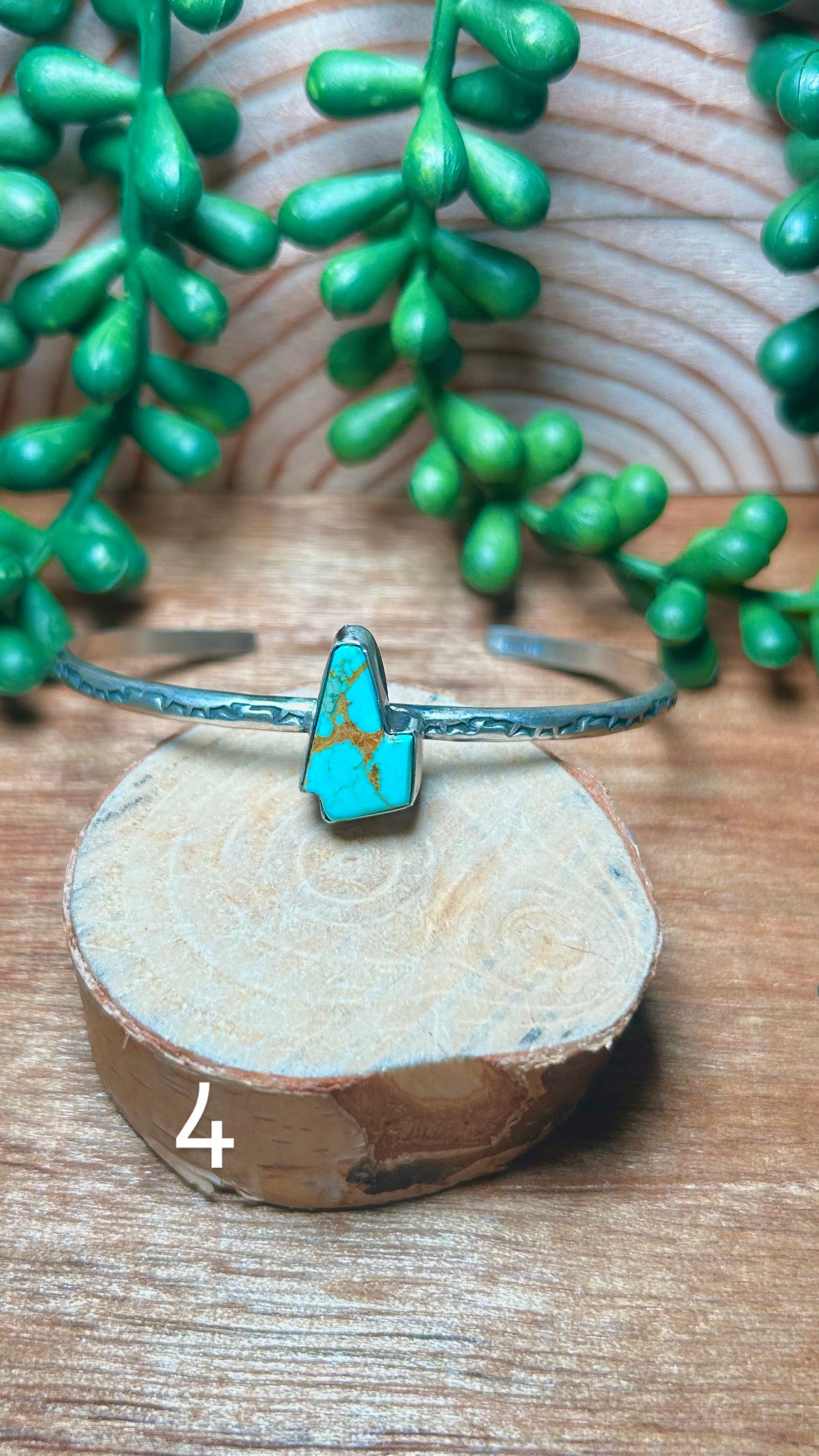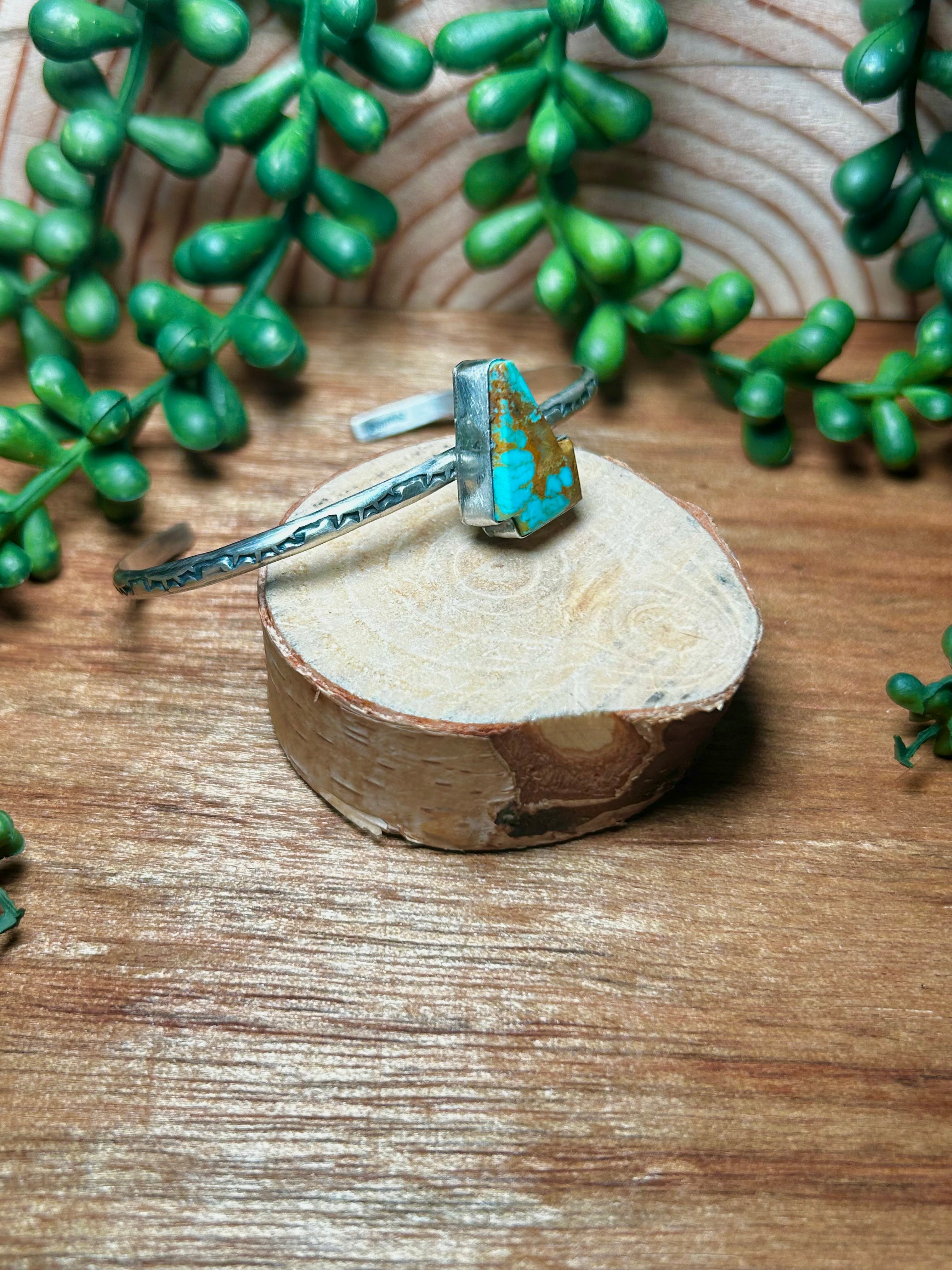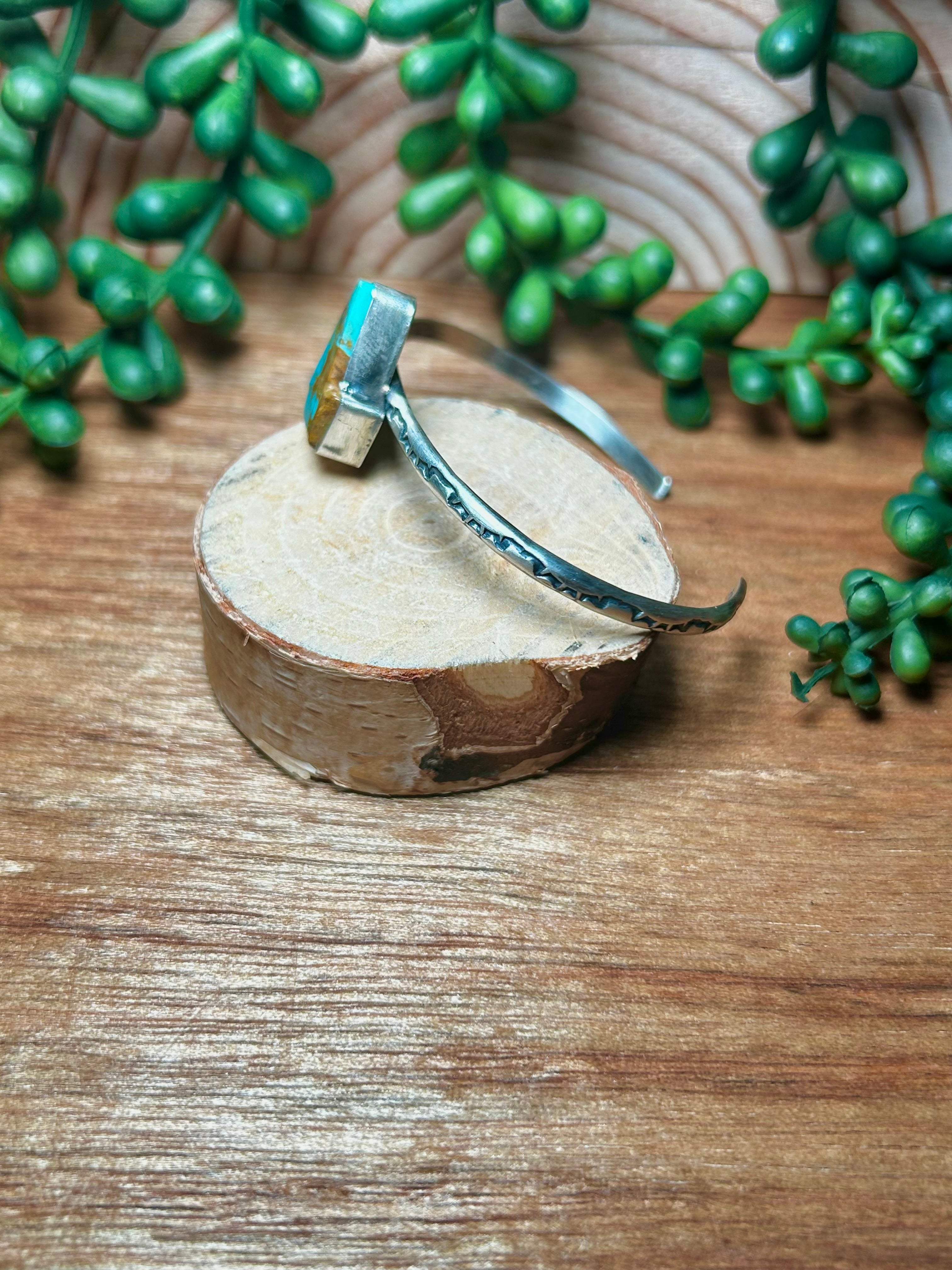 Donovan Skeets Kingman Turquoise & Sterling Silver Cuff Bracelet. It measures 3/4 of an inch wide with an inside circumference of 5 3/4 inches and a gap of 1 1/4 inches. Signed by artist and stamped sterling silver.