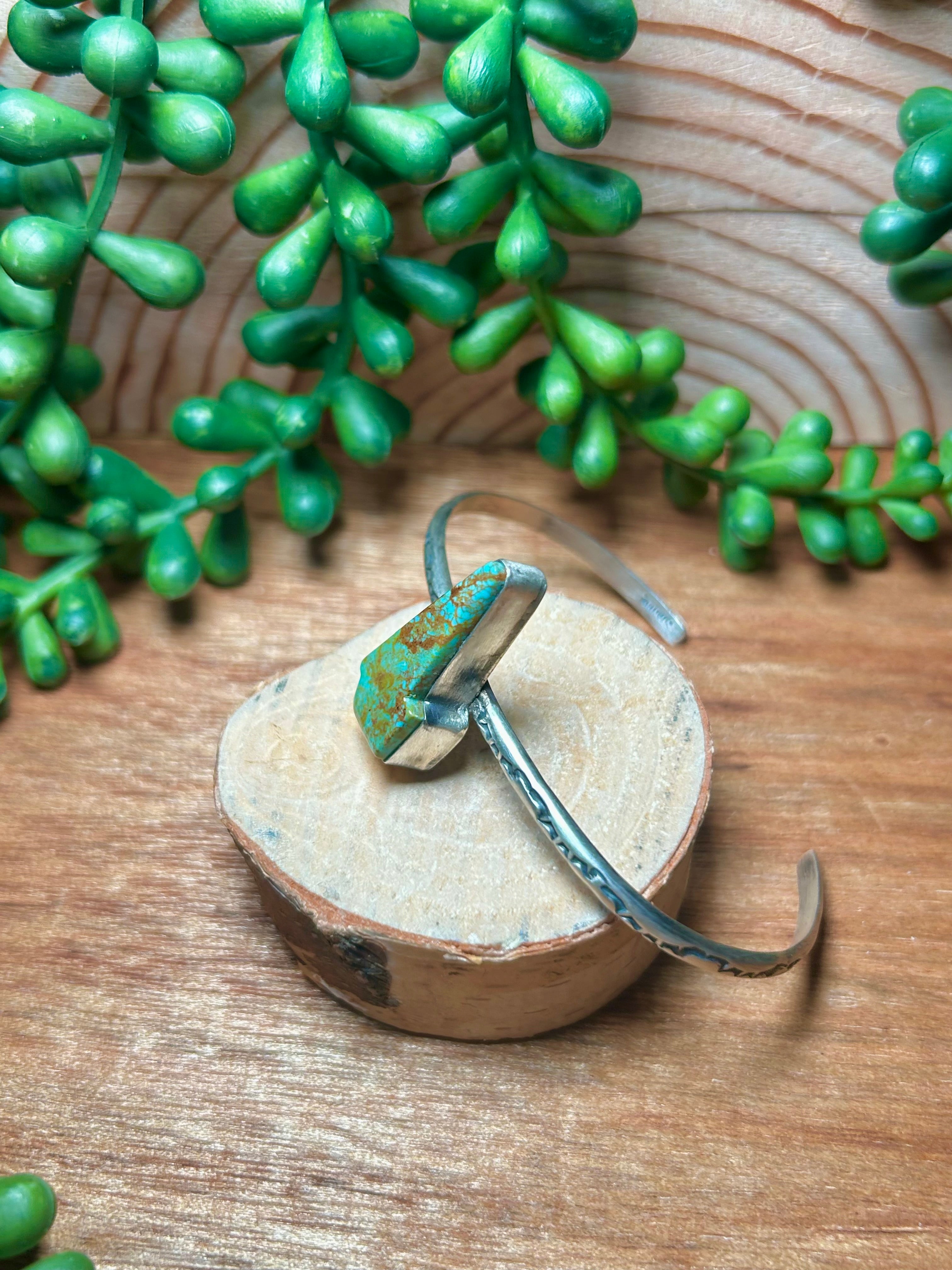 Donovan Skeets Kingman Turquoise & Sterling Silver Cuff Bracelet. It measures 1 1/8 inches wide with an inside circumference of 5 3/4 inches and a gap of 1 1/4 inches. Signed by artist and stamped sterling silver.