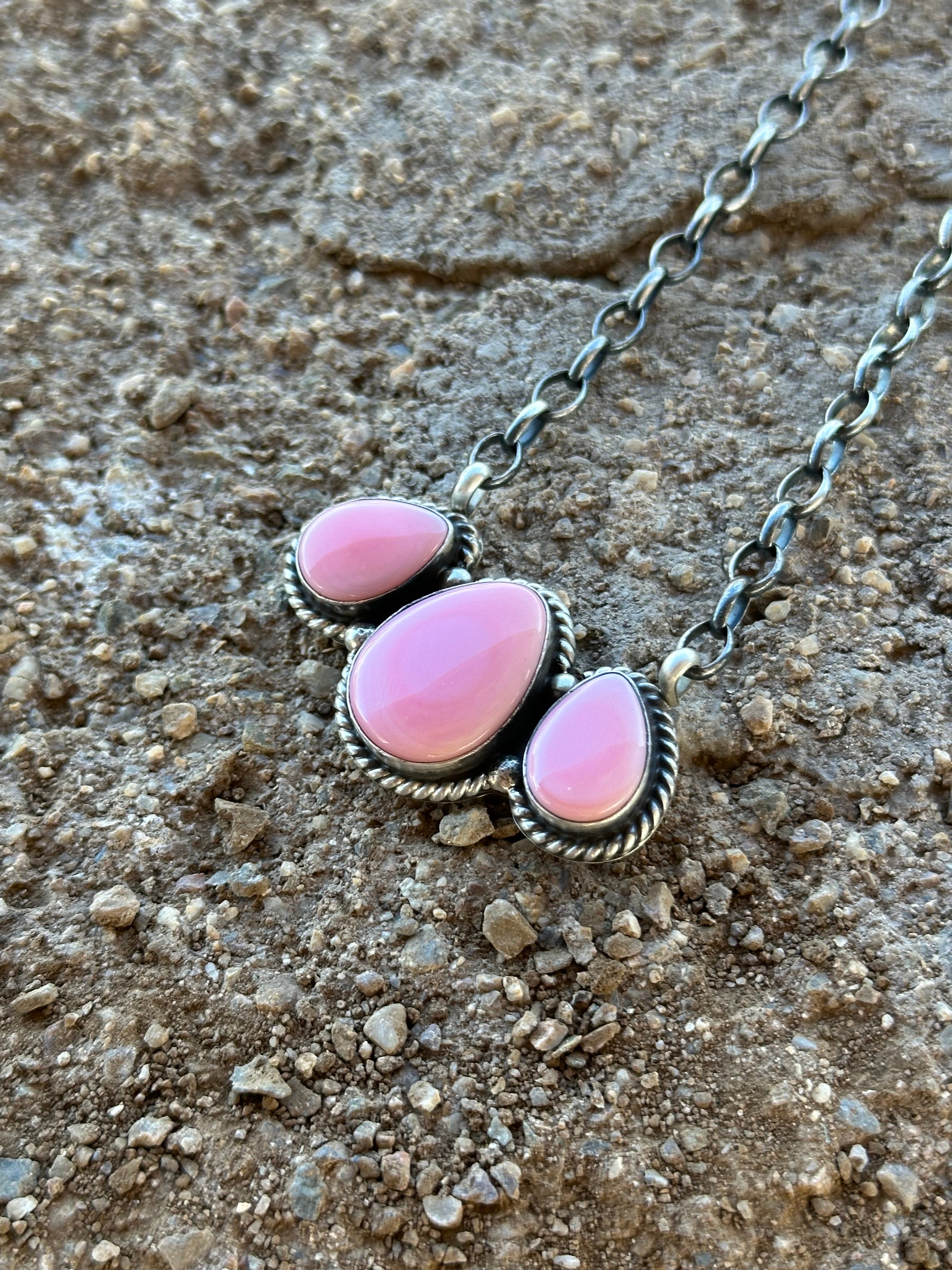 Donovan Skeets Pink Conch & Sterling Silver Necklace. It measures 18 inches long with hang while the chain by itself measures 16 inches long. Signed by the artist and stamped sterling silver.