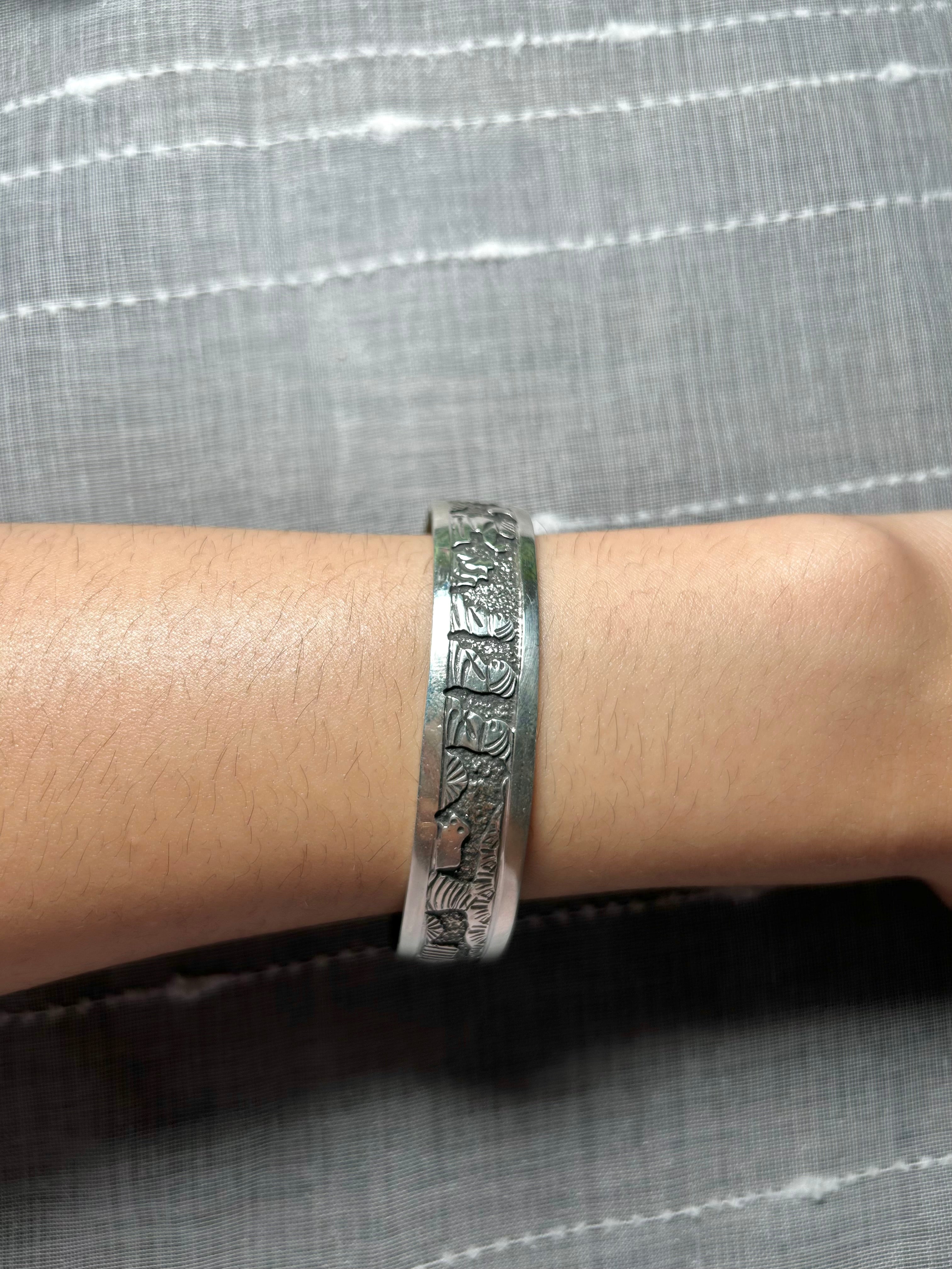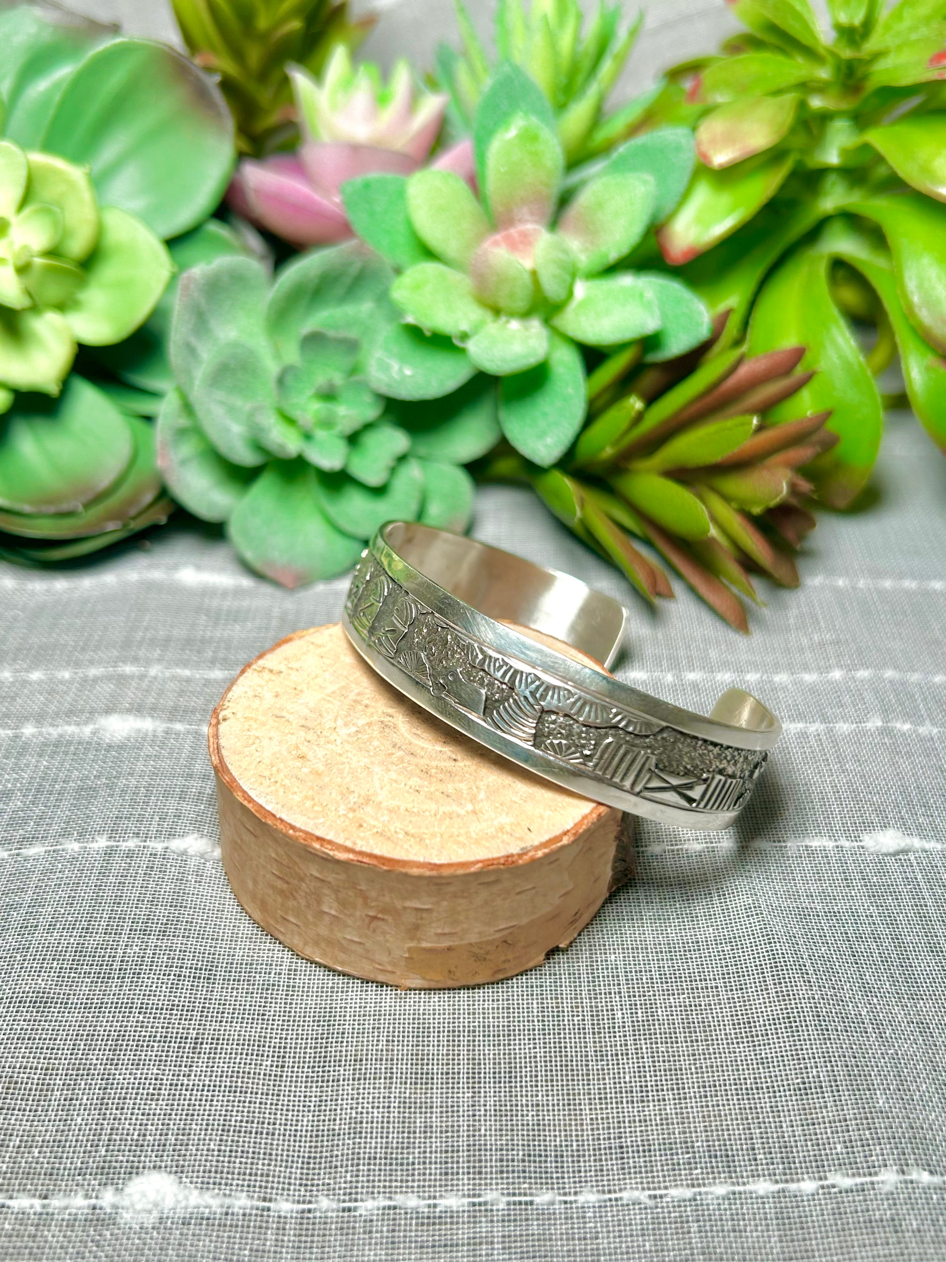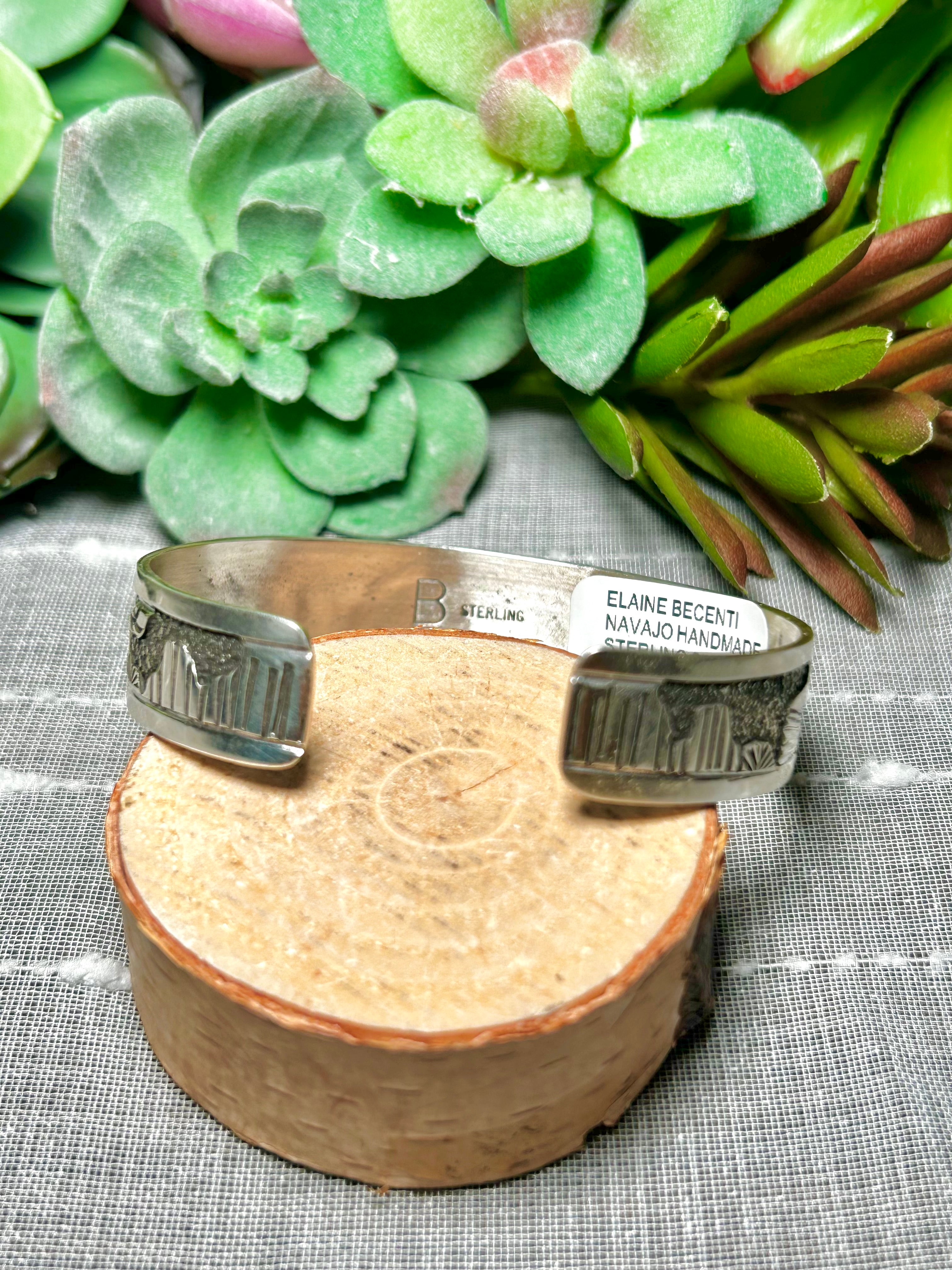 Elaine Becenti Sterling Silver Cuff Bracelet. It measures 1/2 of an inch wide with an inside circumference of 5 7/8 inches and a gap of 7/8 of an inch. Signed by the artist and stamped sterling silver.