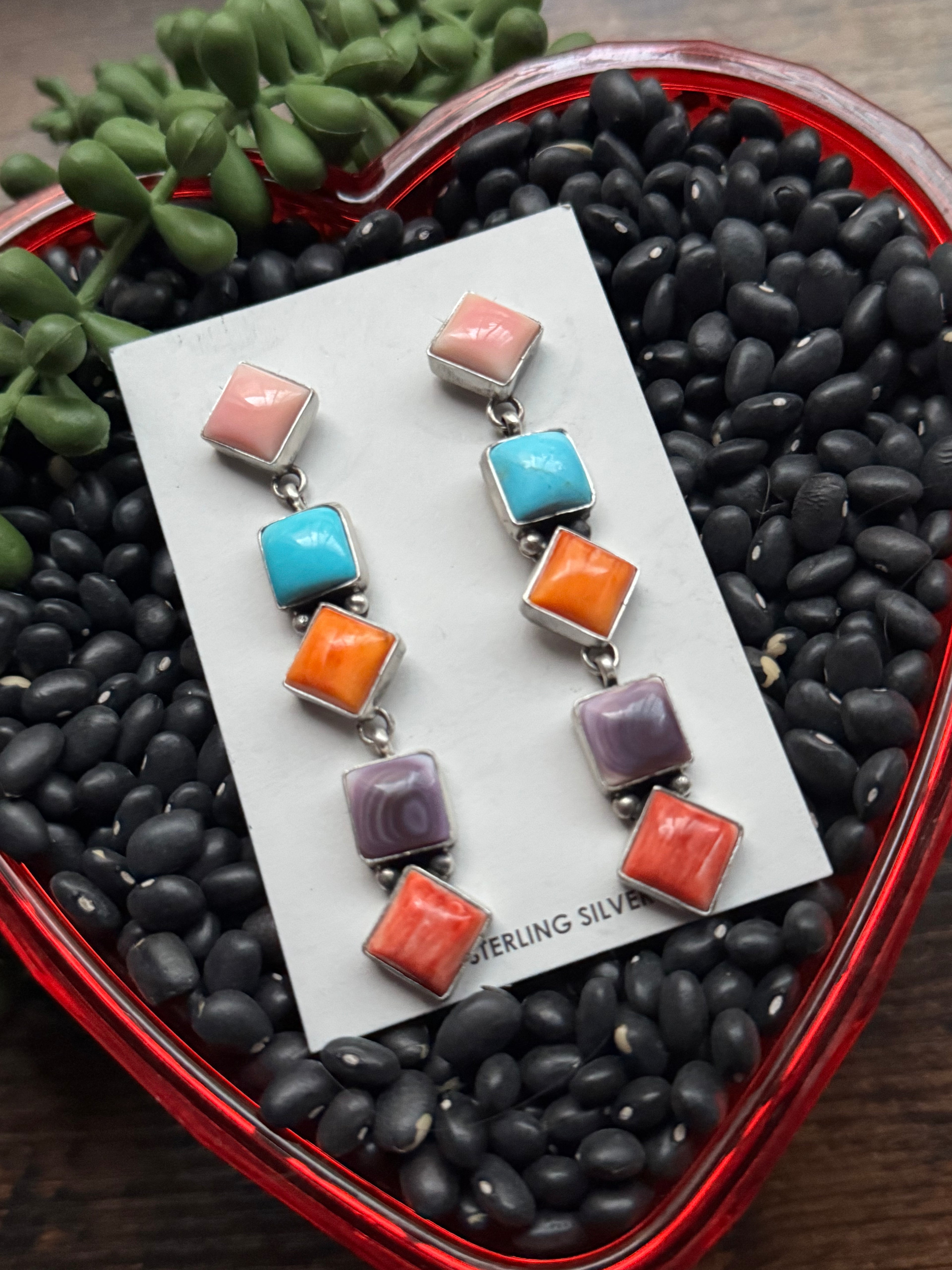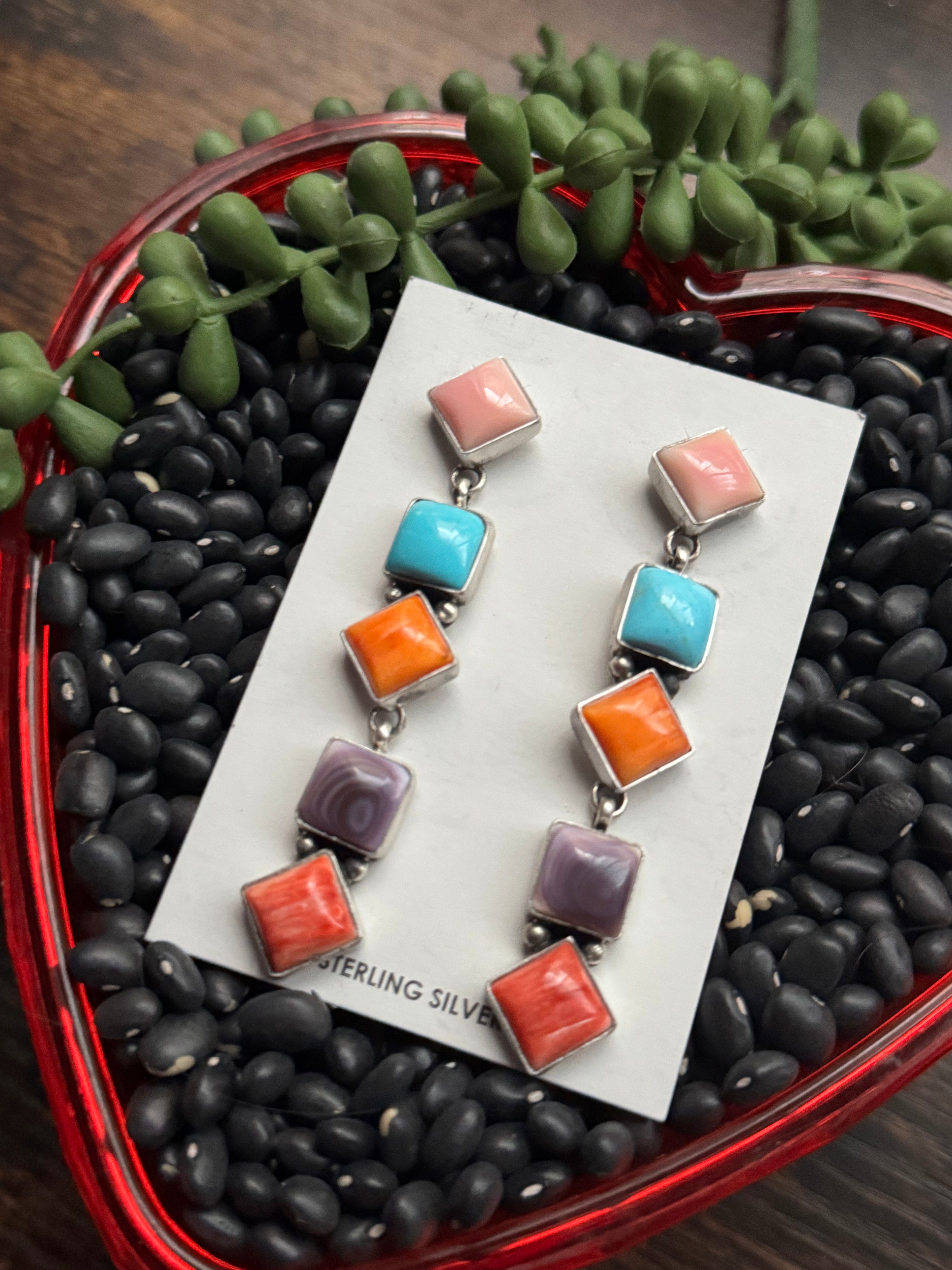 Have a spice of pink in your everyday. E. Richards Multi Stone & Sterling Silver Post Dangle Earrings. It measures just under 3 1/4 inches long and 5/8 of an inch wide. Signed and stamped by the artist.
