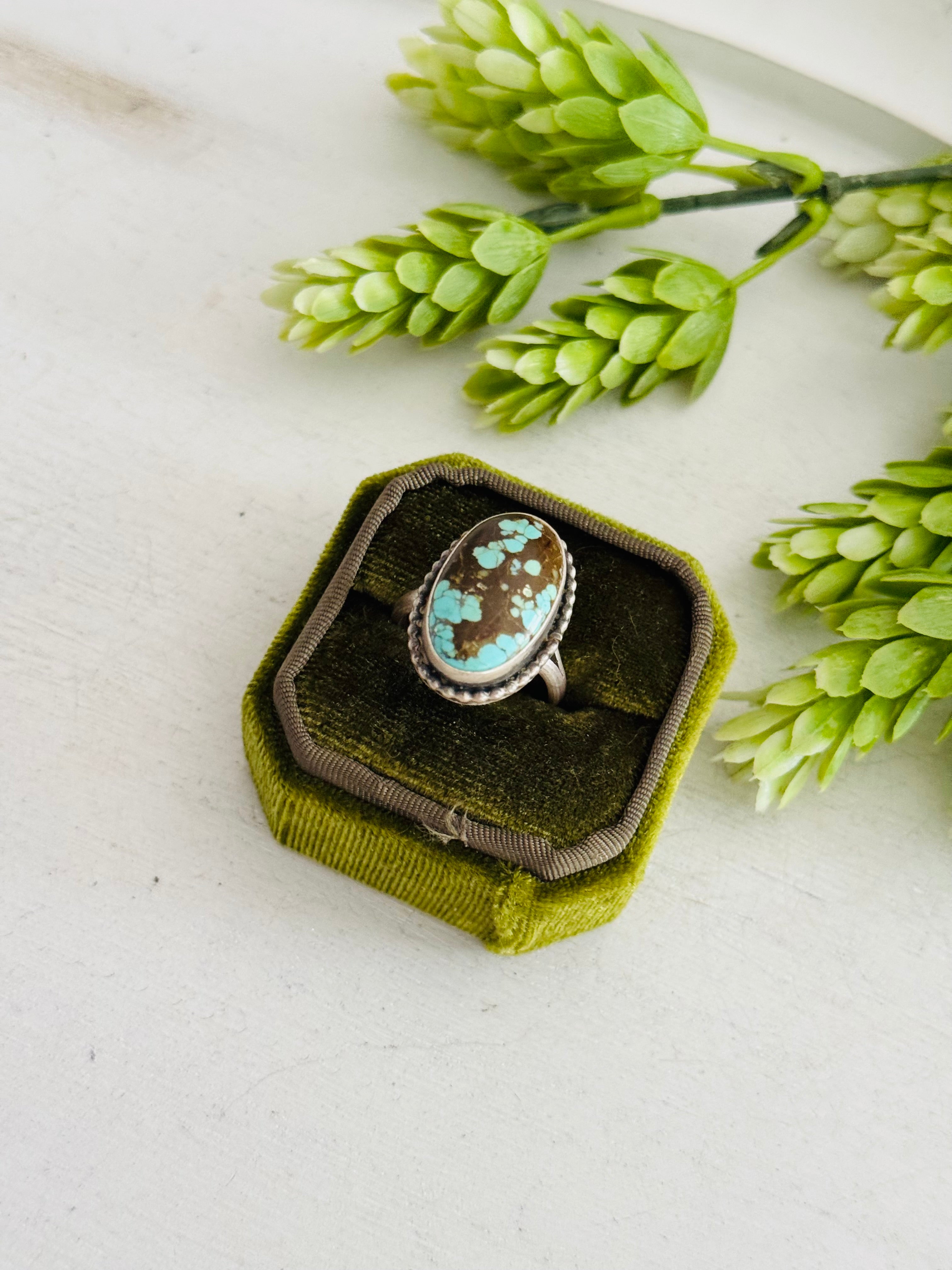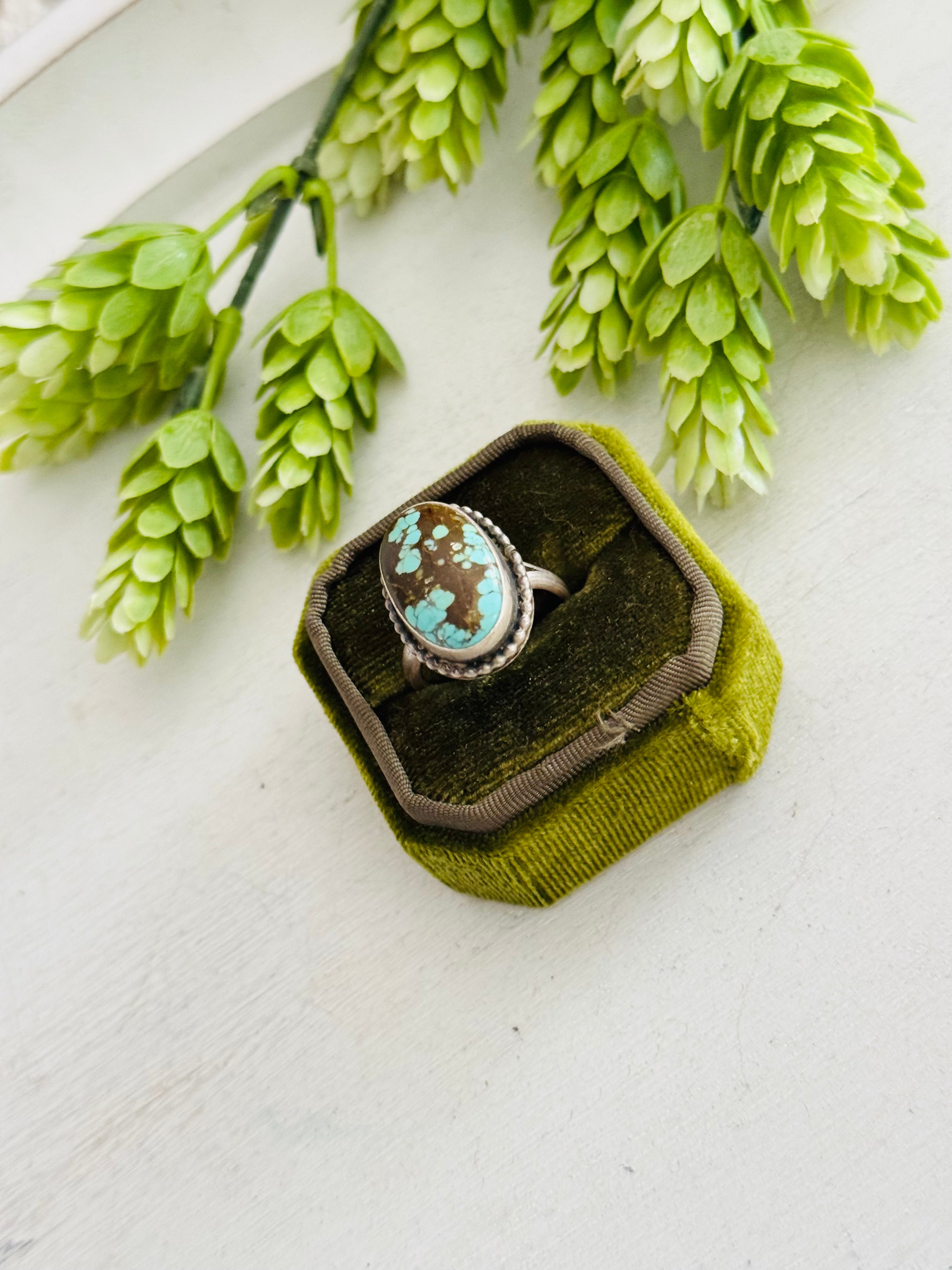 Eli Skeets #8 Turquoise & Sterling Silver Adjustable Ring. It measures 1 inch long and 5/8 of an inch wide. Signed by the artist and stamped sterling silver.