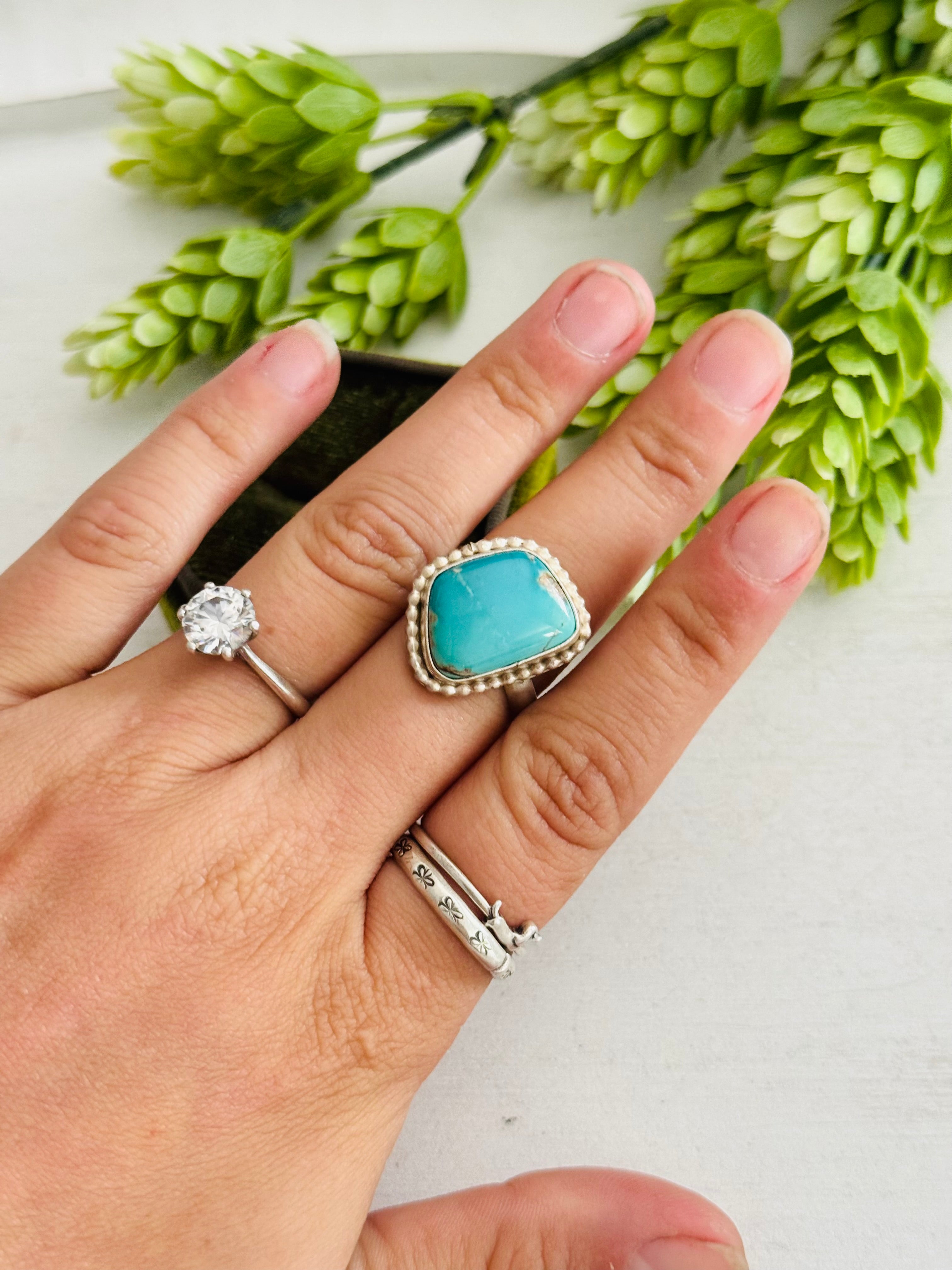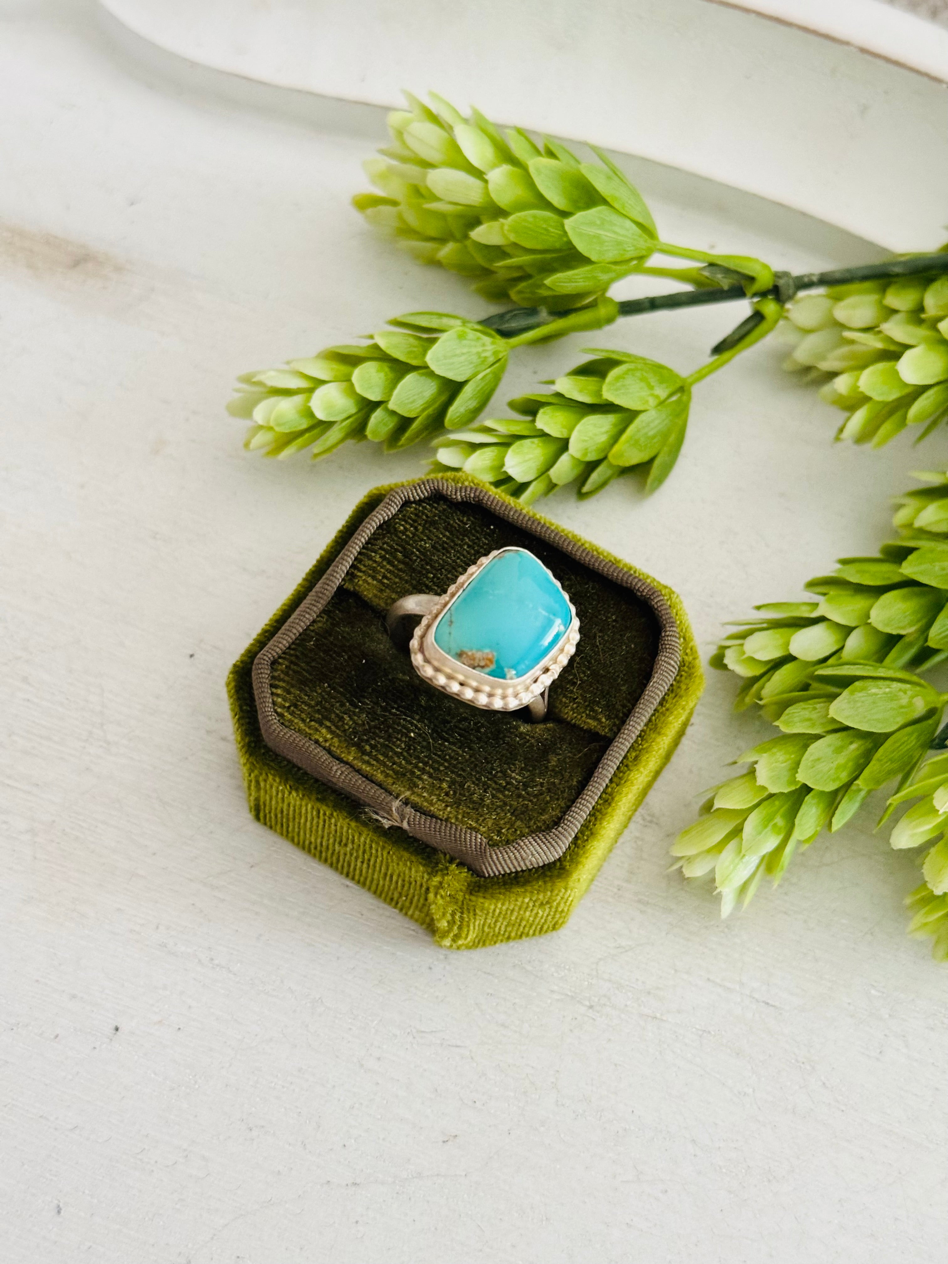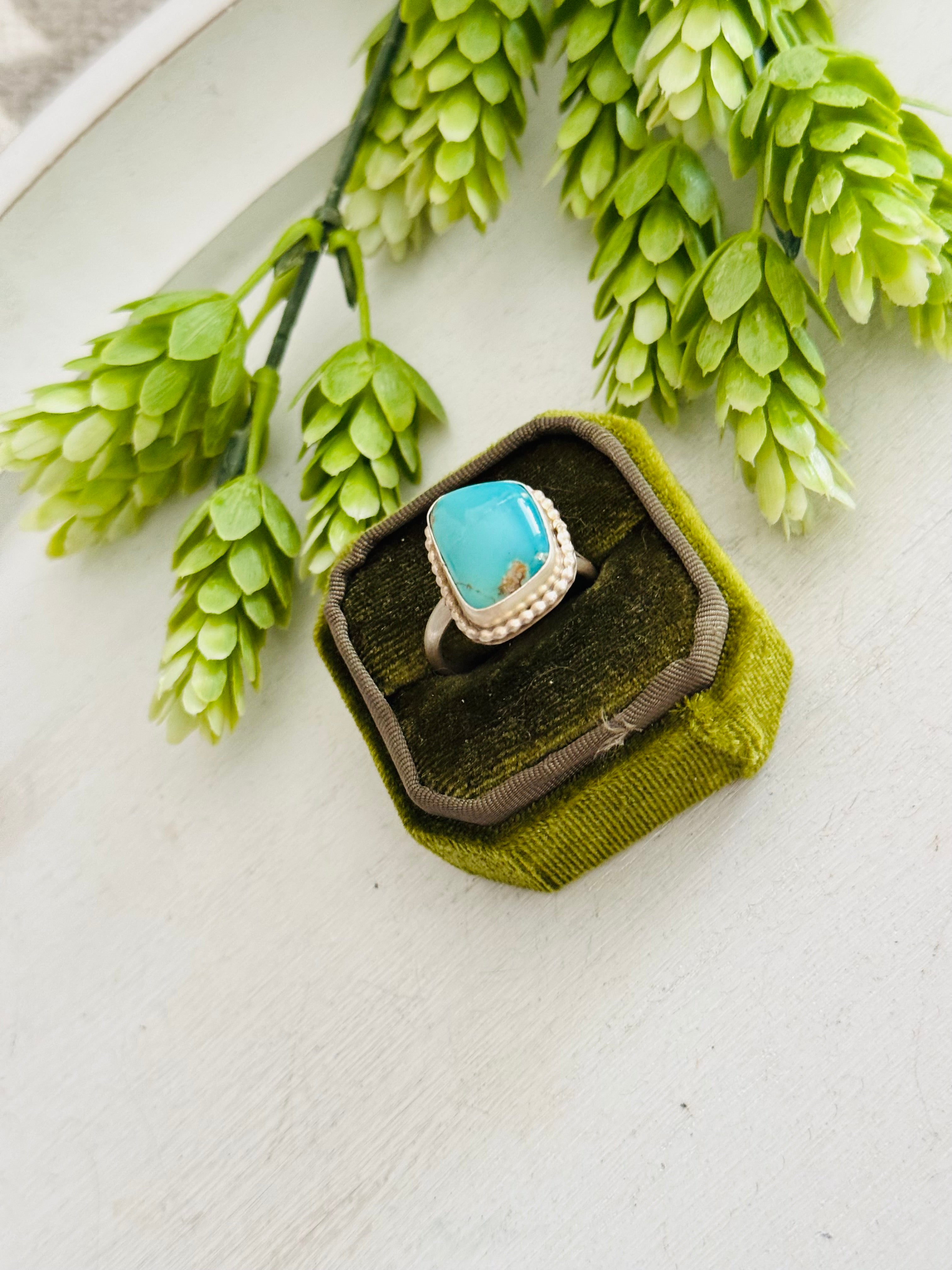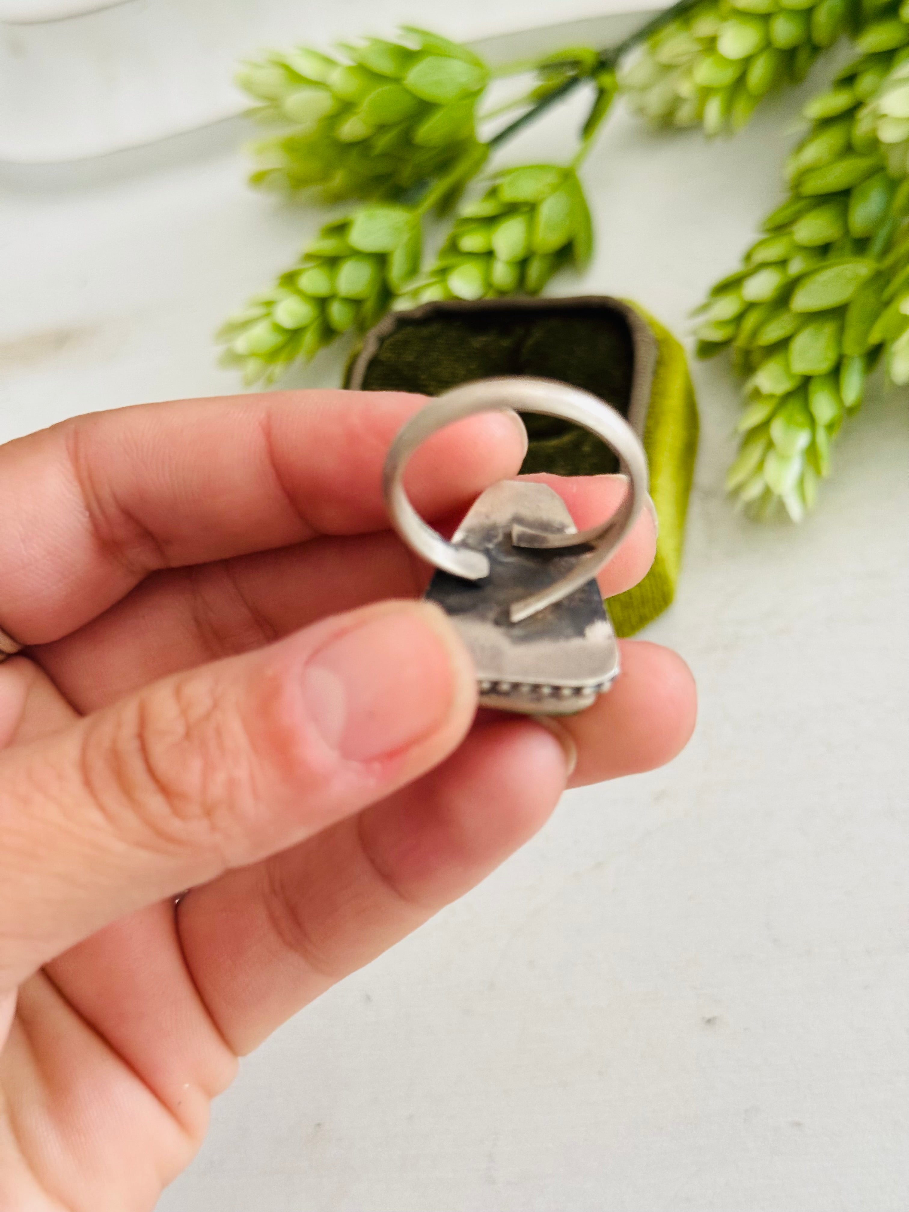 Eli Skeets Royston Turquoise & Sterling Silver Adjustable Ring. It measures 7/8 of an inch long and 5/8 of an inch wide. Signed by the artist and stamped sterling silver.