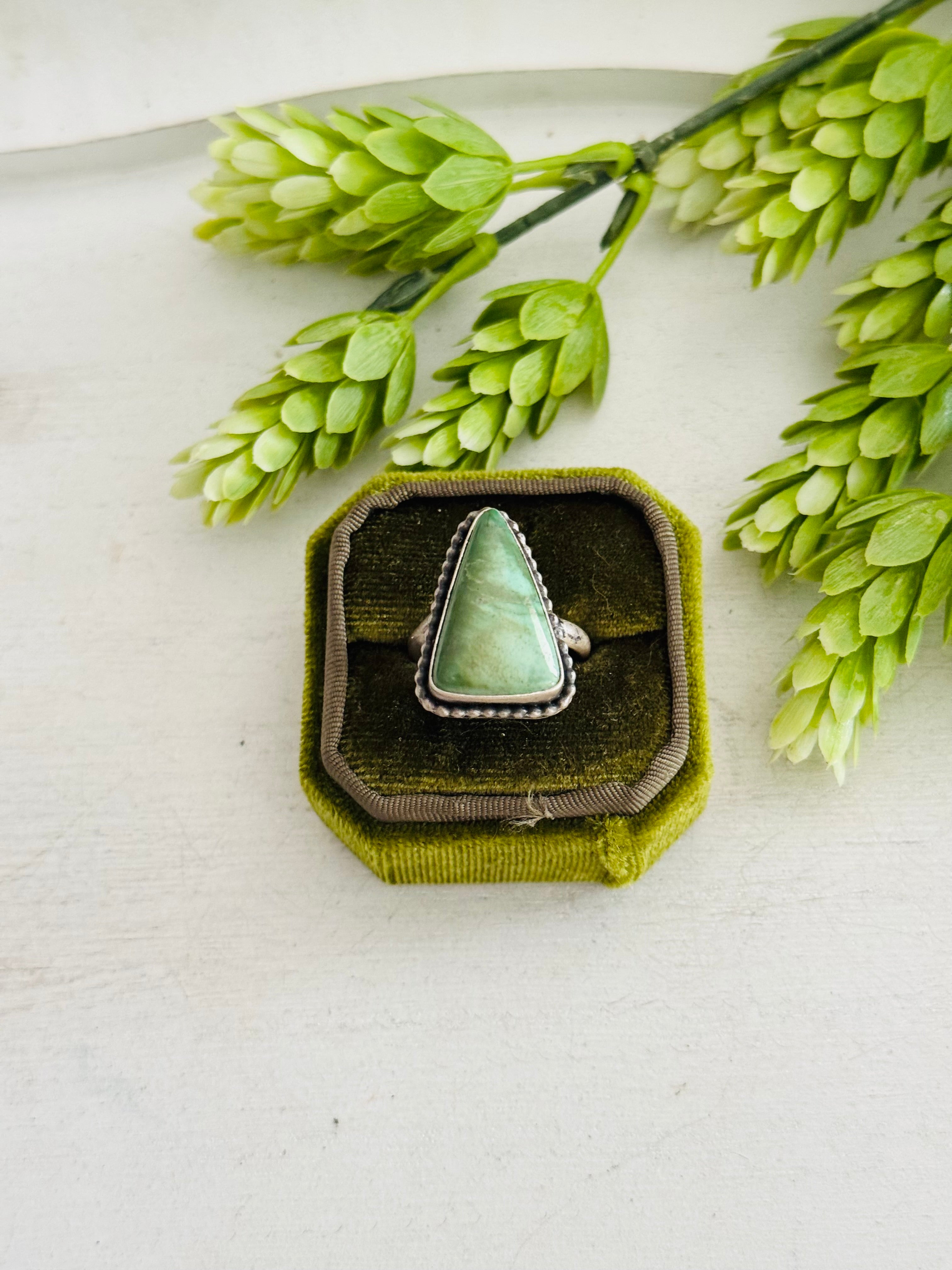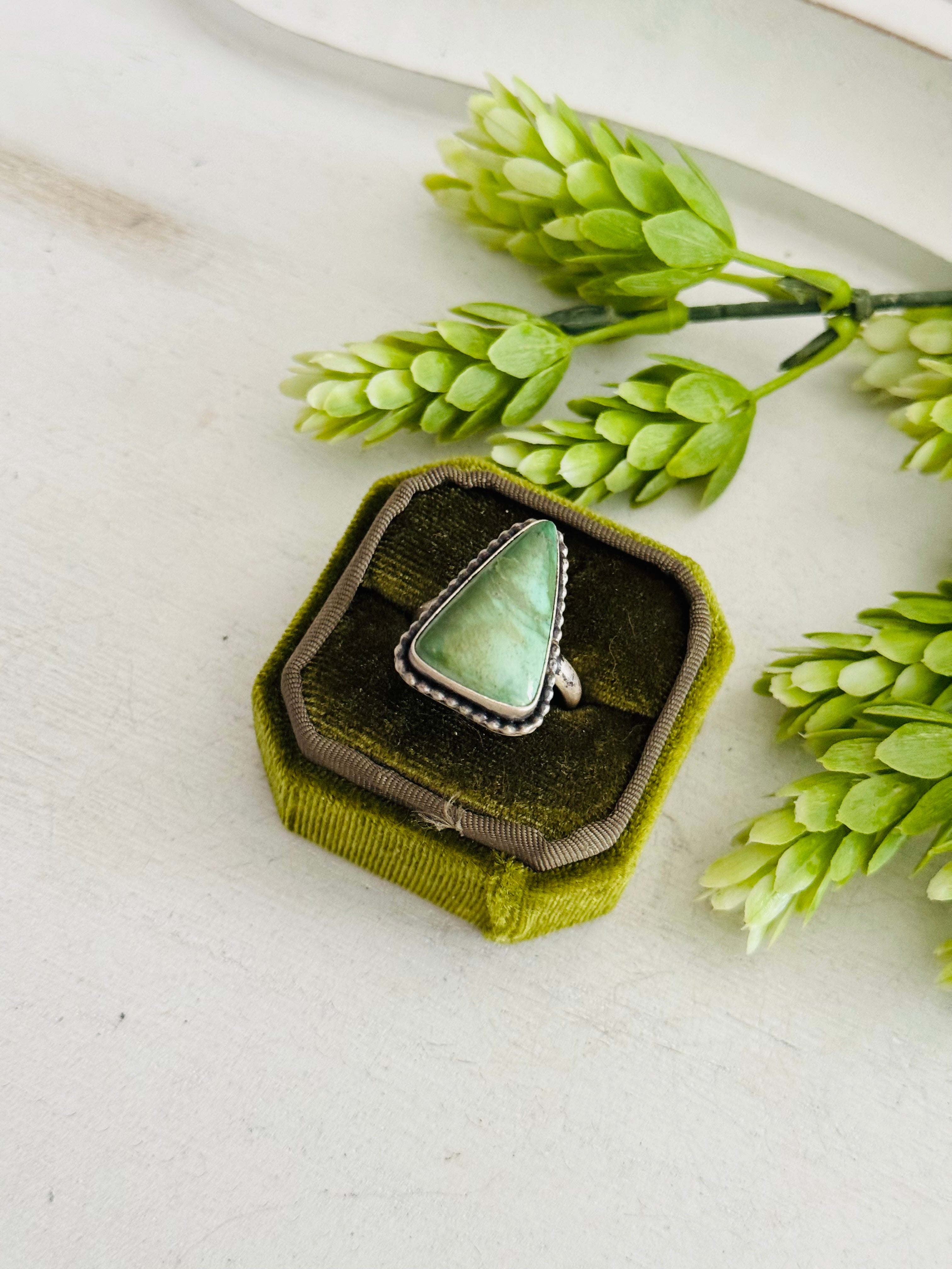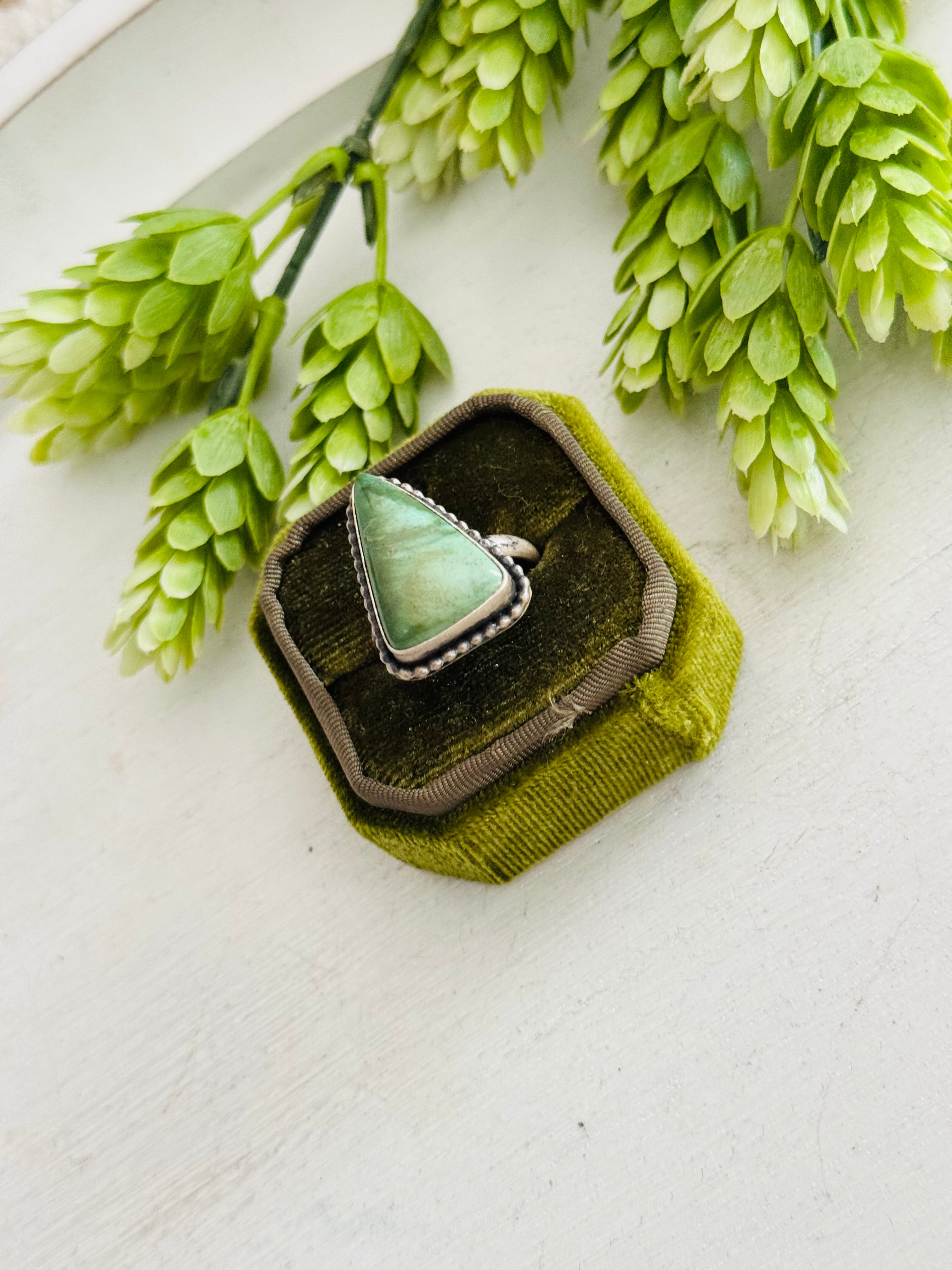 Eli Skeets Royston Turquoise & Sterling Silver Adjustable Ring. It measures 1 inch long and 3/4 of an inch wide. Signed by the artist and stamped sterling silver.