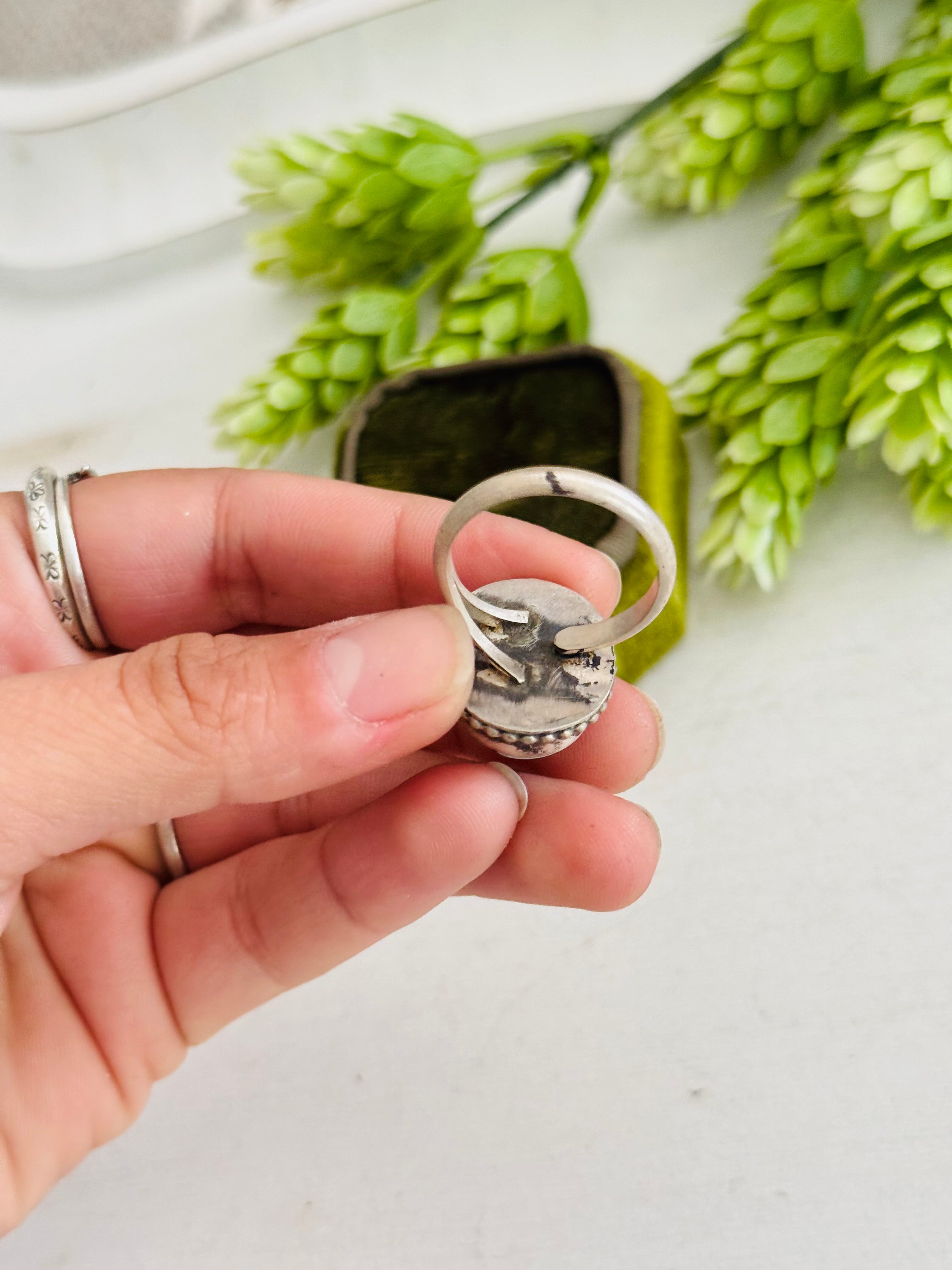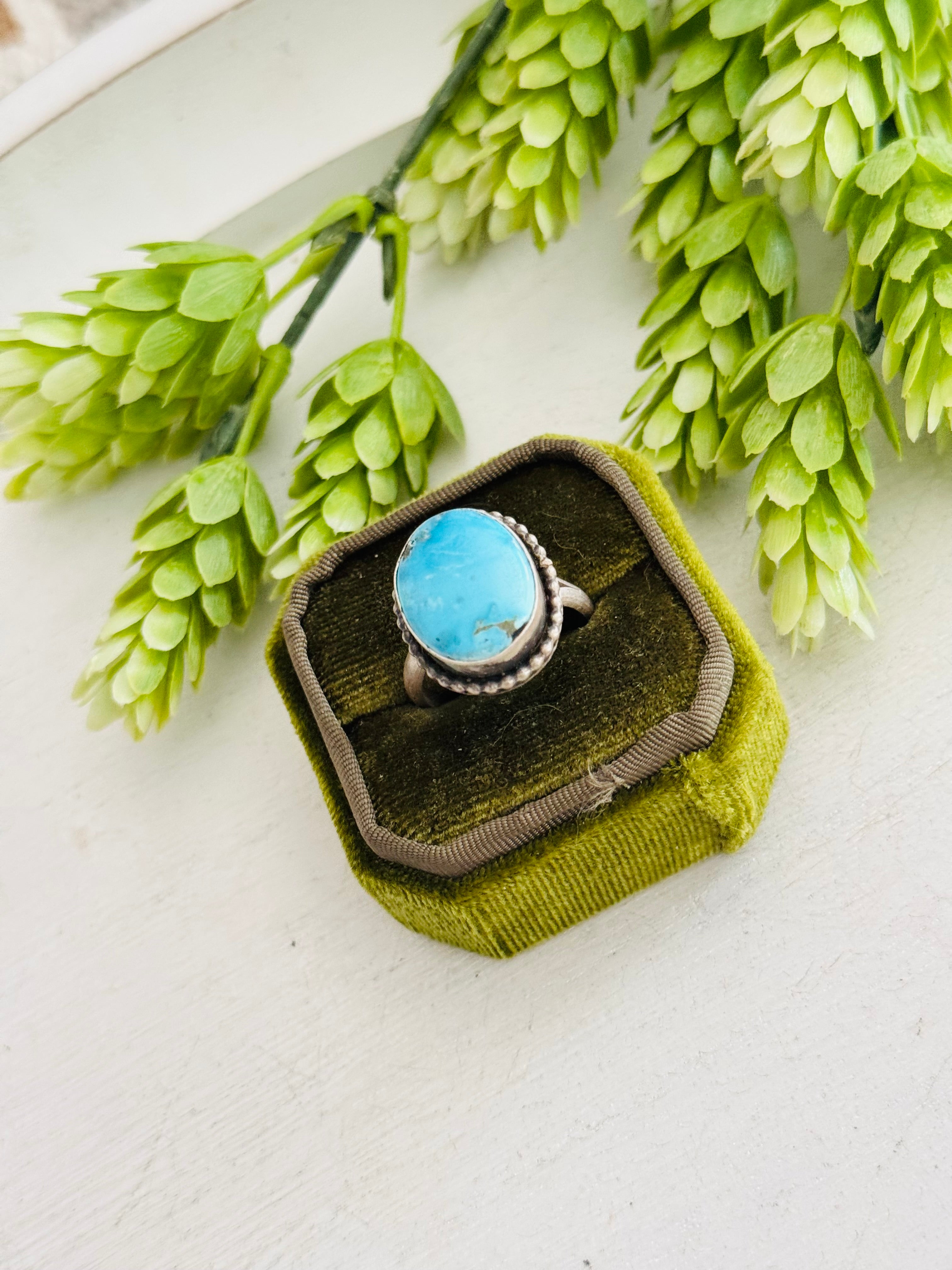 Eli Skeets Blue Ridge Turquoise & Sterling Silver Adjustable Ring. It measures 7/8 of an inch long and just under 3/4 of an inch wide. Signed by the artist and stamped sterling silver.