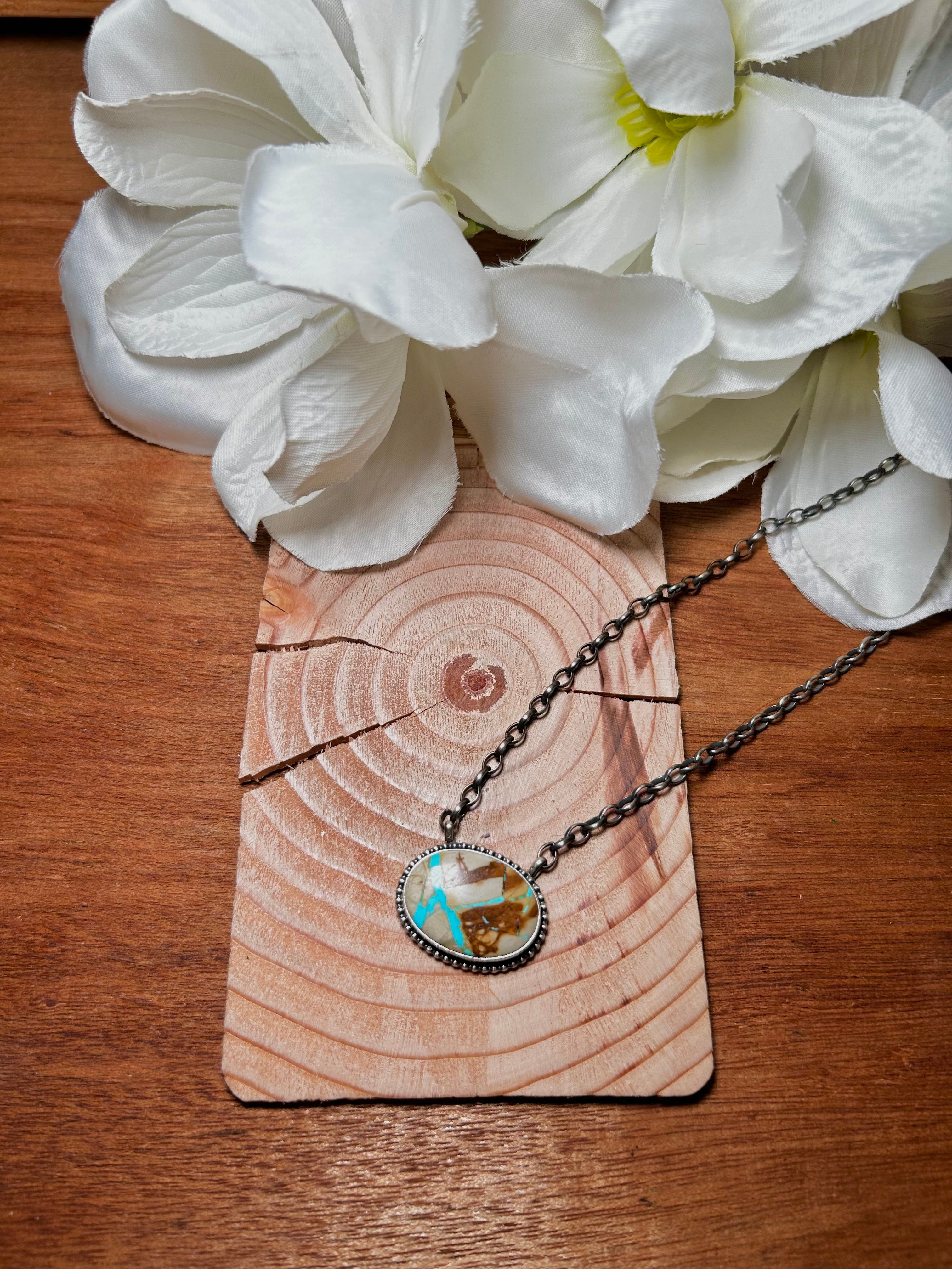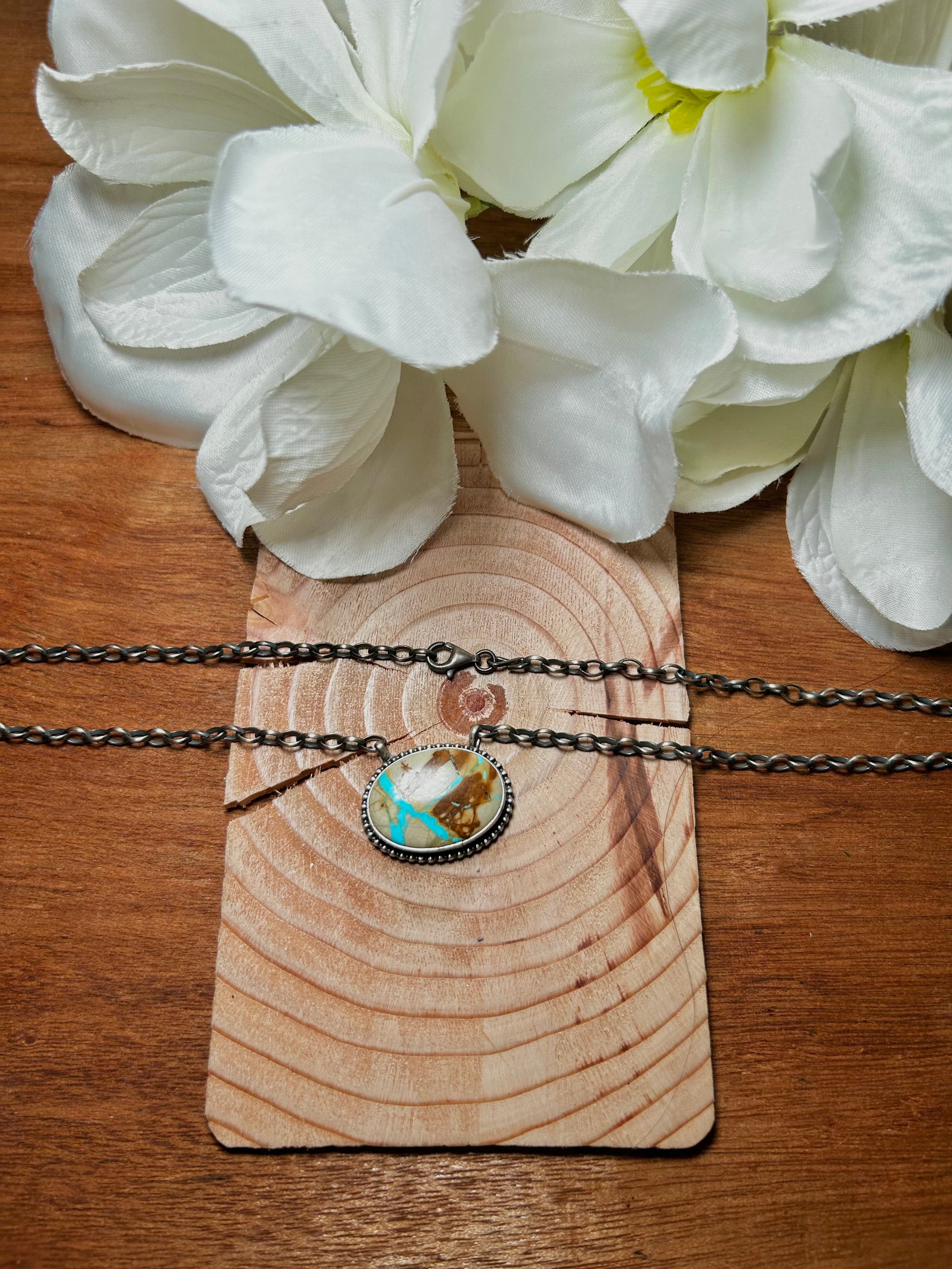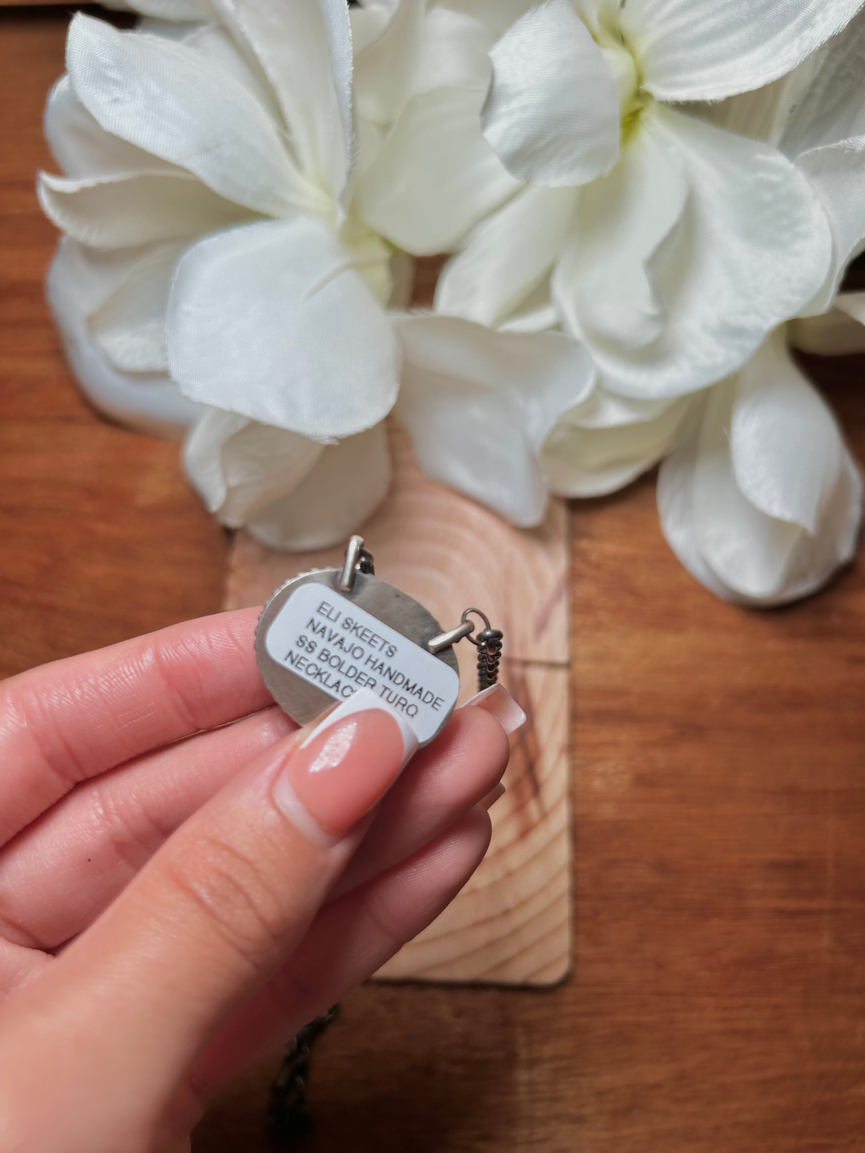 Eli Skeets Boulder Turquoise and Sterling Silver Necklace. It measures 20 inches long with hang while the chain measures 18 1/2 inches long. Signed by the artist and stamped sterling silver.