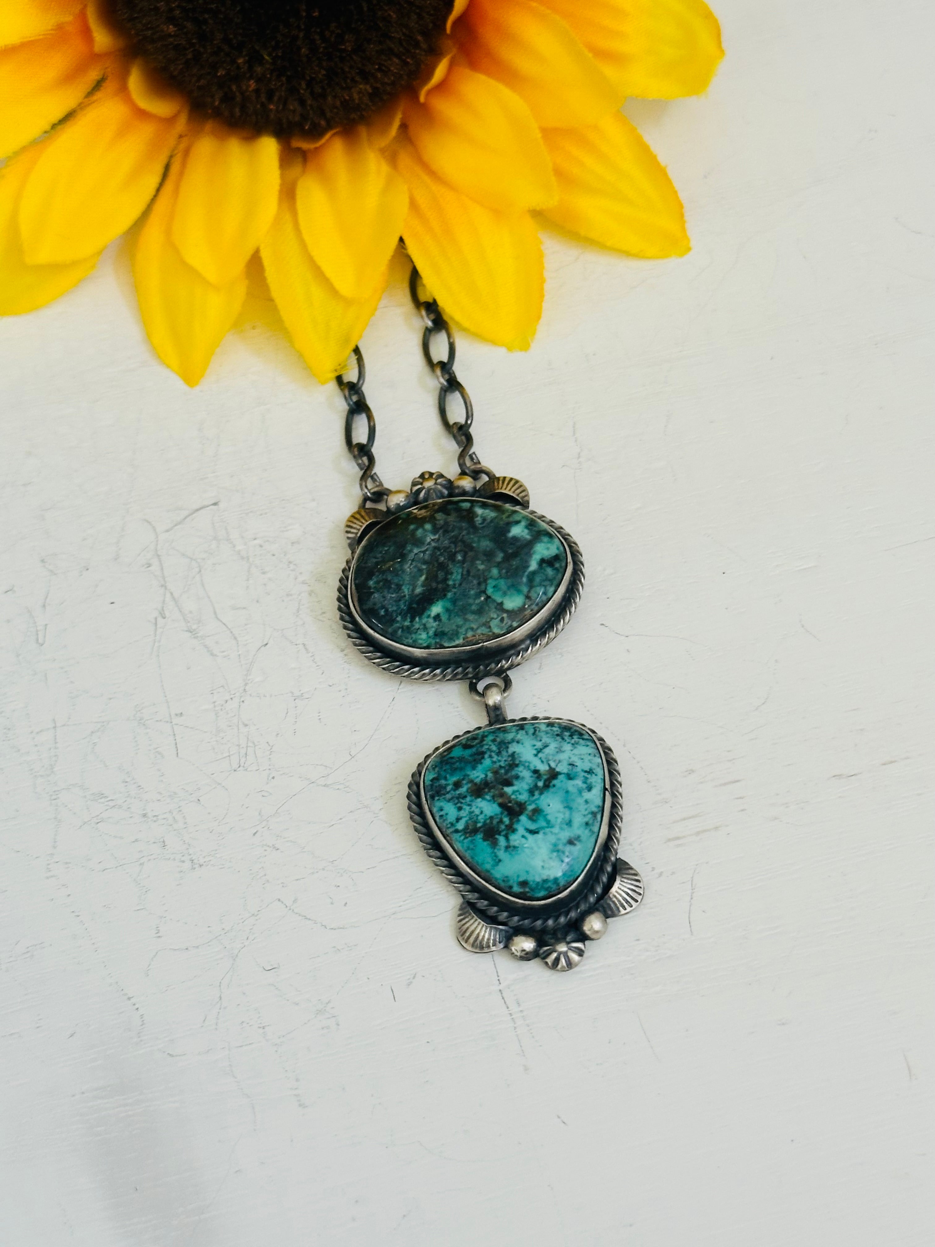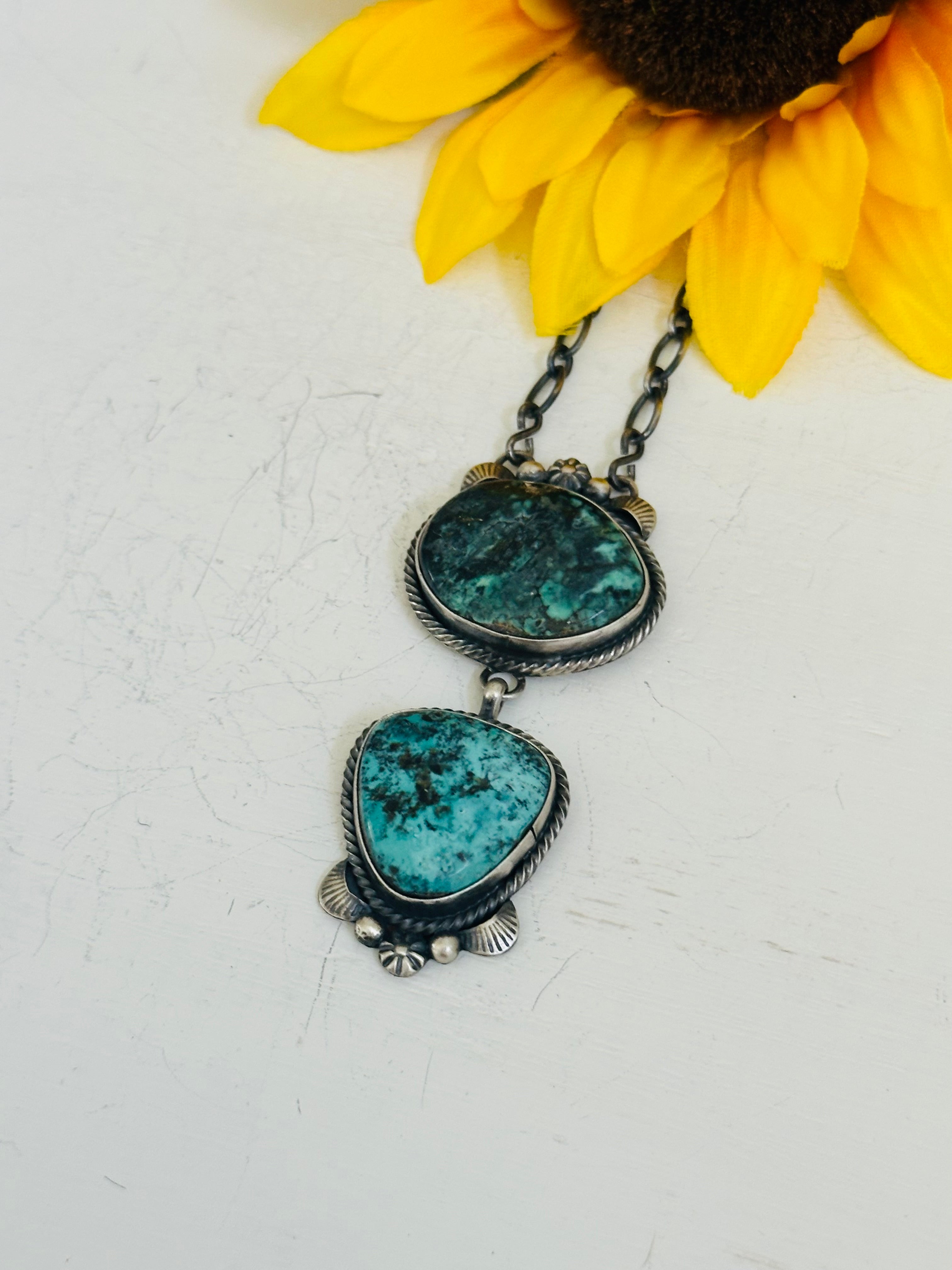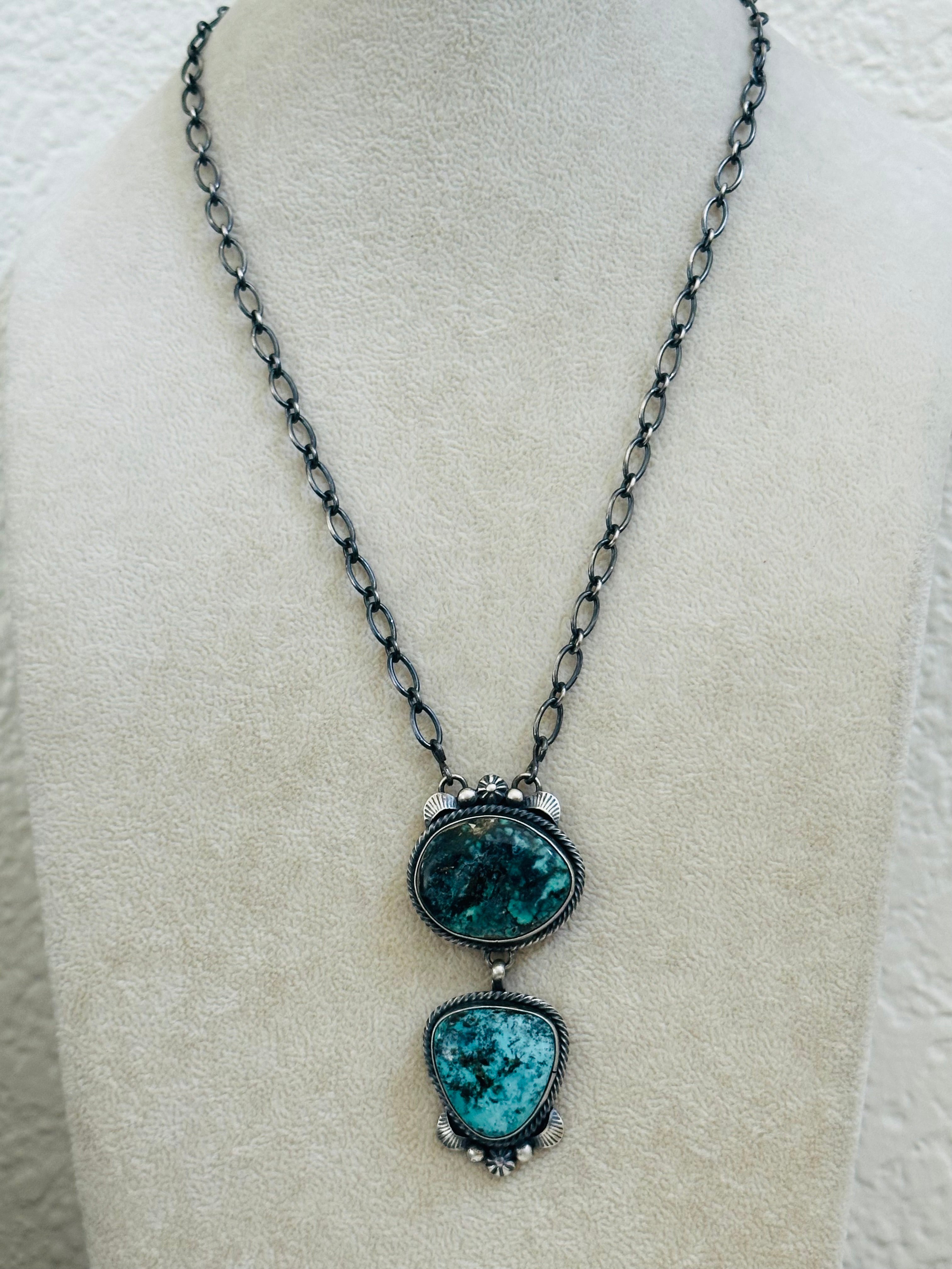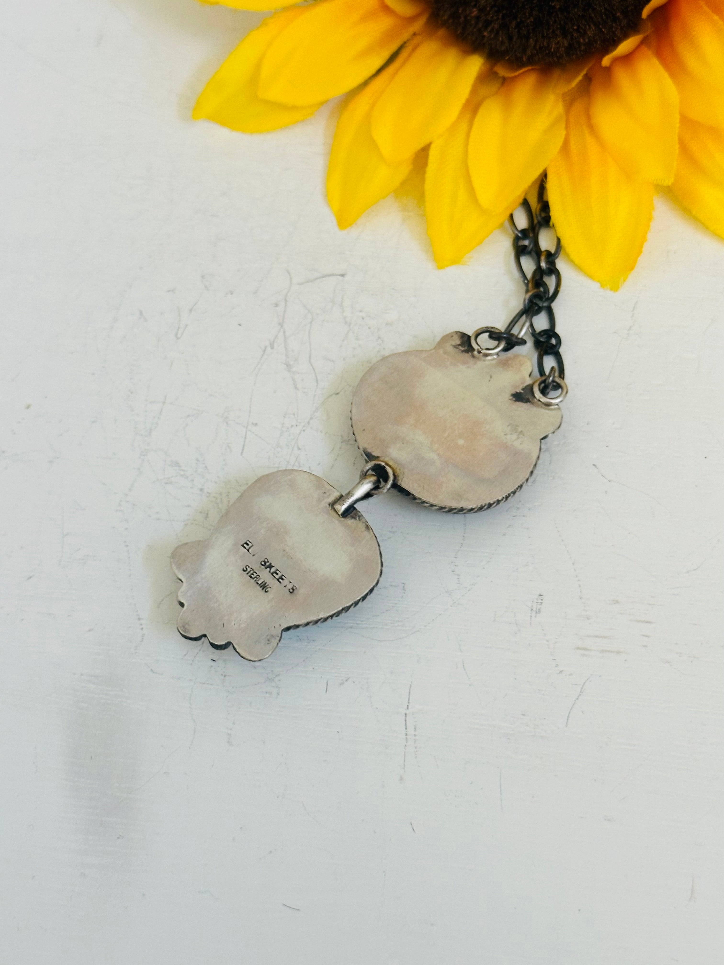 Eli Skeets New Lander & Sterling Silver Necklace. It measures 24 1/2 inches long with hang while the chain by itself measures 19 inches long. Signed by the artist and stamped sterling silver.