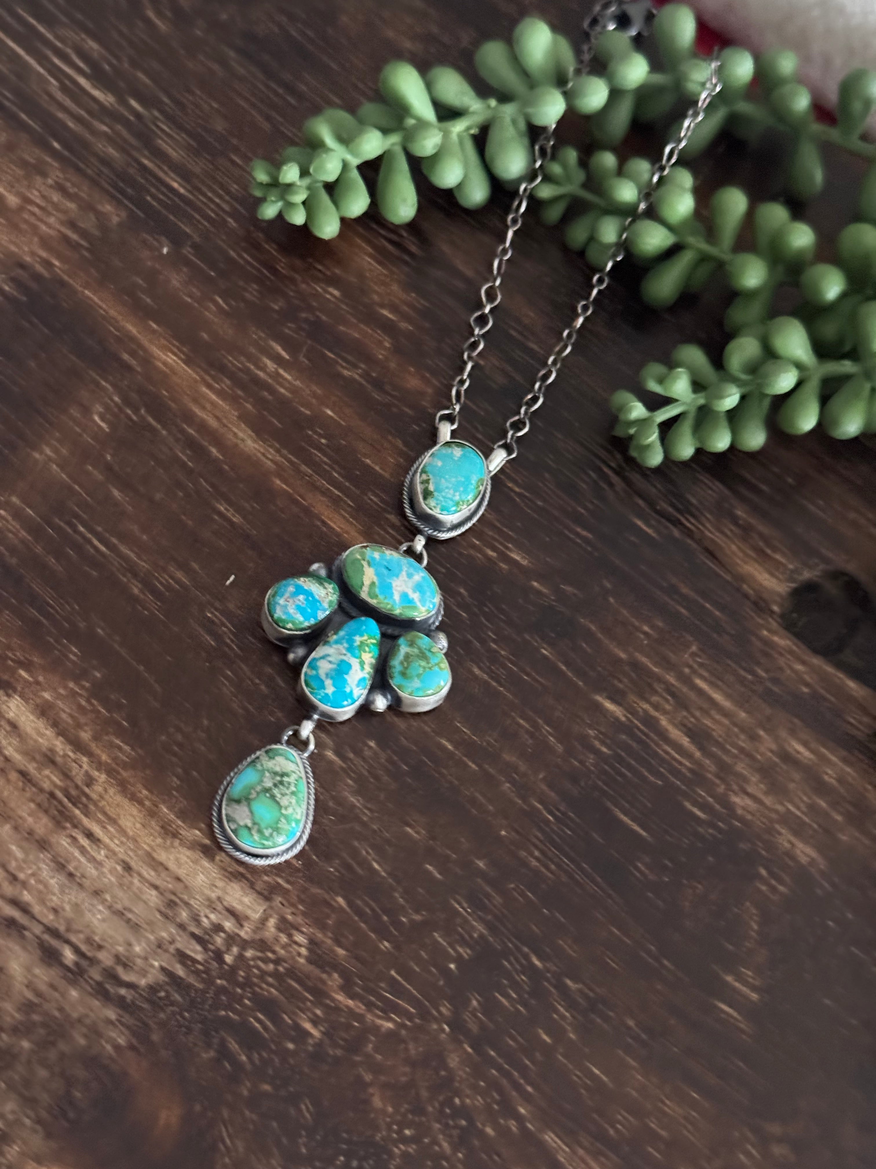 Eli Skeets Sonoran Mountain Turquoise & Sterling Silver Necklace. It measures 24 1/2 inches long with hang while the chain measures 18 inches long. Signed by the artist and stamped sterling silver.