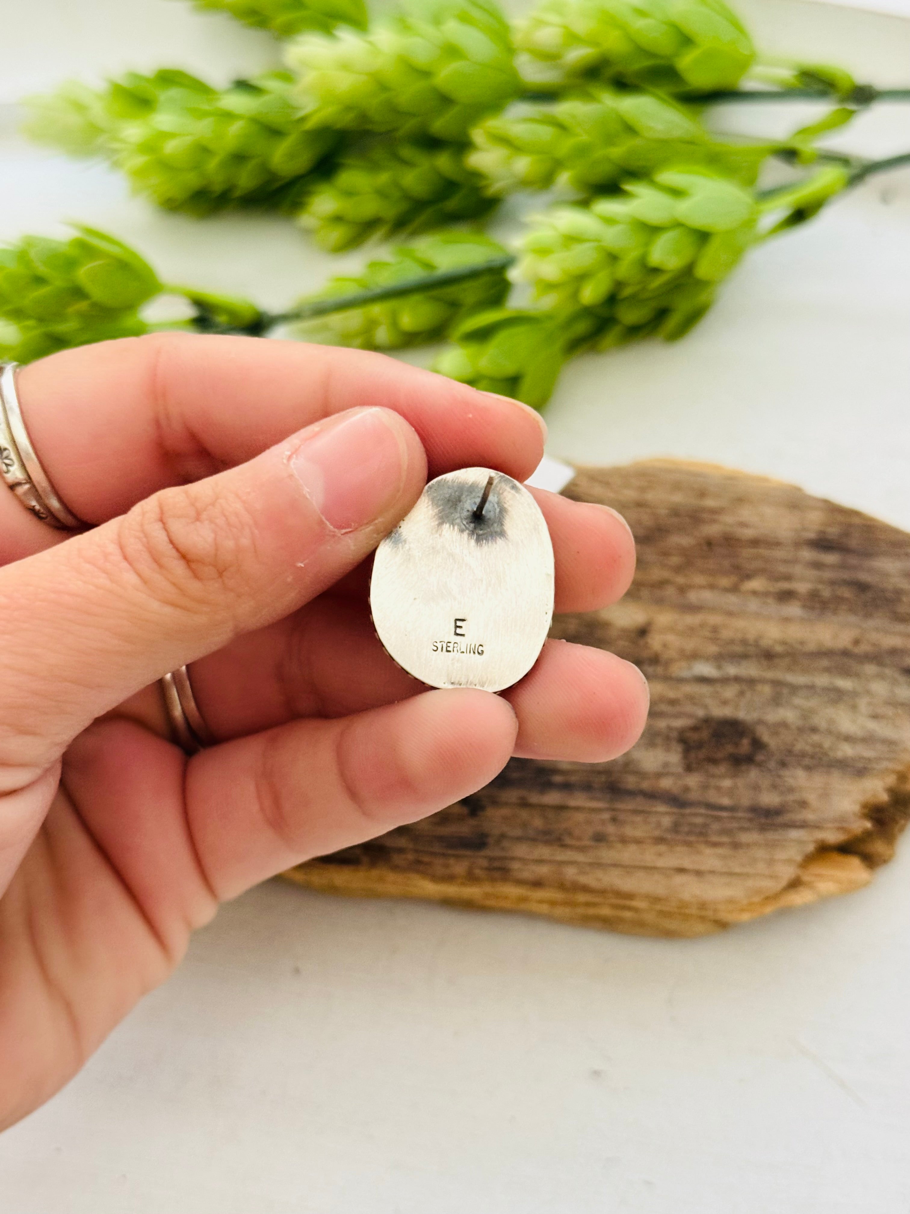 Eli Skeets Kingman Turquoise & Sterling Silver Post Earrings. It measures just under 1 inch long and 3/4 of an inch wide. Stamped sterling silver and signed.