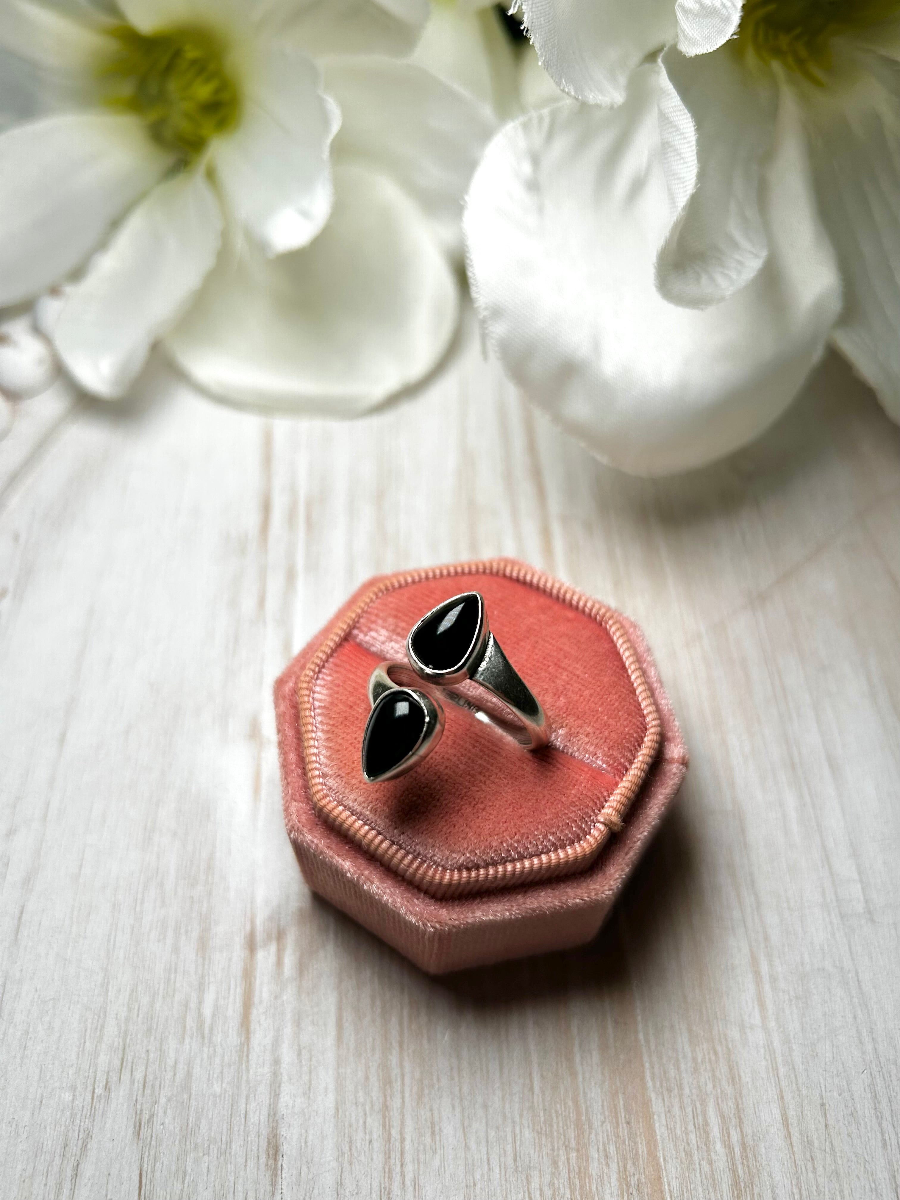 Navajo Made Onyx & Sterling Silver Adjustable Ring. It measures 1 inch long and 3/8 of an inch wide. Signed by the artist and stamped sterling silver.