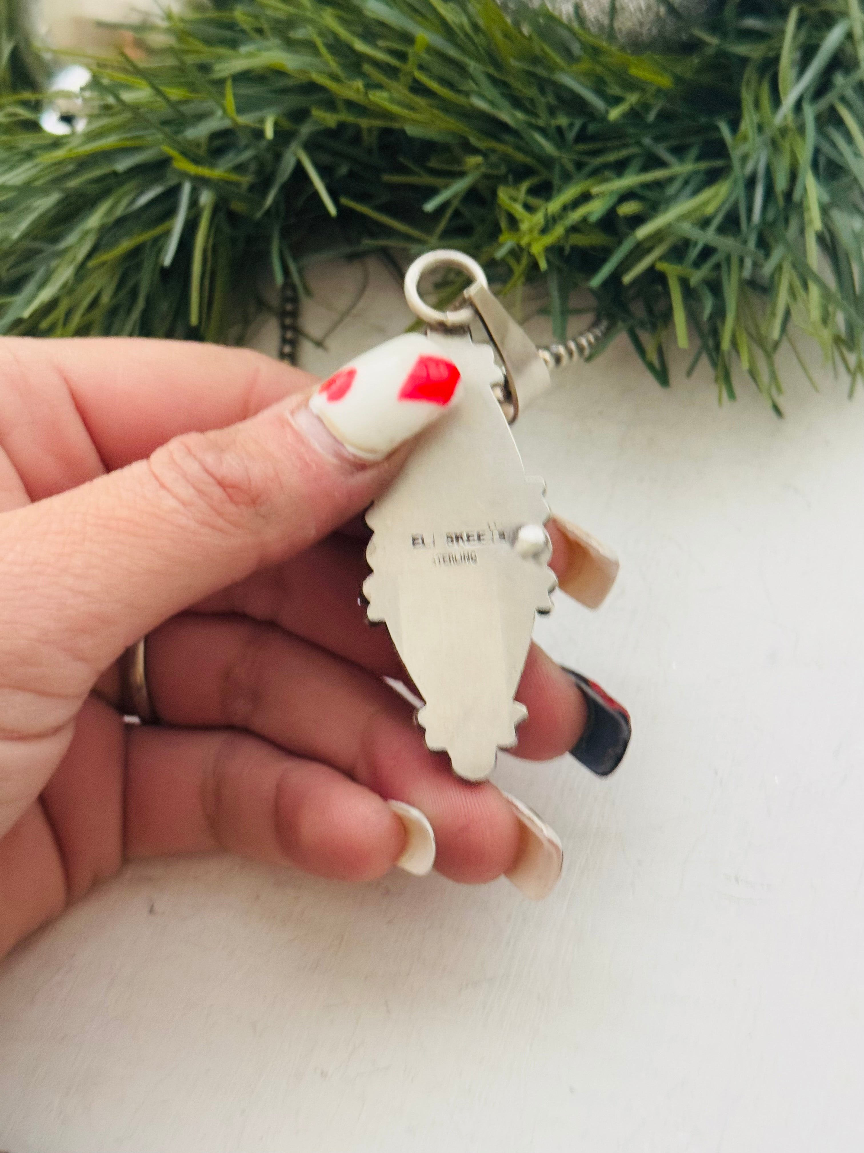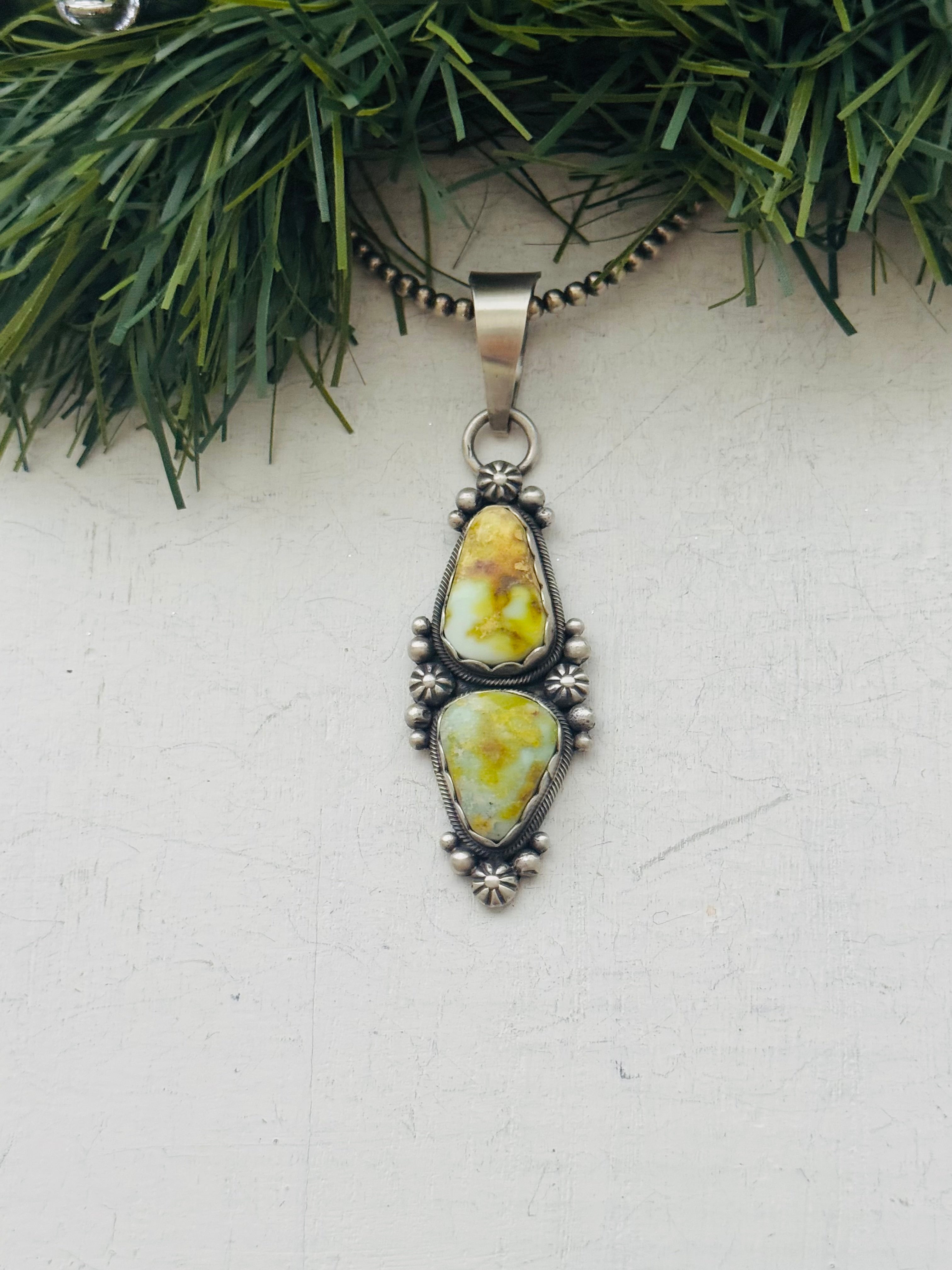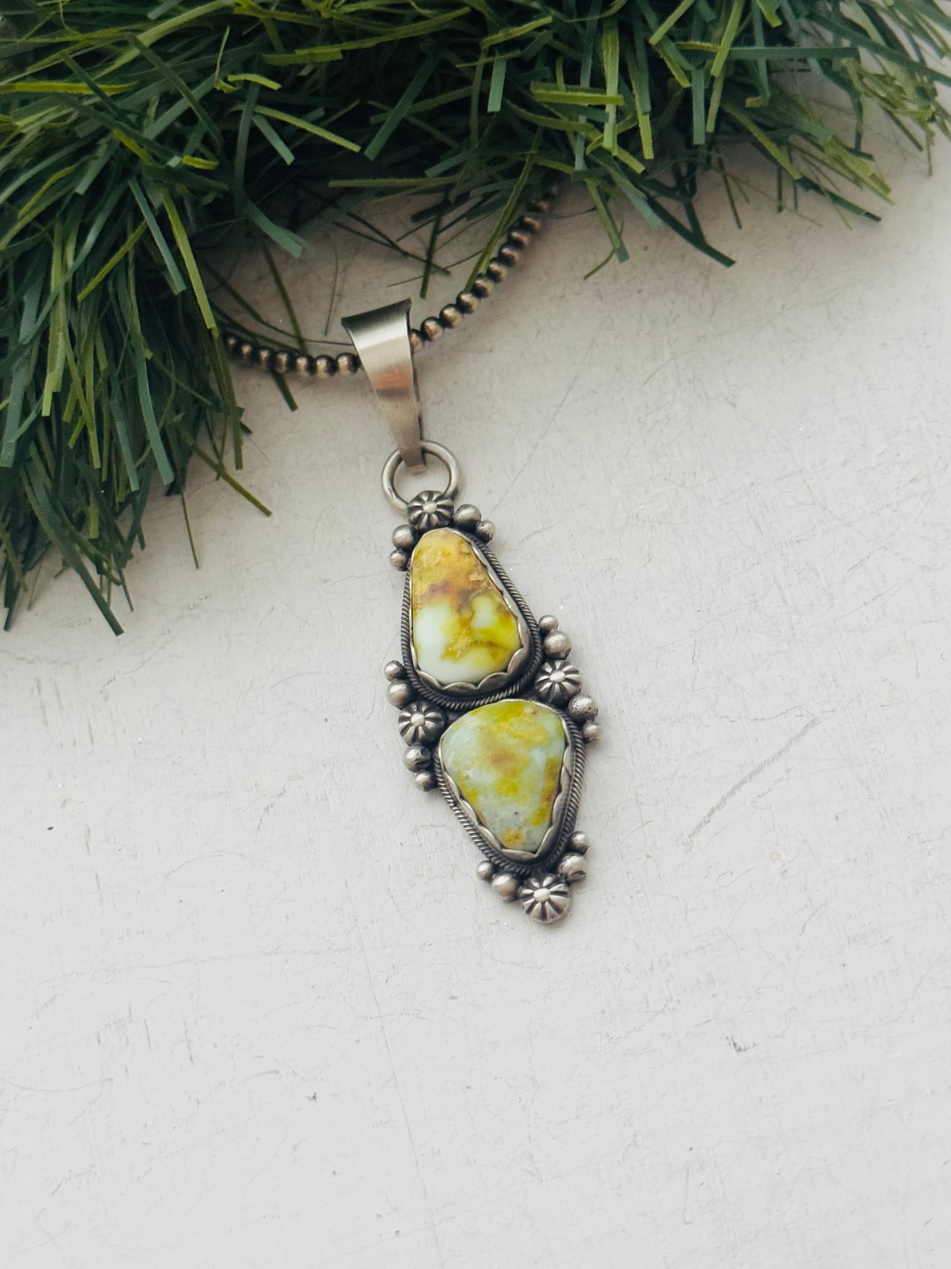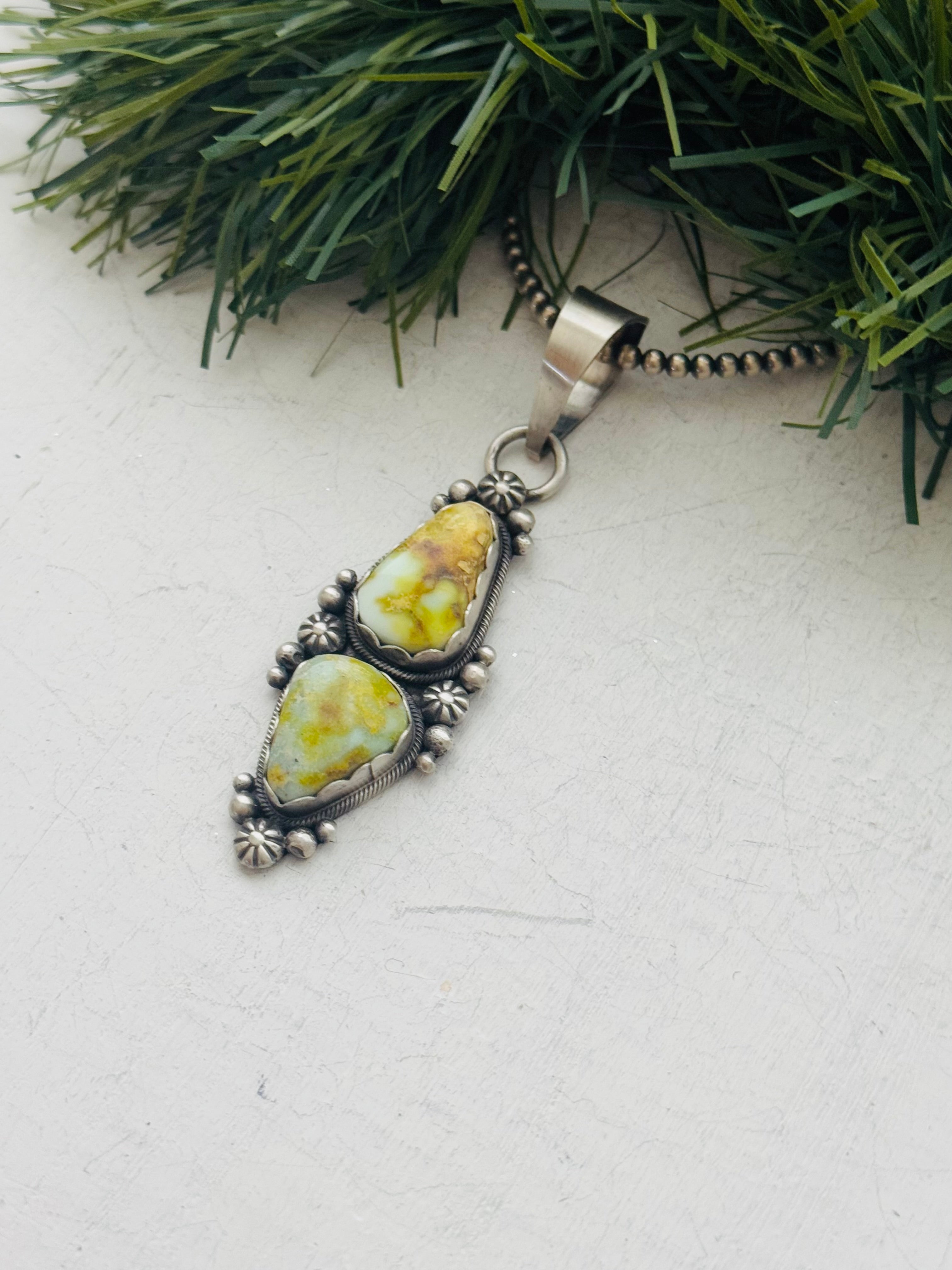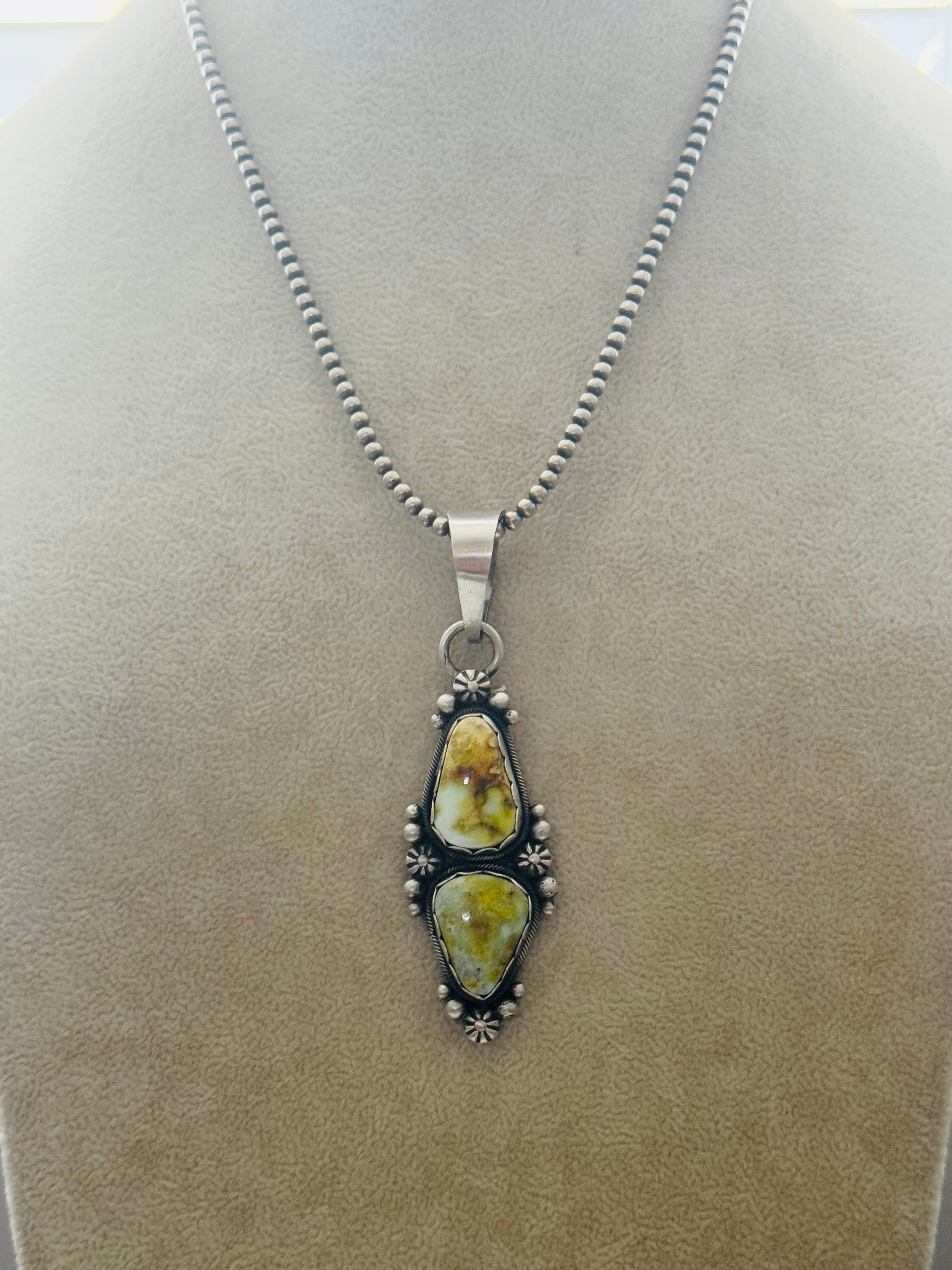 Eli Skeets Palomino Variscite & Sterling Silver Pendant. It measures 2 7/8 inches long and 7/8 of an inch wide. Pendant Only! Signed by the artist and stamped sterling silver.