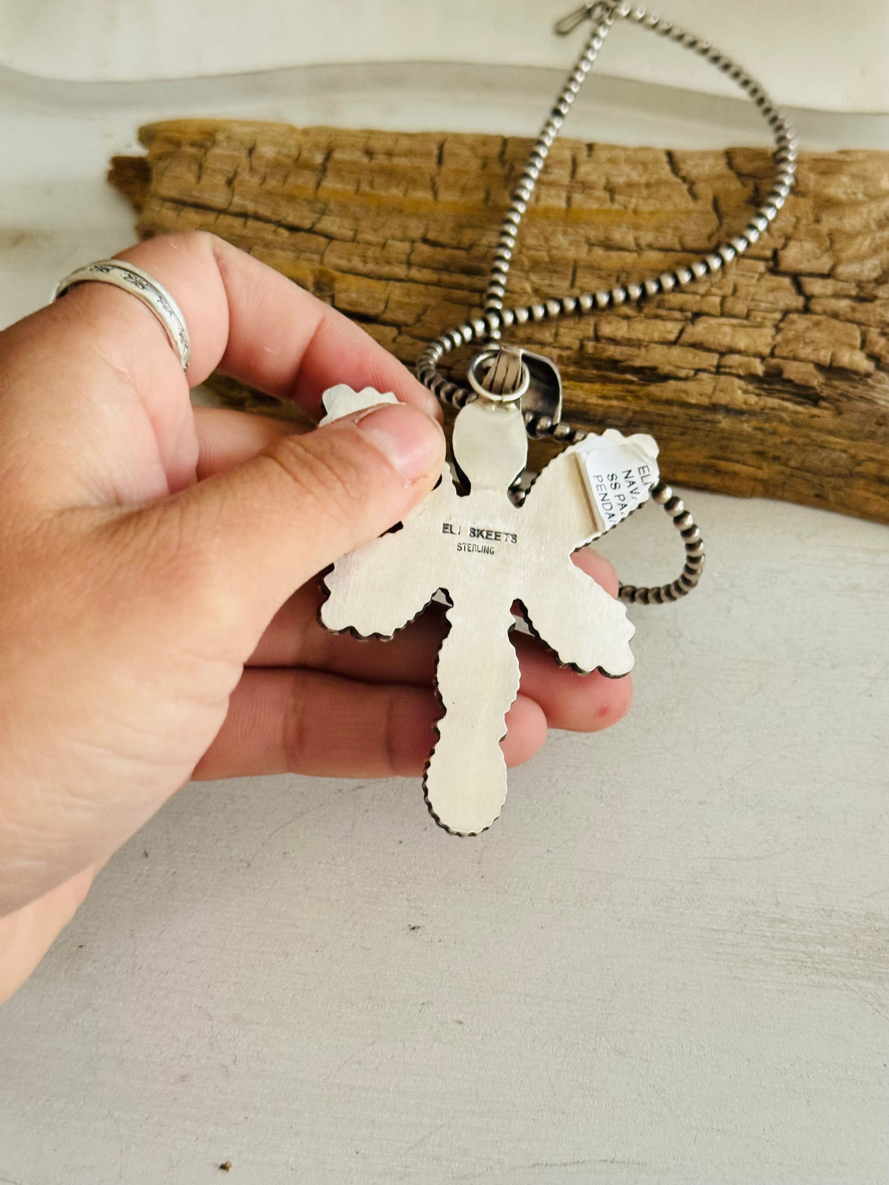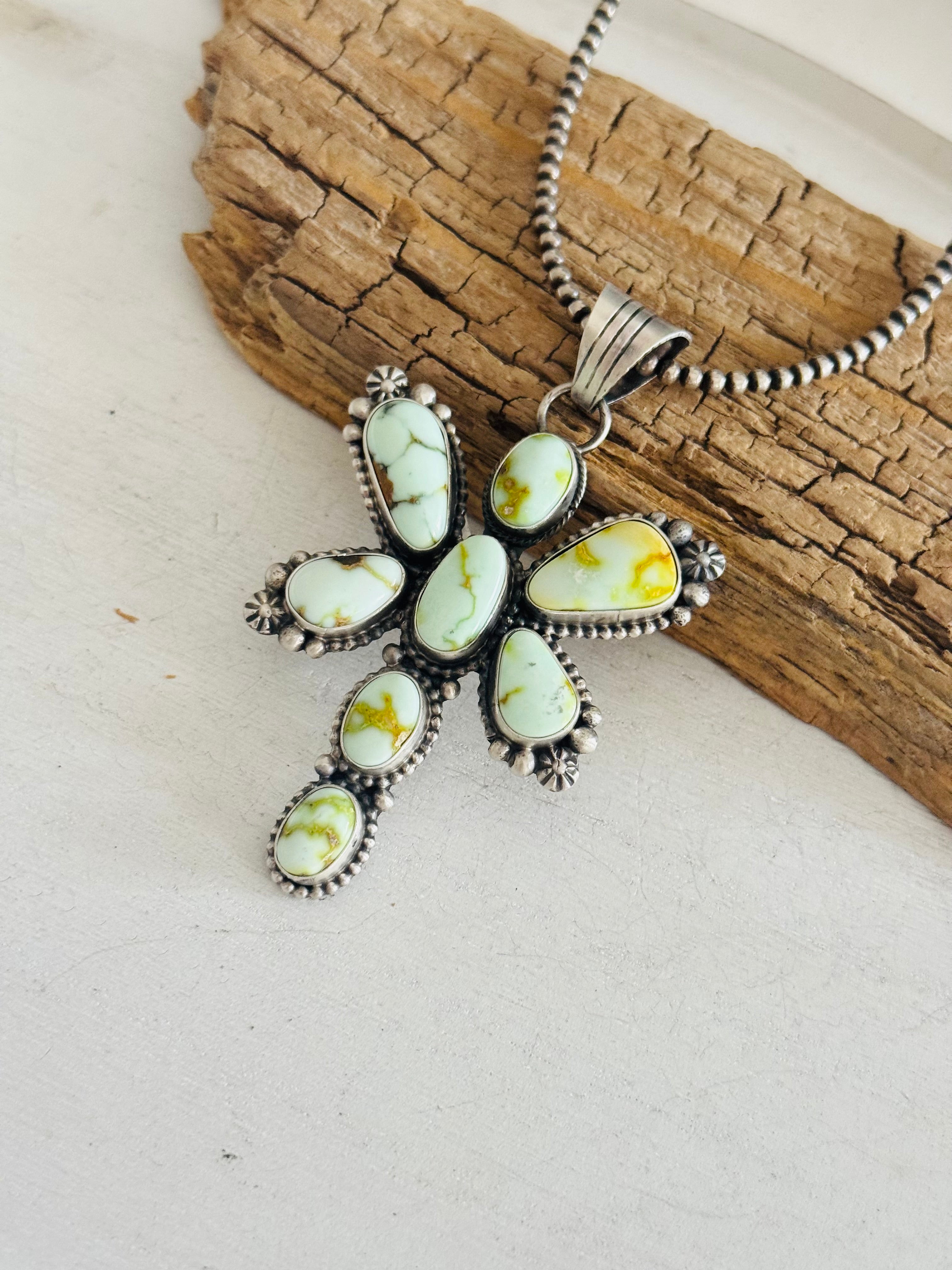 Eli Skeets Palomino Variscite & Sterling Silver Dragonfly Cluster Pendant. It measures 3 1/4 inches long and 2 inches wide. Pendant Only! Signed by the artist and stamped sterling silver.