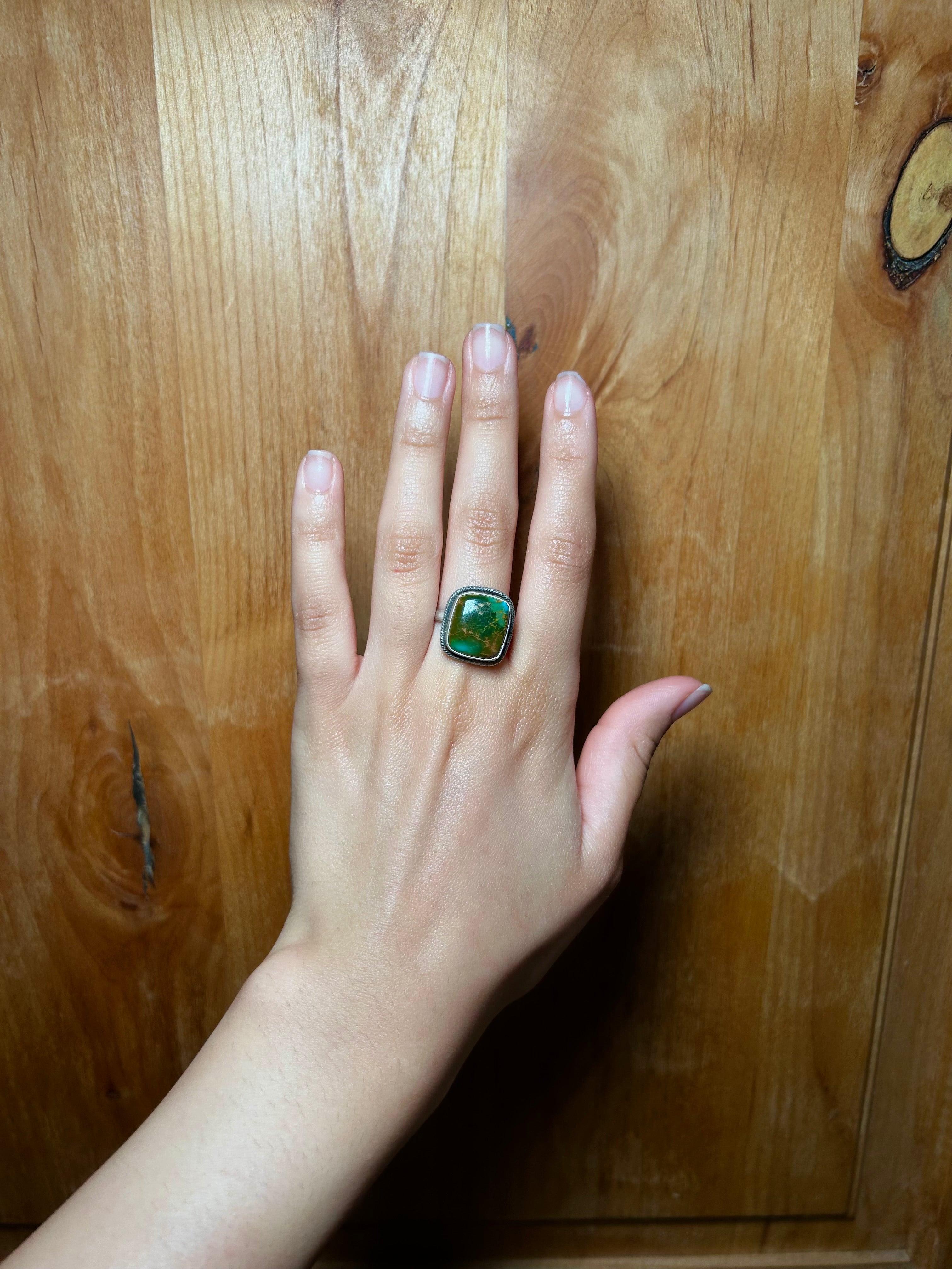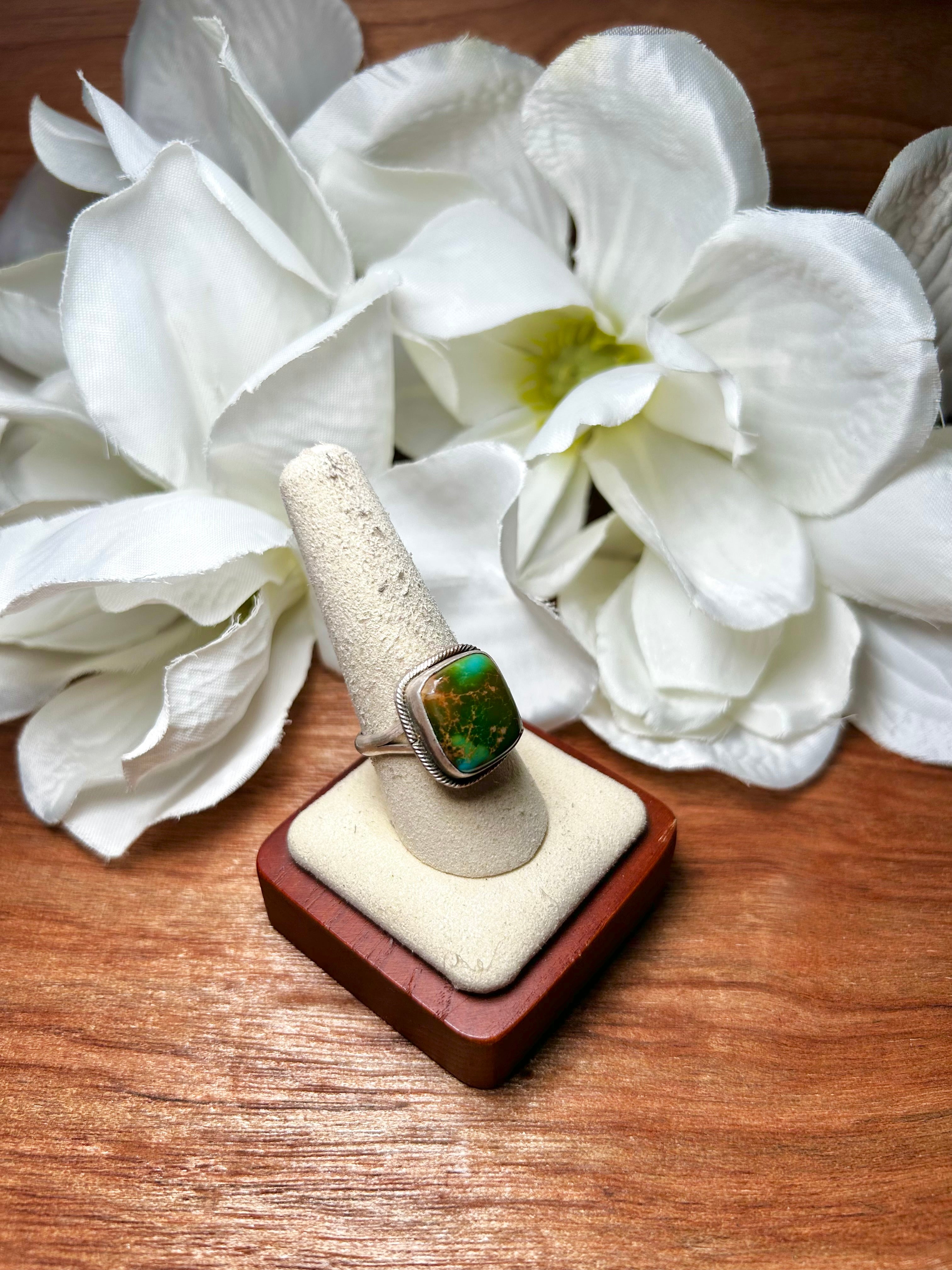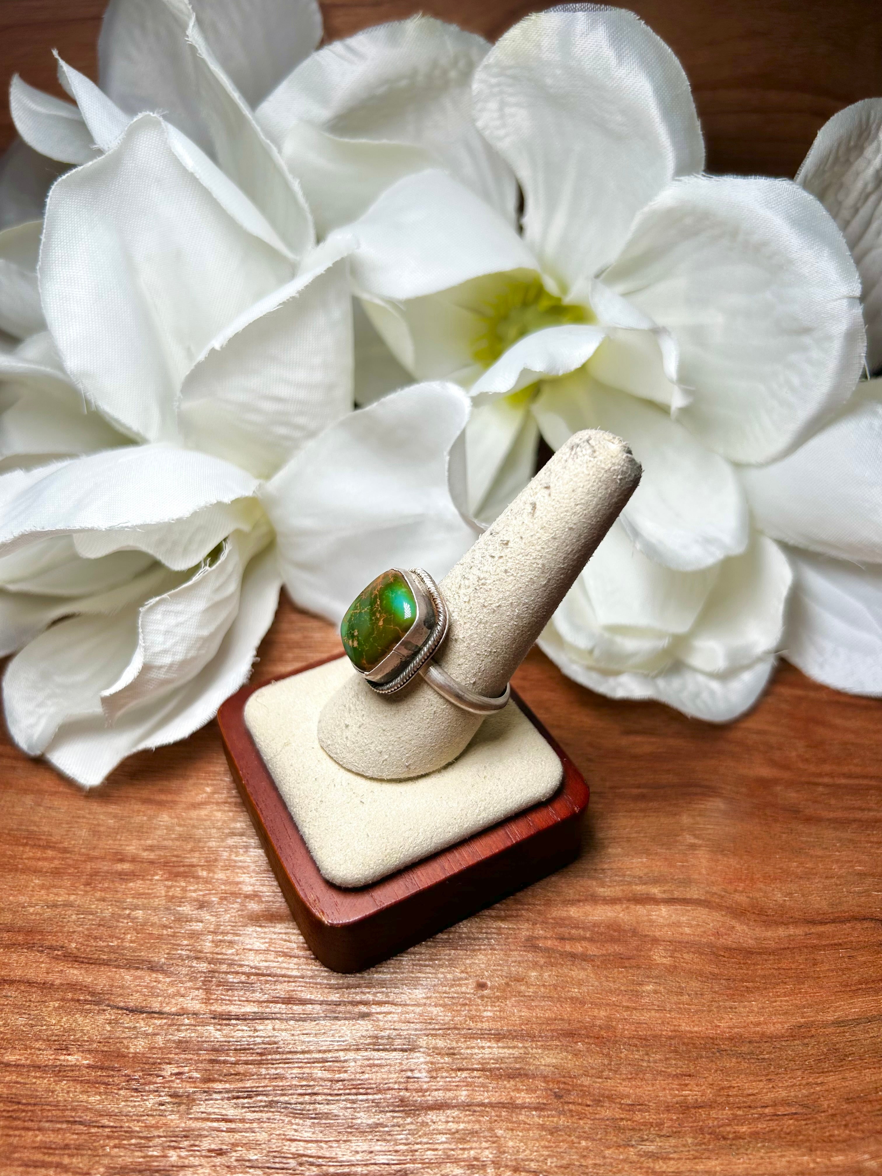 Eli Skeets Royston & Sterling Silver Cluster Adjustable Ring. It measures 3/4 of an inch long and it measures 5/8 of an inch wide. Signed by the artist and stamped sterling silver.