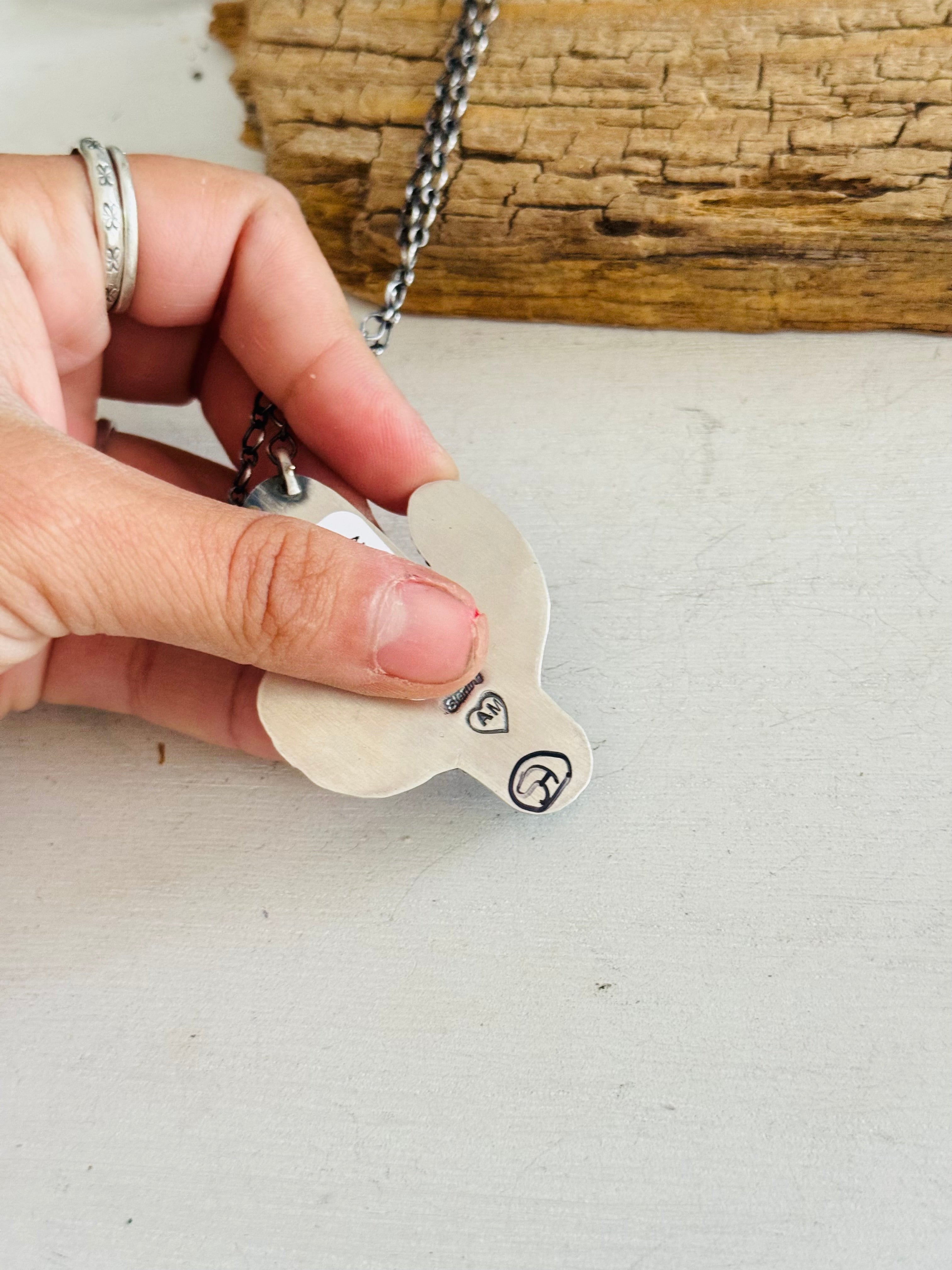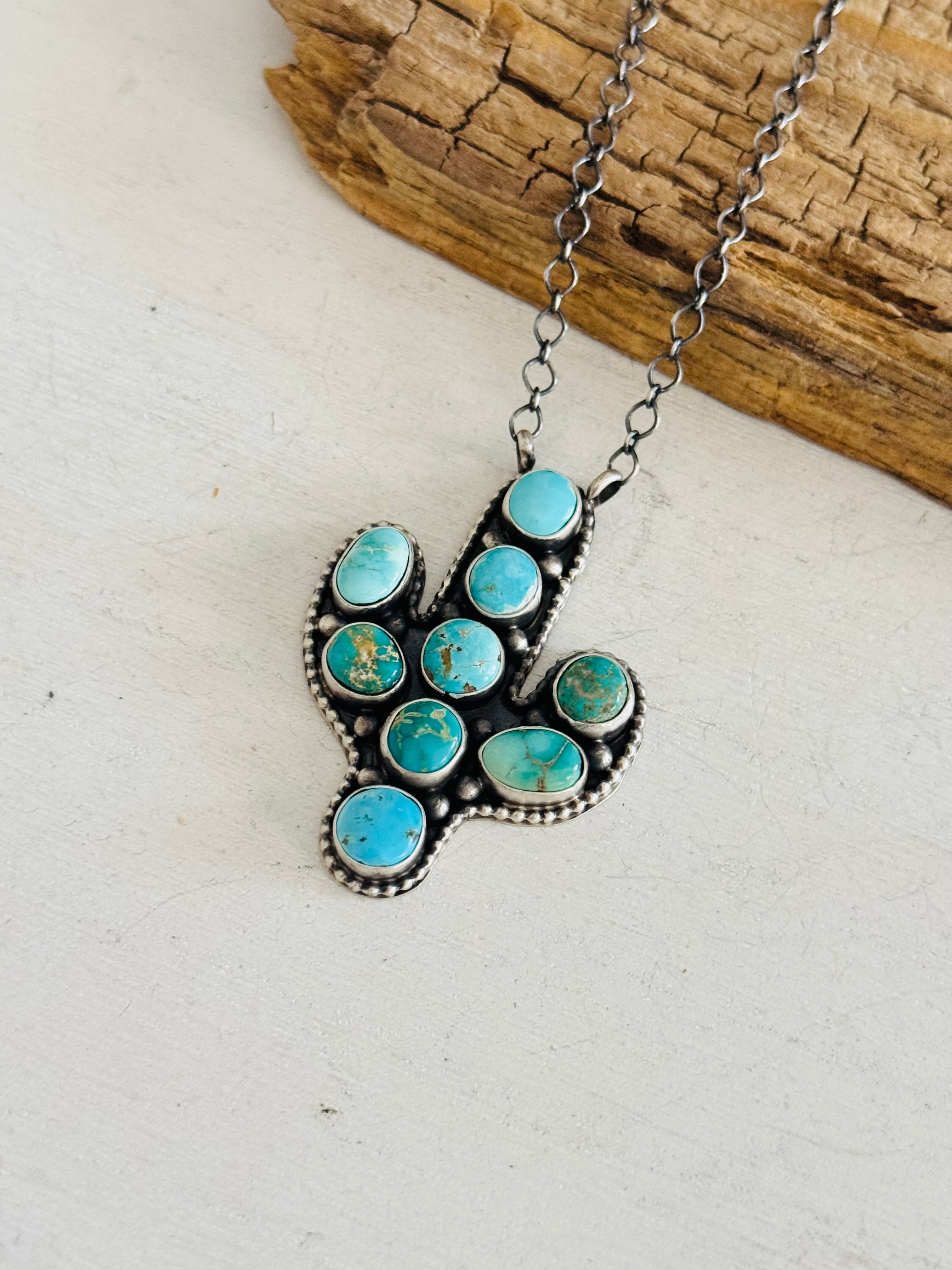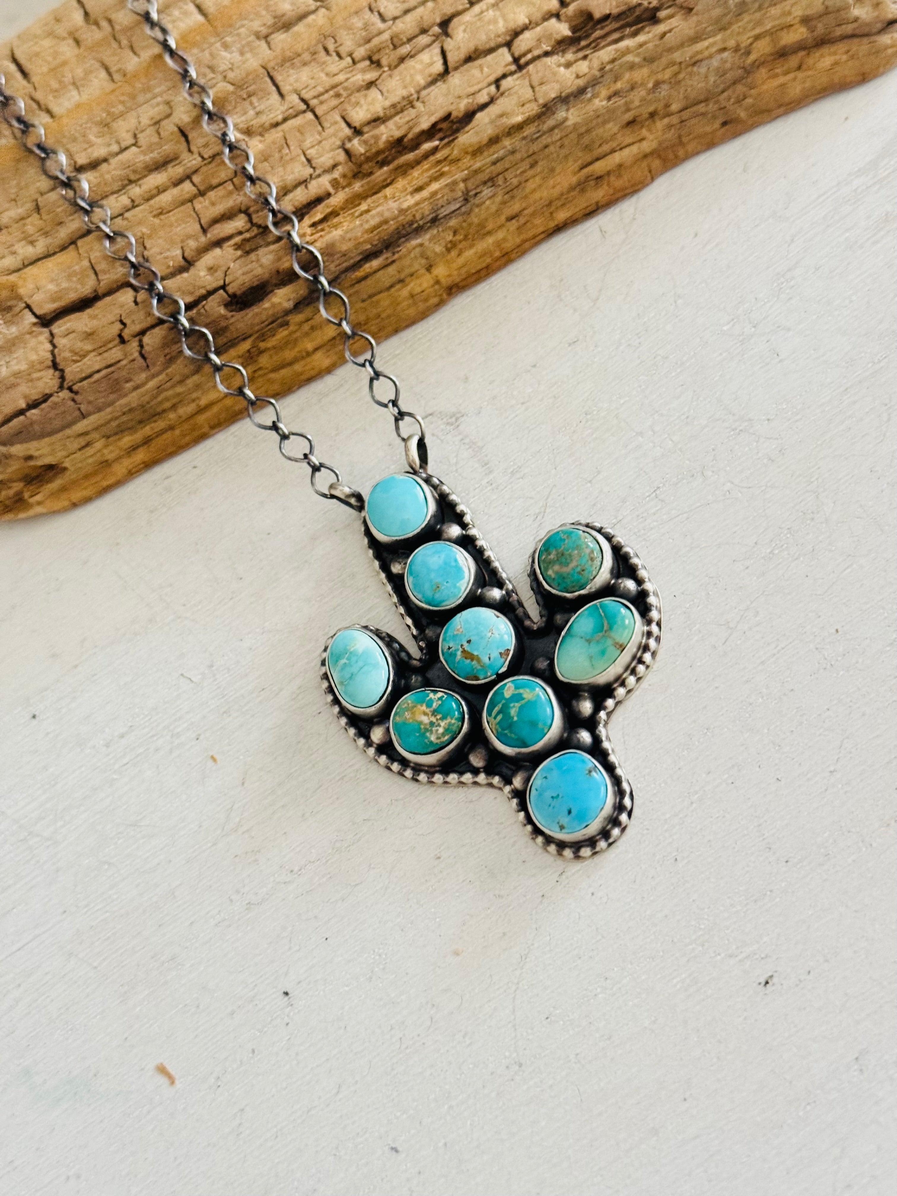 Annette Martinez Royston Turquoise & Sterling Silver Saguaro Cluster Necklace. It measures 23 inches long with hang while the chain by itself measures 18 1/2 inches long. Signed by the artist and stamped sterling silver.