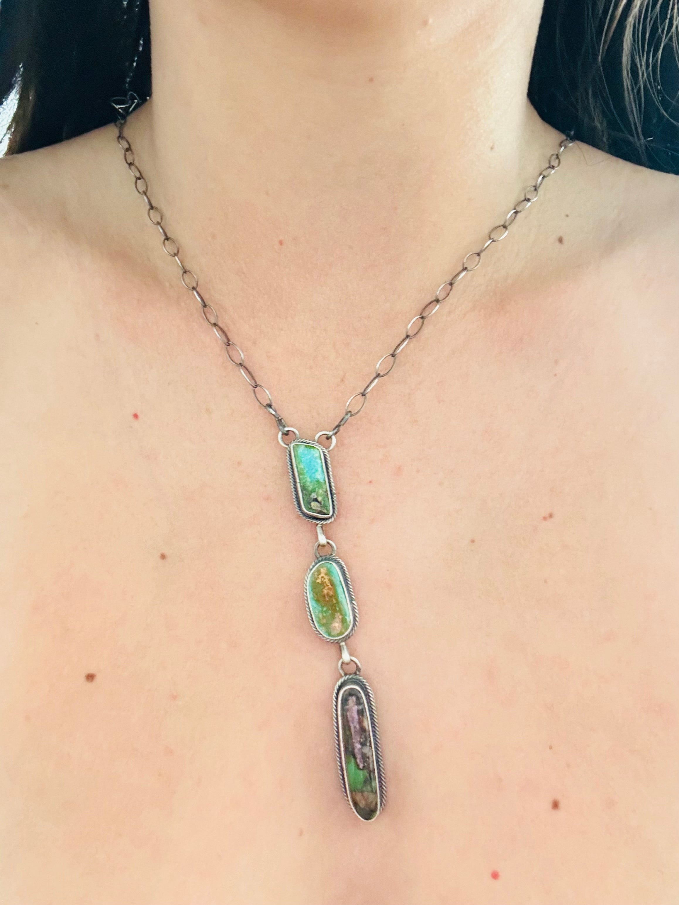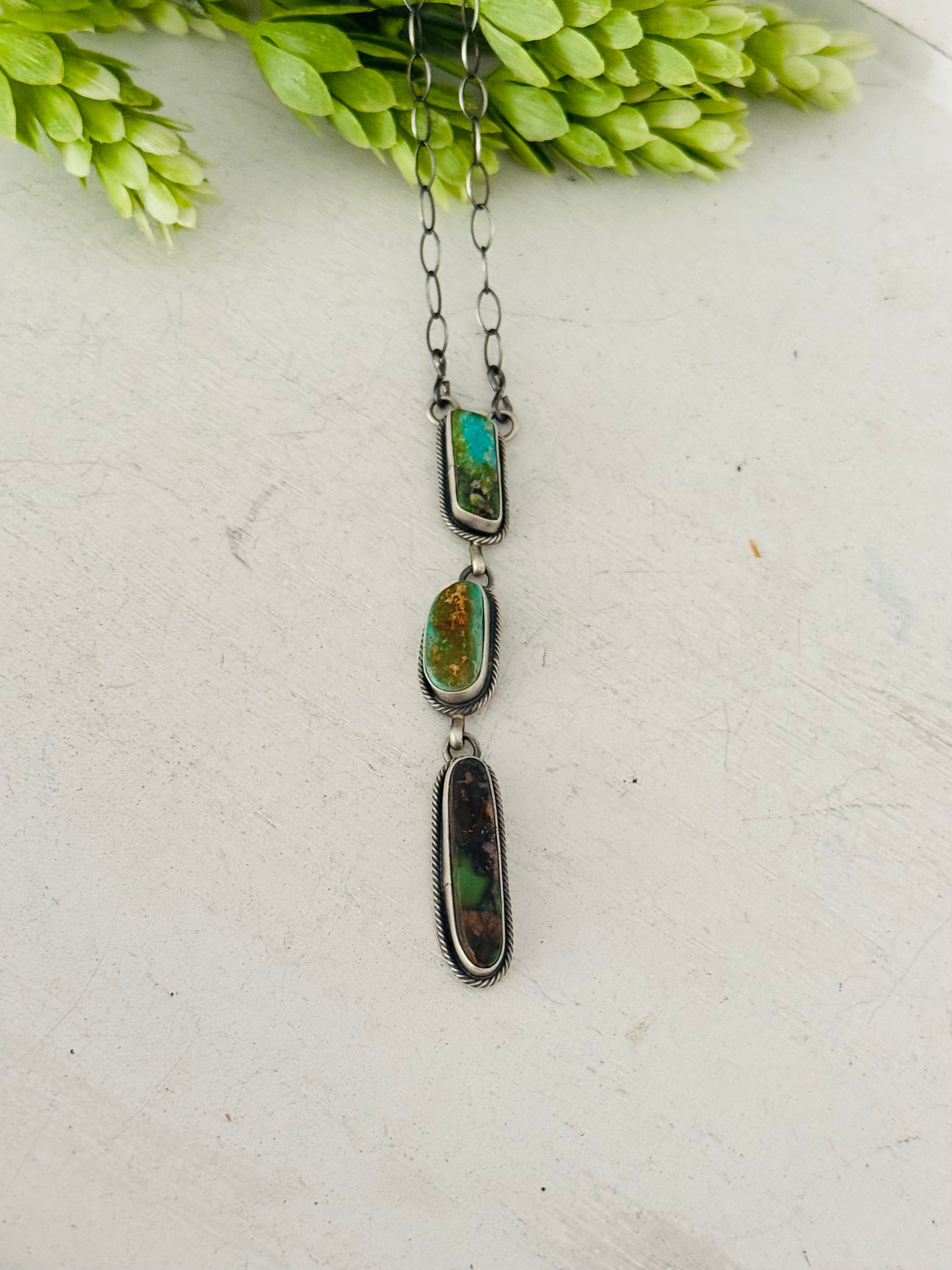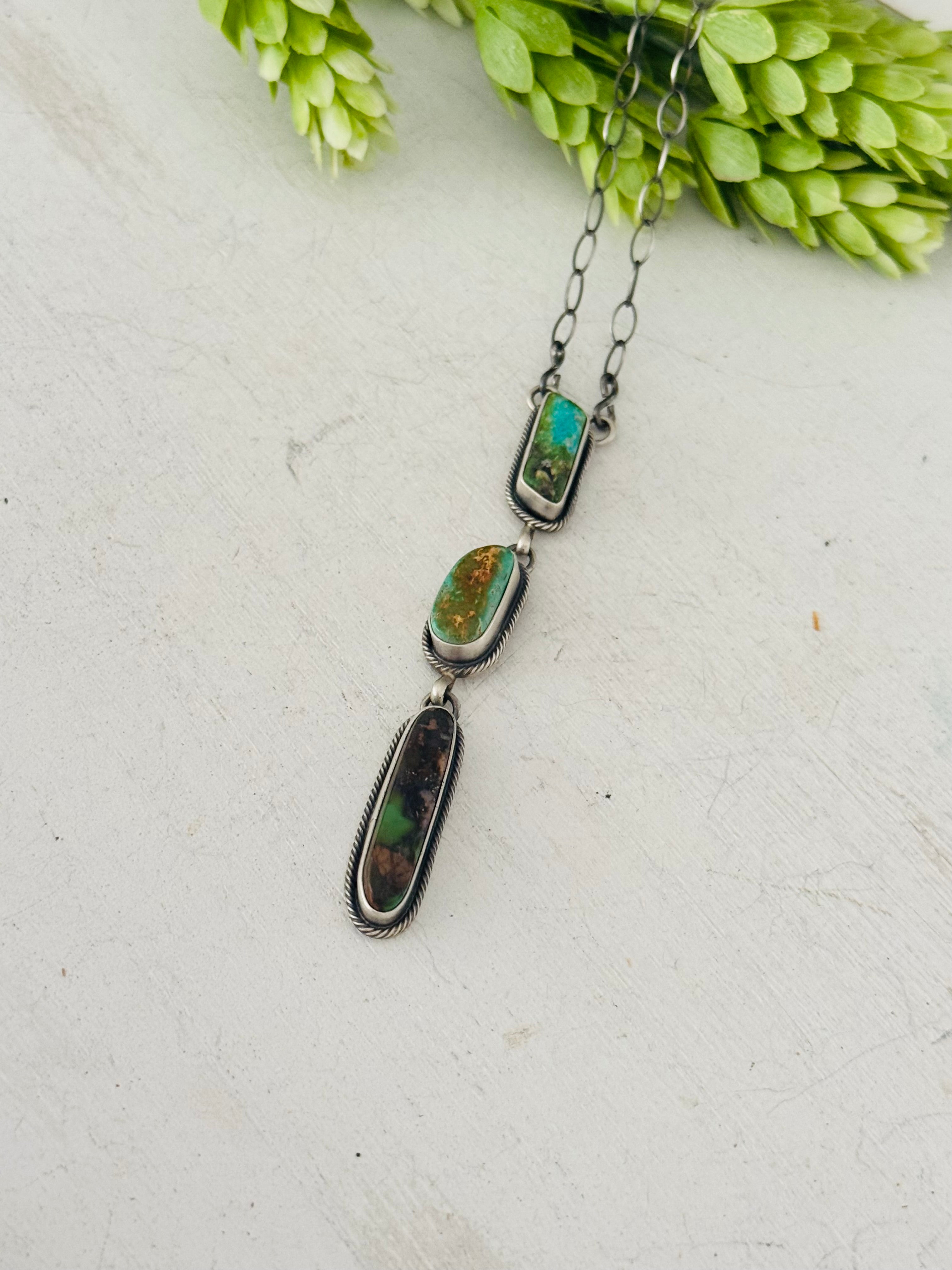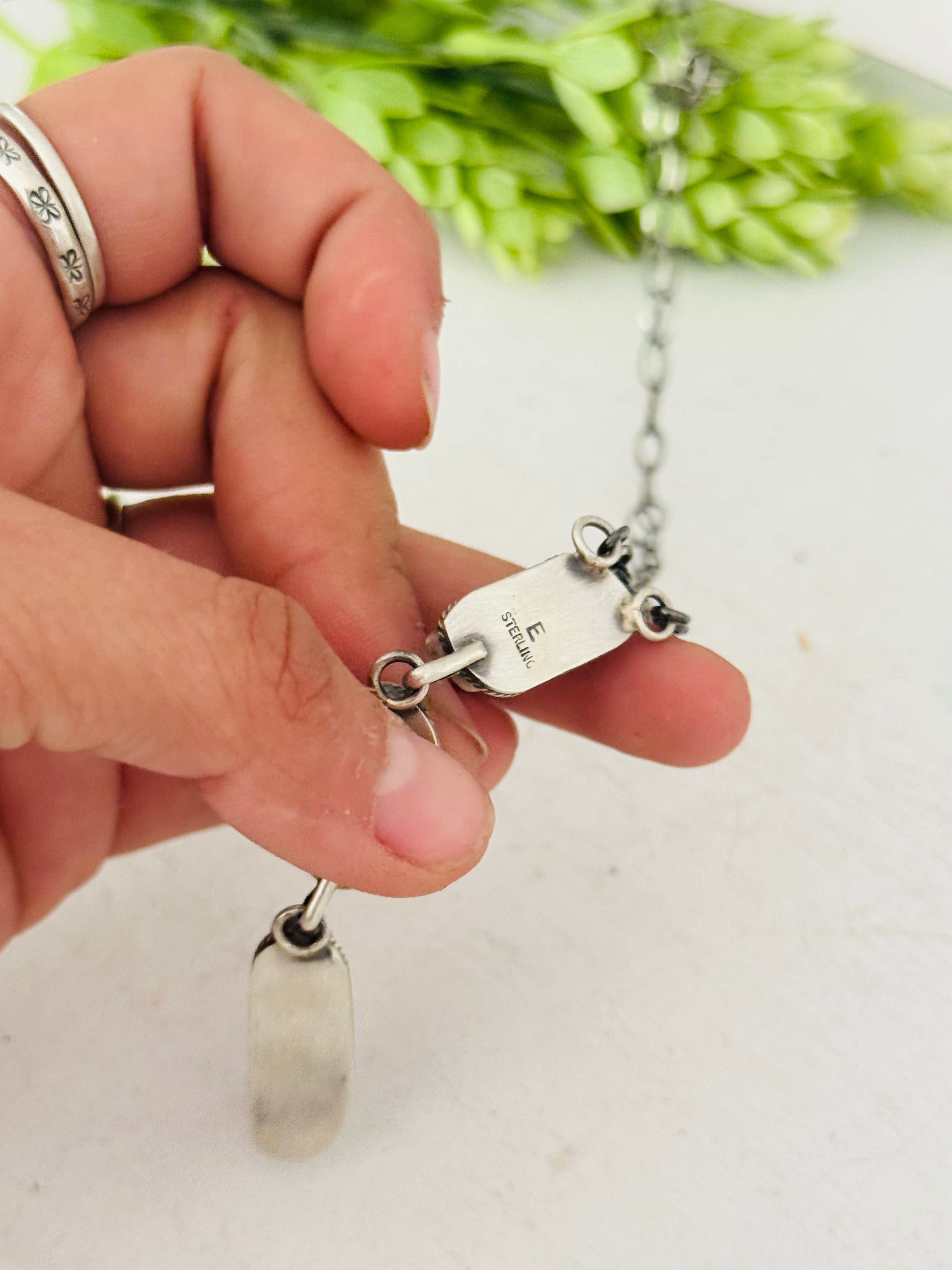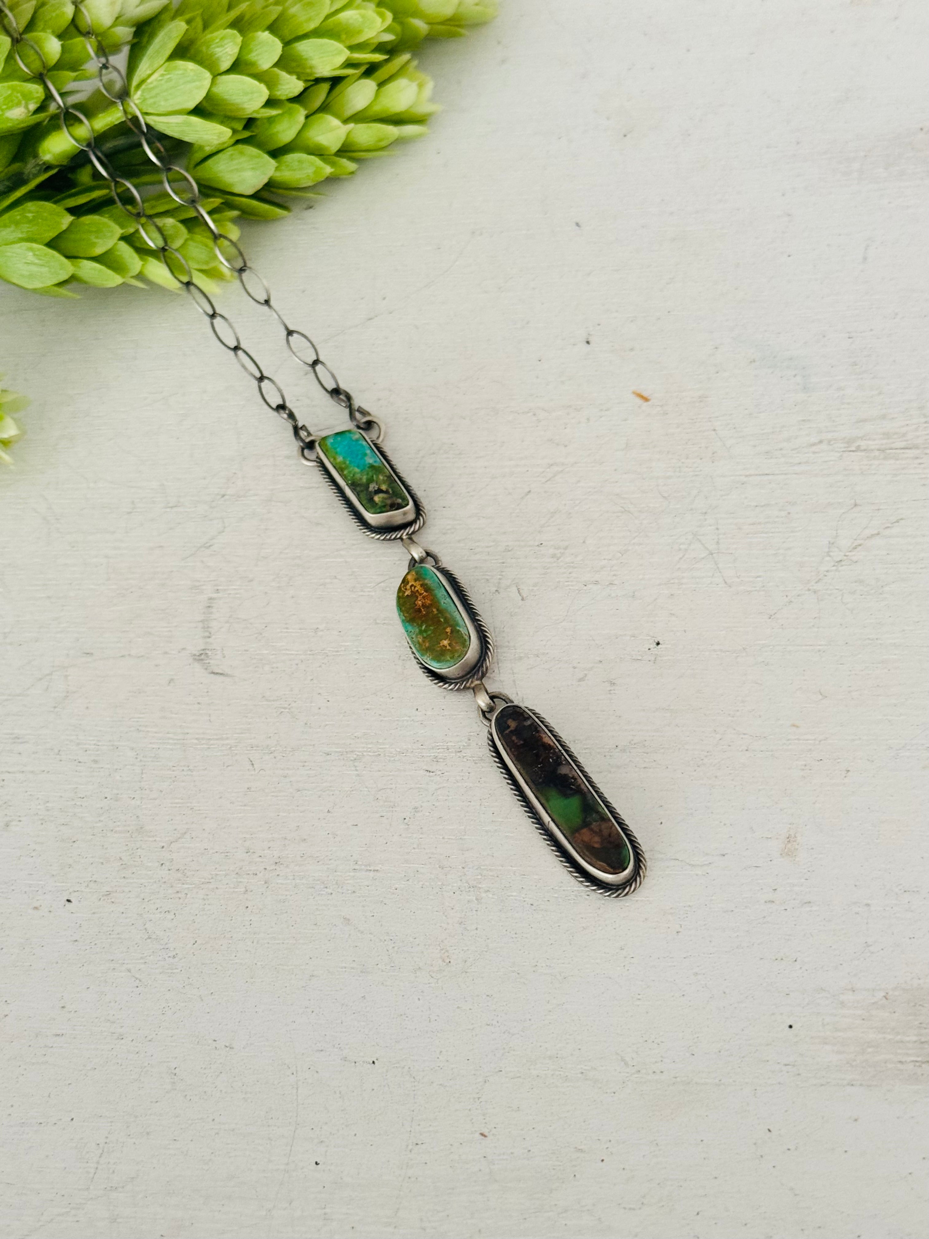 Eli Skeets Royston Turquoise & Sterling Silver Necklace. It measures 26 inches long with hang while the chain by itself measures just under 20 inches long. Signed by the artist and stamped sterling silver.
