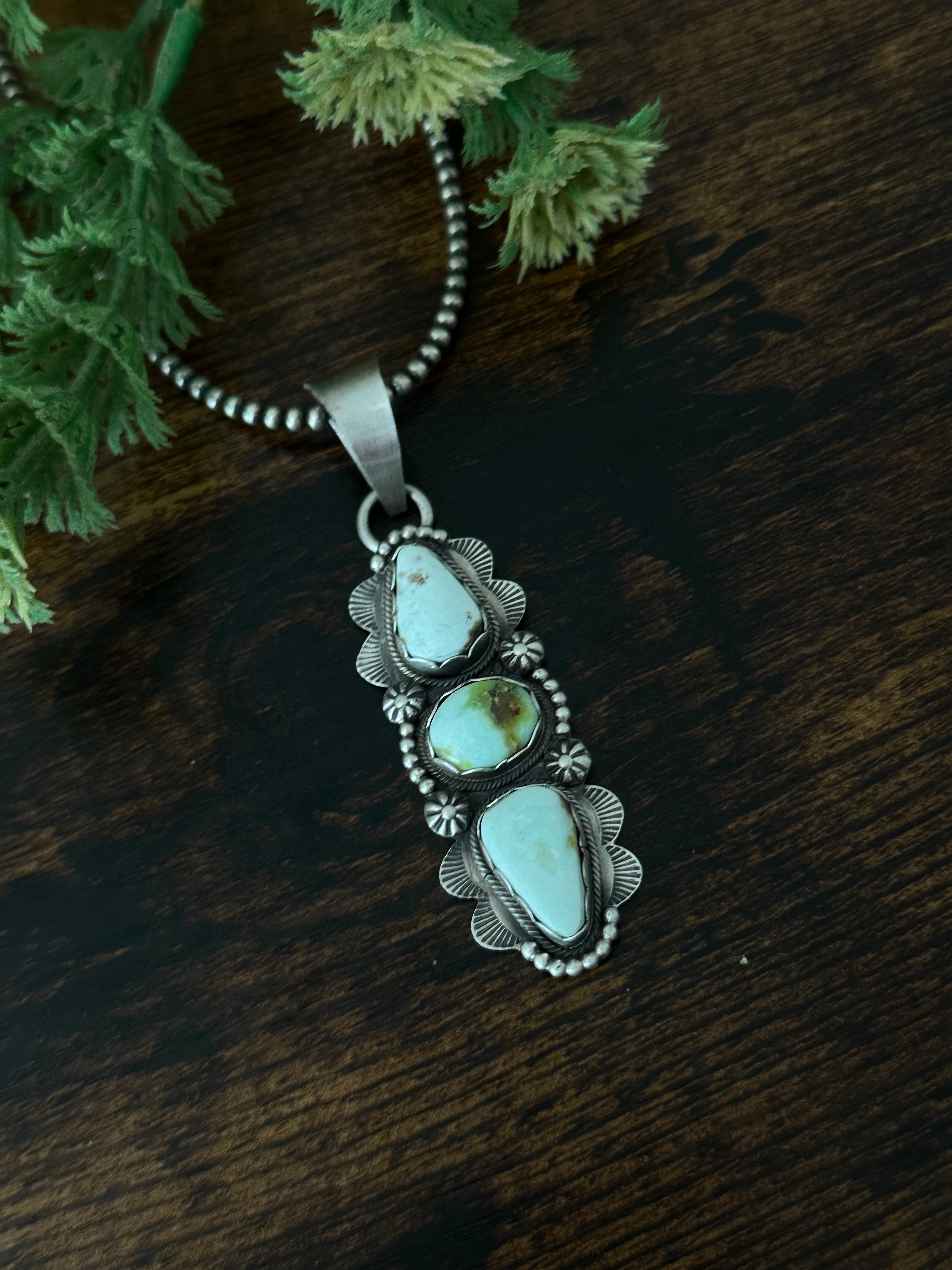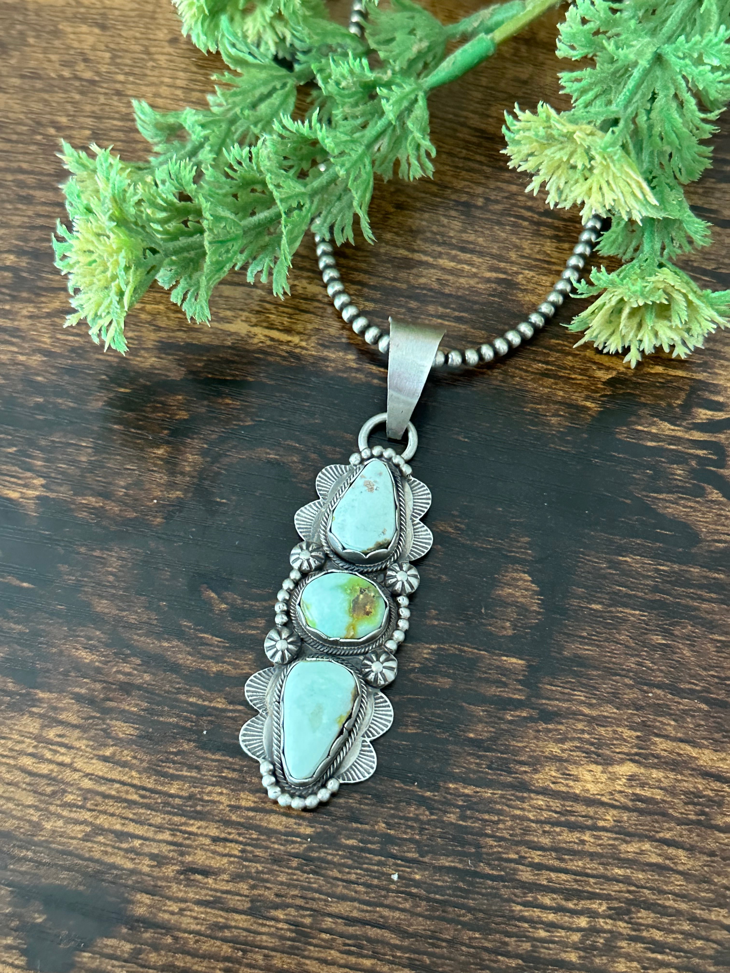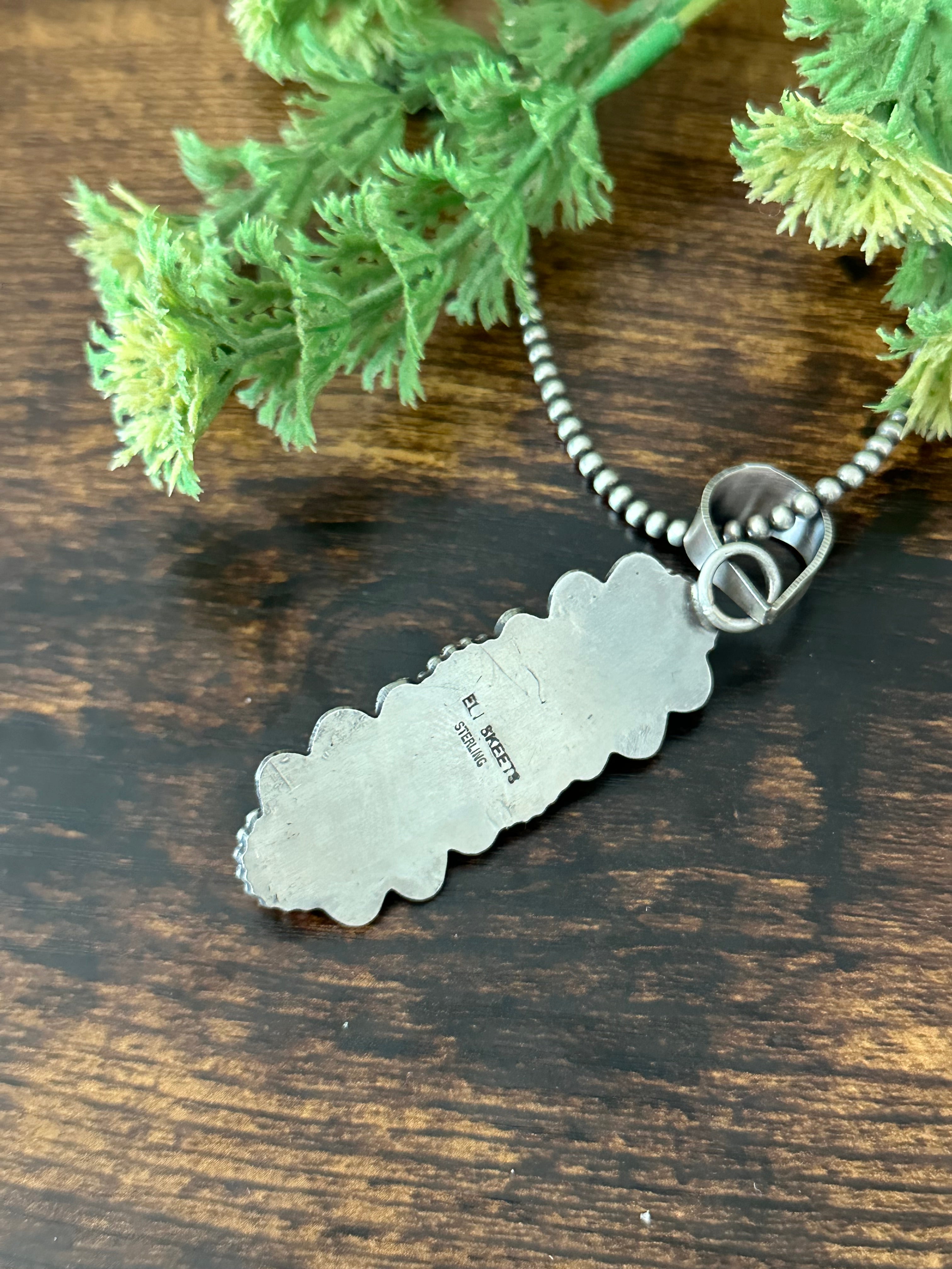 Eli Skeets Palomino Variscite & Sterling Silver Pendant. It measures 3 inches long and 7/8 of an inch wide. Pendant Only! Signed by the artist and stamped sterling silver.