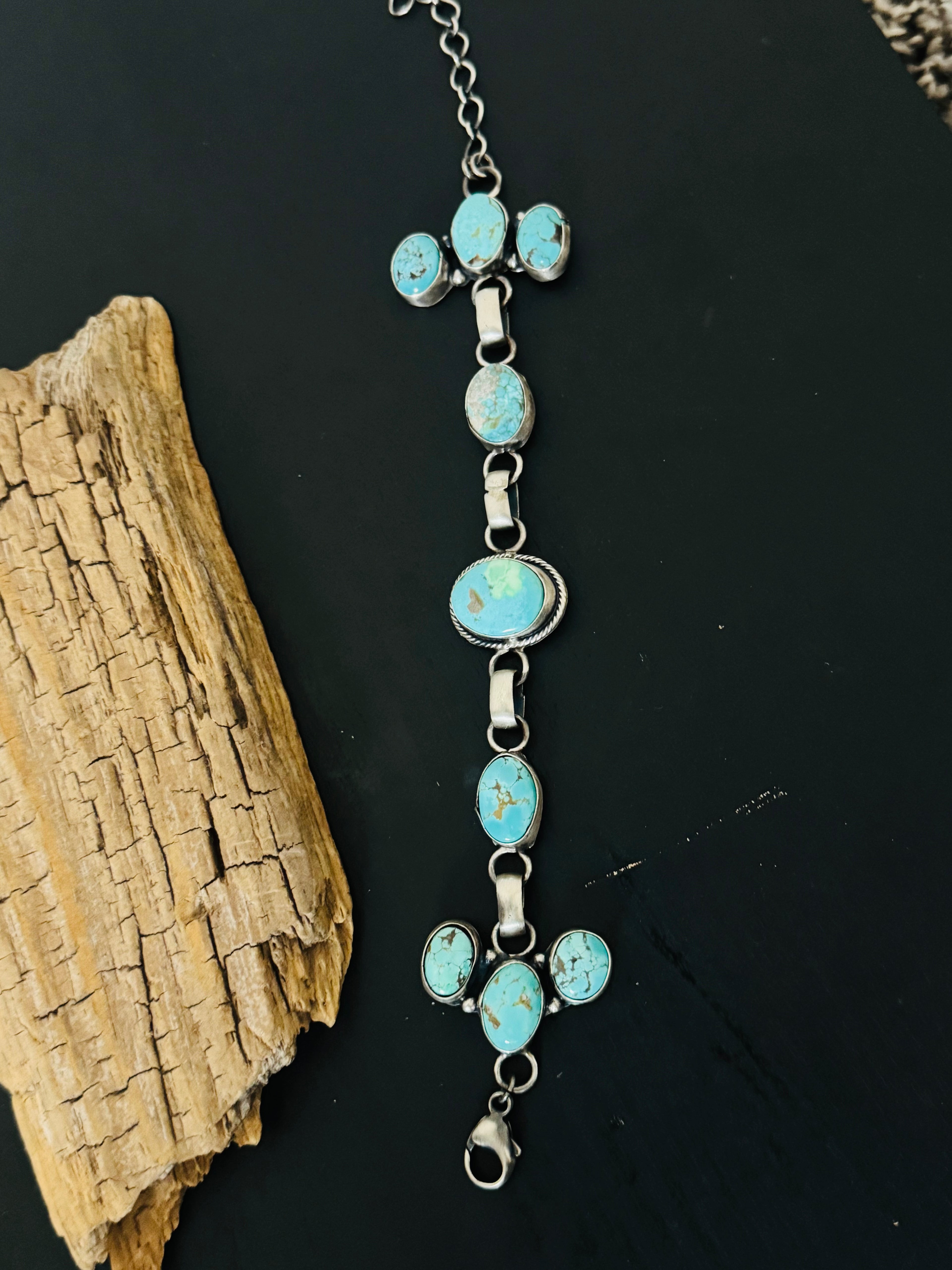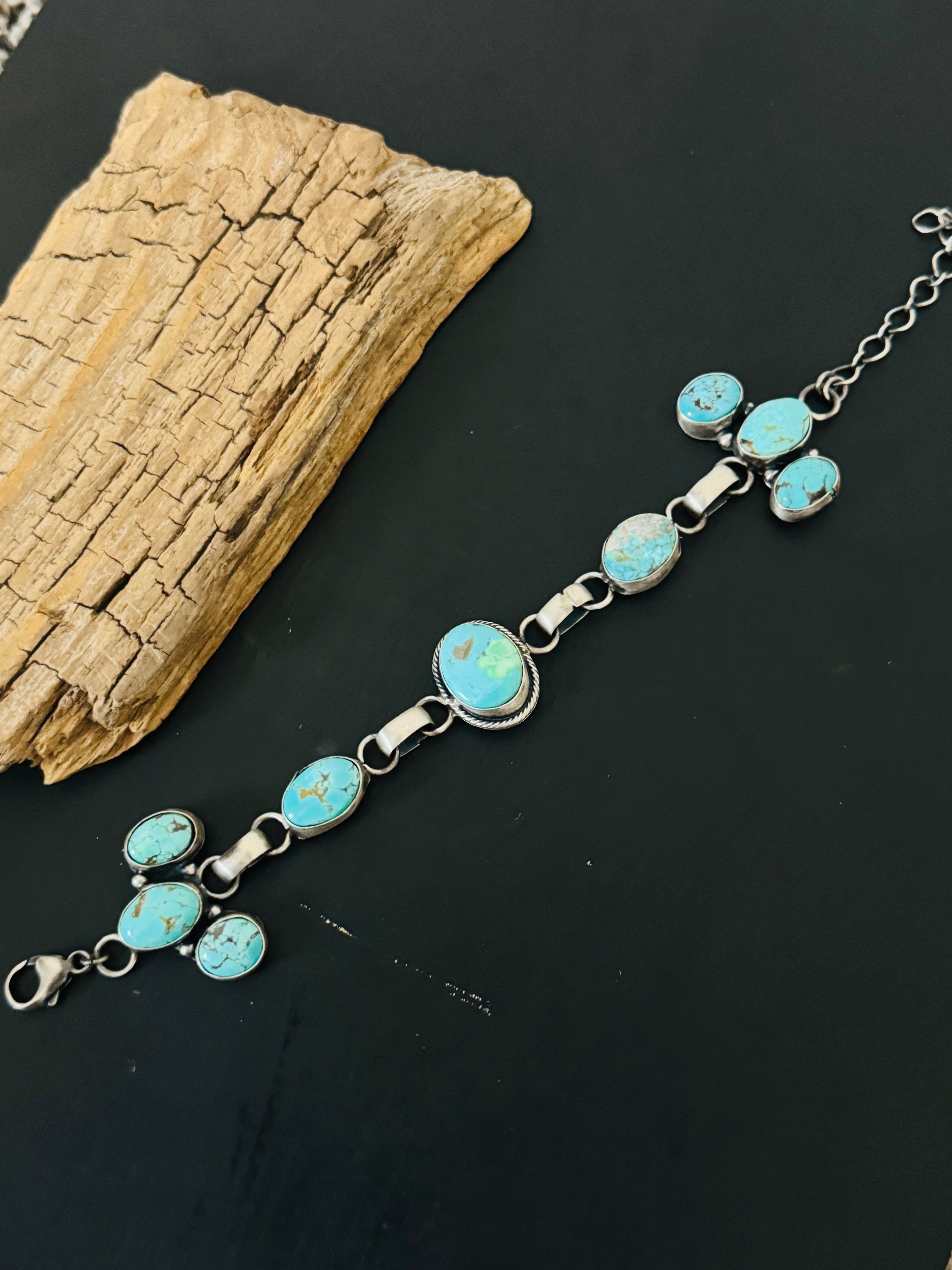 Ella Peters Mixed Turquoise & Sterling Silver Link Bracelet. It measures 9 1/2 inches long. Signed by the artist and stamped sterling silver.
