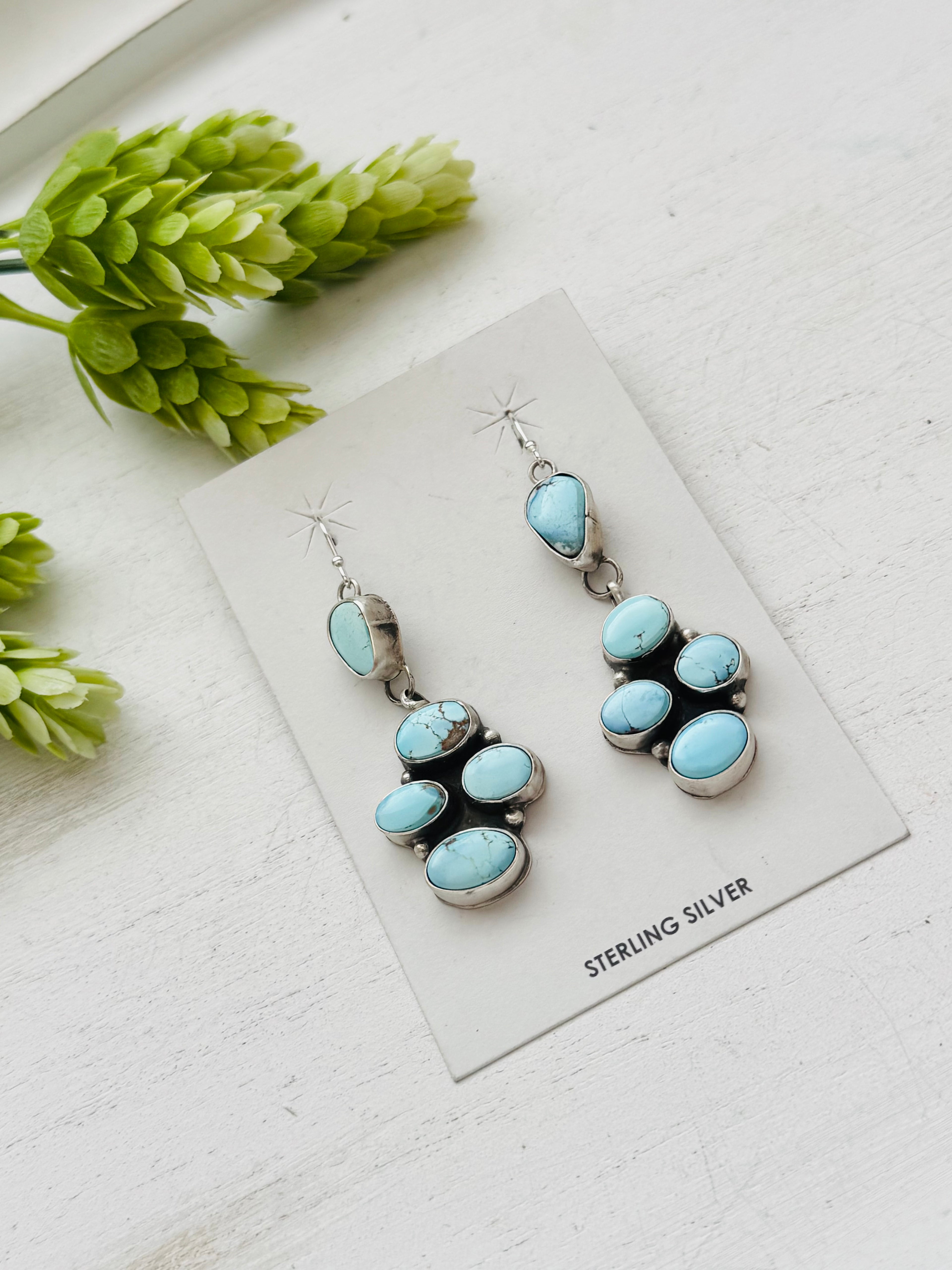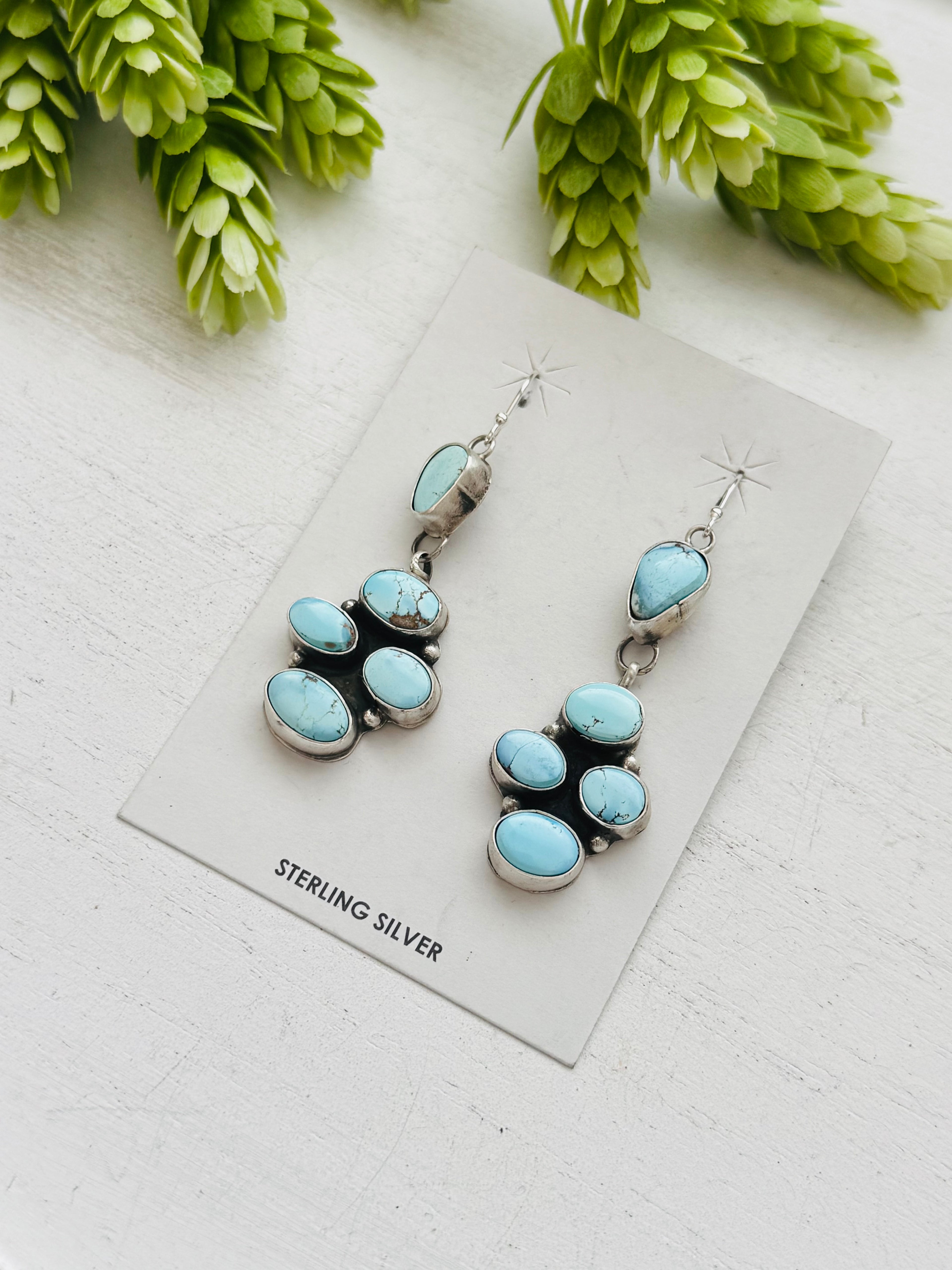 Ella Peters Golden Hills Turquoise & Sterling Silver Cluster Dangle Earrings. They measure 2 1/2 inches long and 3/4 of an inch wide. Signed by the artist and stamped sterling silver.