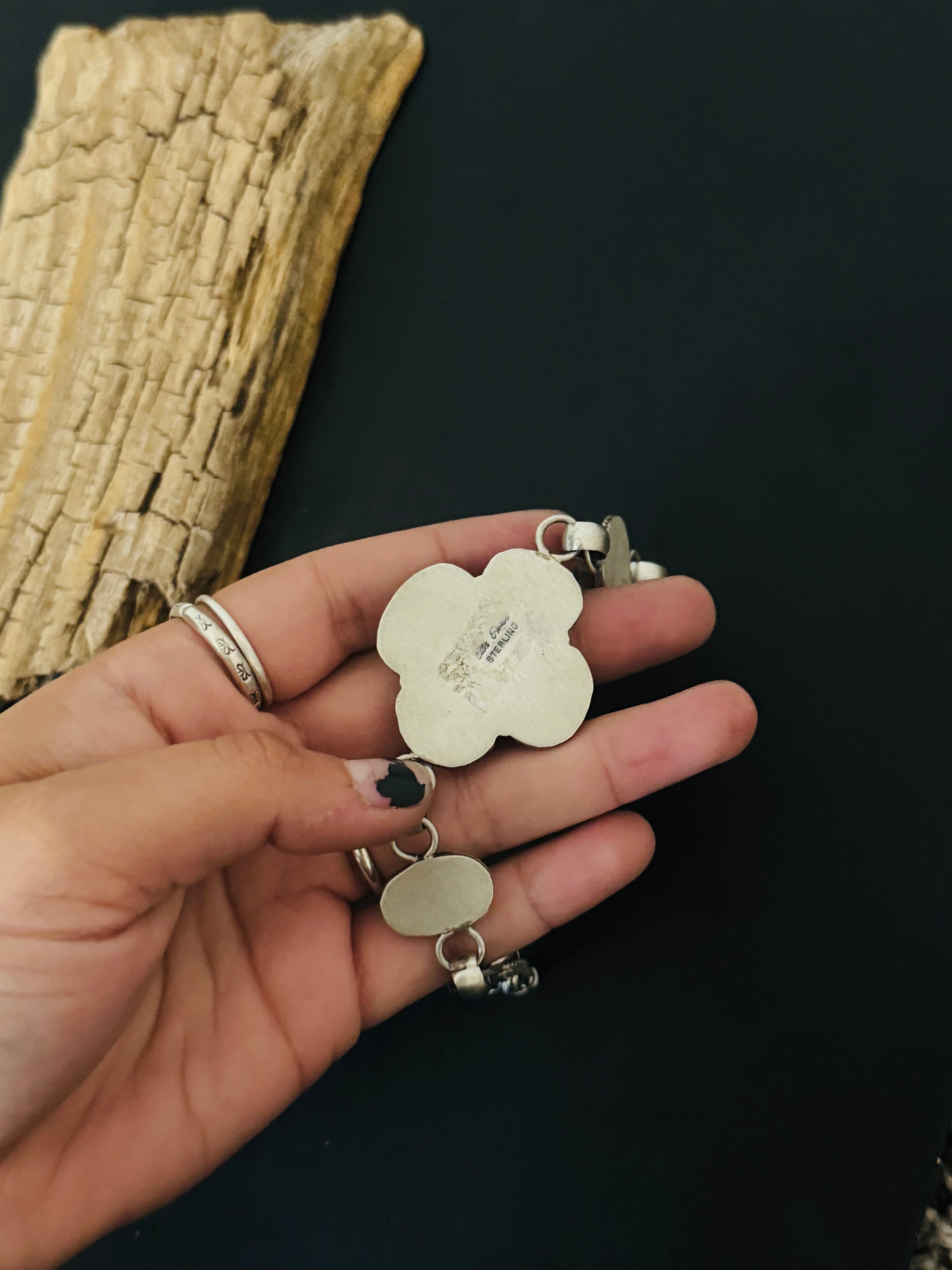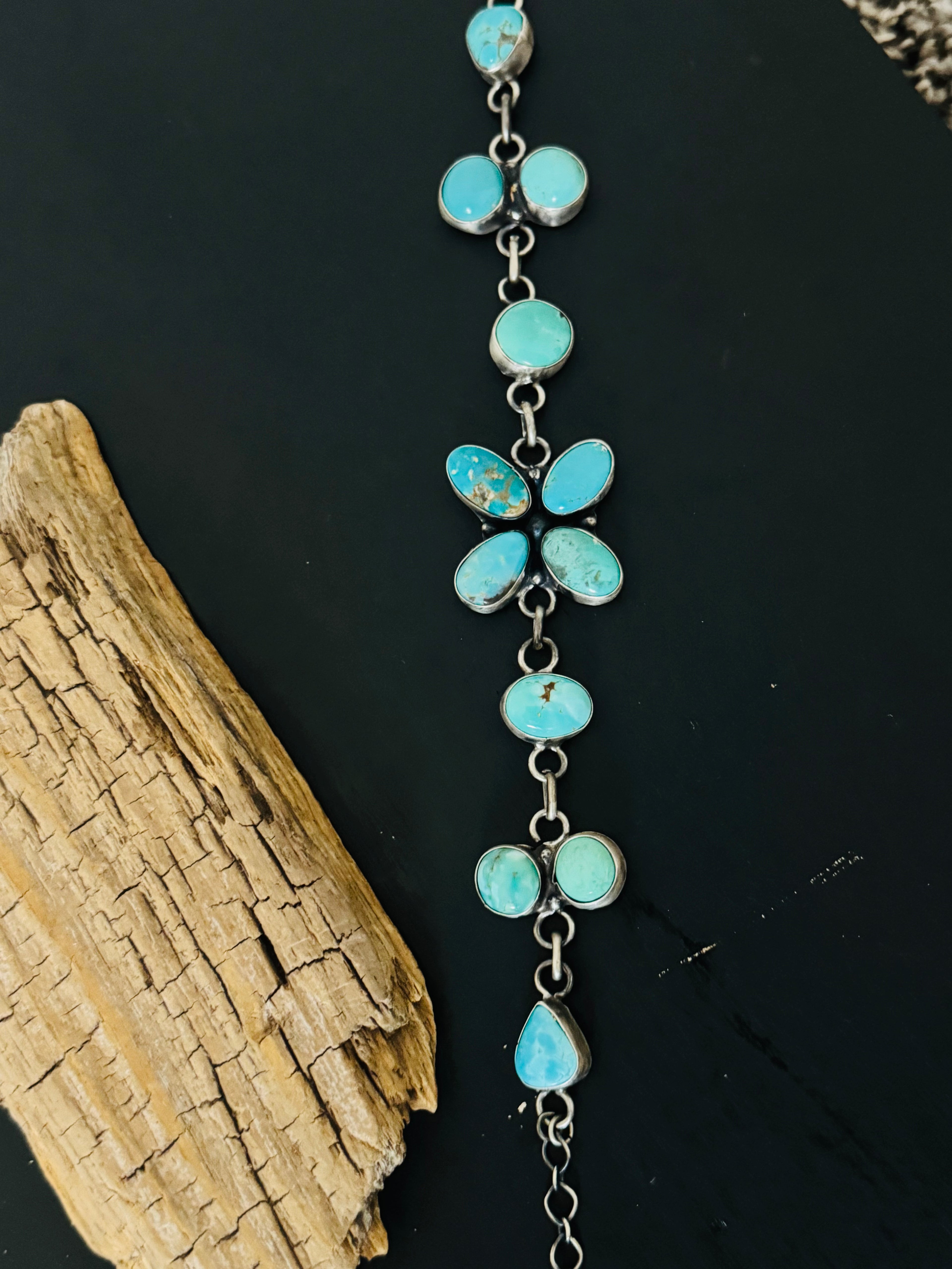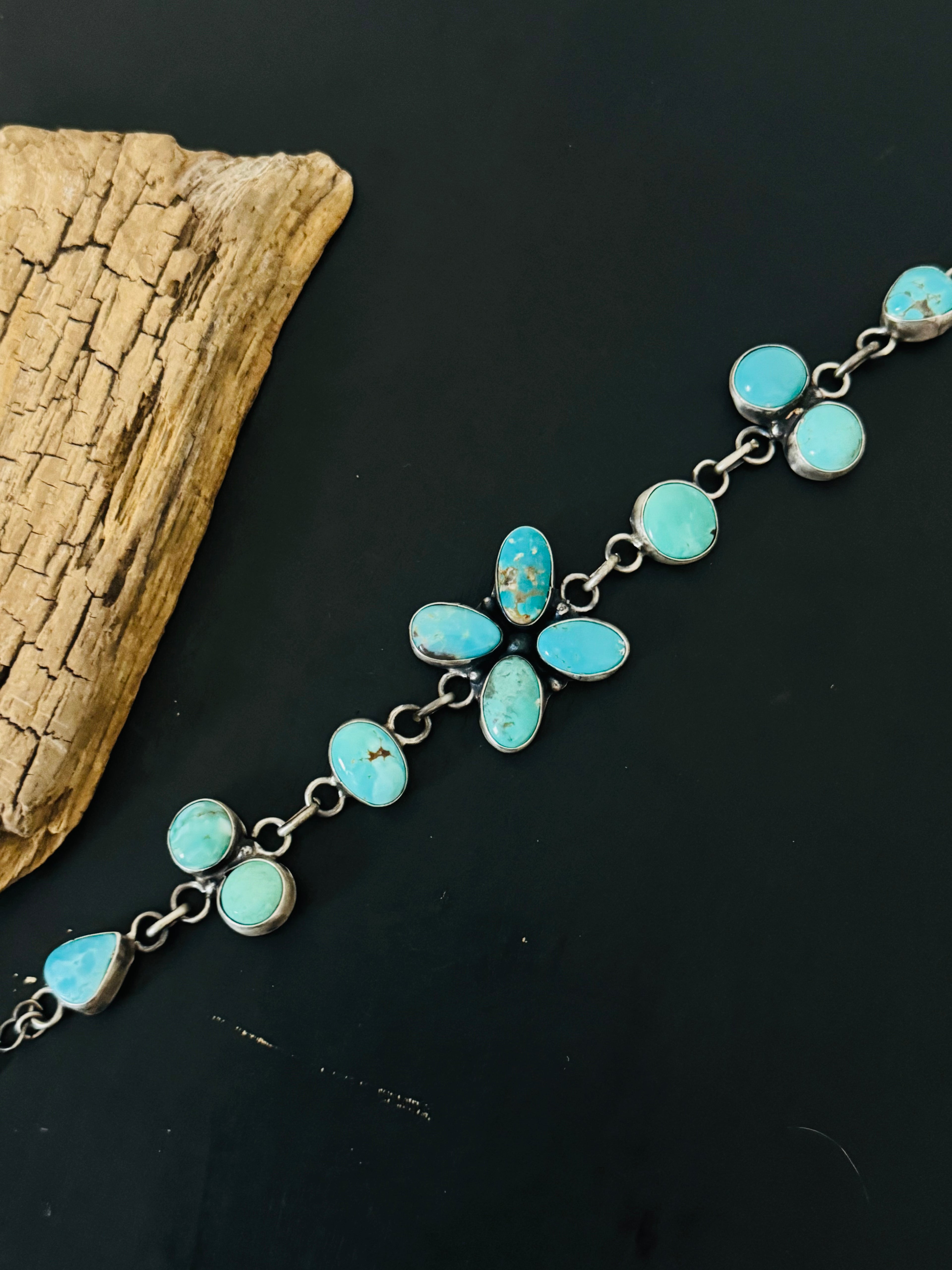 Ella Peters Mixed Turquoise & Sterling Silver Link Bracelet. It measures 11 inches long. Signed by the artist and stamped sterling silver.