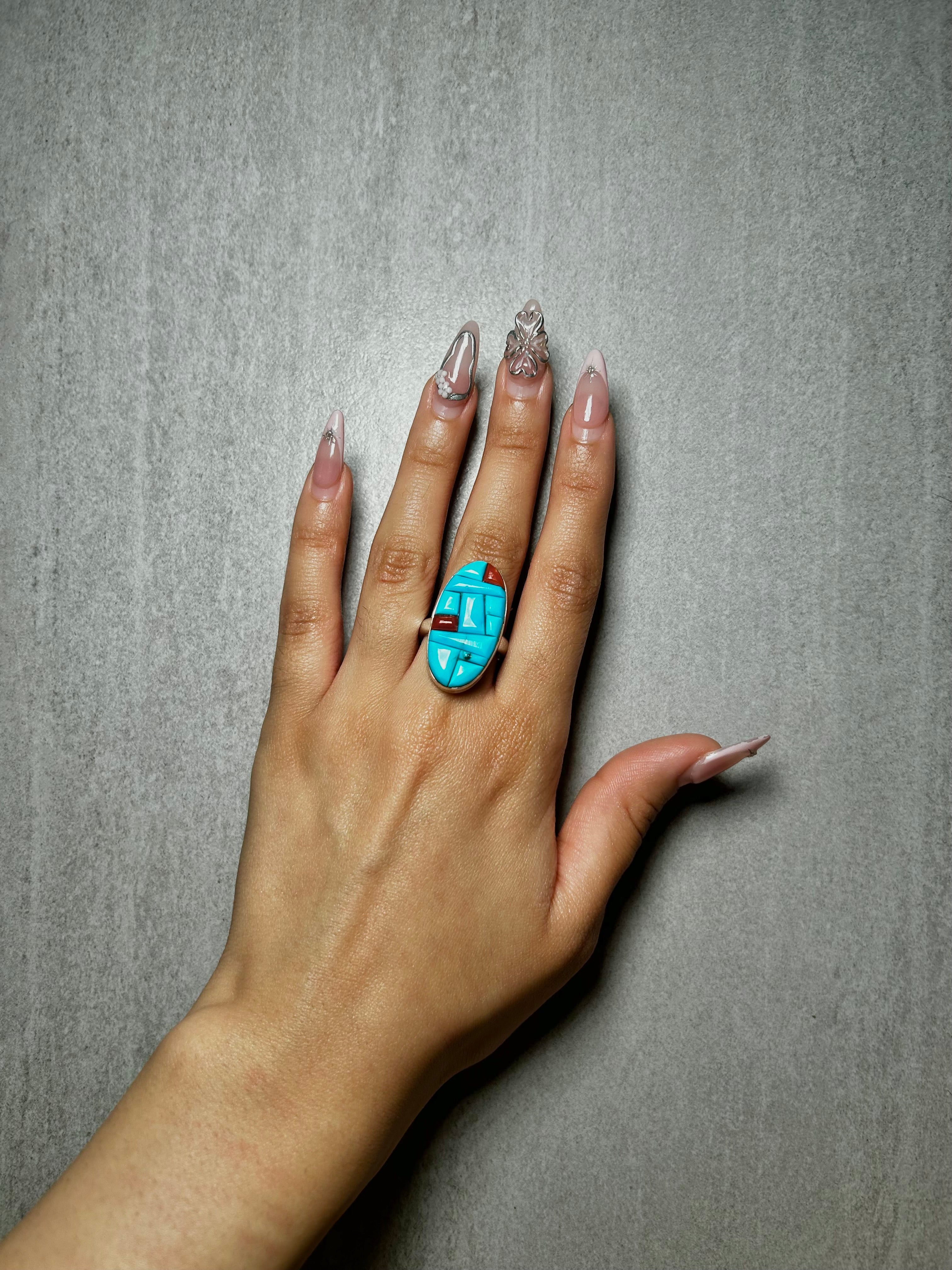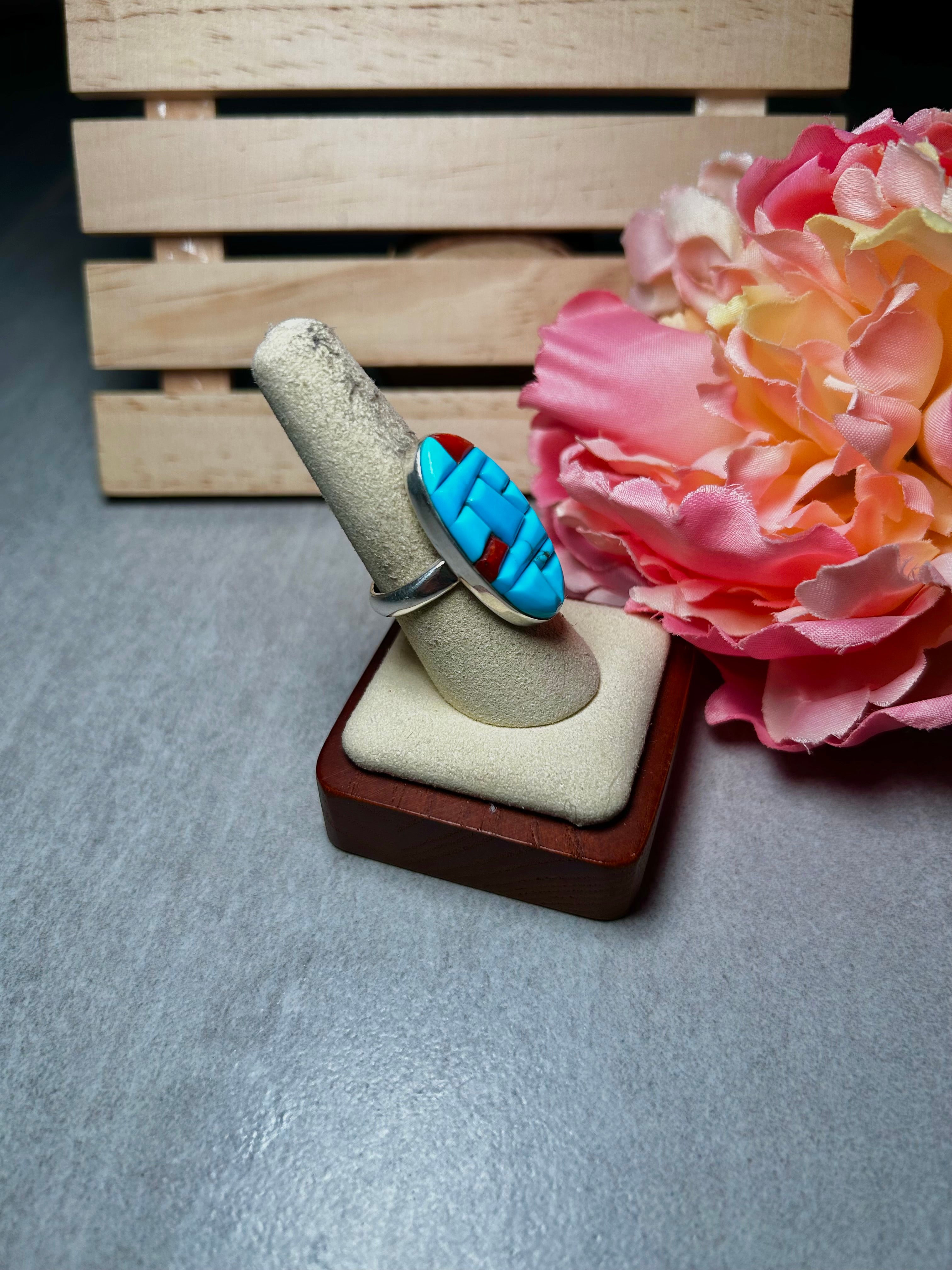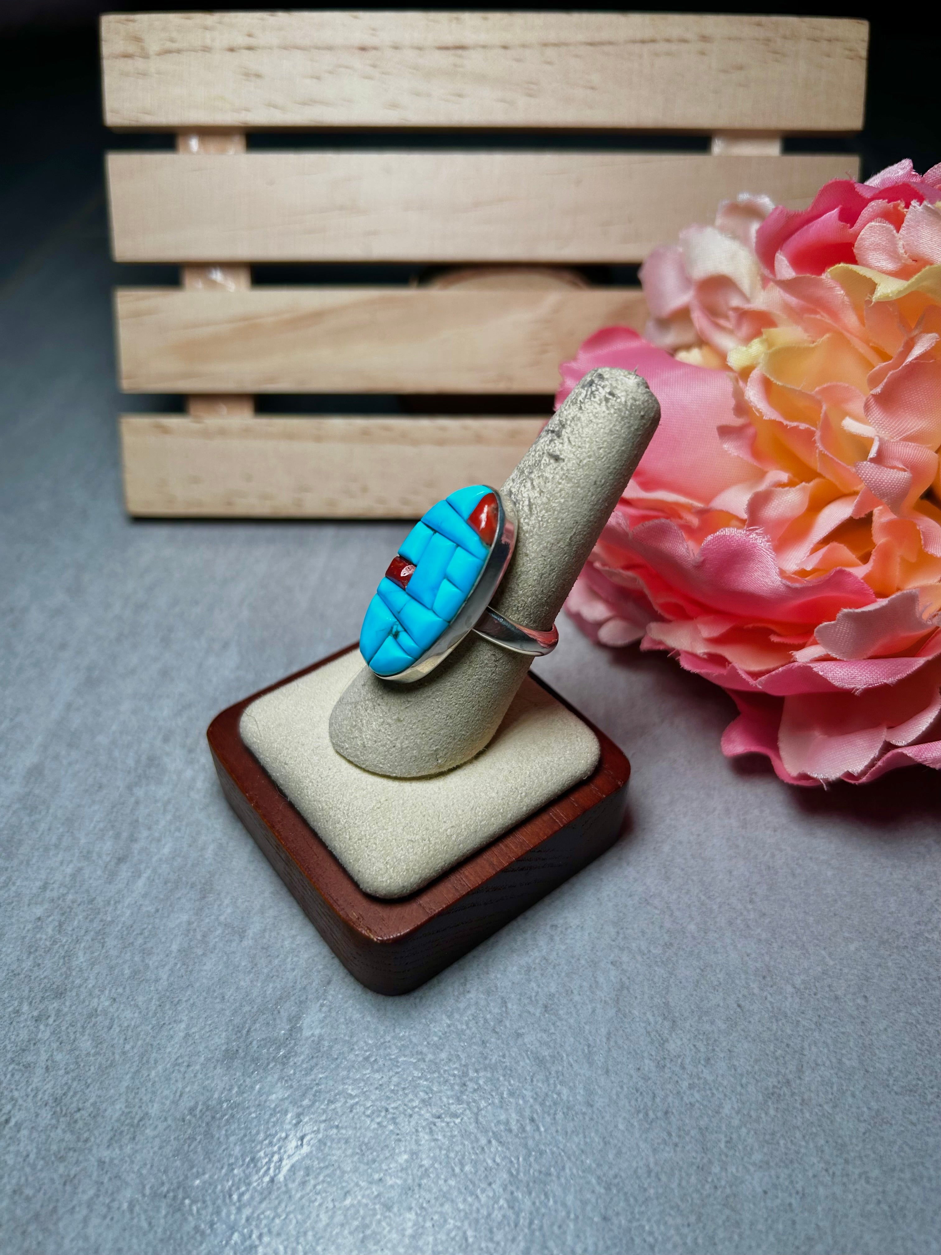 Navajo Made Multi Stone Cobble Stone & Sterling Silver Ring Size 8.25. It measures 1 1/4 inches long and 5/8 of an inch wide. Stamped sterling silver and signed.