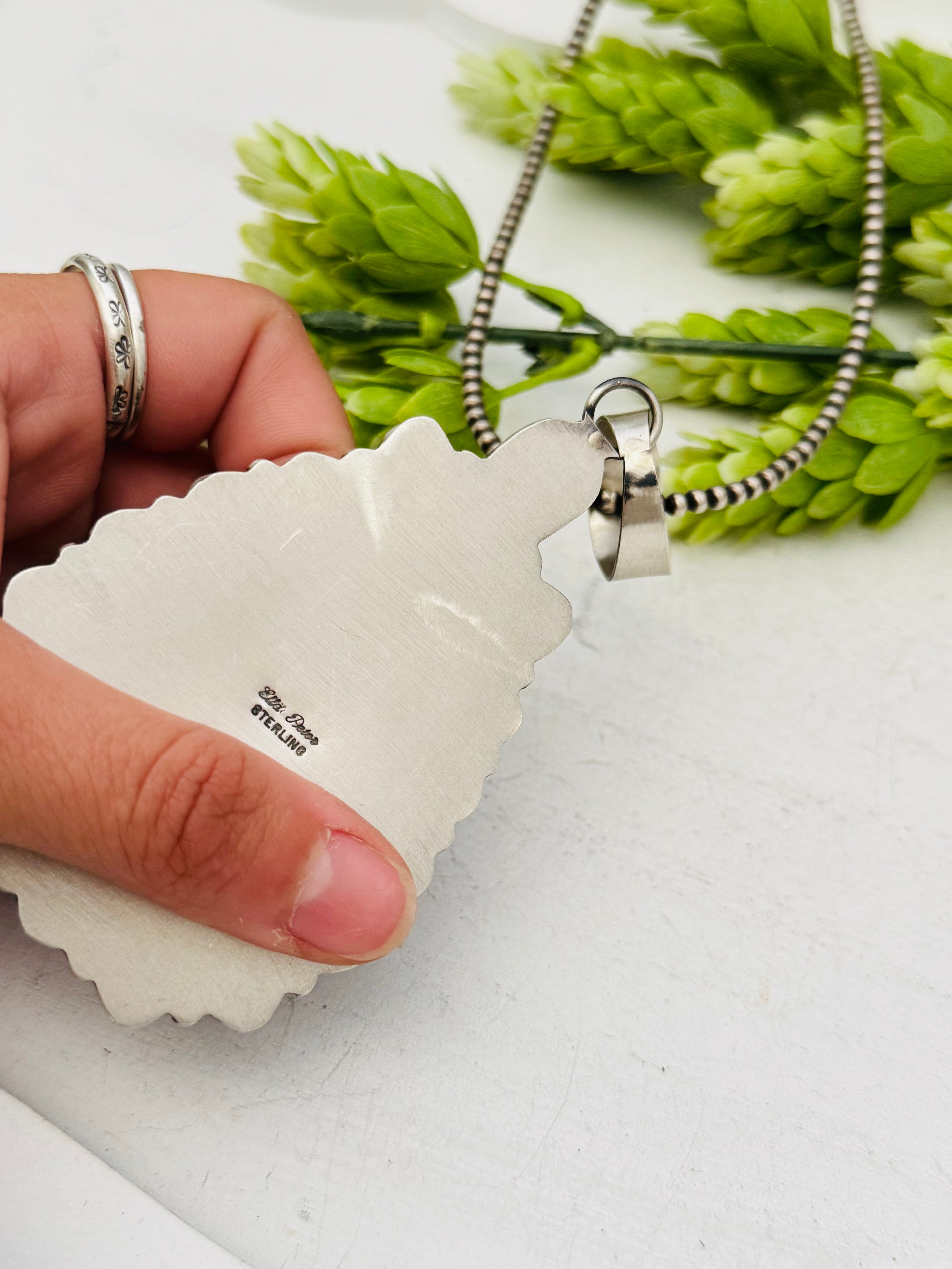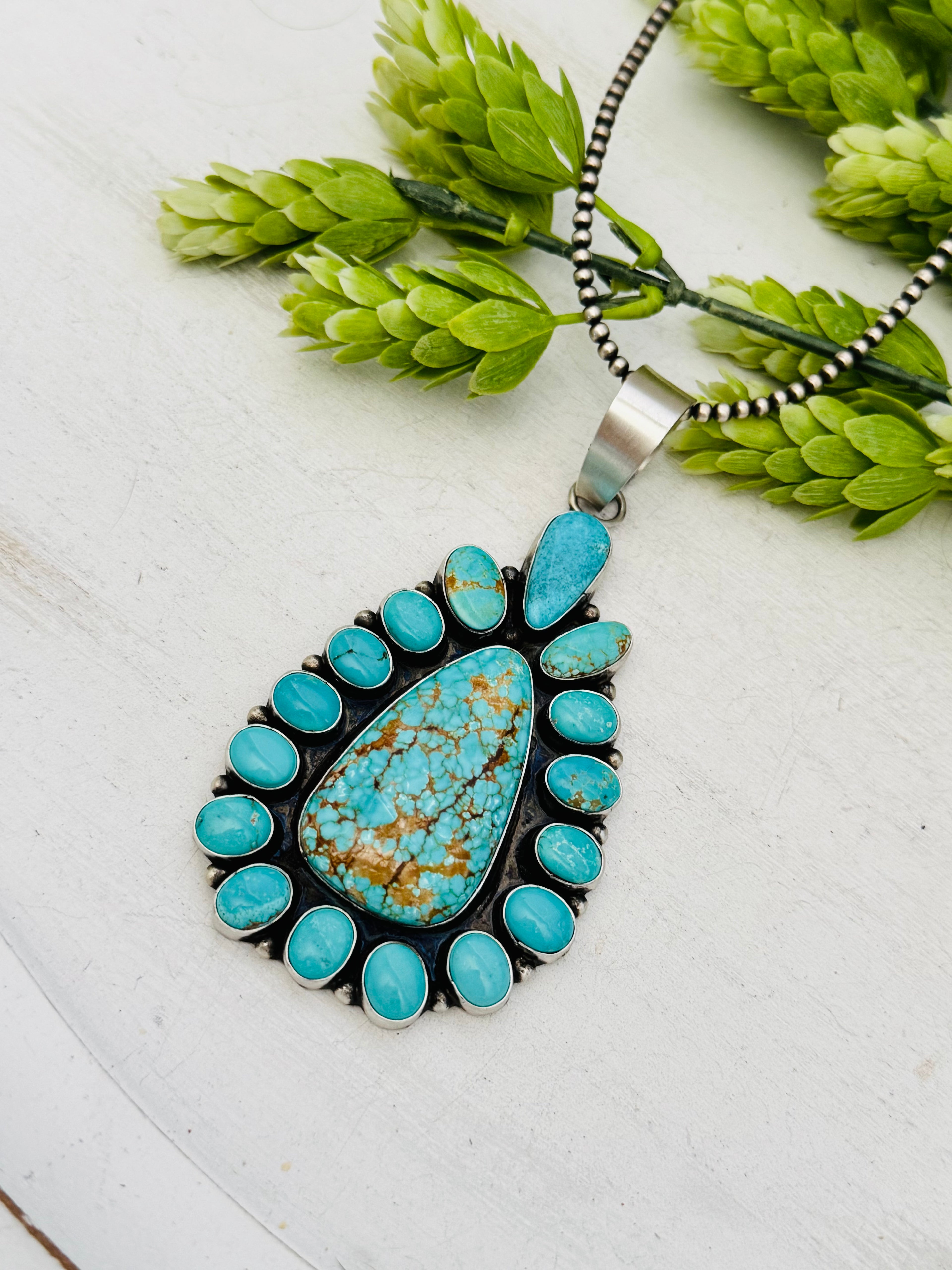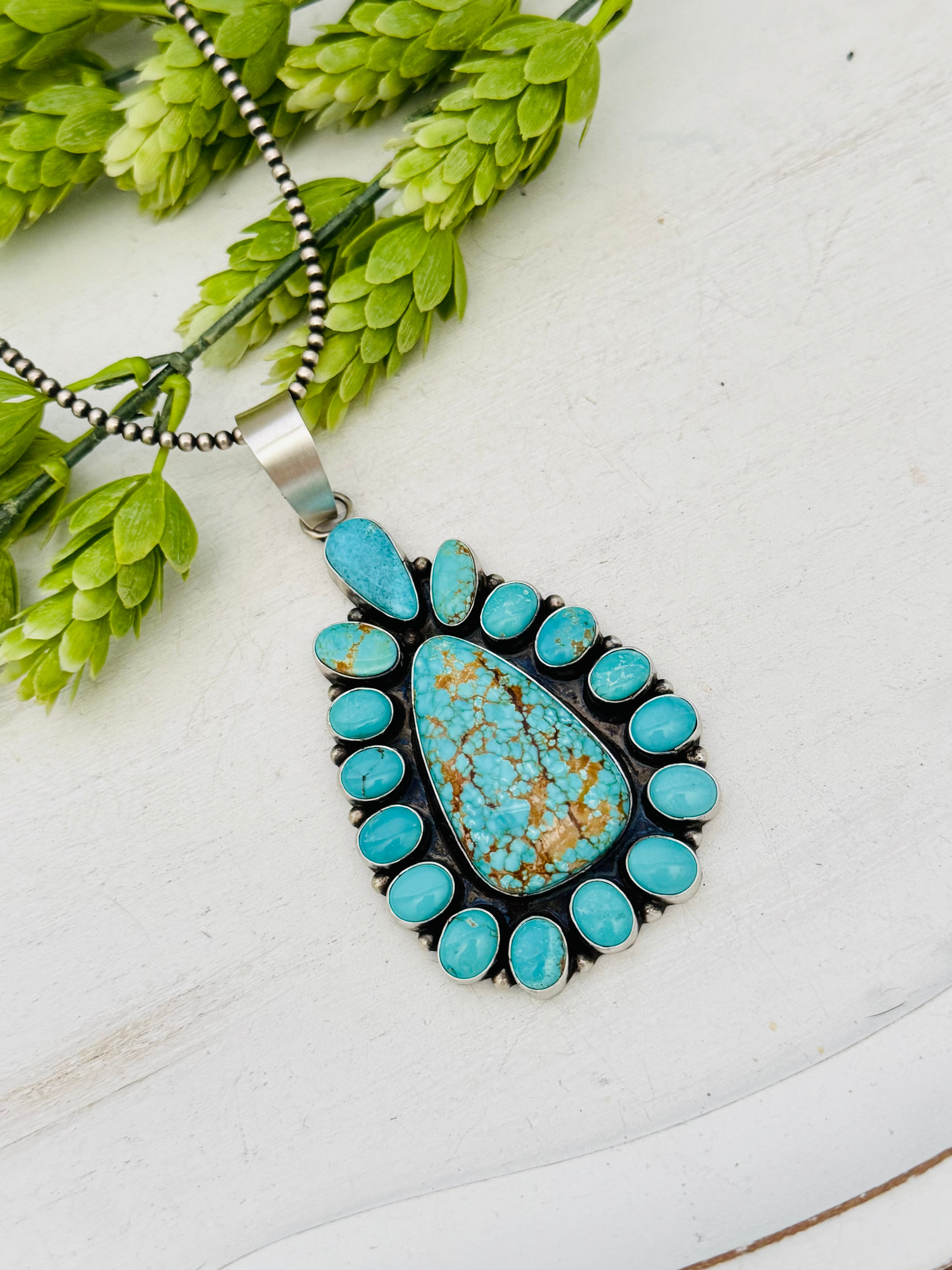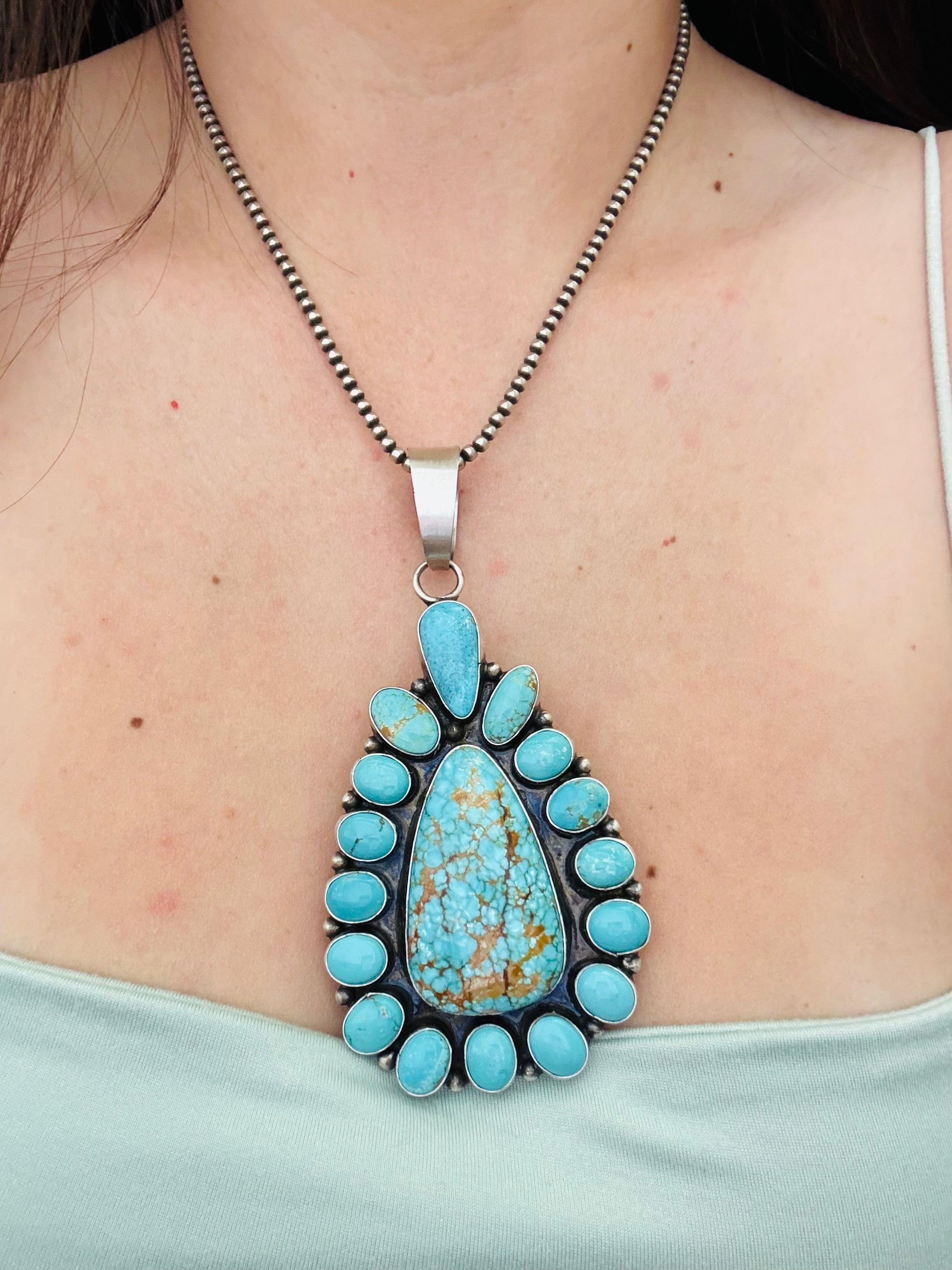 Ella Peters #8 Turquoise & Sterling Silver Cluster Pendant. It measures 4 1/2 inches long and 2 1/8 inches wide. Pendant Only! Signed by the artist and stamped sterling silver.