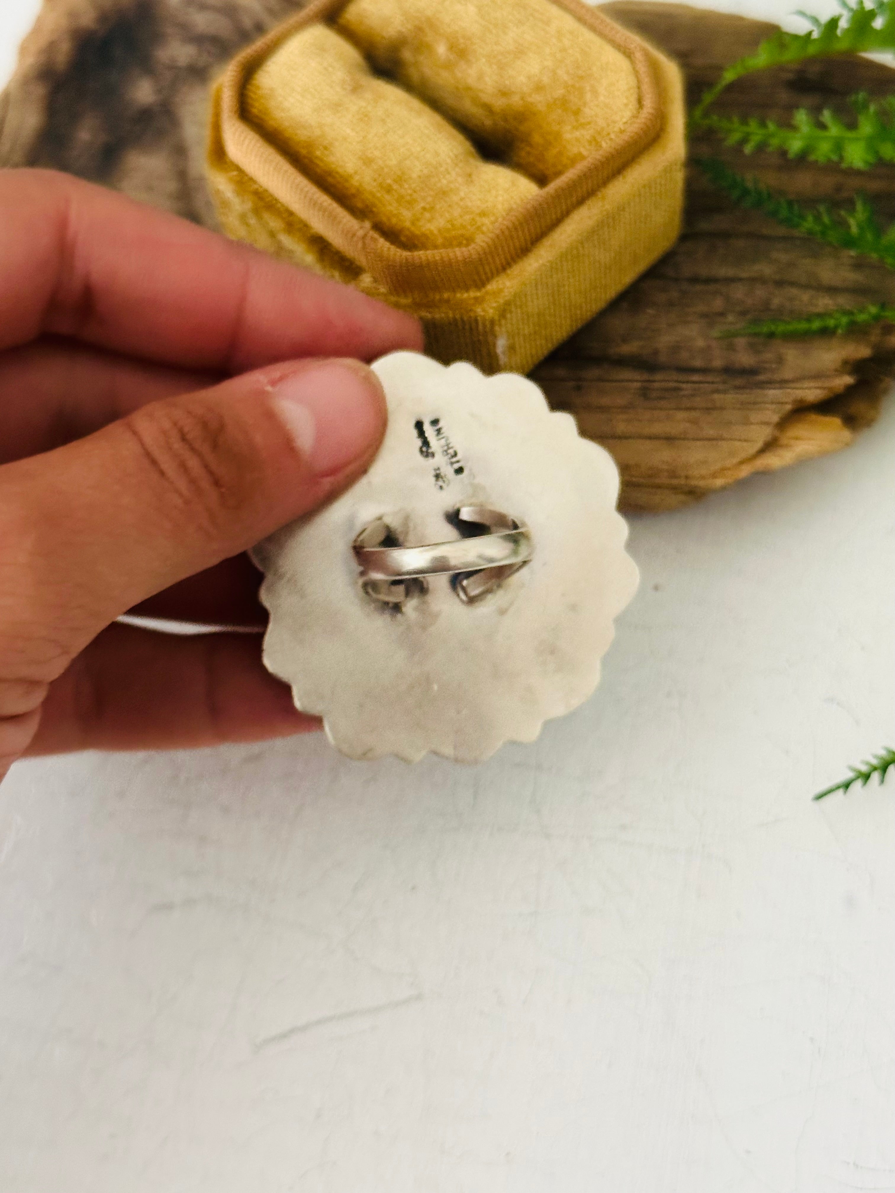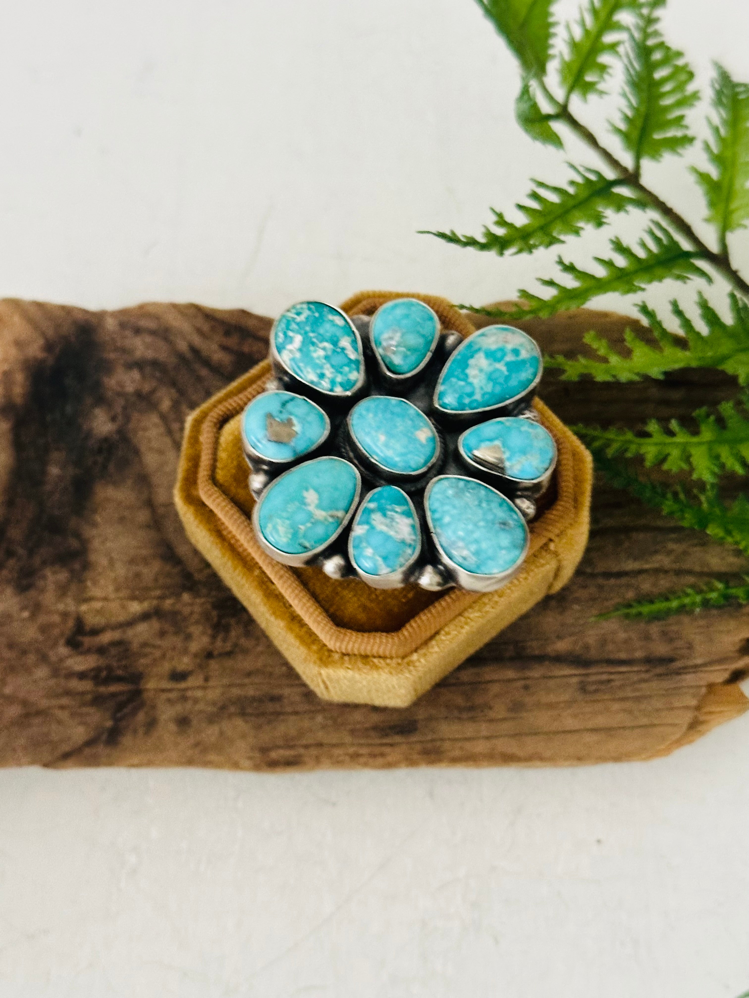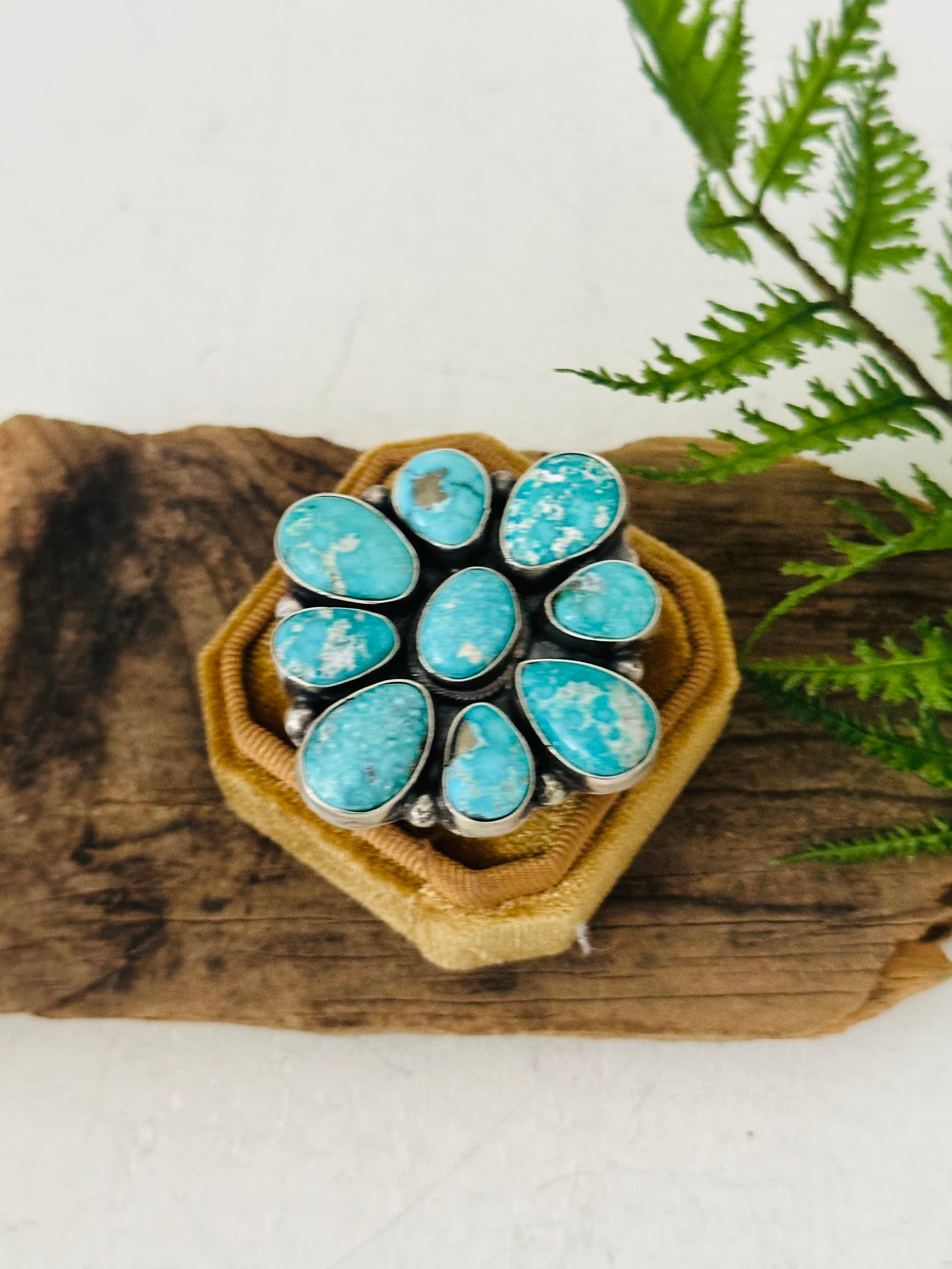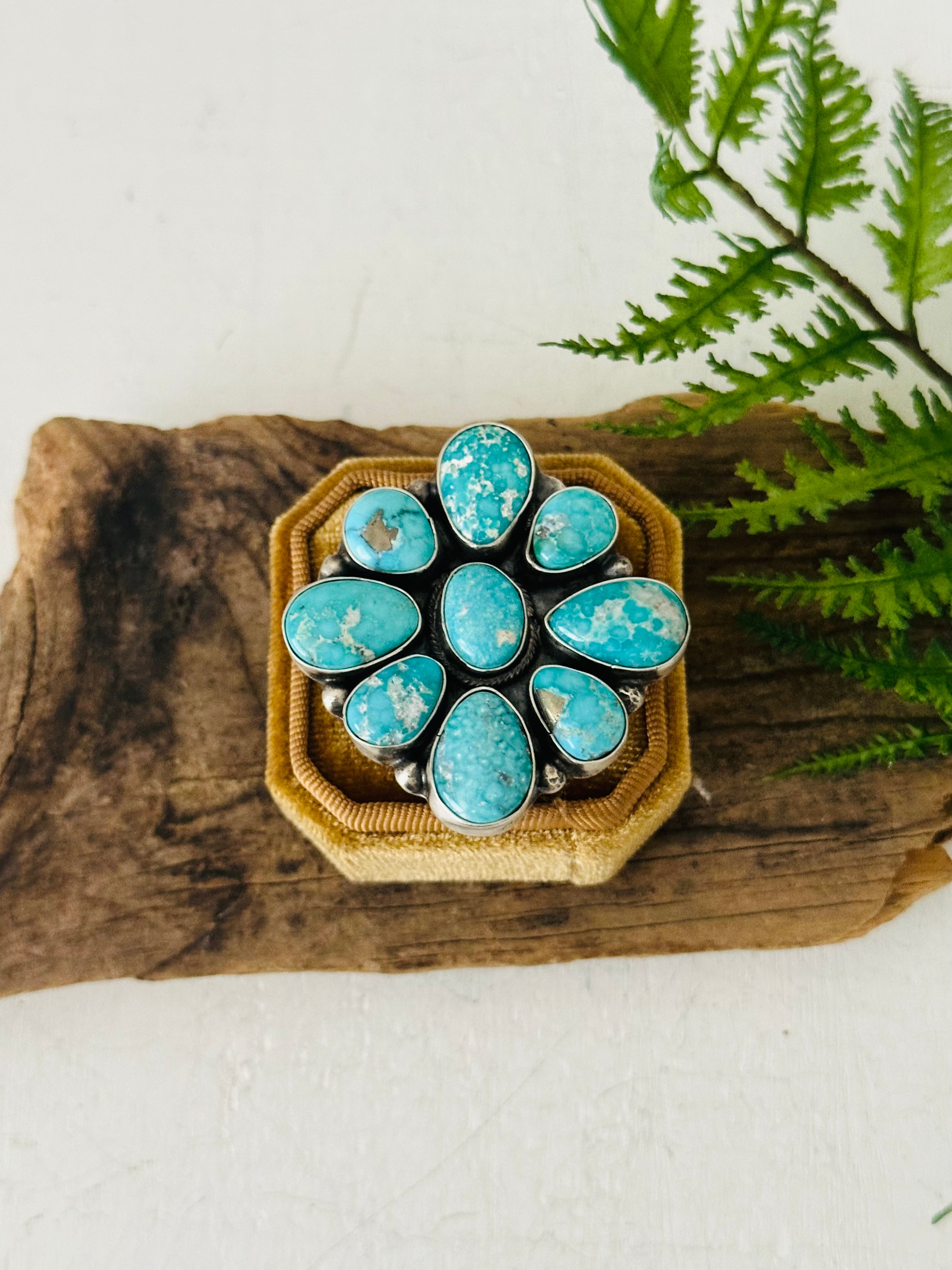 Ella Peters White Water Turquoise & Sterling Silver Ring Size 9.25. It measures 1 7/8 inches long and 1 5/8 inches wide. Signed by the artist and stamped sterling silver.