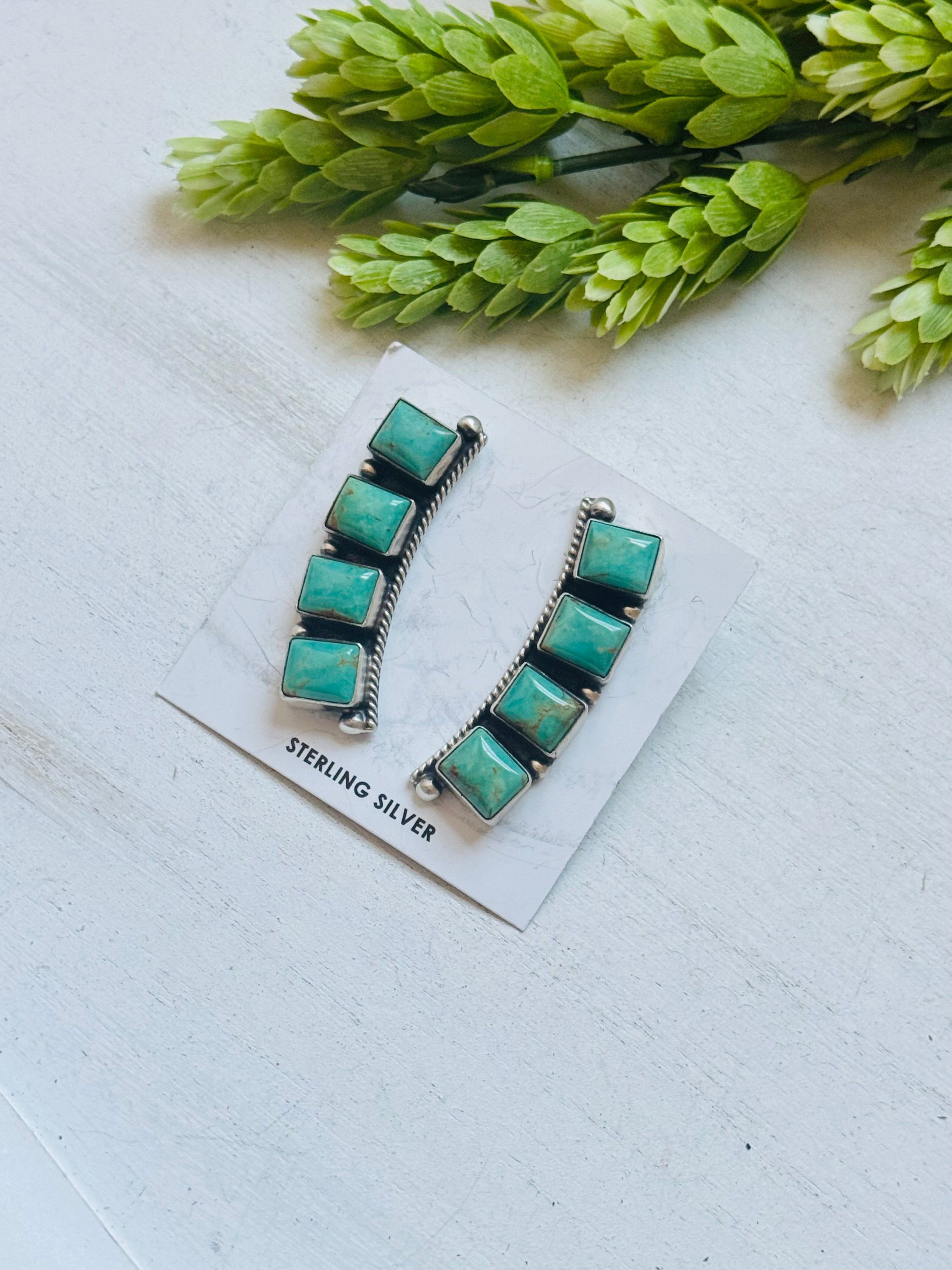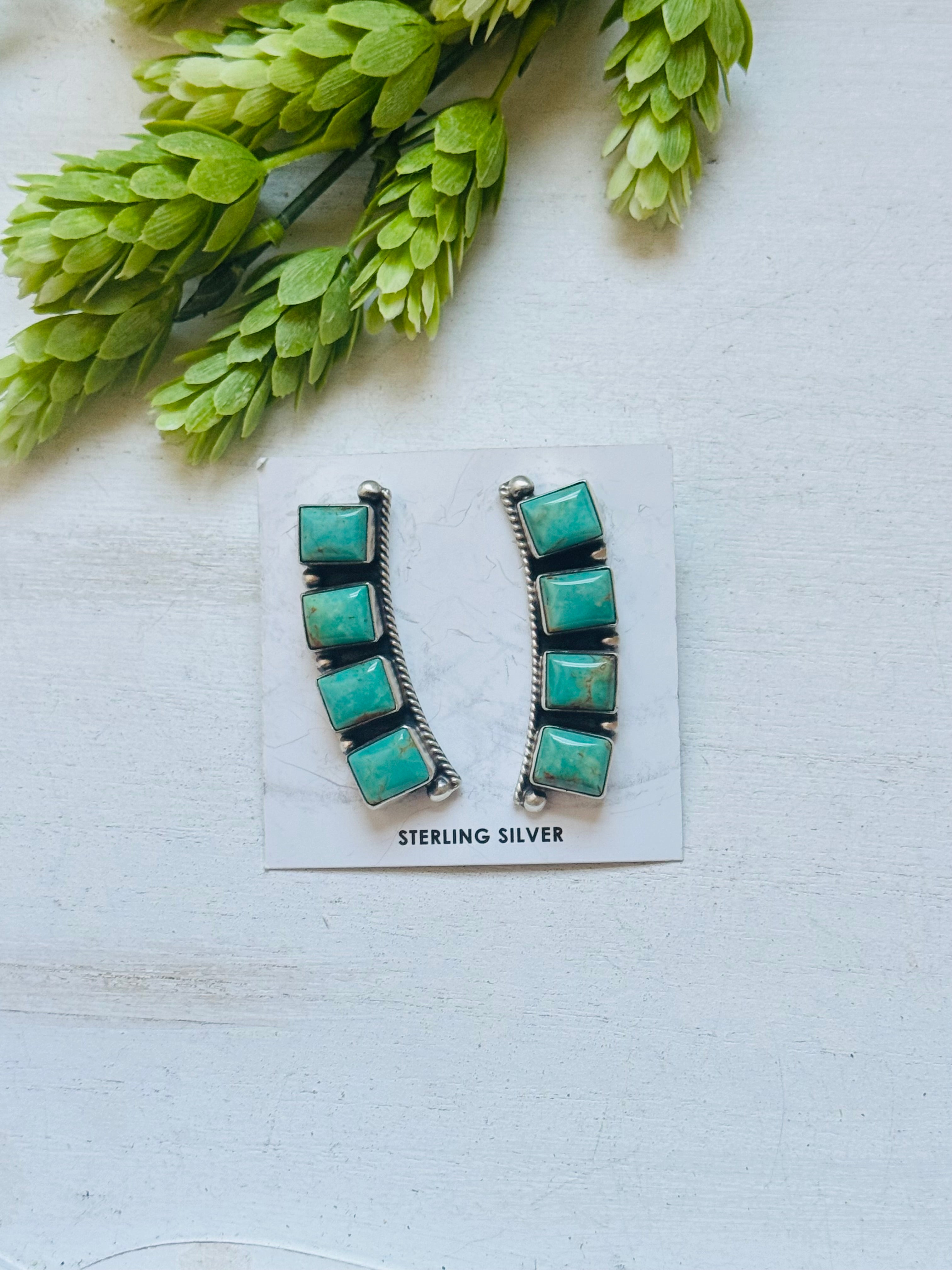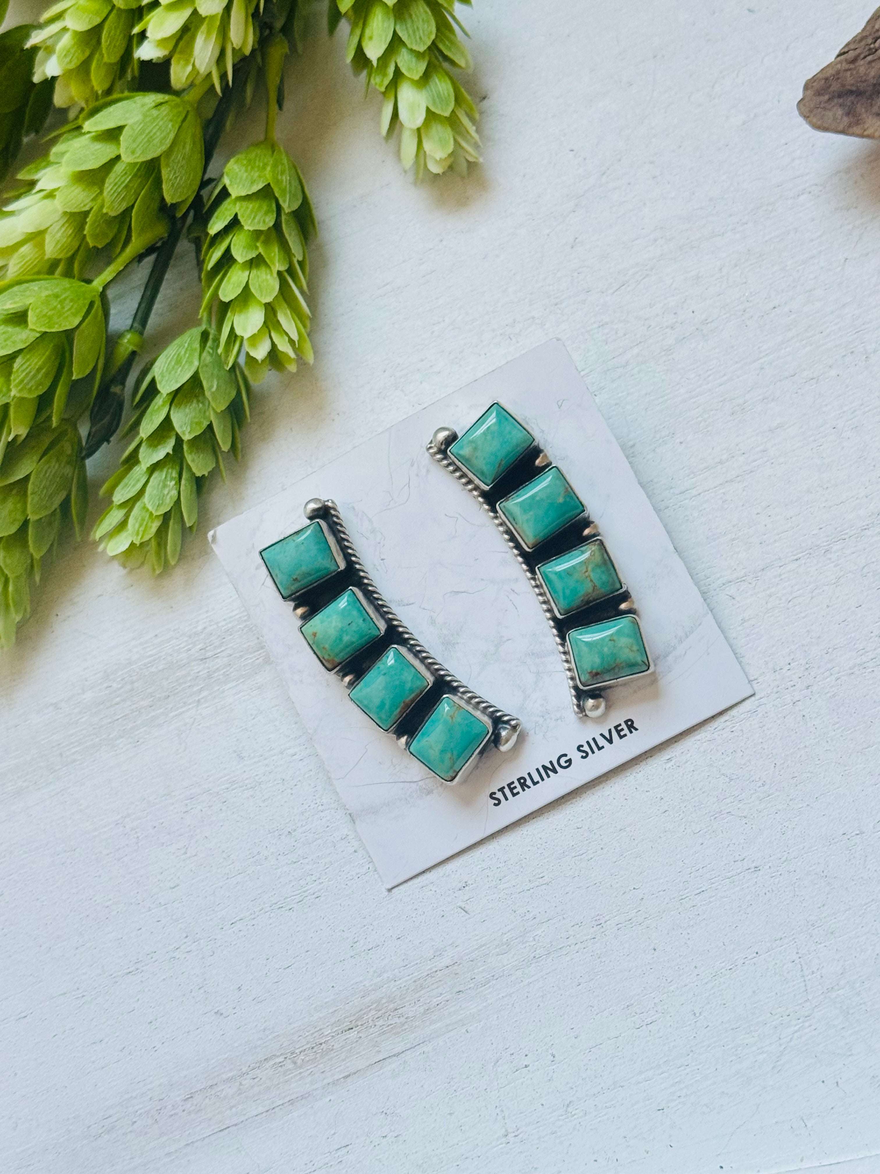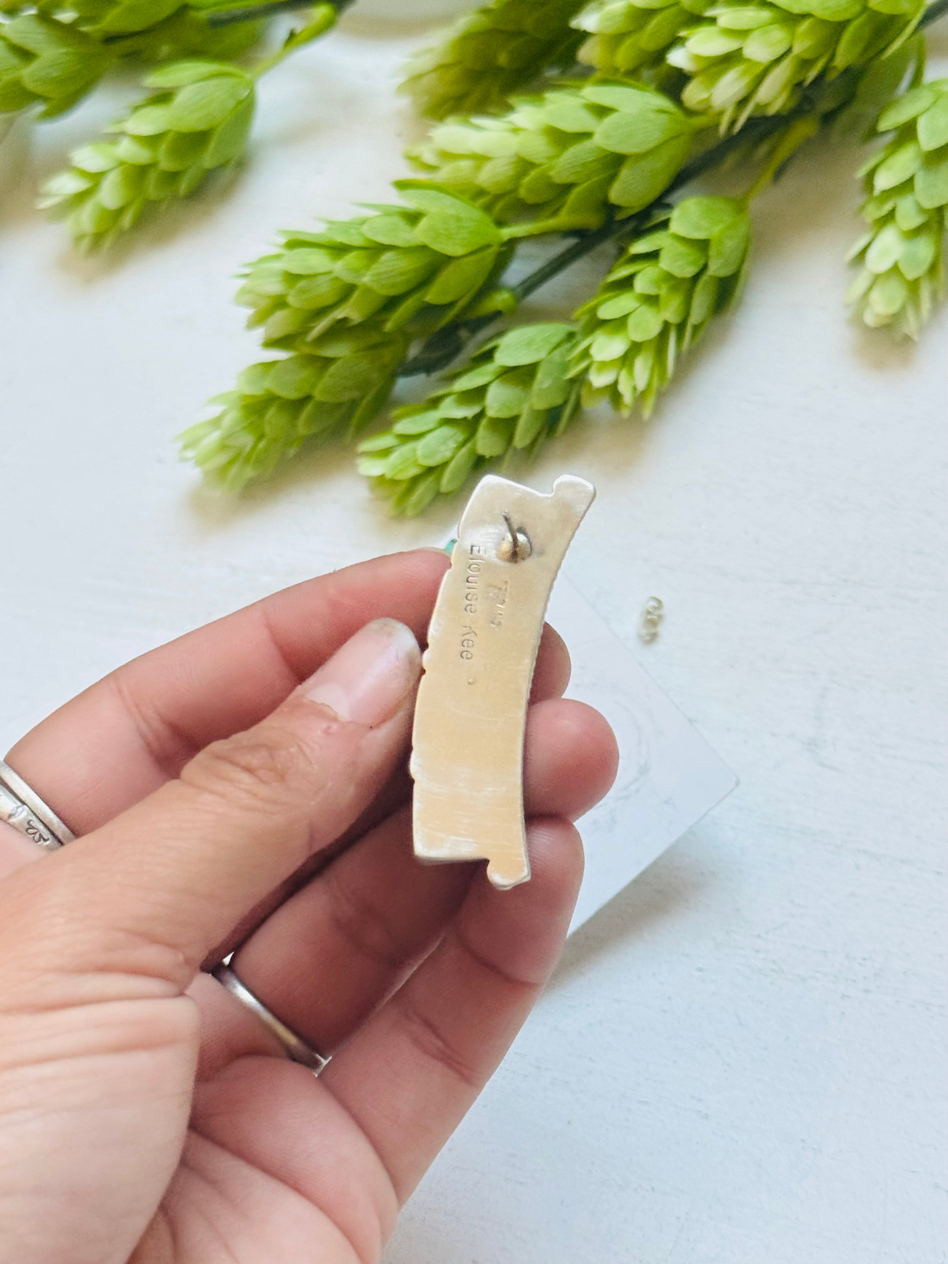 Elouise Kee Kingman Turquoise & Sterling Silver Post Dangle Earrings. It measures 1 3/4 inches long and 1/2 of an inch wide. Signed by artist and stamped sterling silver.