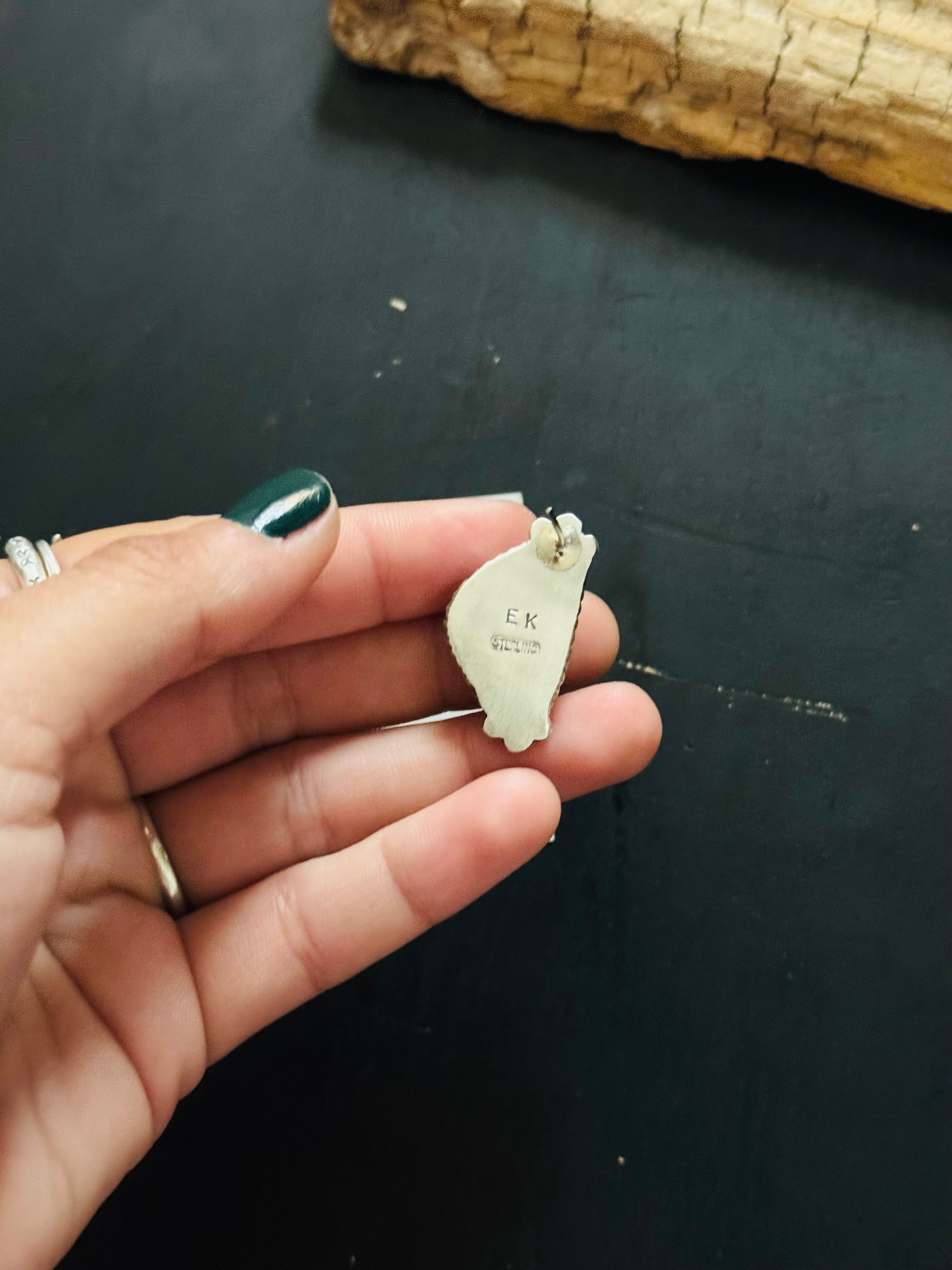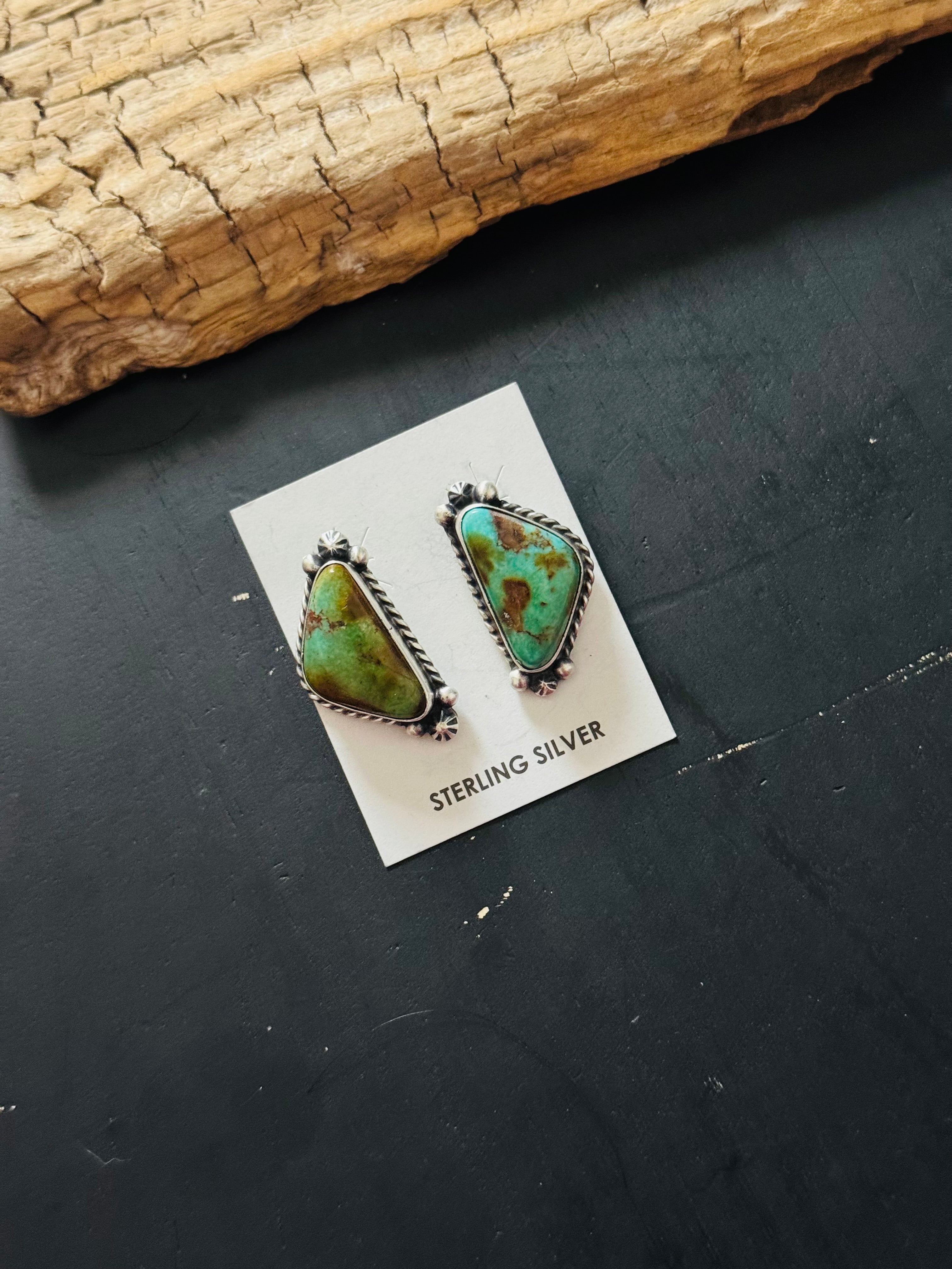 Elouise Kee Royston Turquoise & Sterling Silver Post Earring. It measures 1 3/8 inches long and 3/4 of an inch wide. Signed by artist and stamped sterling silver.