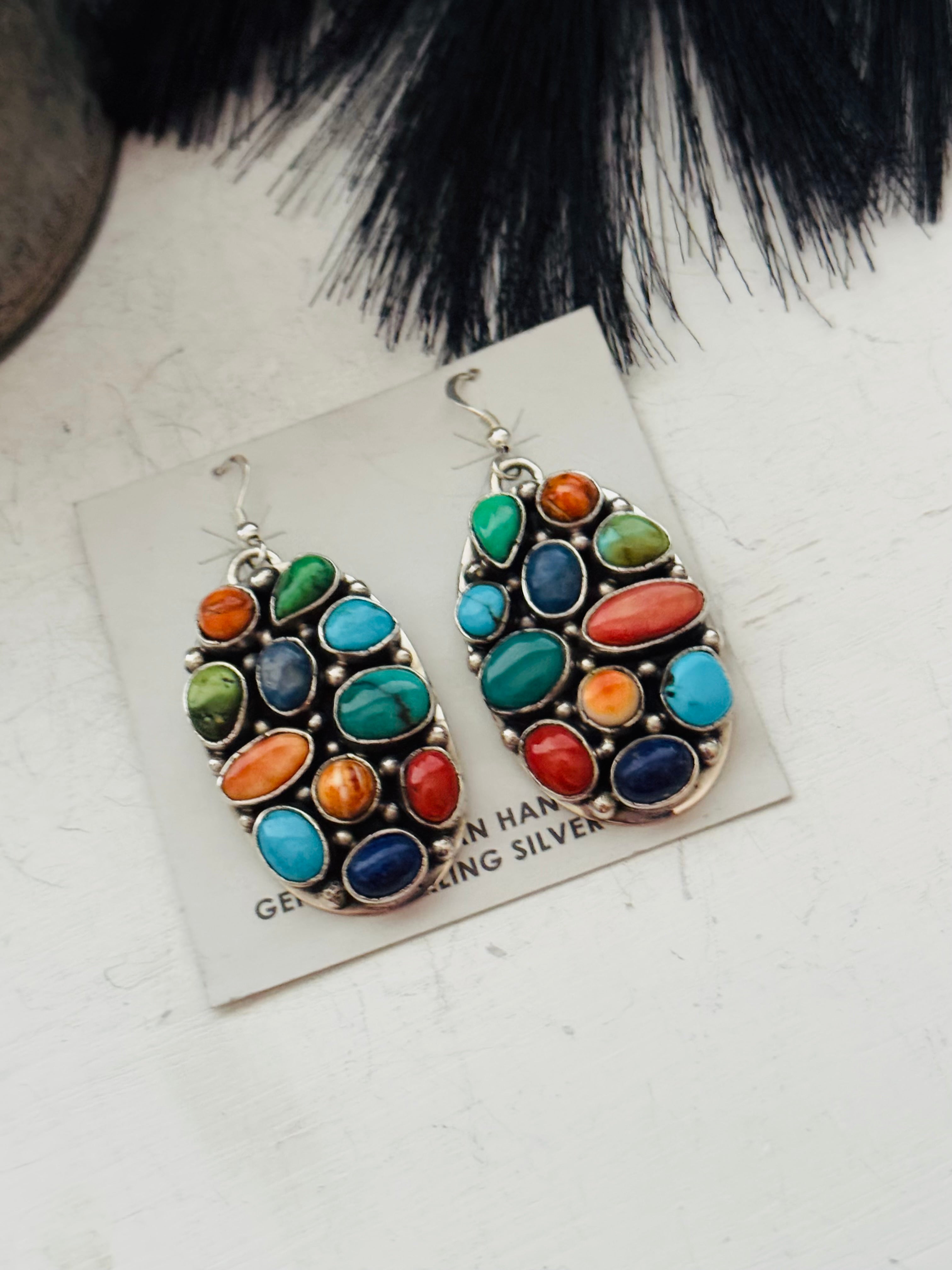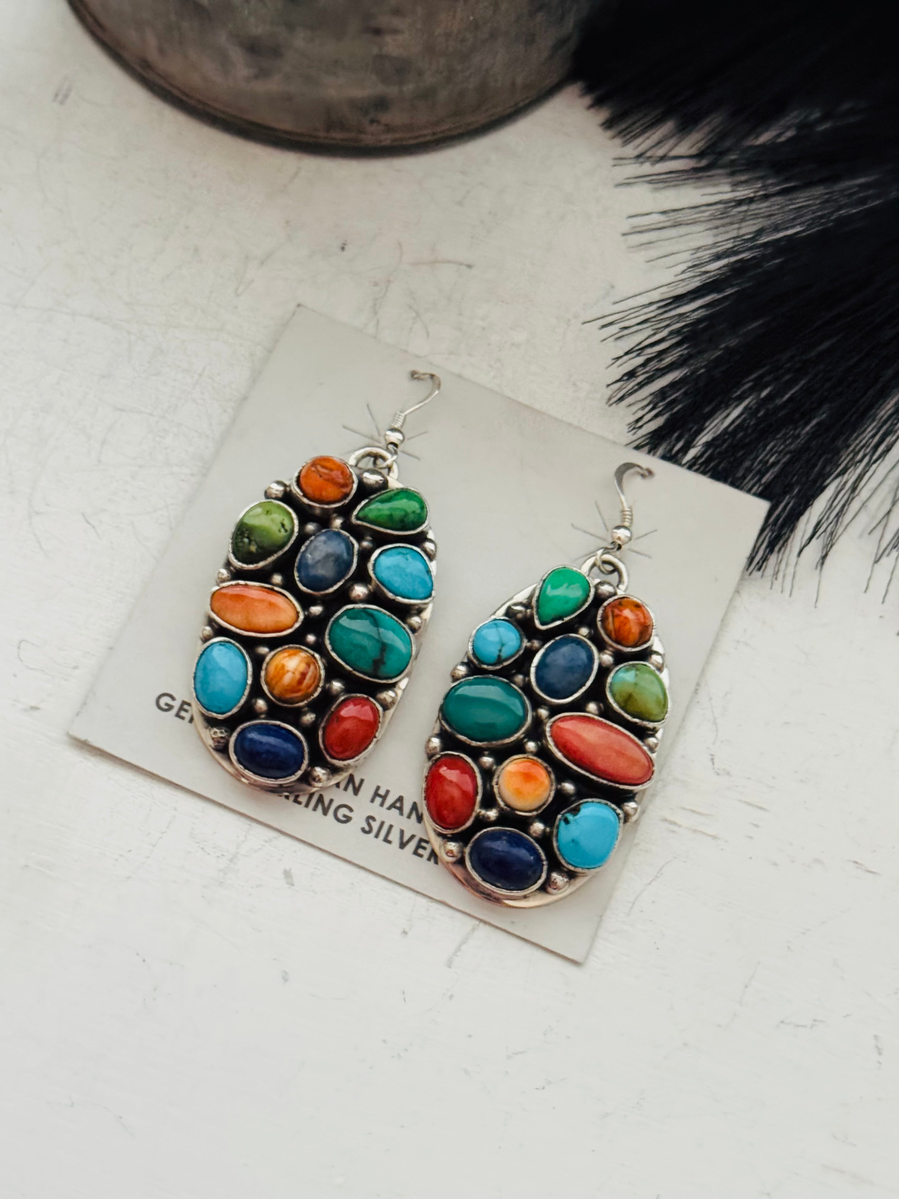 A beautiful Ring. Emer Thompson Multi Stone & Sterling Silver Cluster Earrings. It measures 2 1/8 inches long and 1 3/8 inches wide. Signed by the artist and stamped sterling silver.