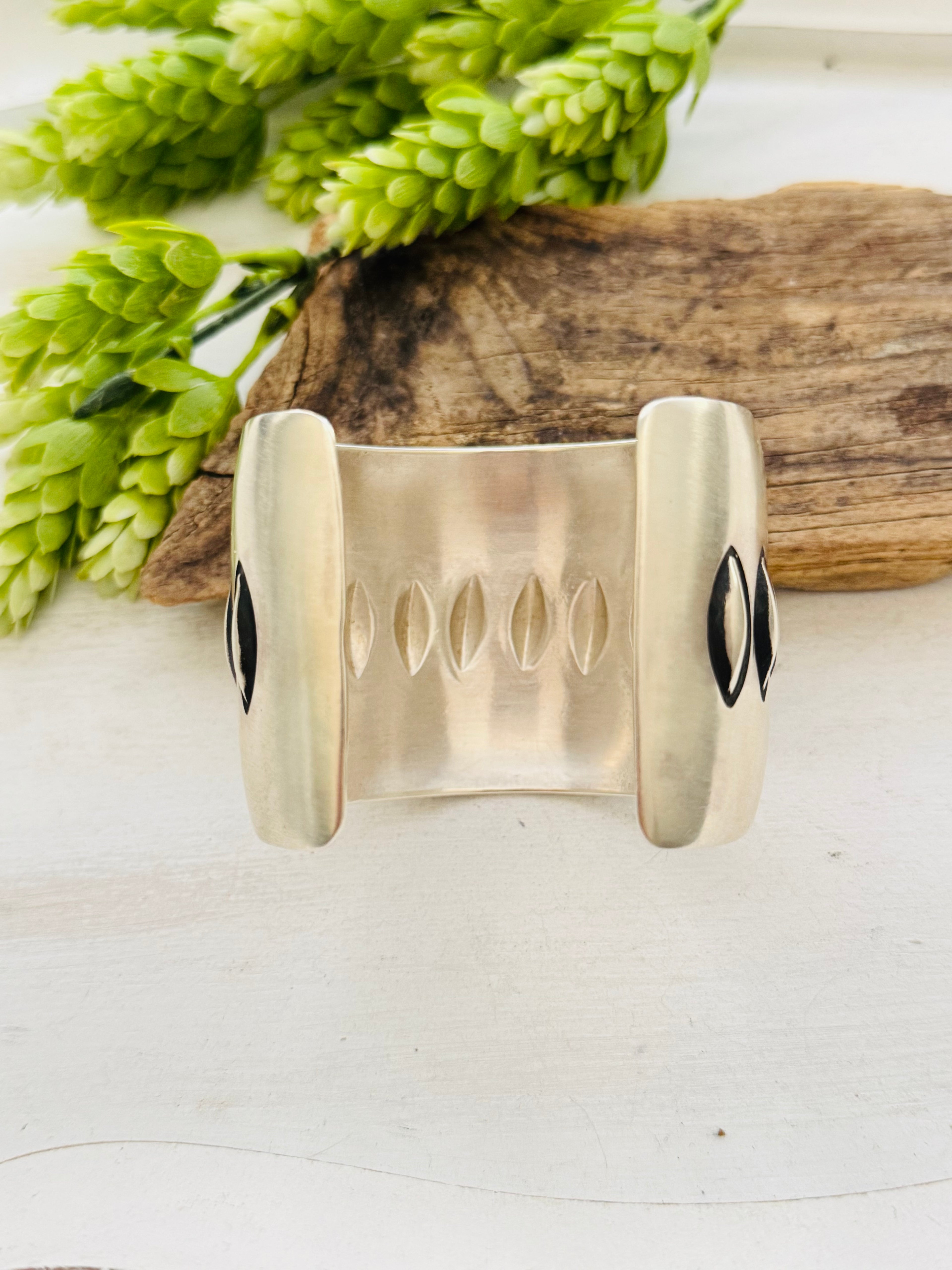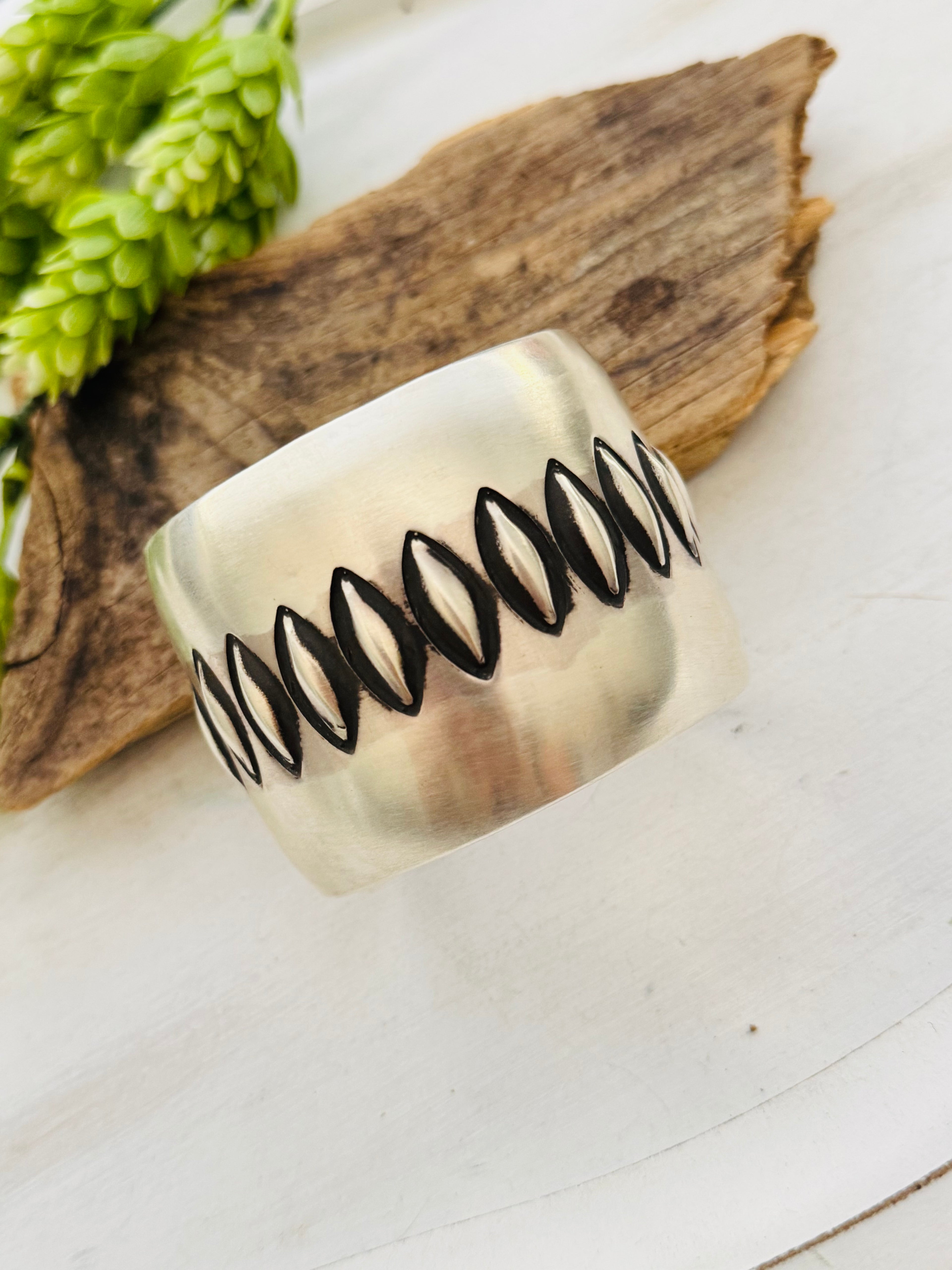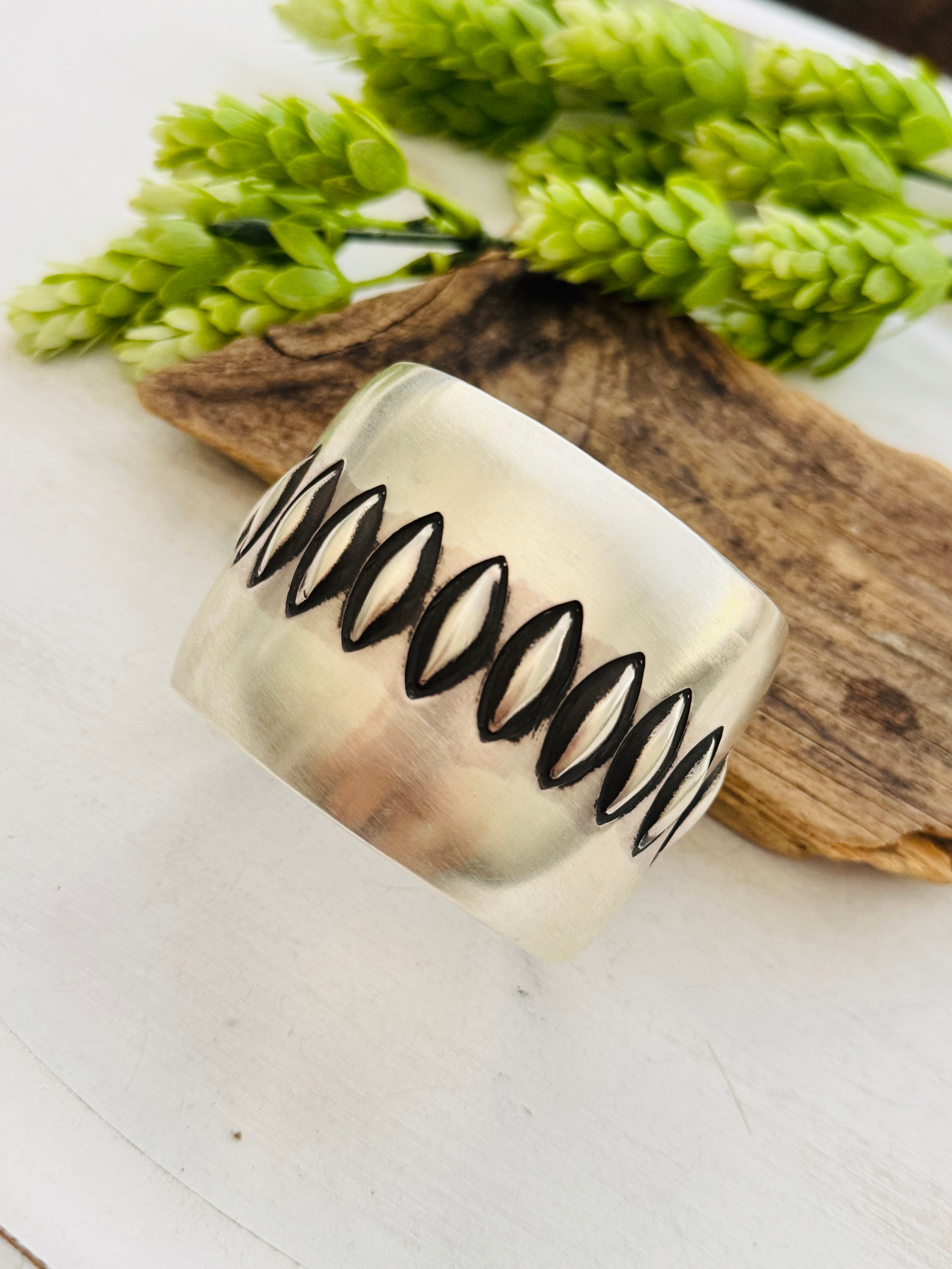 Emerson Brown Sterling Silver Cuff Bracelet. It measures 2 inches wide with an inside circumference of 6 inches and a gap of 1 1/4 inches. Signed by artist and stamped sterling silver.