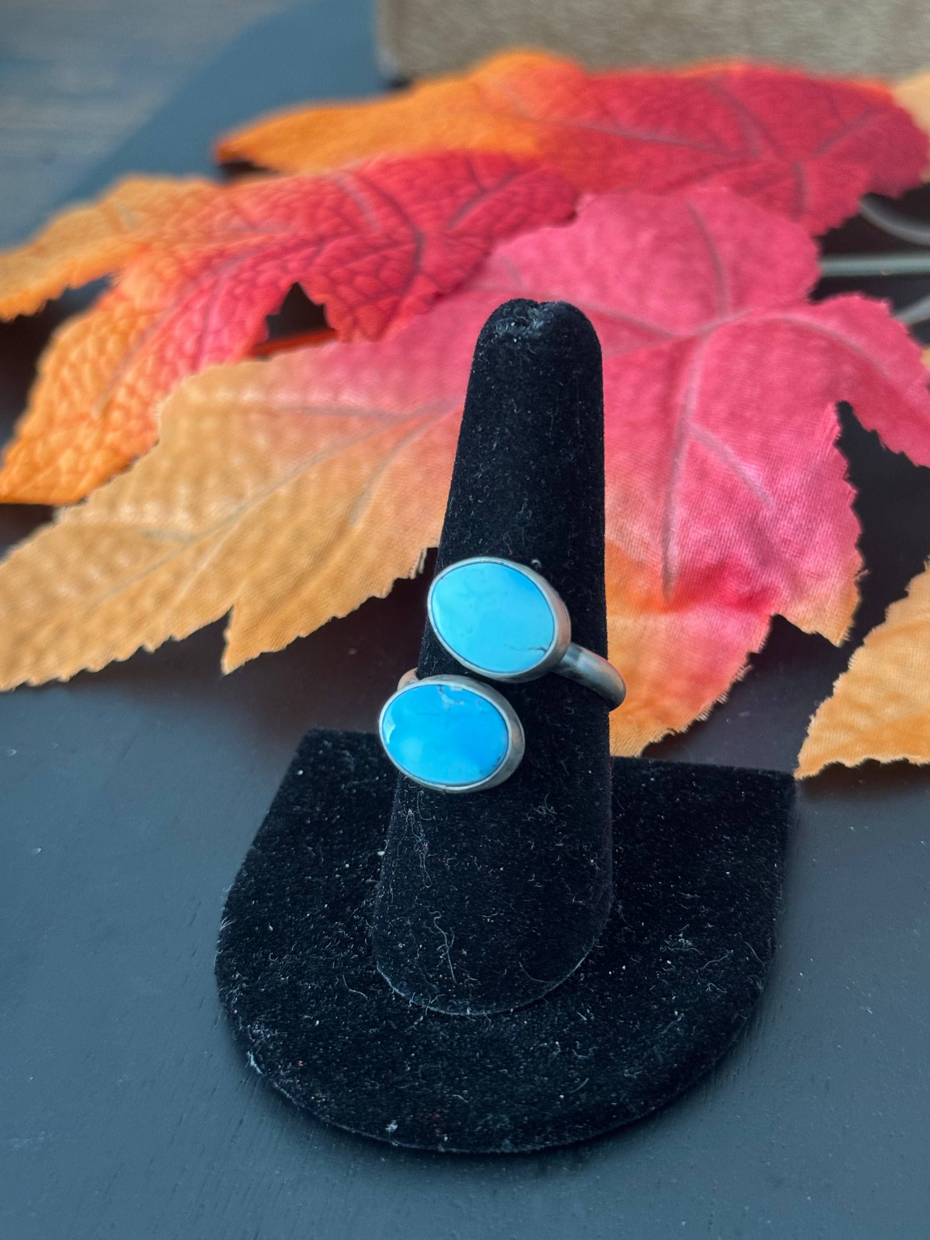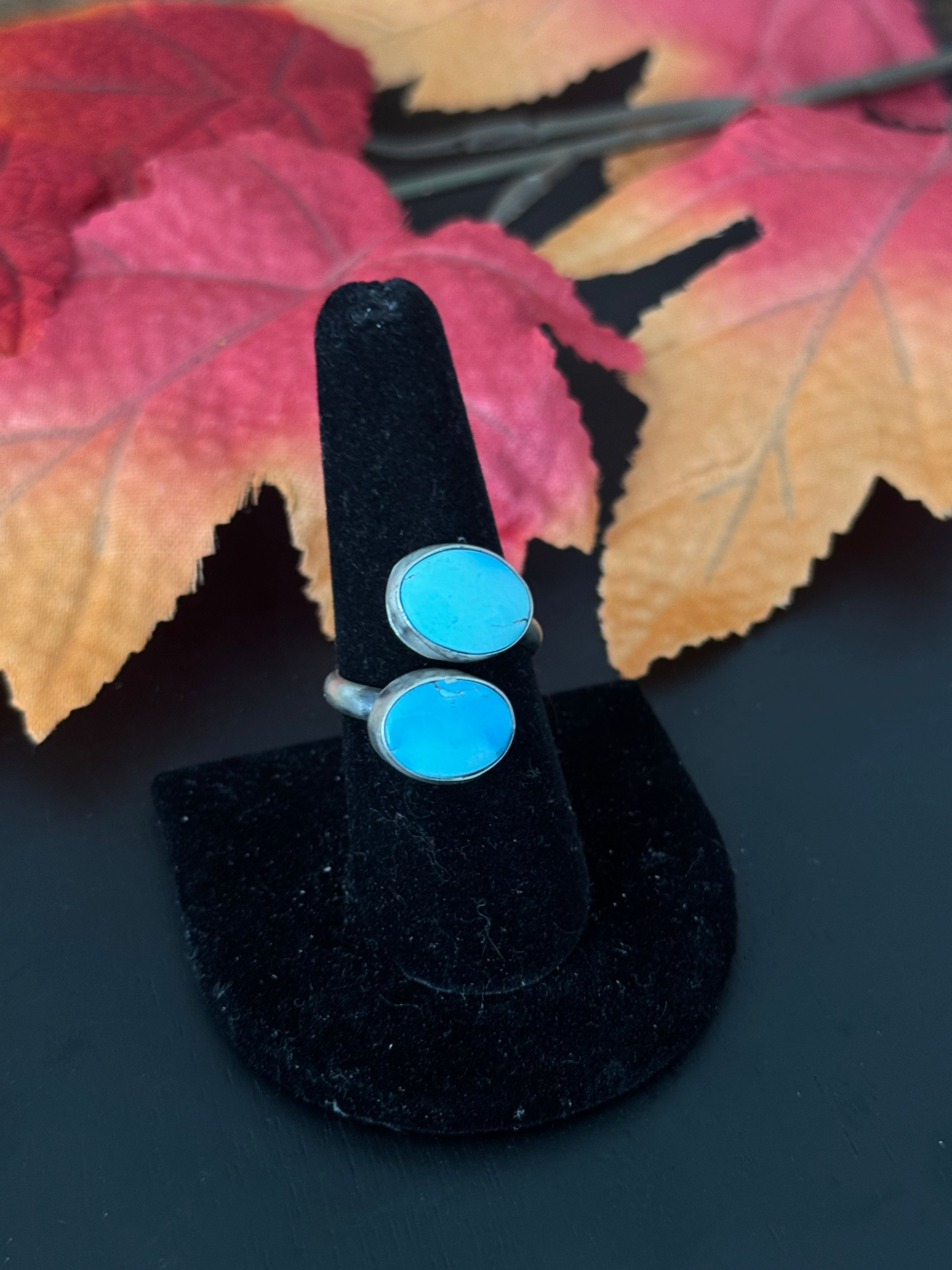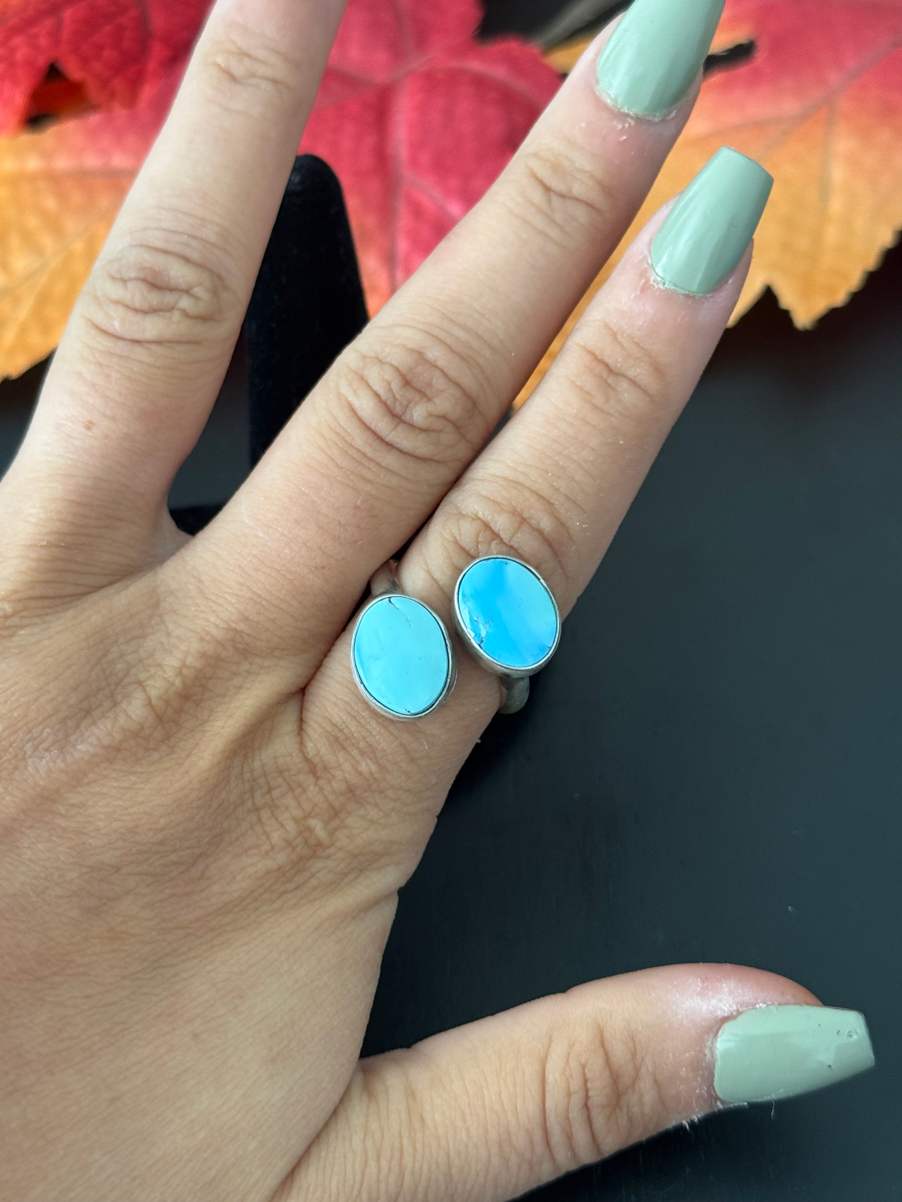 Ester Sam Golden Hills Turquoise & Sterling Silver Adjustable Ring. It measures 3/4 of an inch long and just over 3/4 of an inch wide. Signed by the artist and stamped sterling silver. Stones will differ due to natural stones.