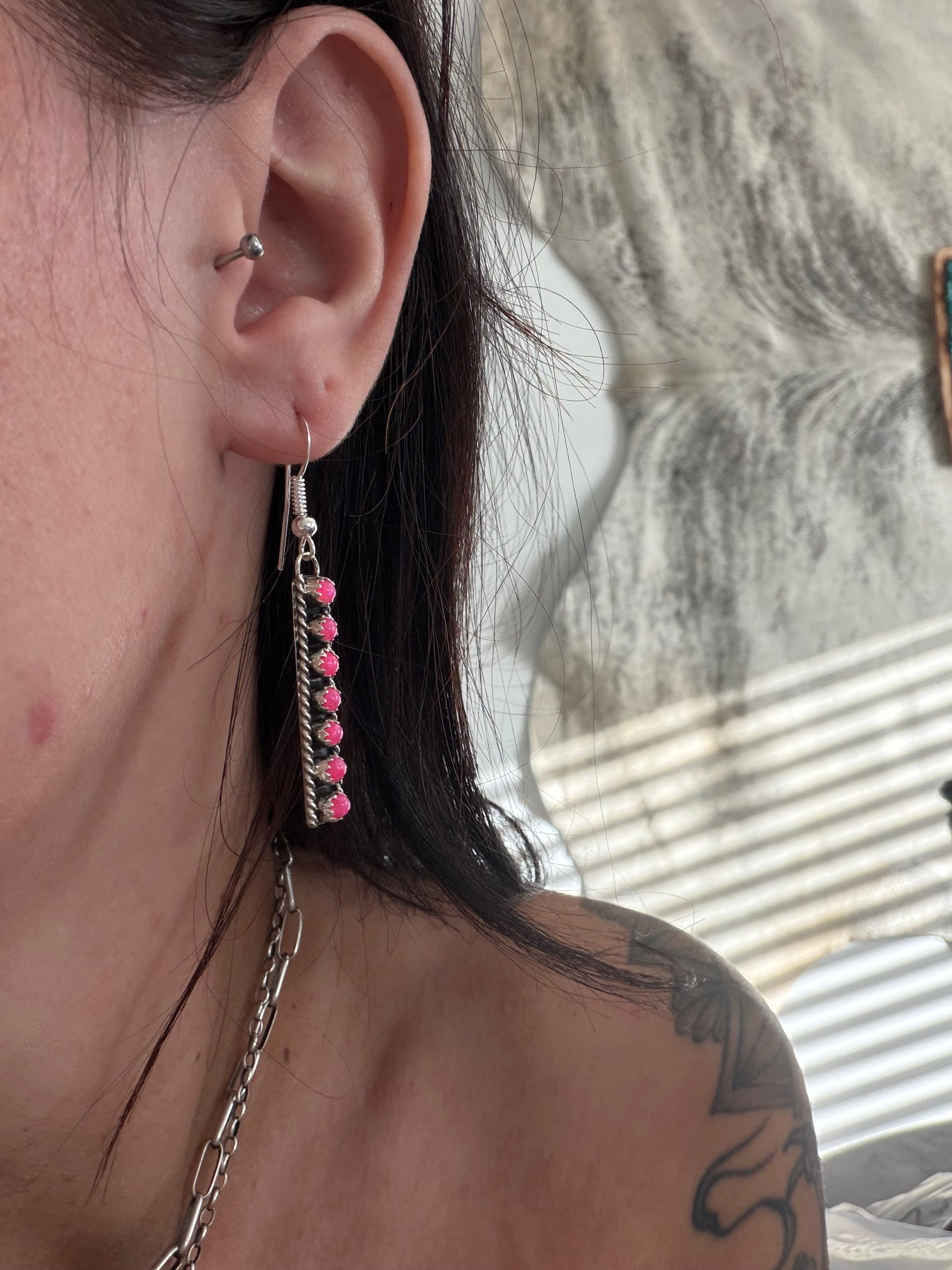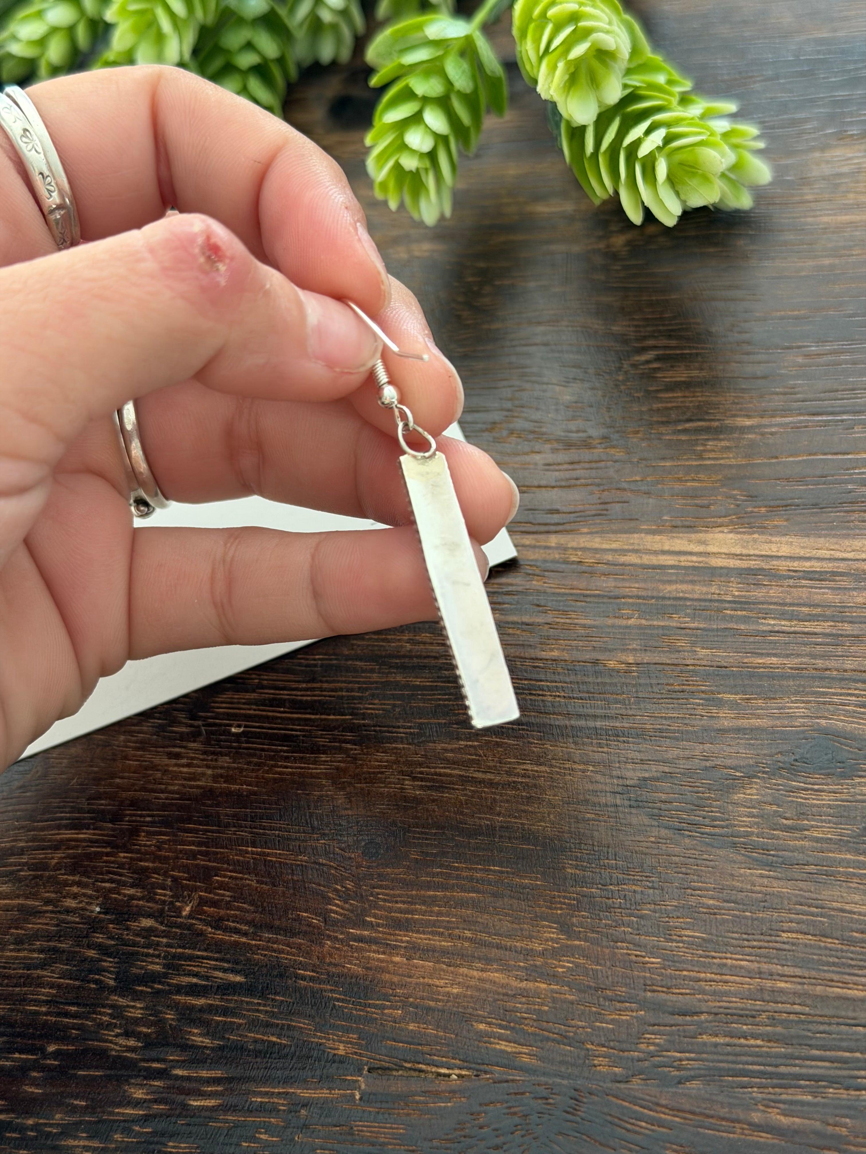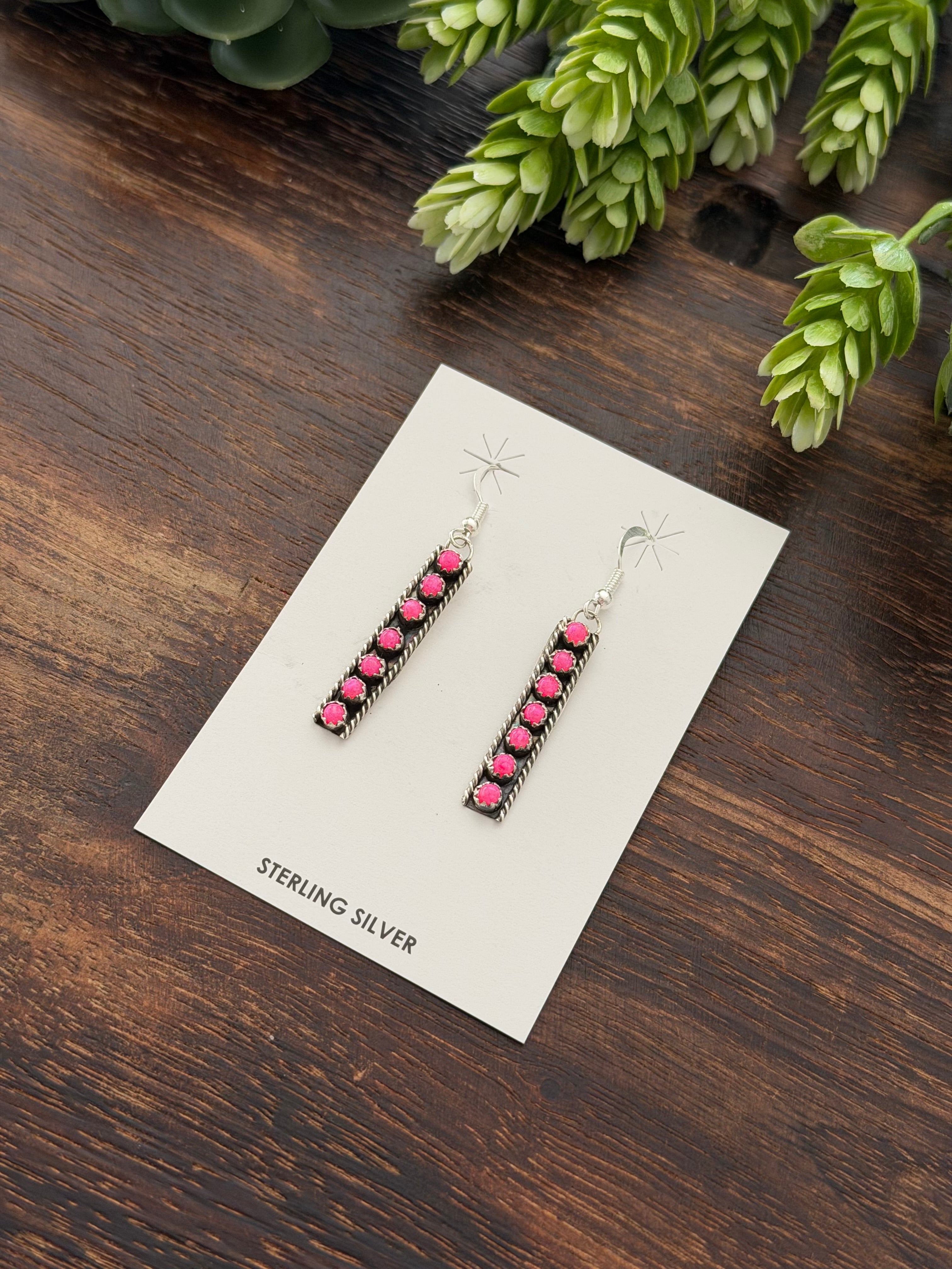 Esther White Pink Opal (Man Made) & Sterling Silver Dangle Earrings. They measure 2 1/8 inches long and 1/4 of an inch wide.