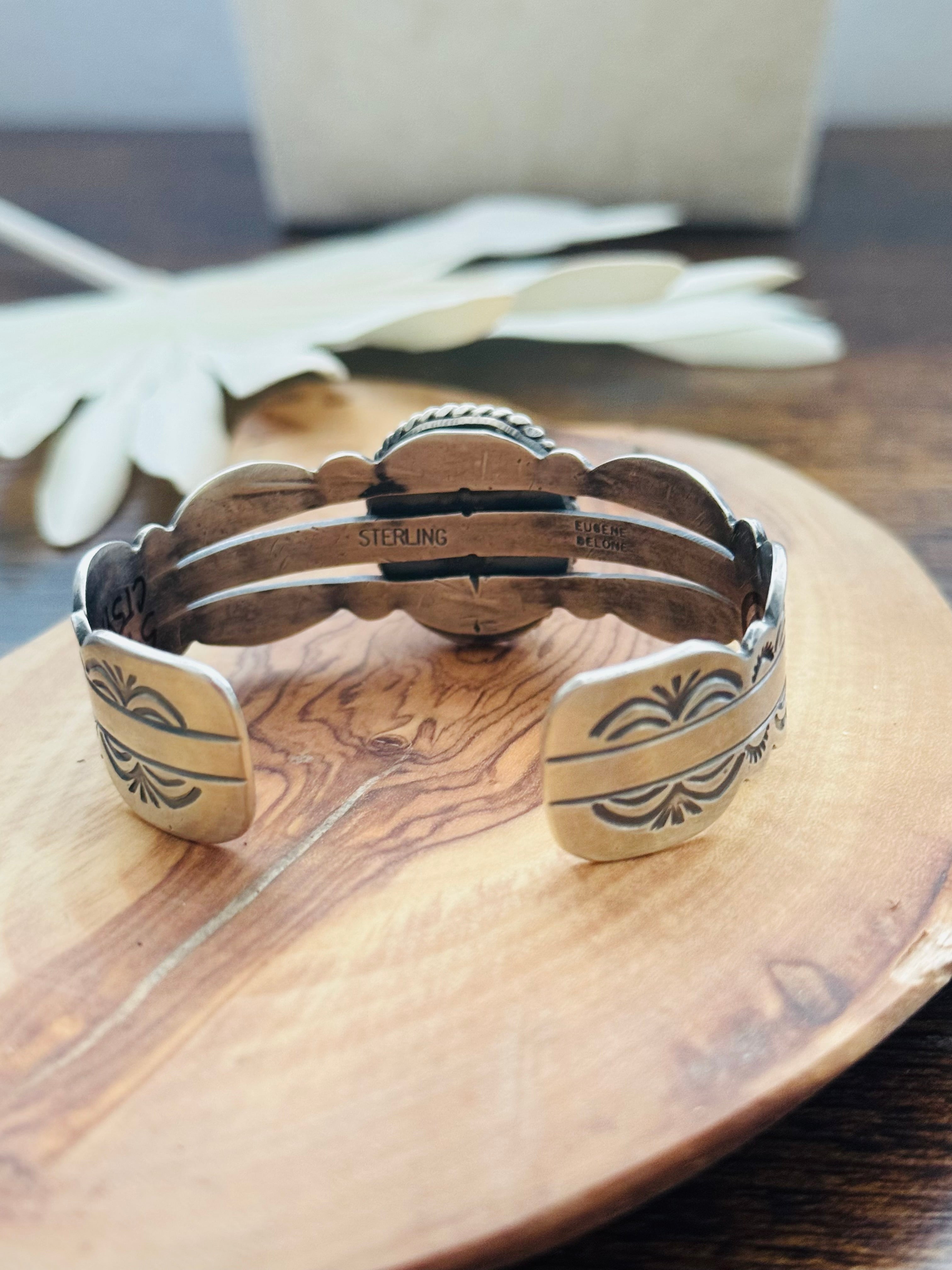Eugene Belone Kingman Nugget Turquoise & Sterling Silver Cuff Bracelet. It measures 1 inch wide with an inside circumference 5 1/4 inches and a gap of 7/8 of an inch. Signed by the artist and stamped sterling silver.