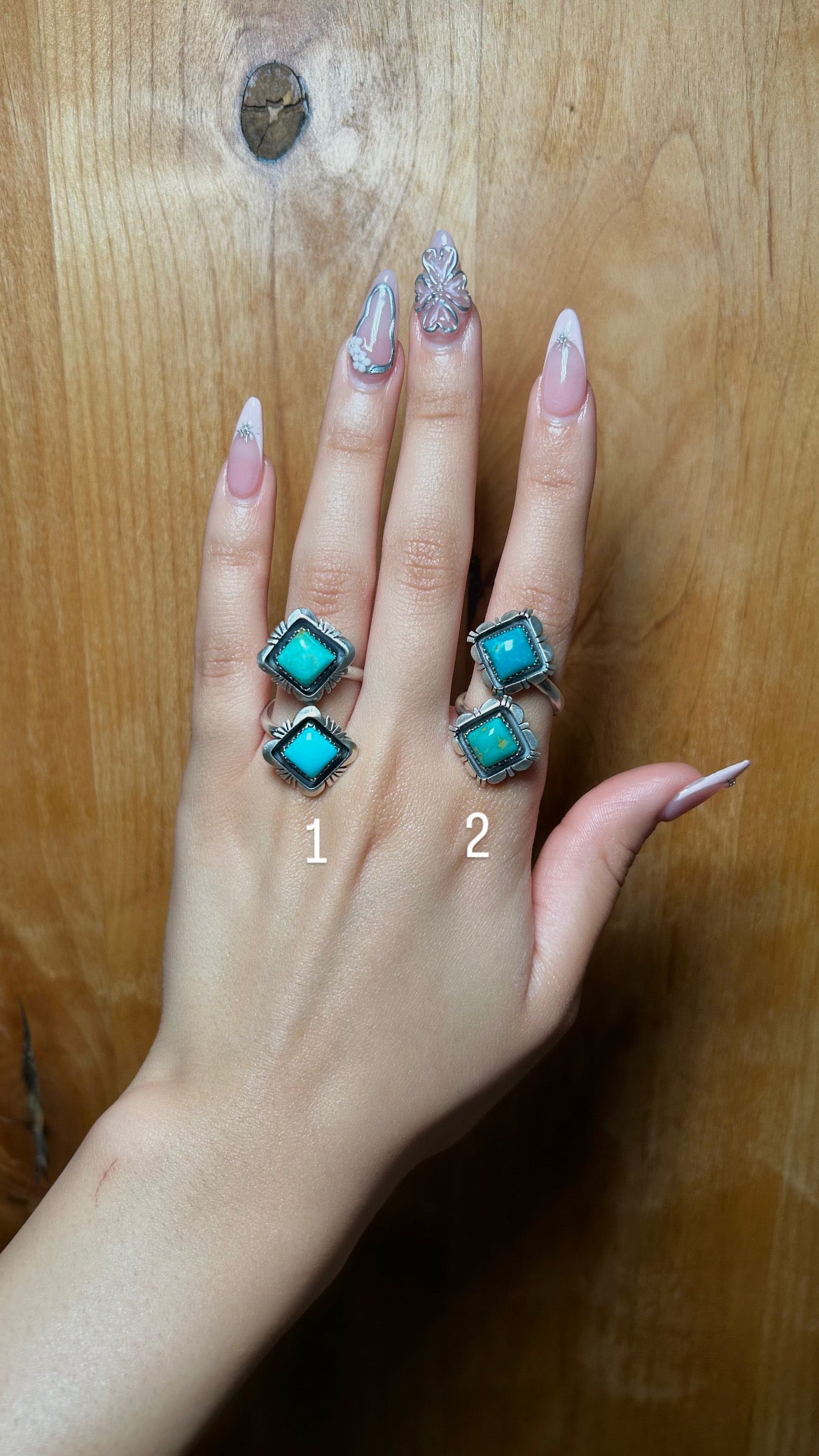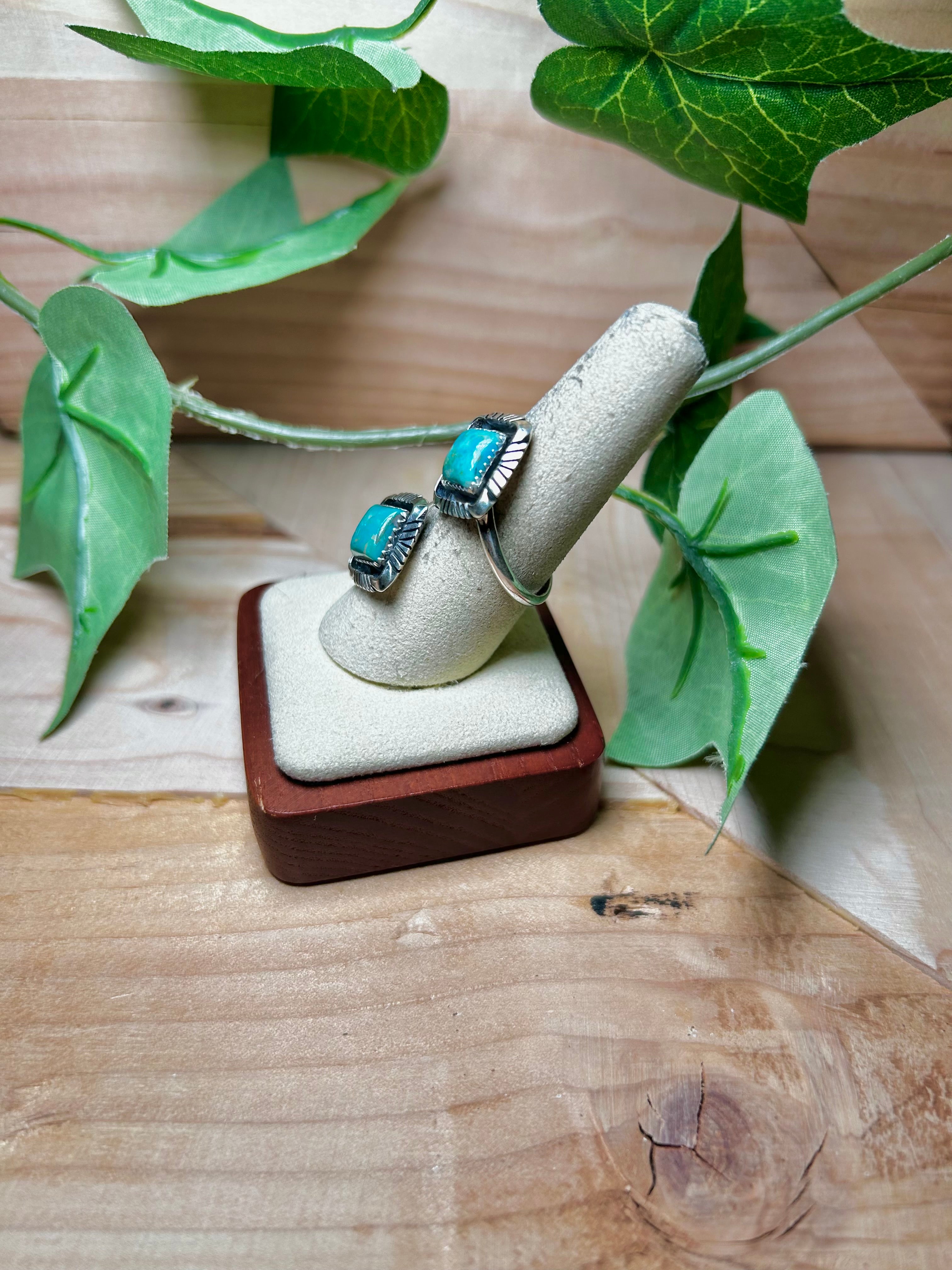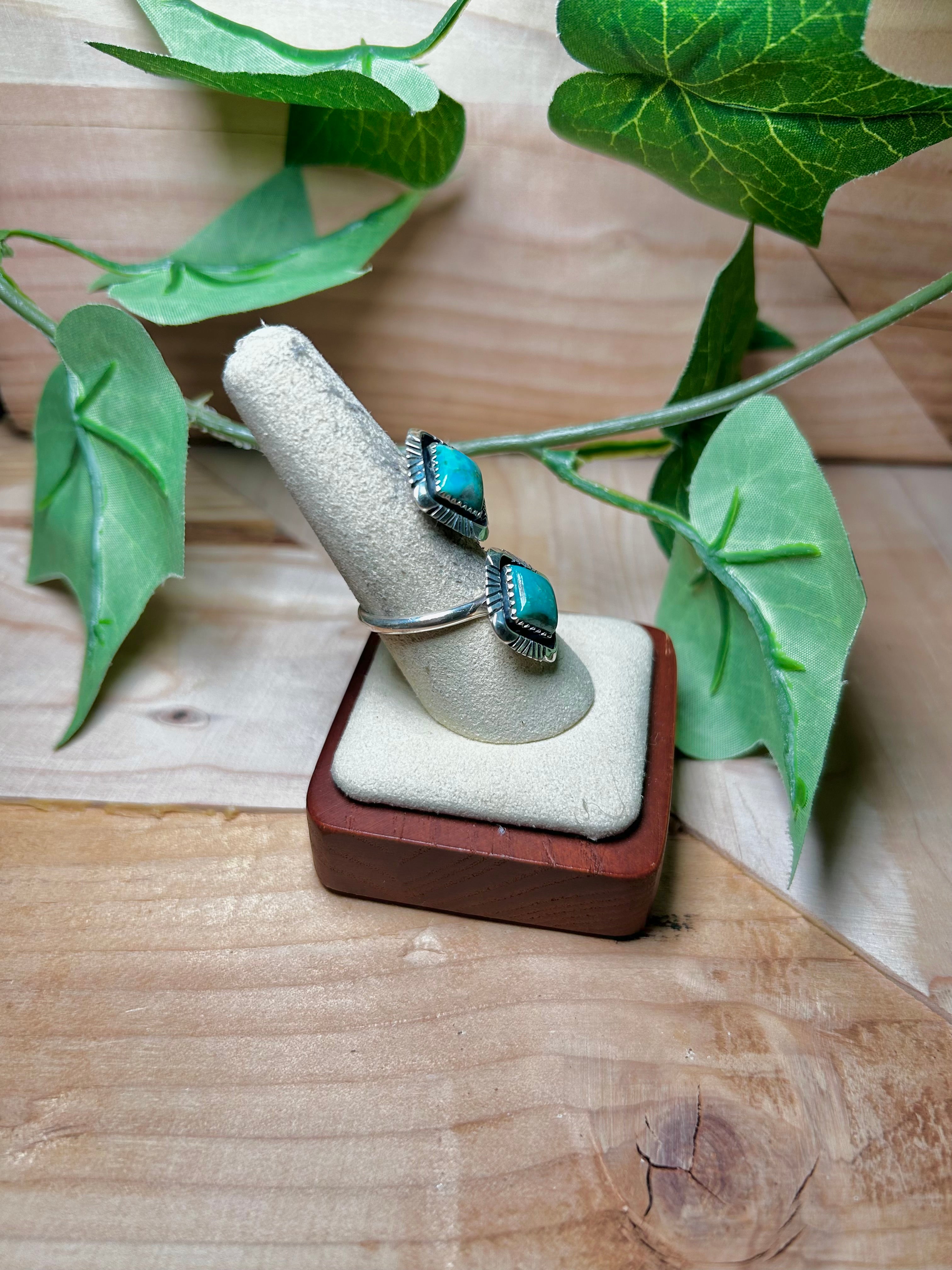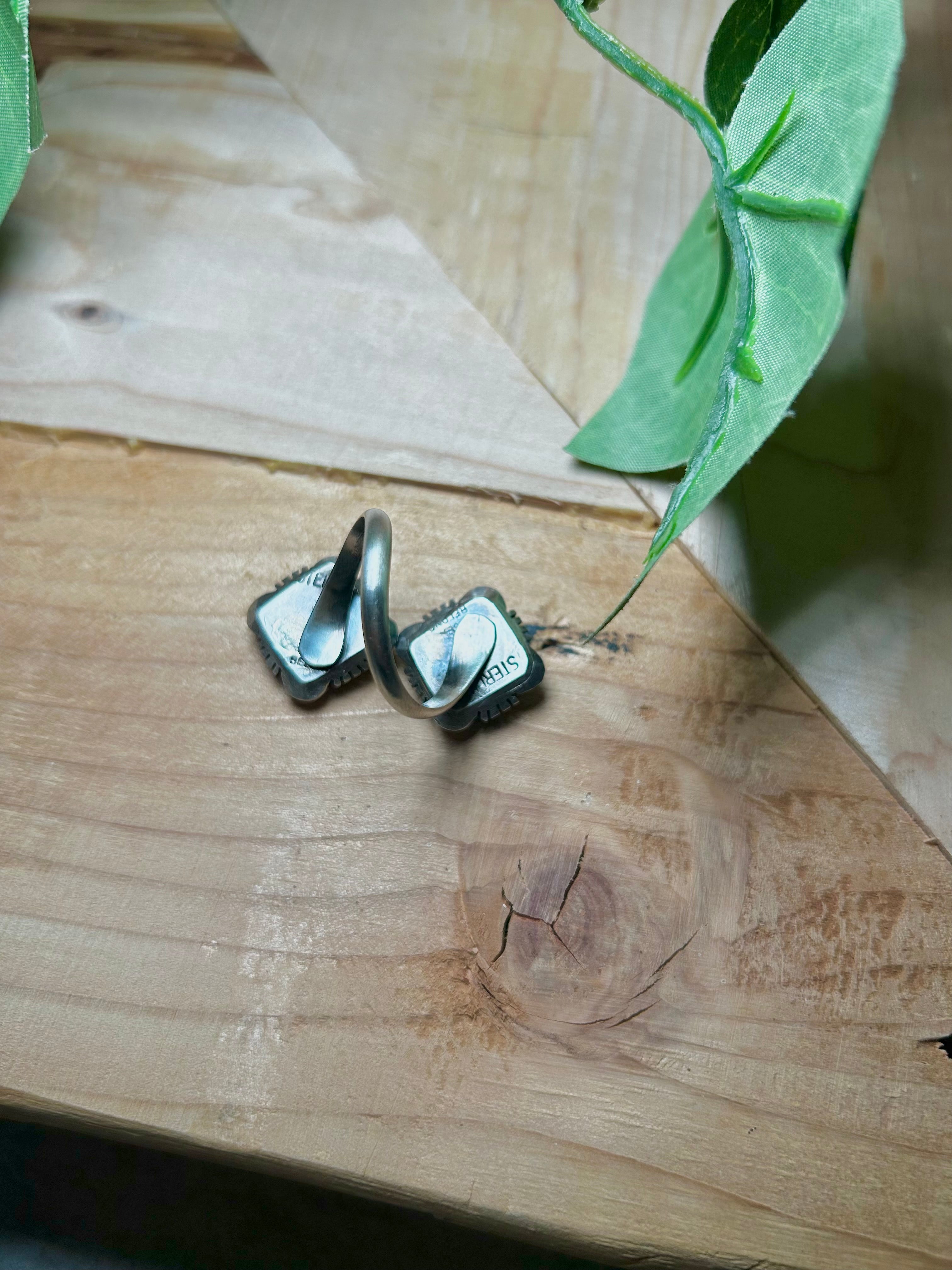 Eugene Belone Kingman Turquoise & Sterling Sliver Cluster Adjustable Ring. It measures 1 1/2 inches long and 3/4 of an inch wide. Signed by the artist and stamped sterling silver.