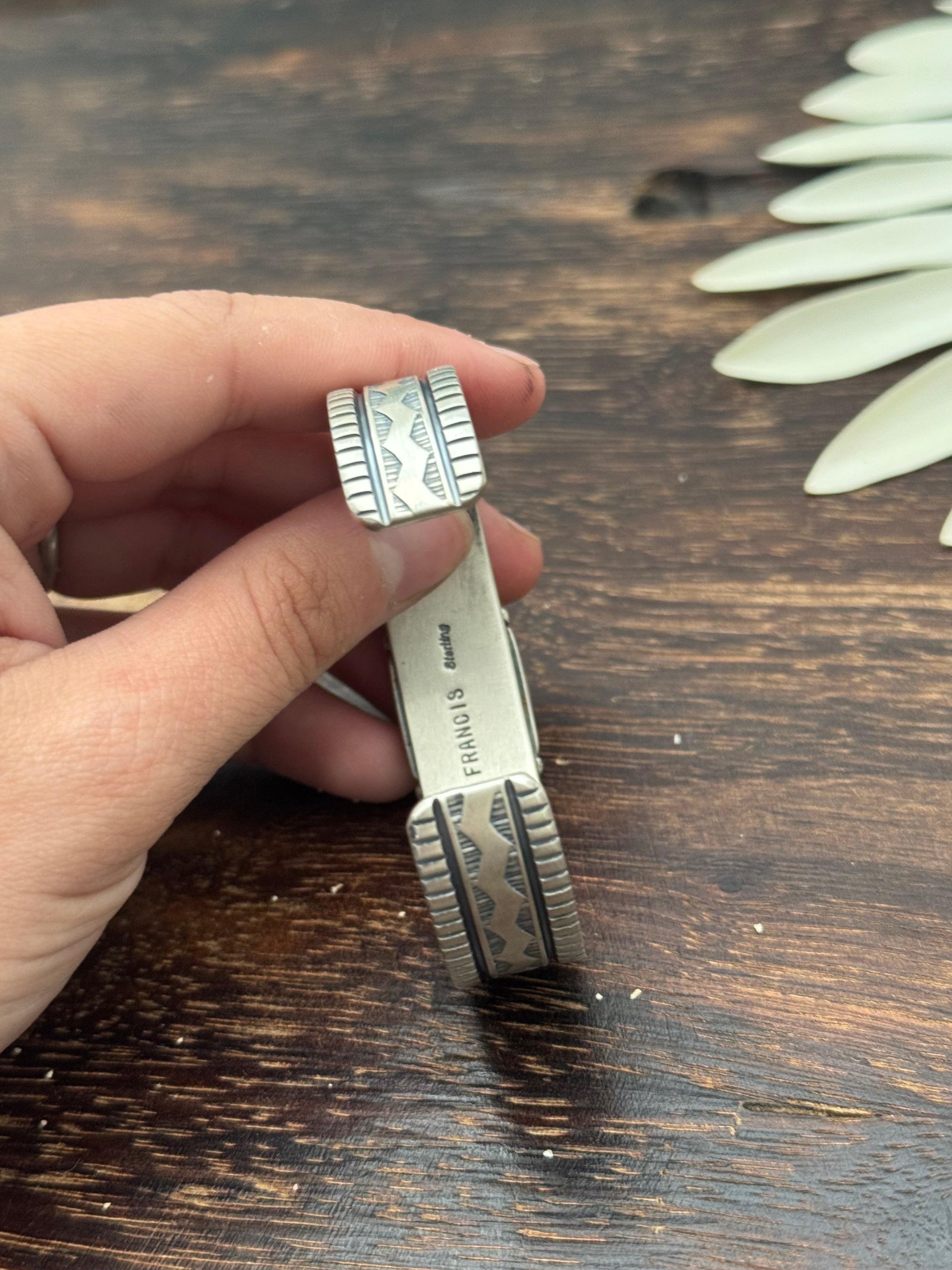 A stunning piece by Francis Yazzie Black Jack Turquoise & Sterling Silver Cuff Bracelet. Unique stones in this piece! It measures 3/4 of an inch wide with an inside circumference of 5 3/4 inches and a gap of 1 1/8 inches. Signed by the artist and stamped sterling silver.