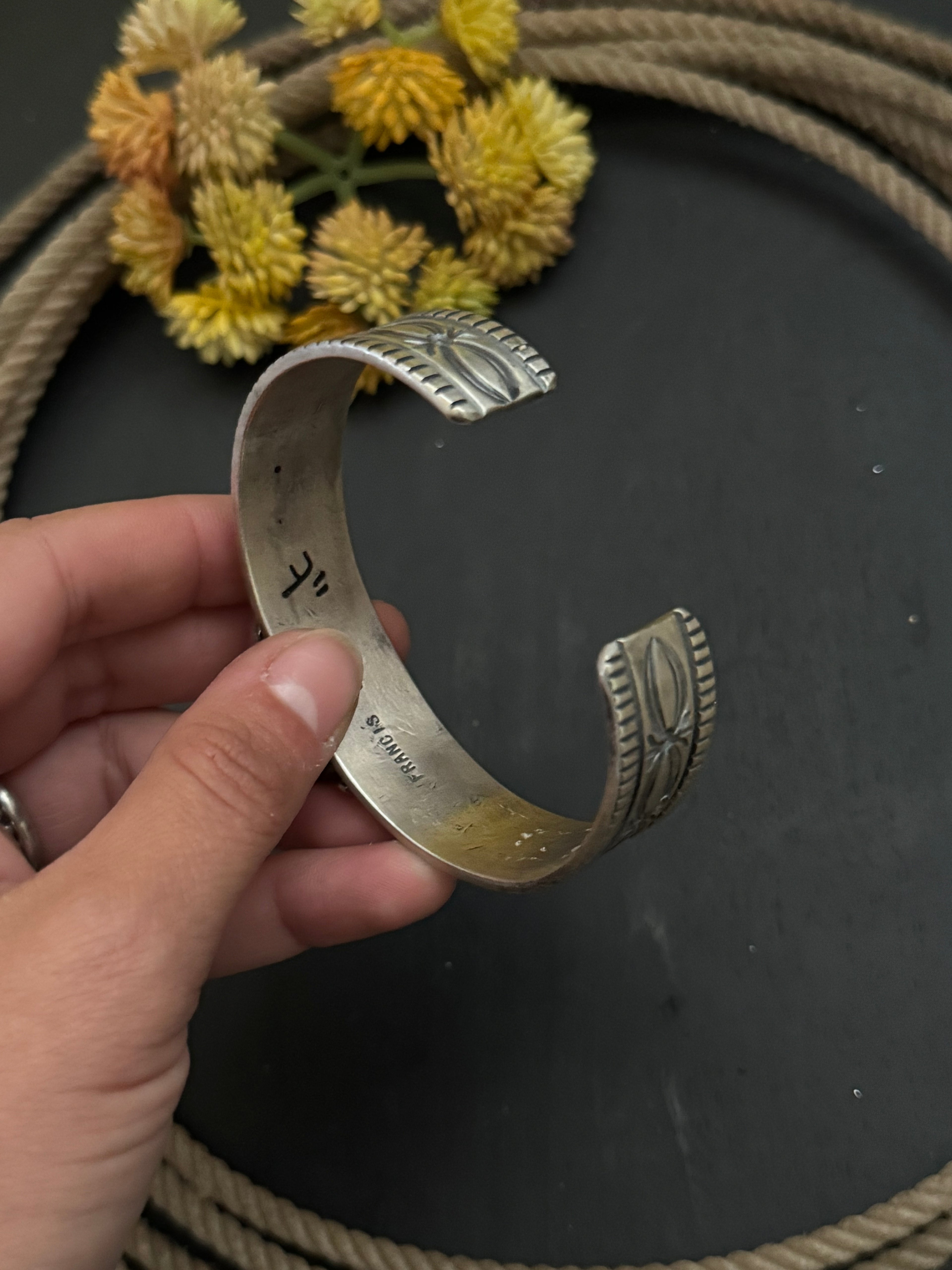 A stunning piece by Francis Yazzie Black Jack Turquoise & Sterling Silver Cuff Bracelet. Unique stones in this piece! It measures 3/4 of an inch wide with an inside circumference of 6 inches and a gap of 1 1/8 inches. Signed by the artist and stamped sterling silver.