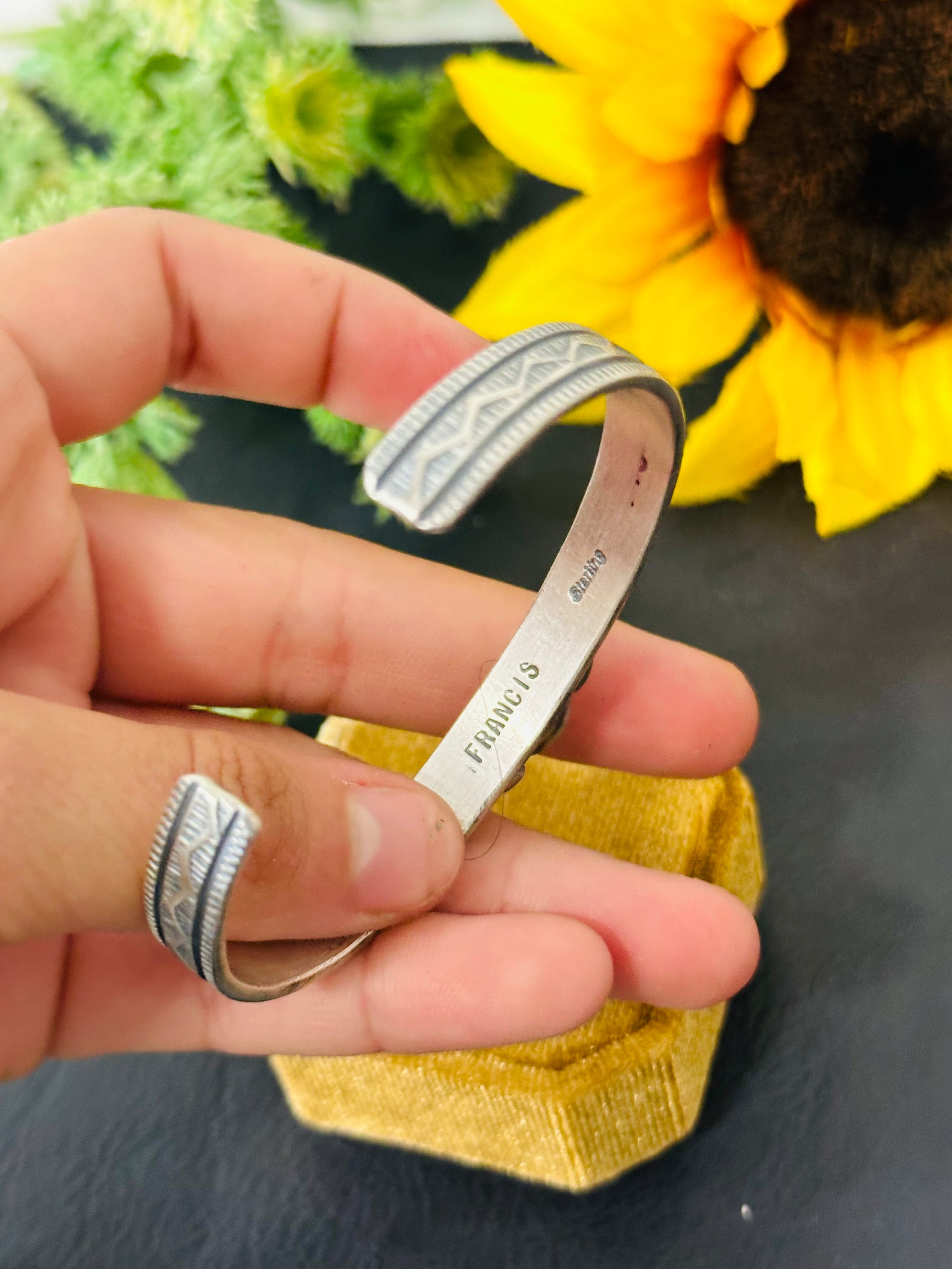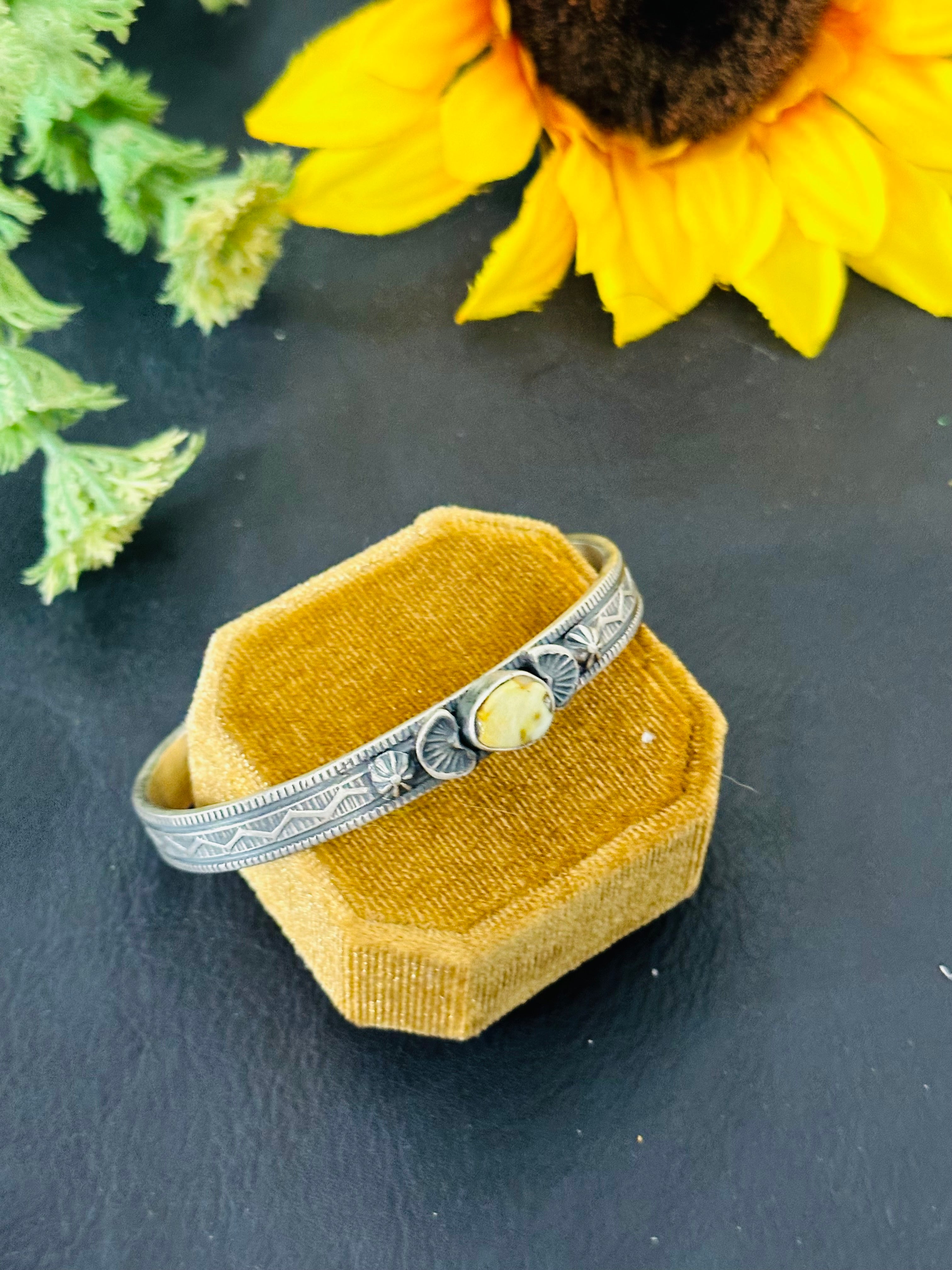 A stunning piece by Francis Yazzie Palomino Variscite and Sterling Silver Cuff Bracelet. Unique stones in this piece! It measures 3/8 of an inch wide with an inside circumference of 5 1/2 inches and a gap of 1 inch. Signed by the artist and stamped sterling silver.