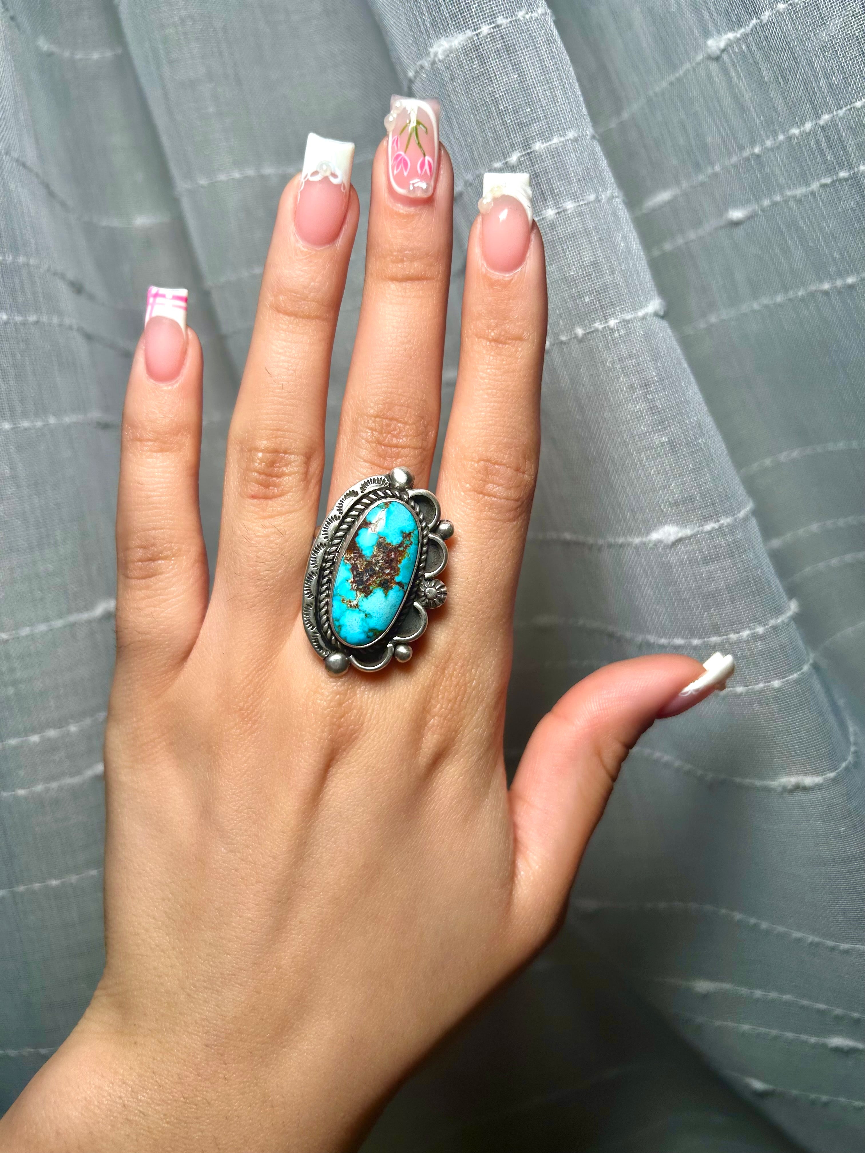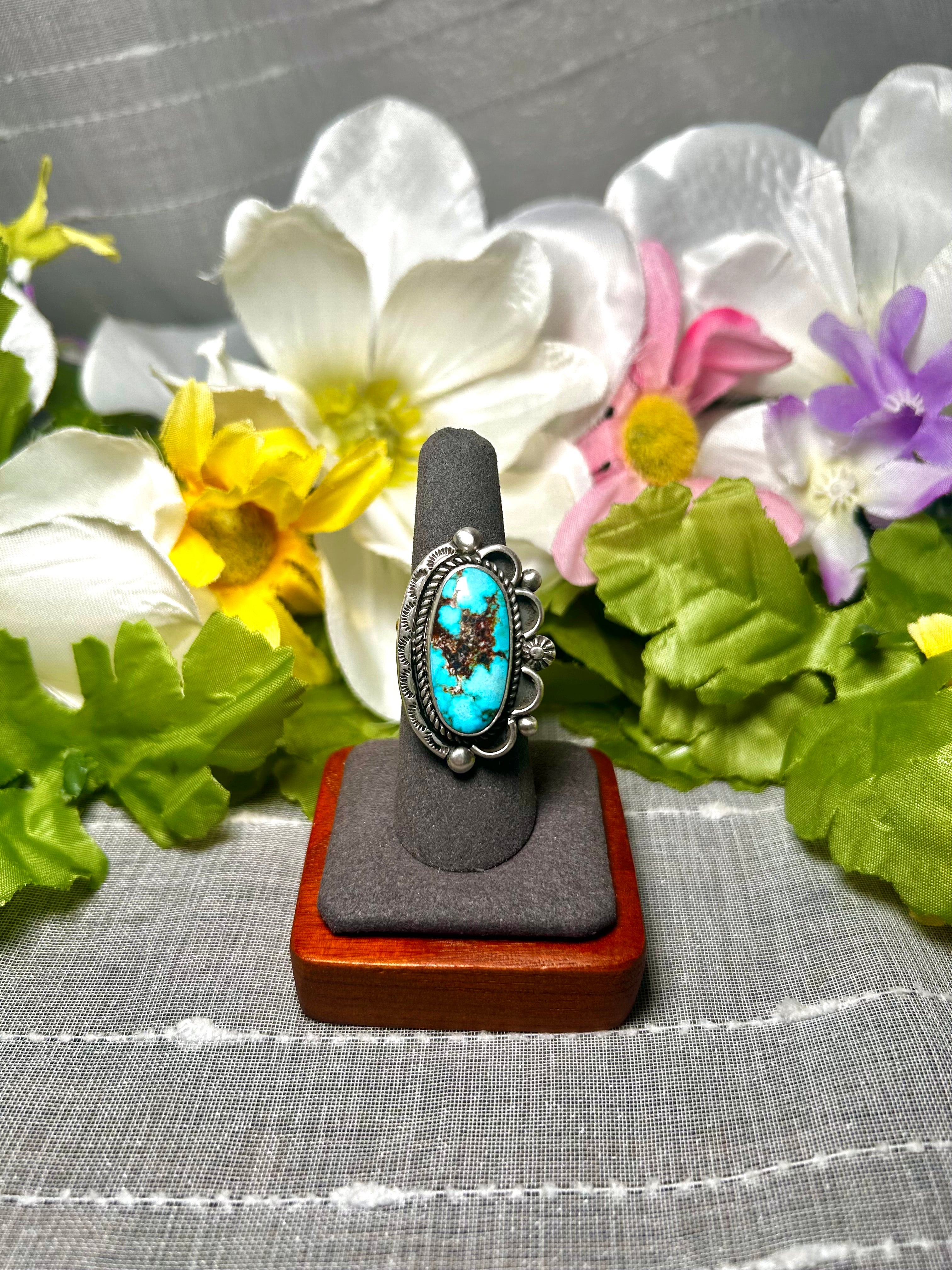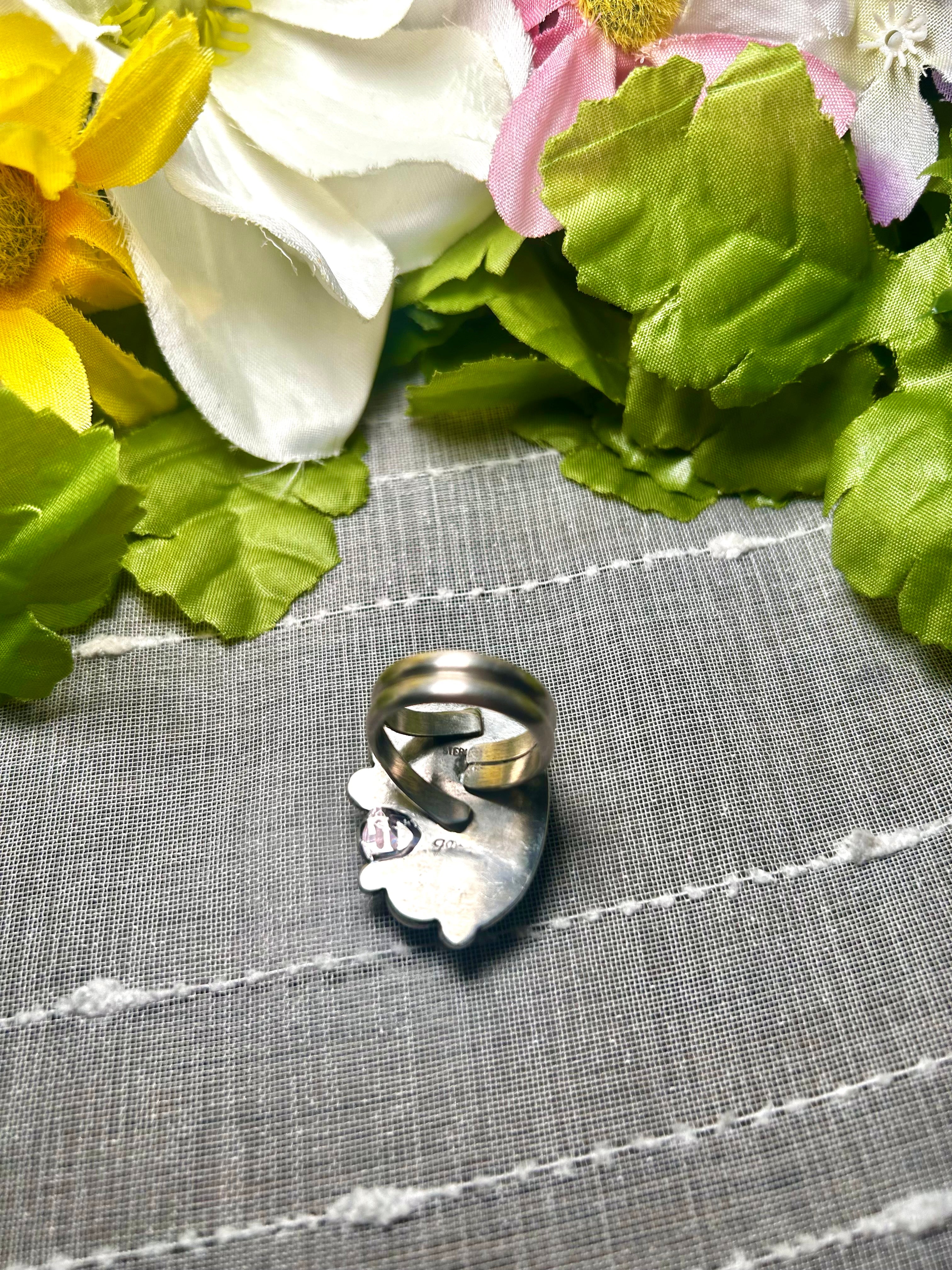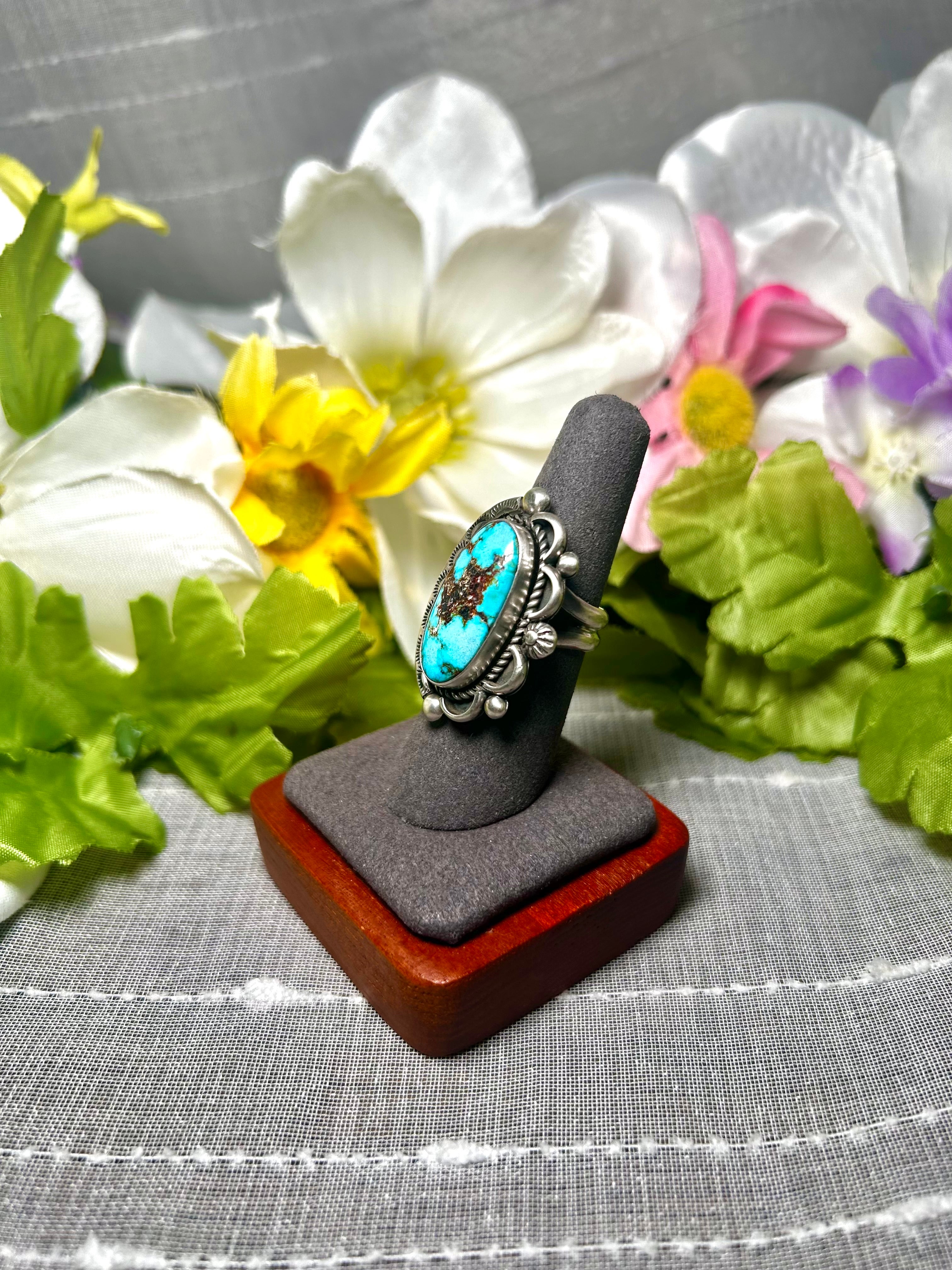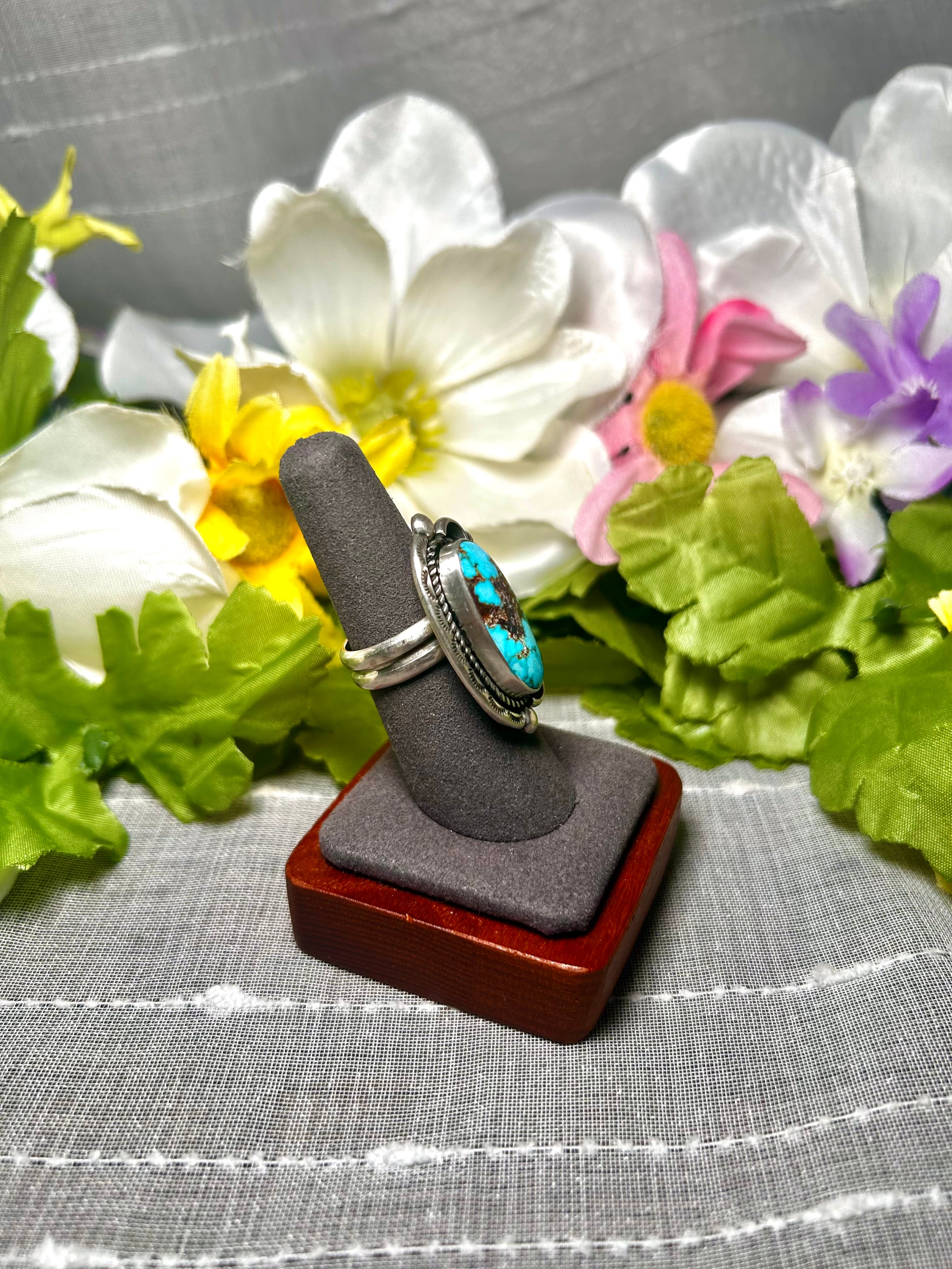 Fred Francis Kingman Turquoise & Sterling Silver Adjustable Ring. It measures 1 3/8 inches long and 7/8 of an inch wide. Signed by the artist and stamped sterling silver.