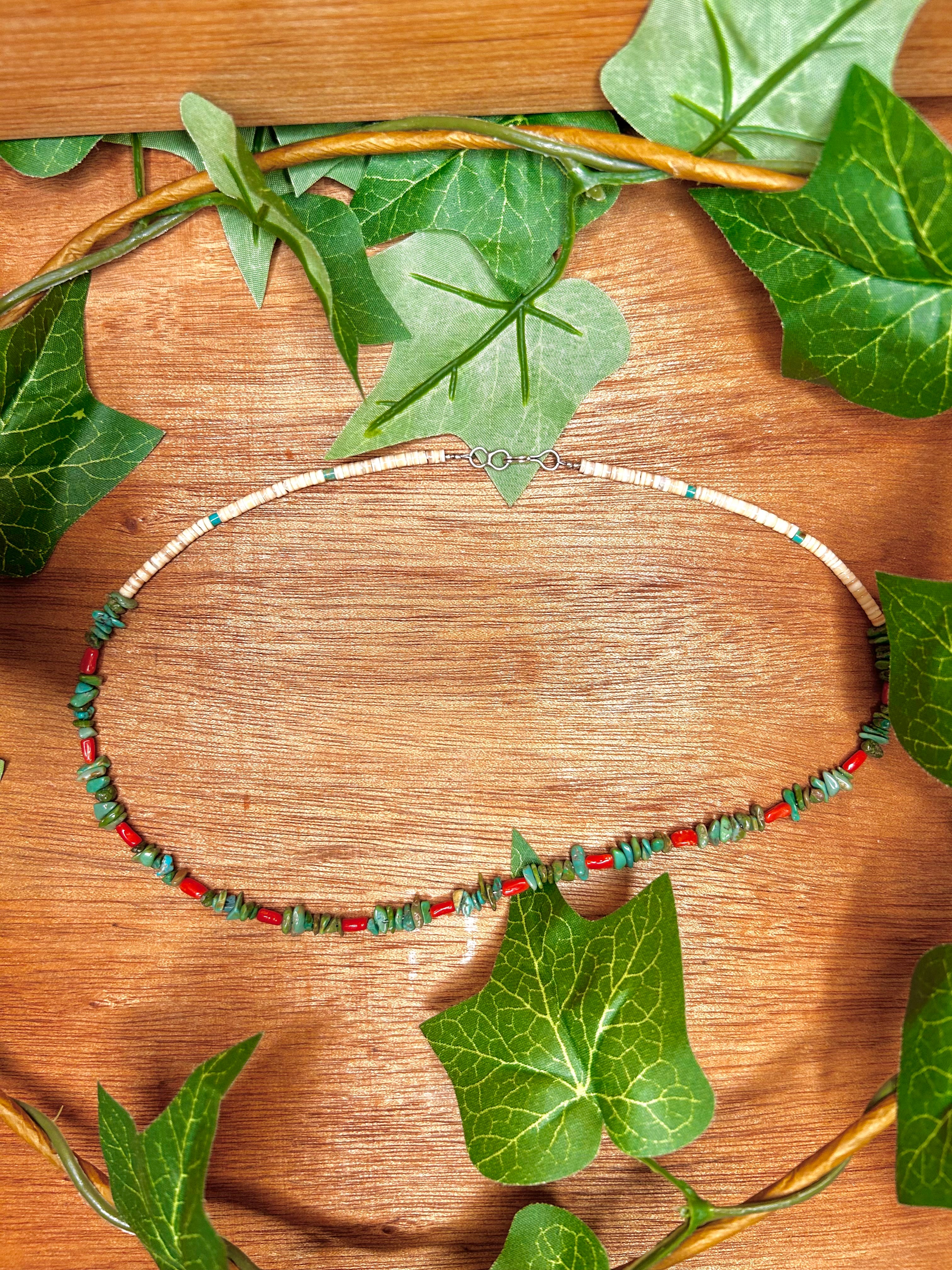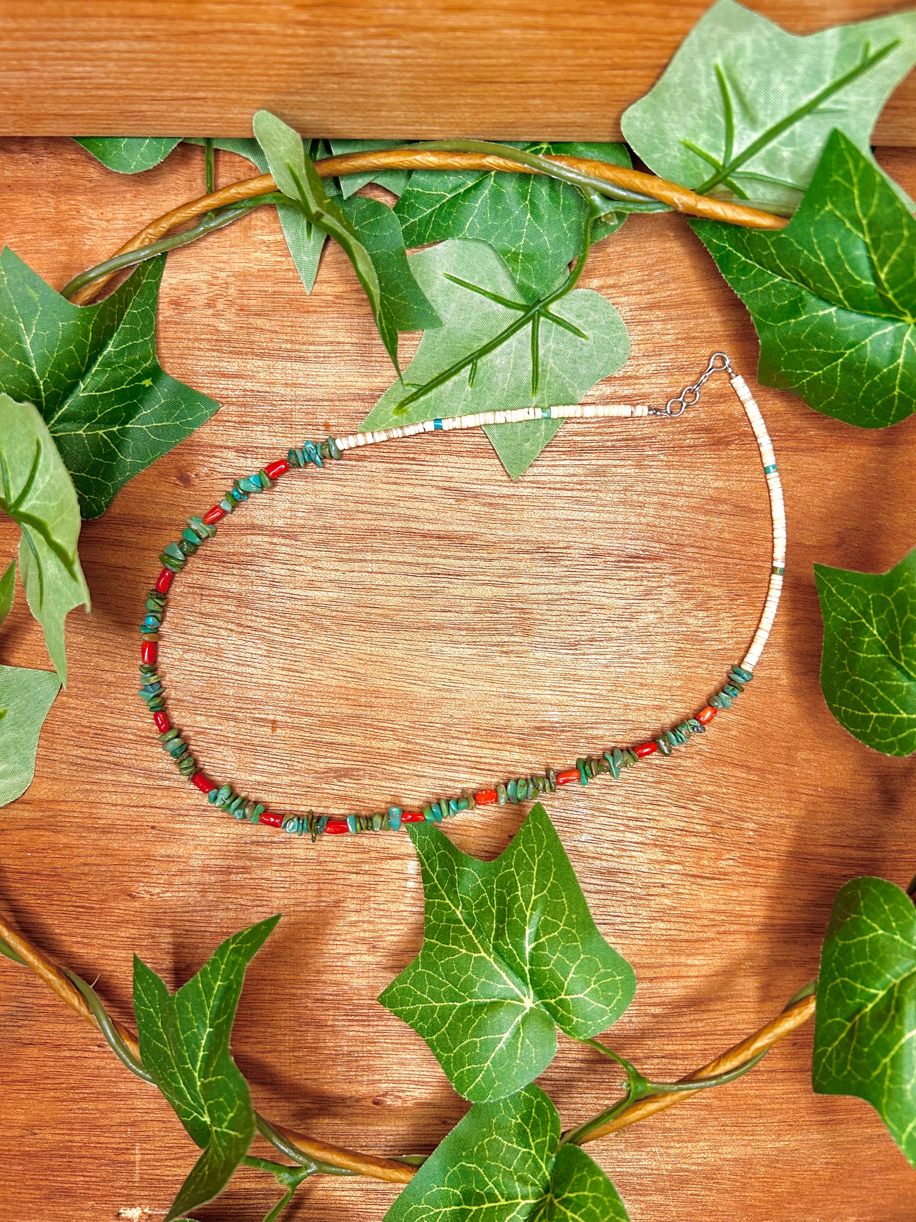 Navajo Strung Multi Stone Heishi Necklace. It measures 18 inches long. Signed by the artist and stamped sterling silver.