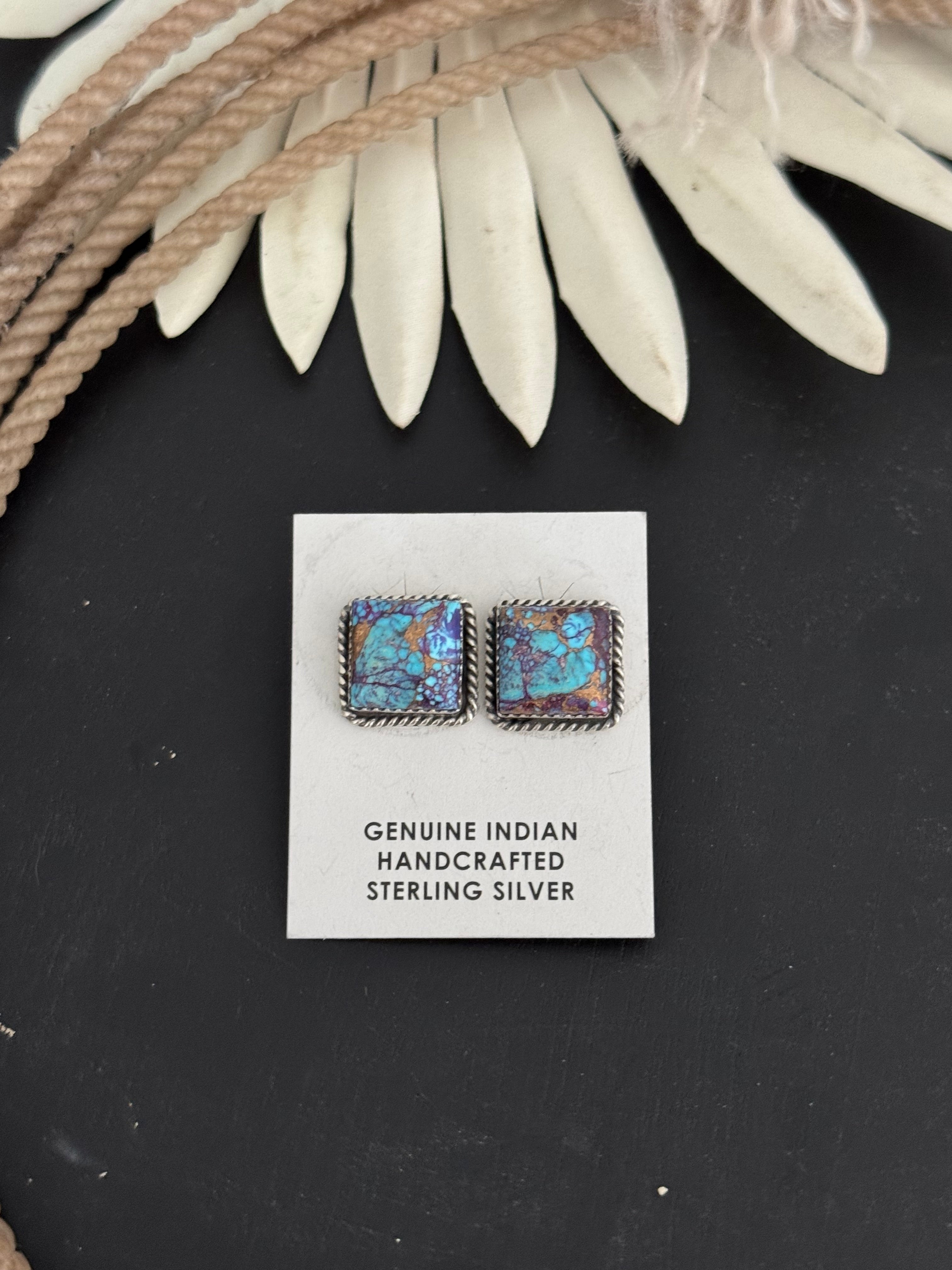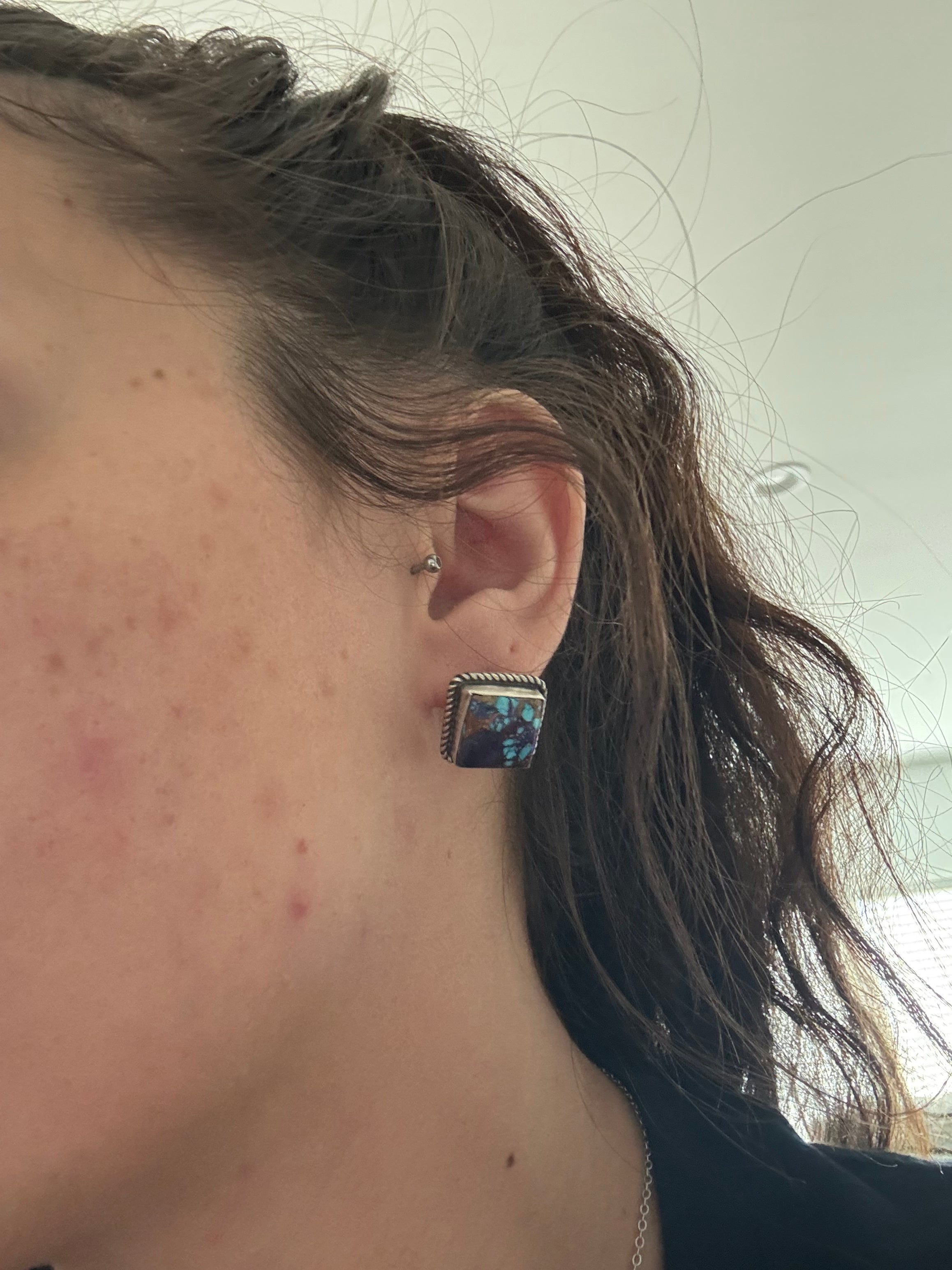The most stunning colorful earrings. Freda Martinez Purple Mohave Turquoise & Sterling Silver Post Earrings. It measures 5/8 of an inch long and 5/8 of an inch wide. Stamped and signed.