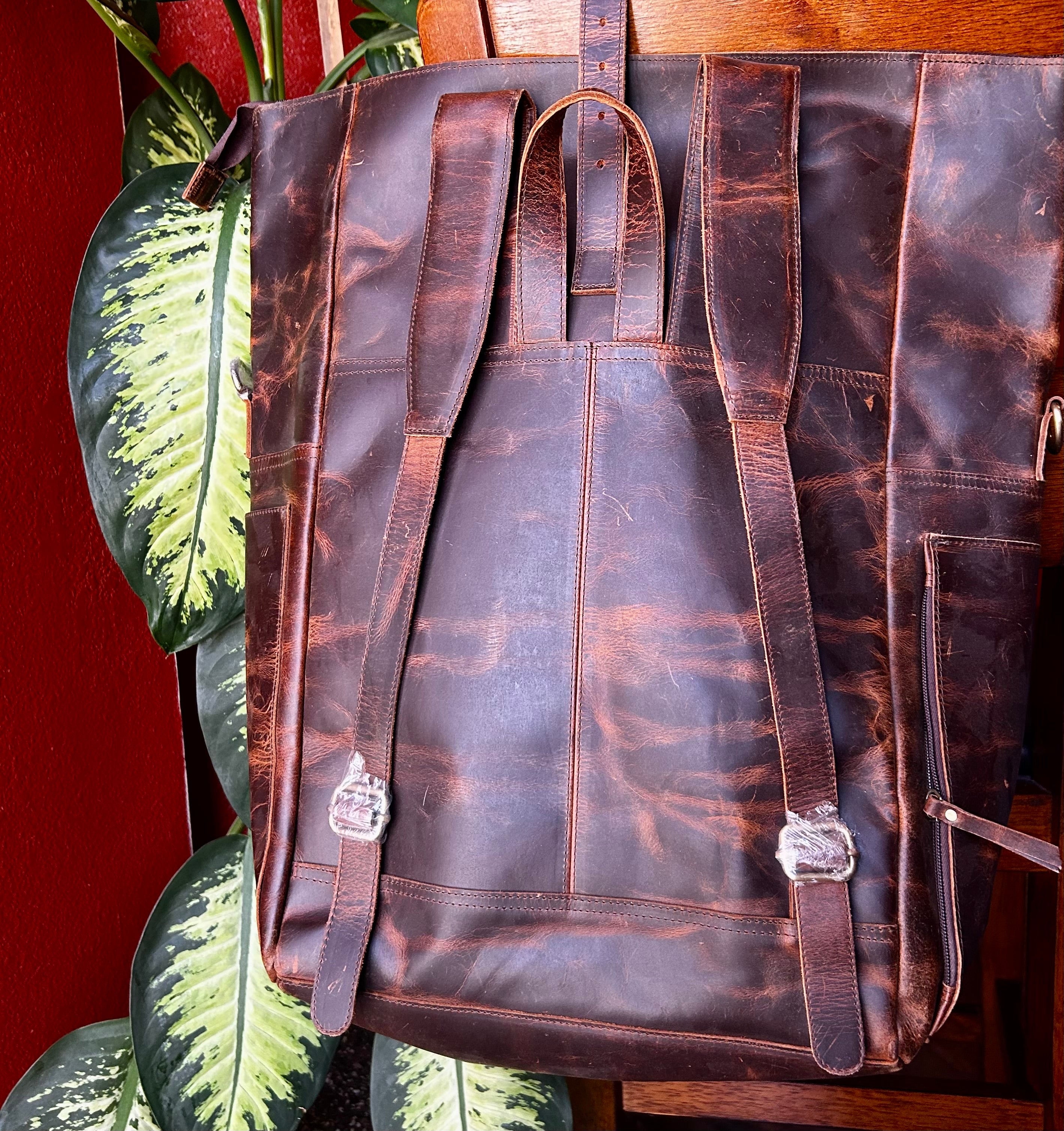 Genuine Leather Back Pack/ Diaper Bag. It measures 19 inches wide and 23 inches in depth. Strap measures 27 1/2 inches long with room to make it longer. Many pockets