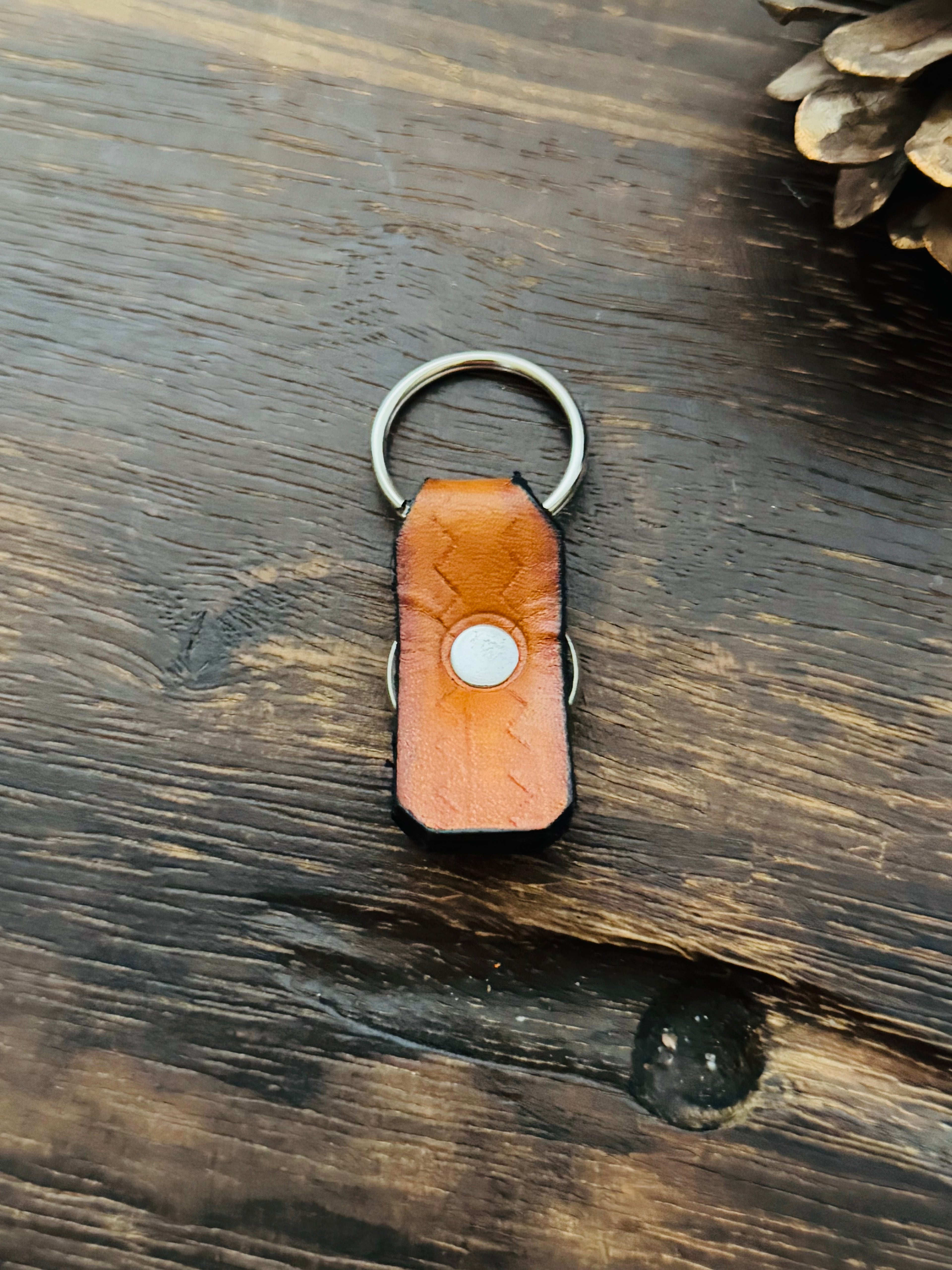Genuine Leather & Buffalo Nickel Key Chain. It measures 2 3/8 inches long and 3/4 of an inch wide.